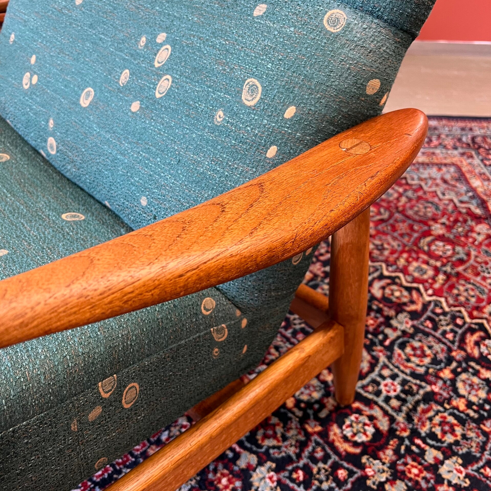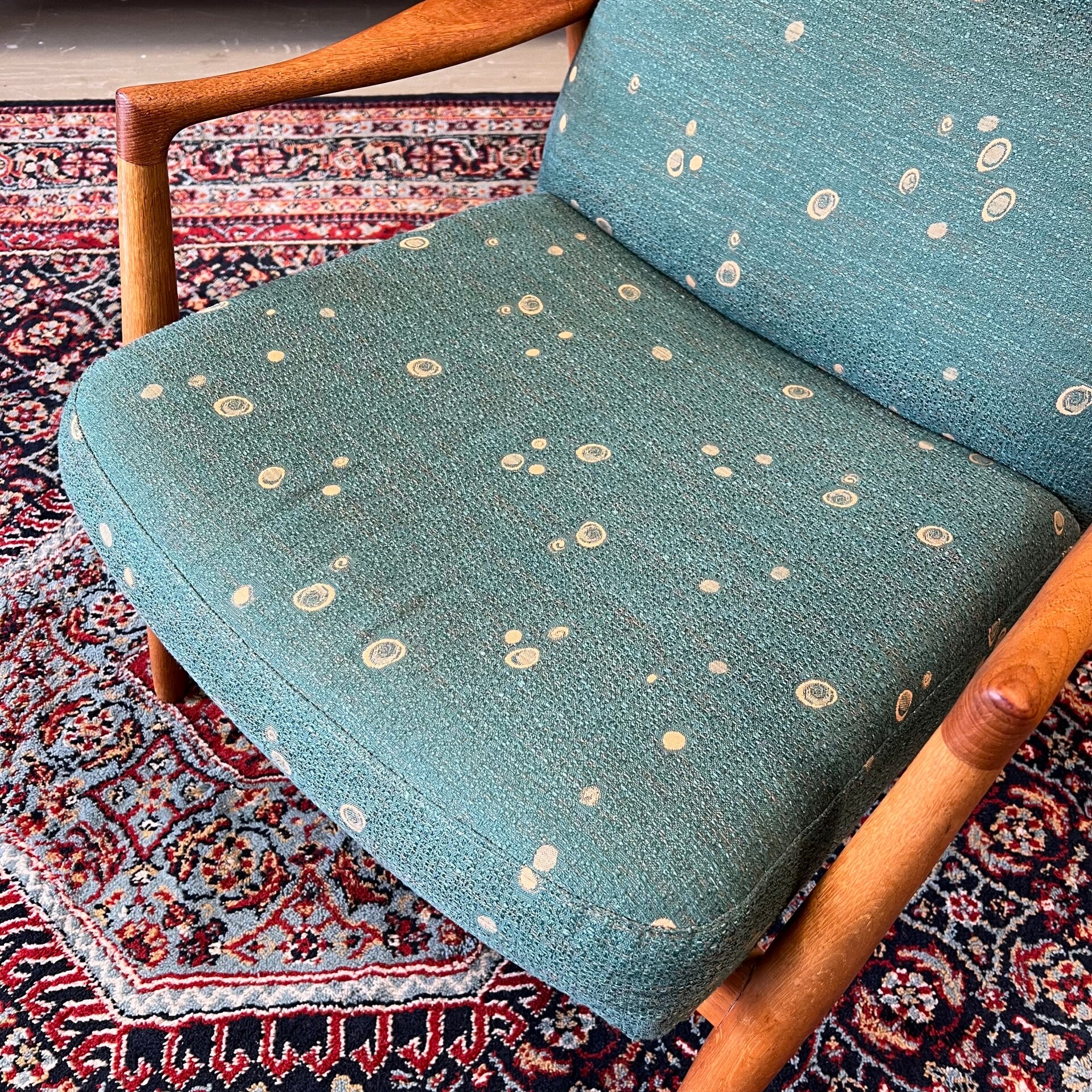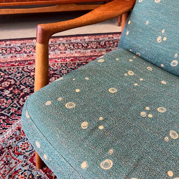 Uitgevoerd in massief teak en eiken met stoffen bekleding in een zeegroene kleur met beige motief.