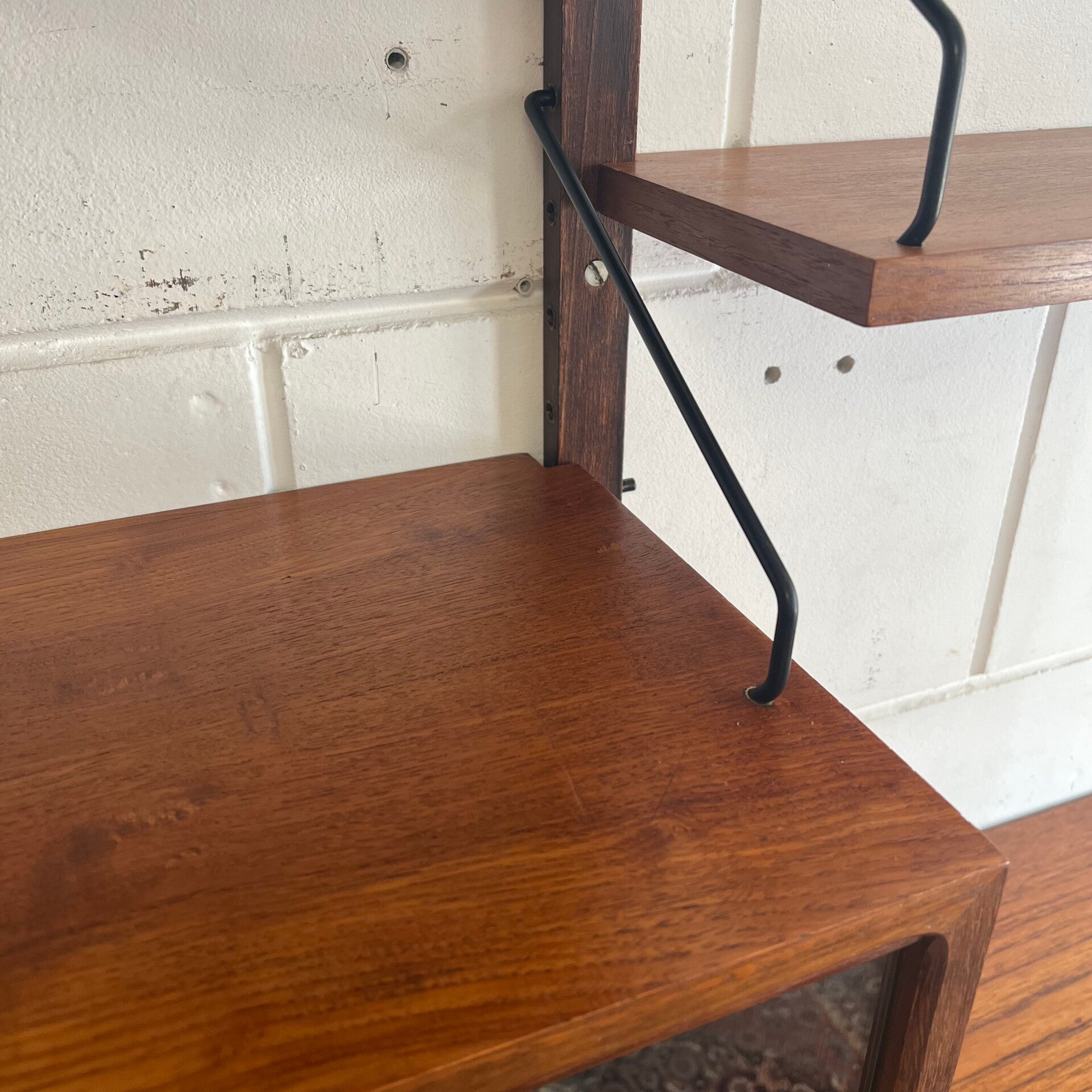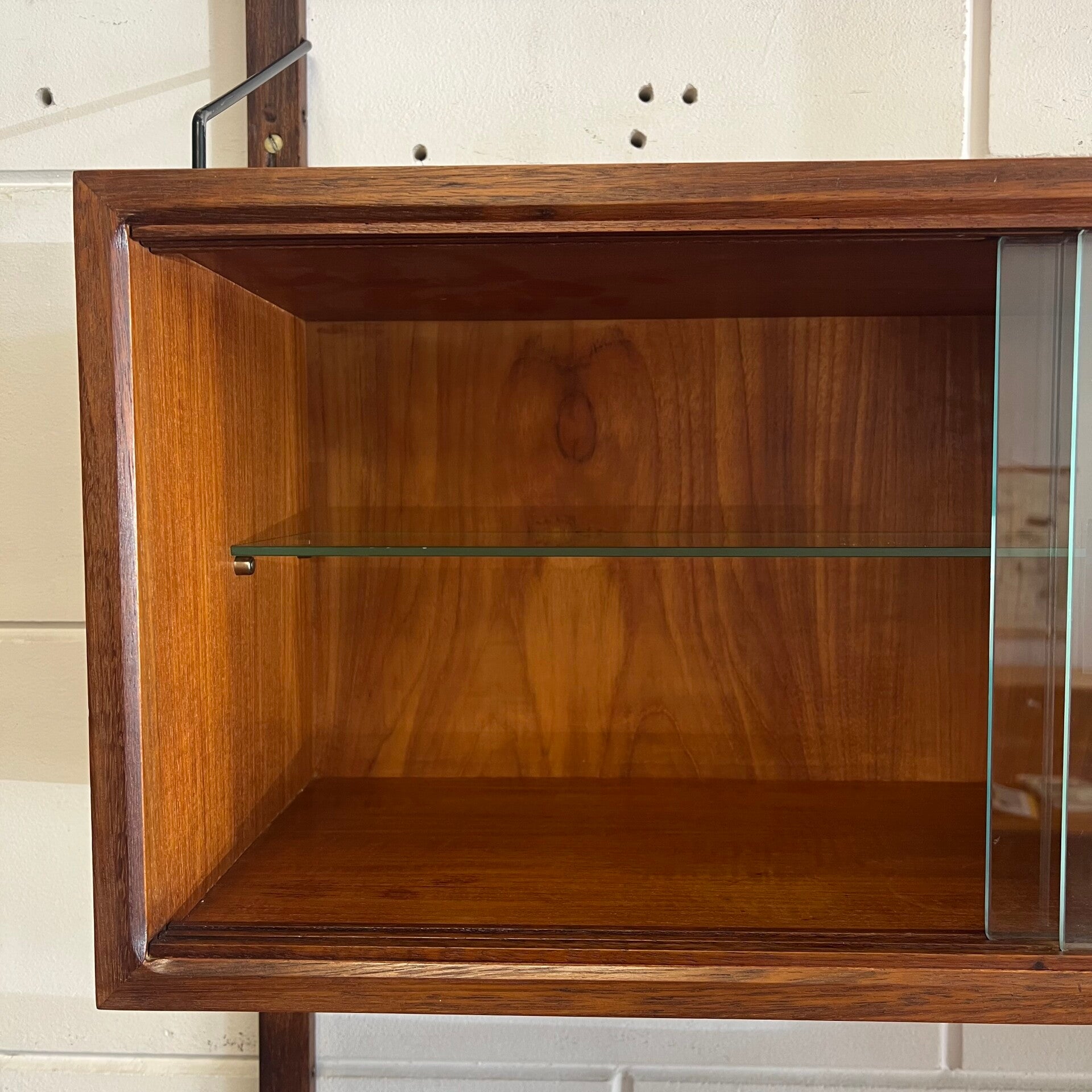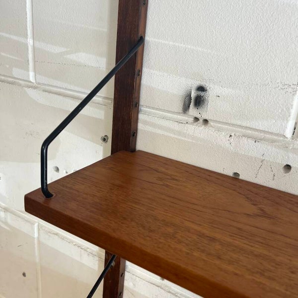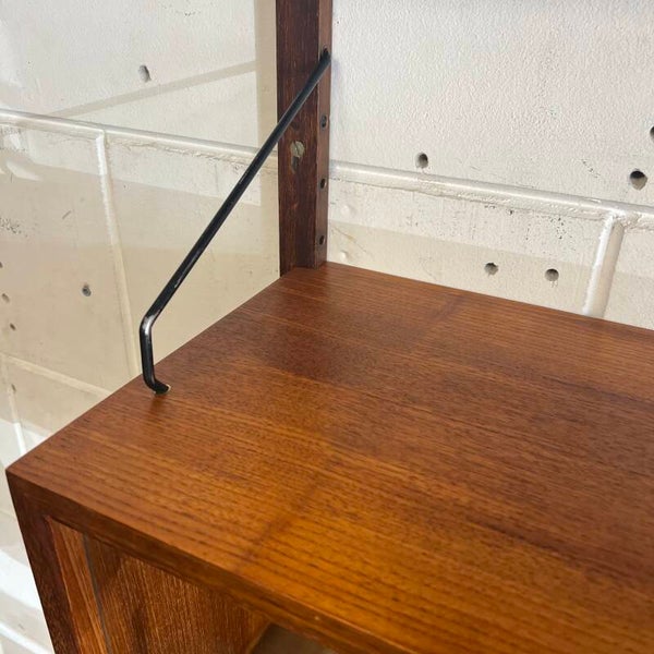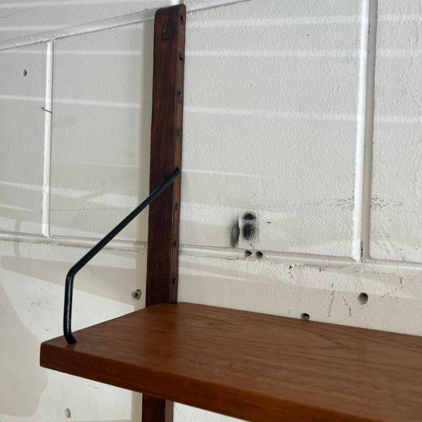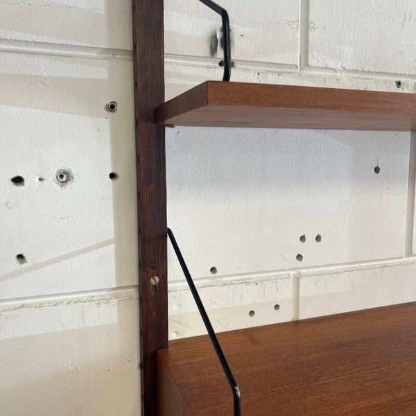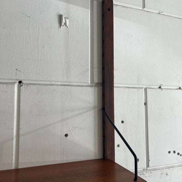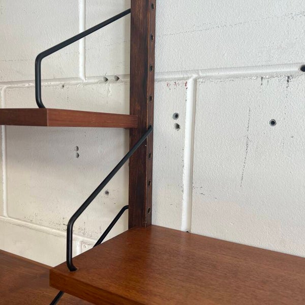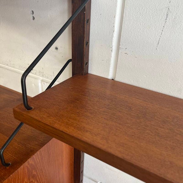 Prachtig vintage wandmeubel, wall unit uitgevoerd in teak (fineer) met zwart metalen beugels.