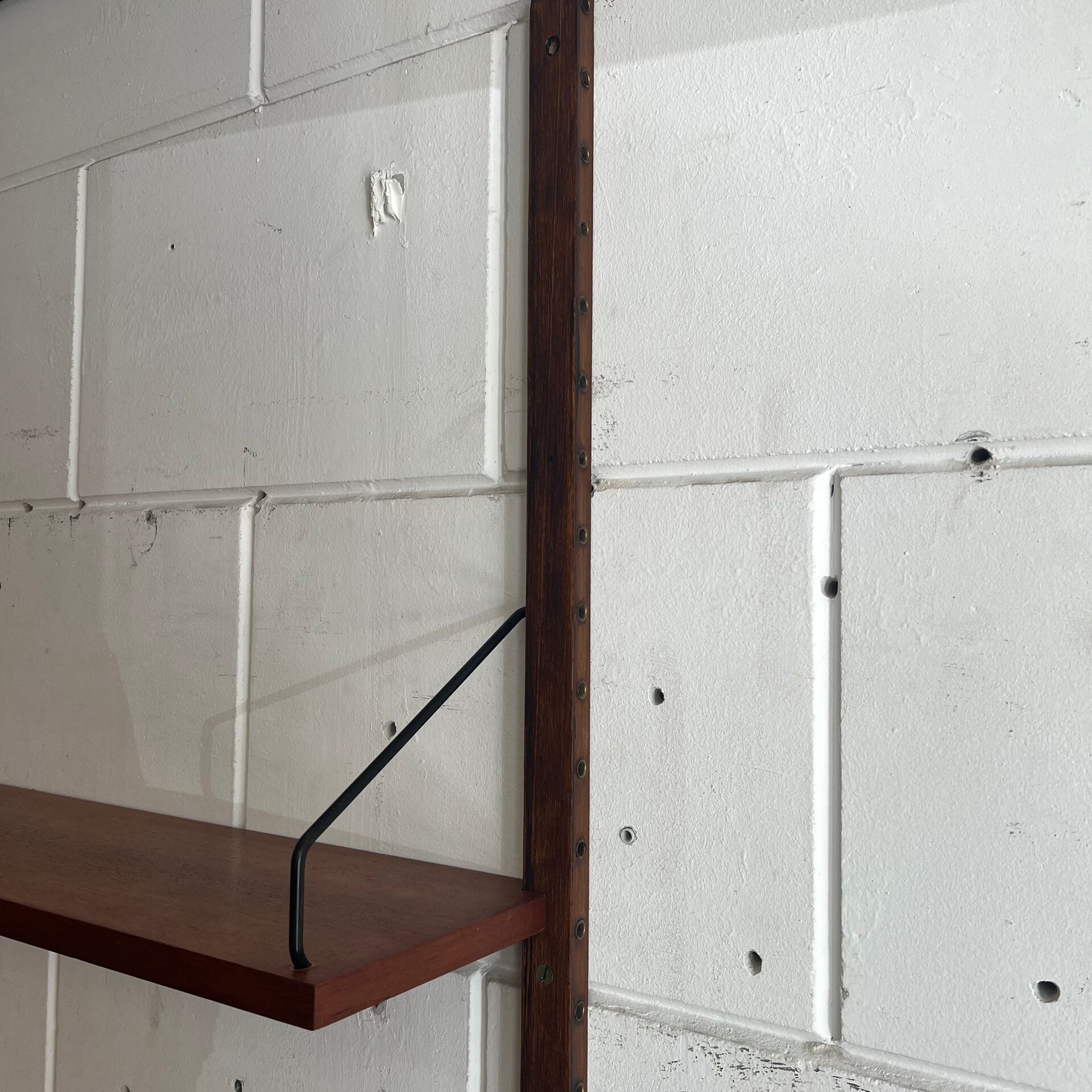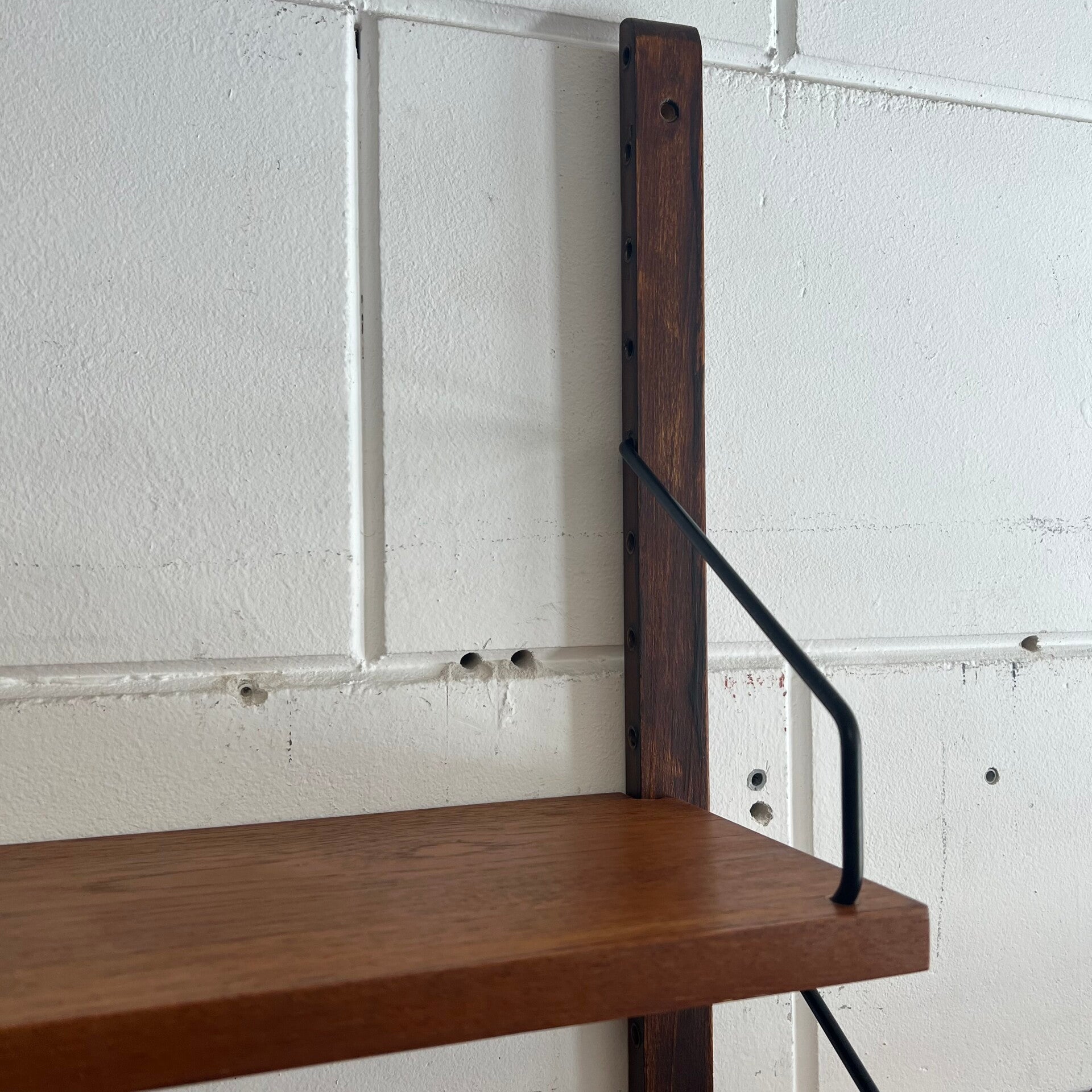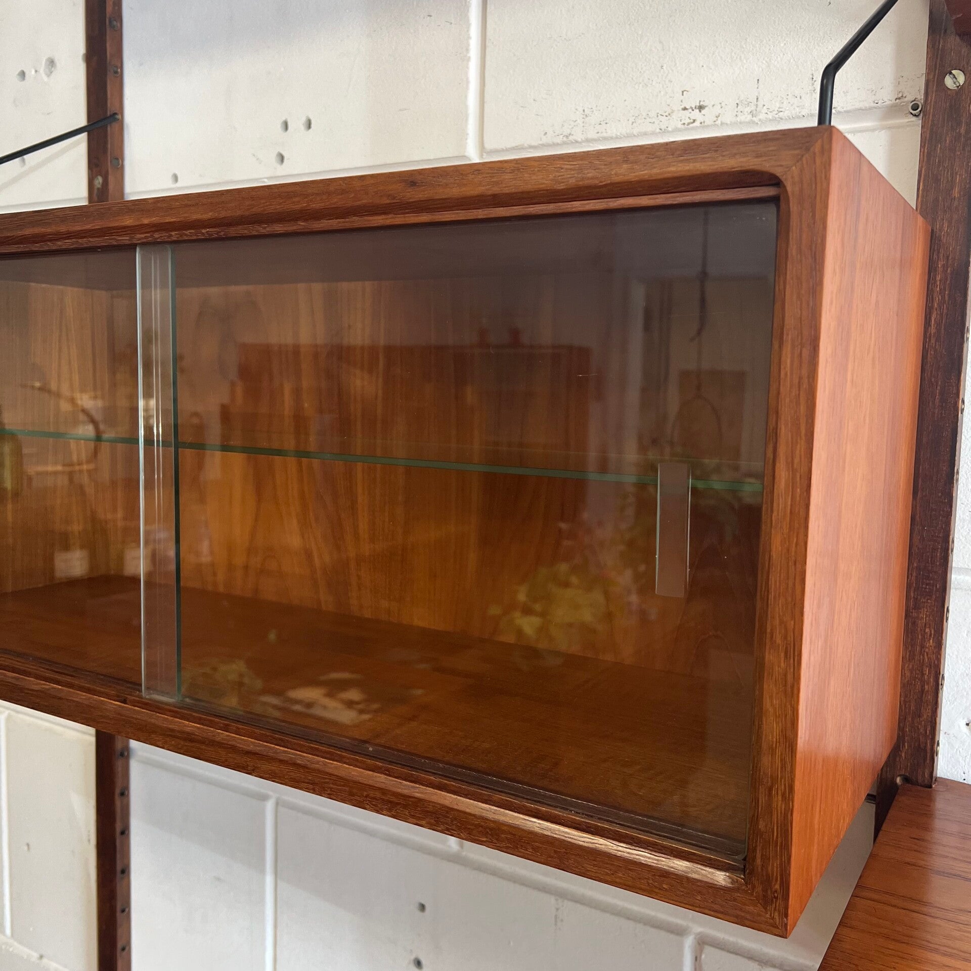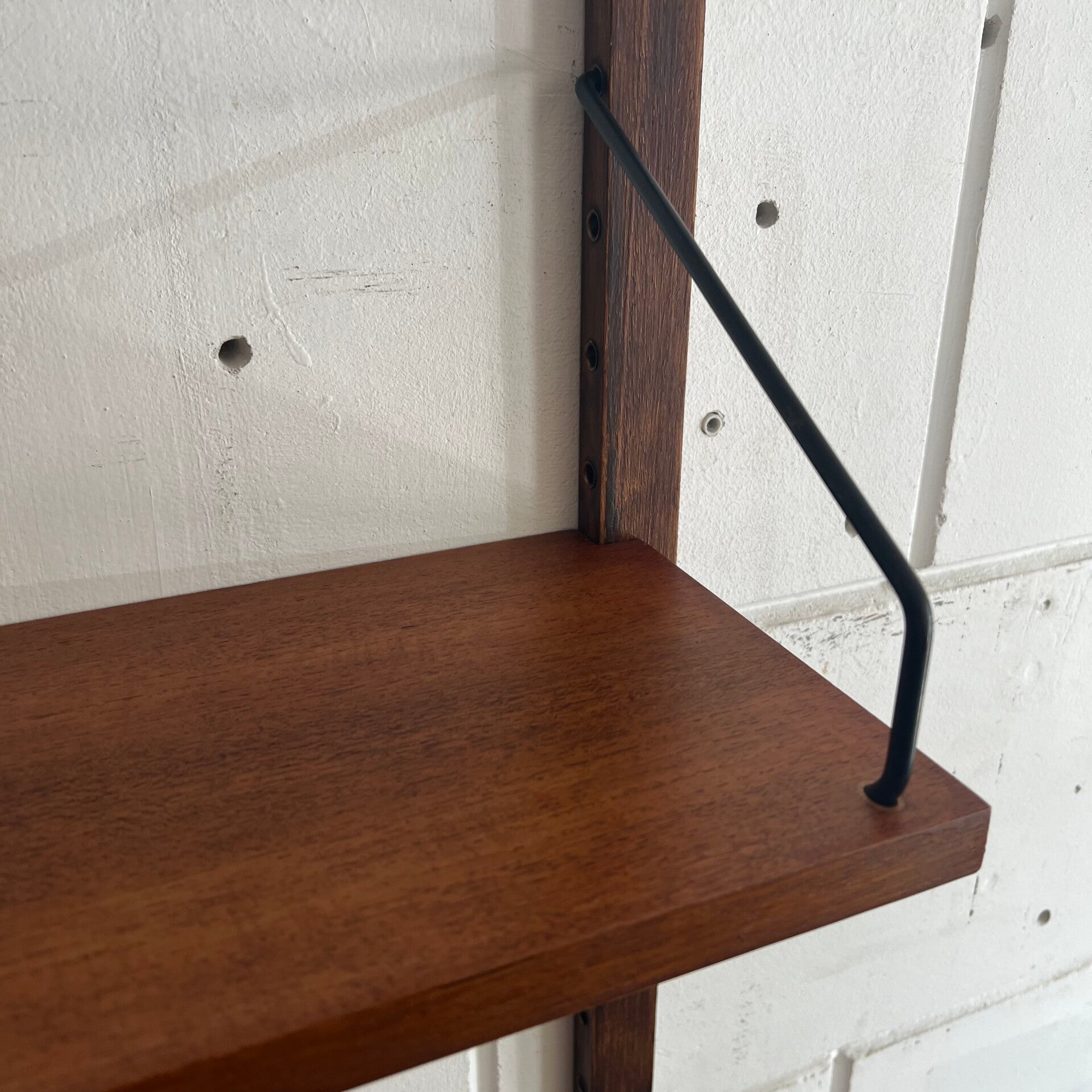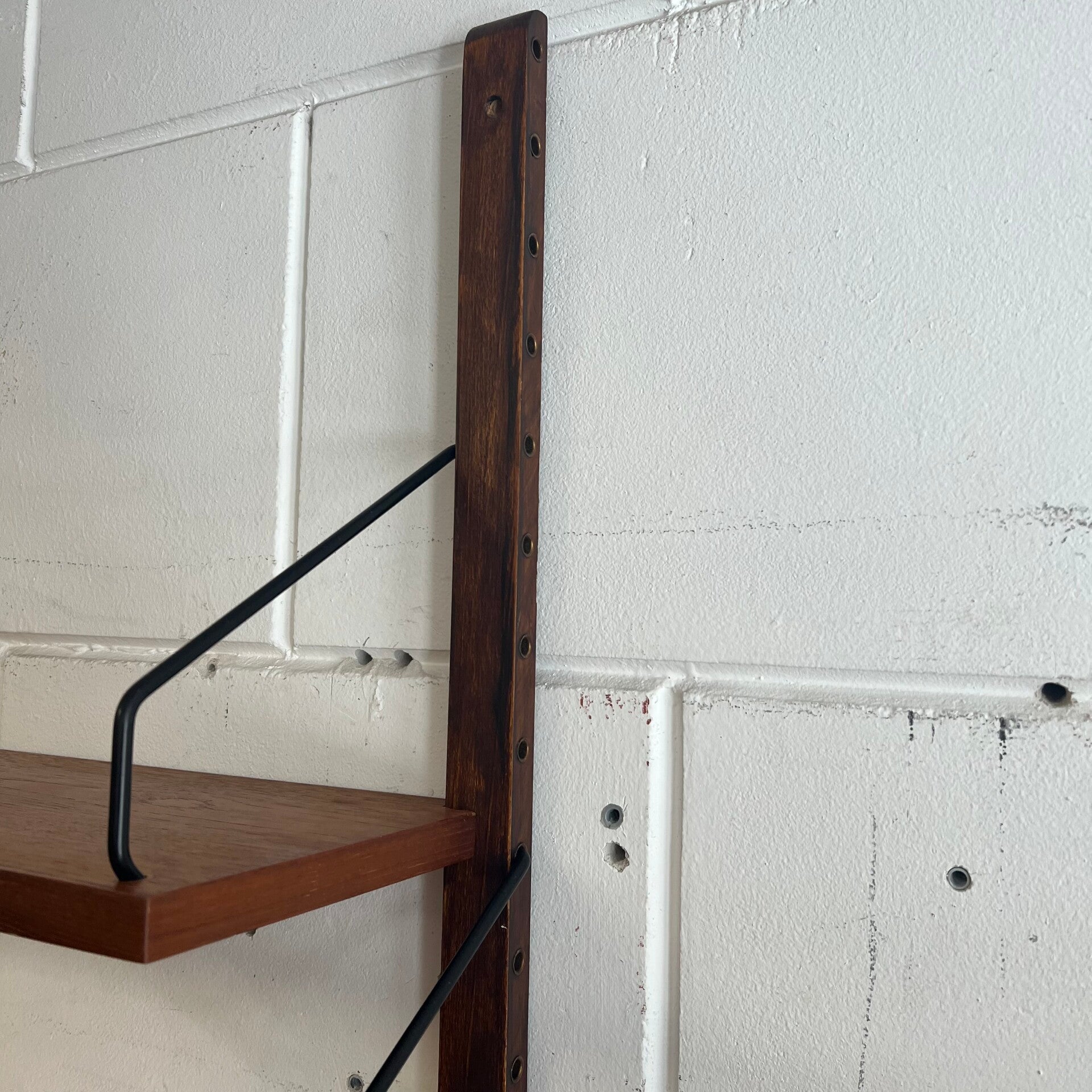 Prachtig vintage wandmeubel, wall unit uitgevoerd in teak (fineer) met zwart metalen beugels.