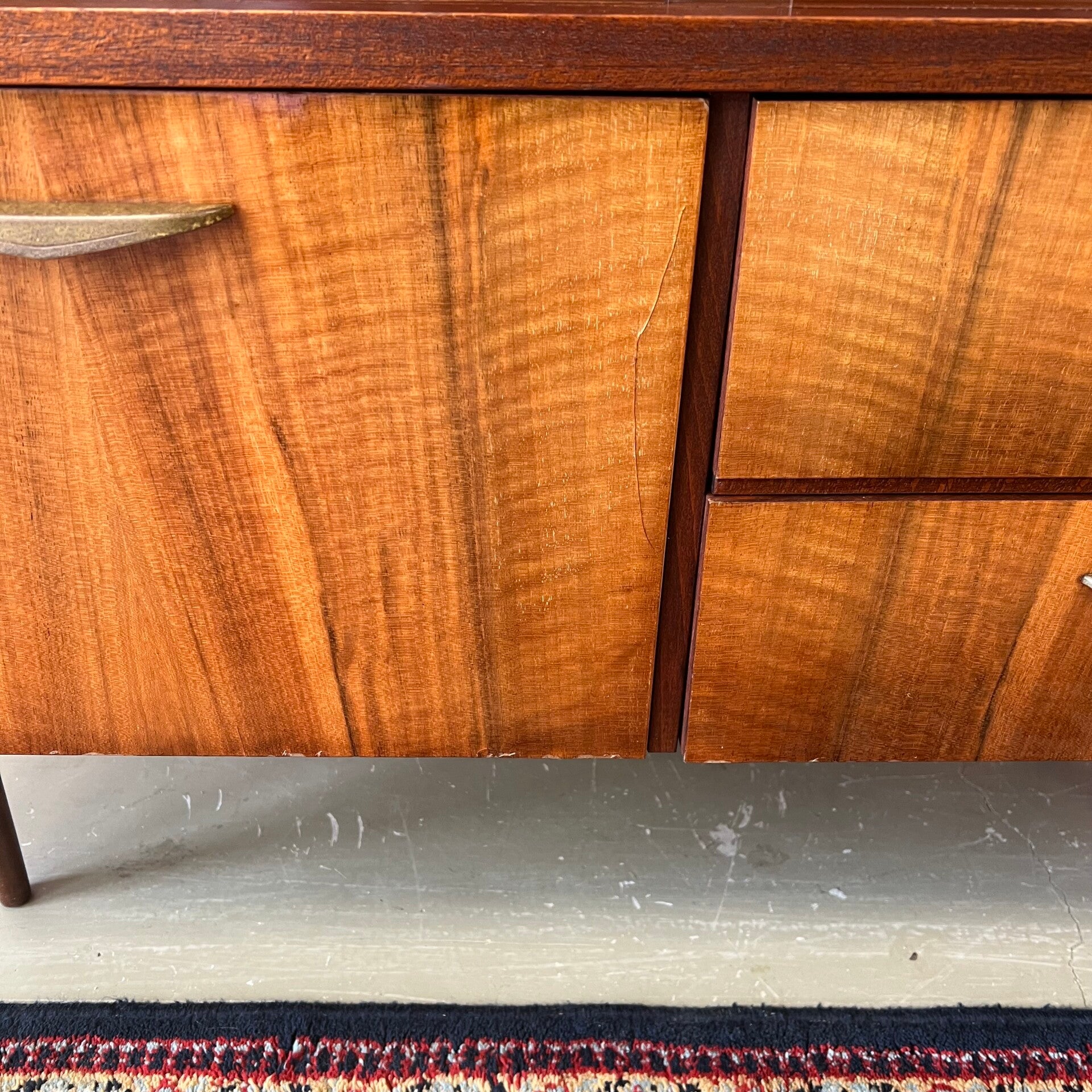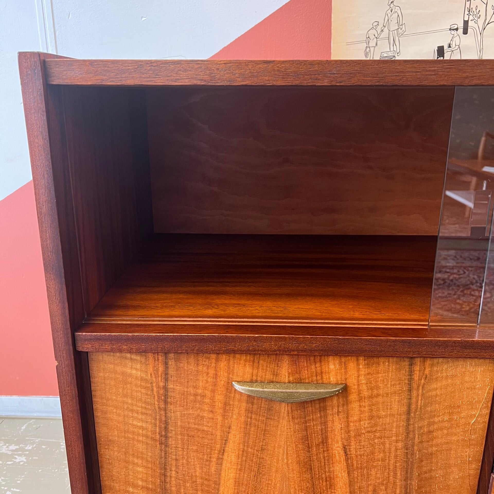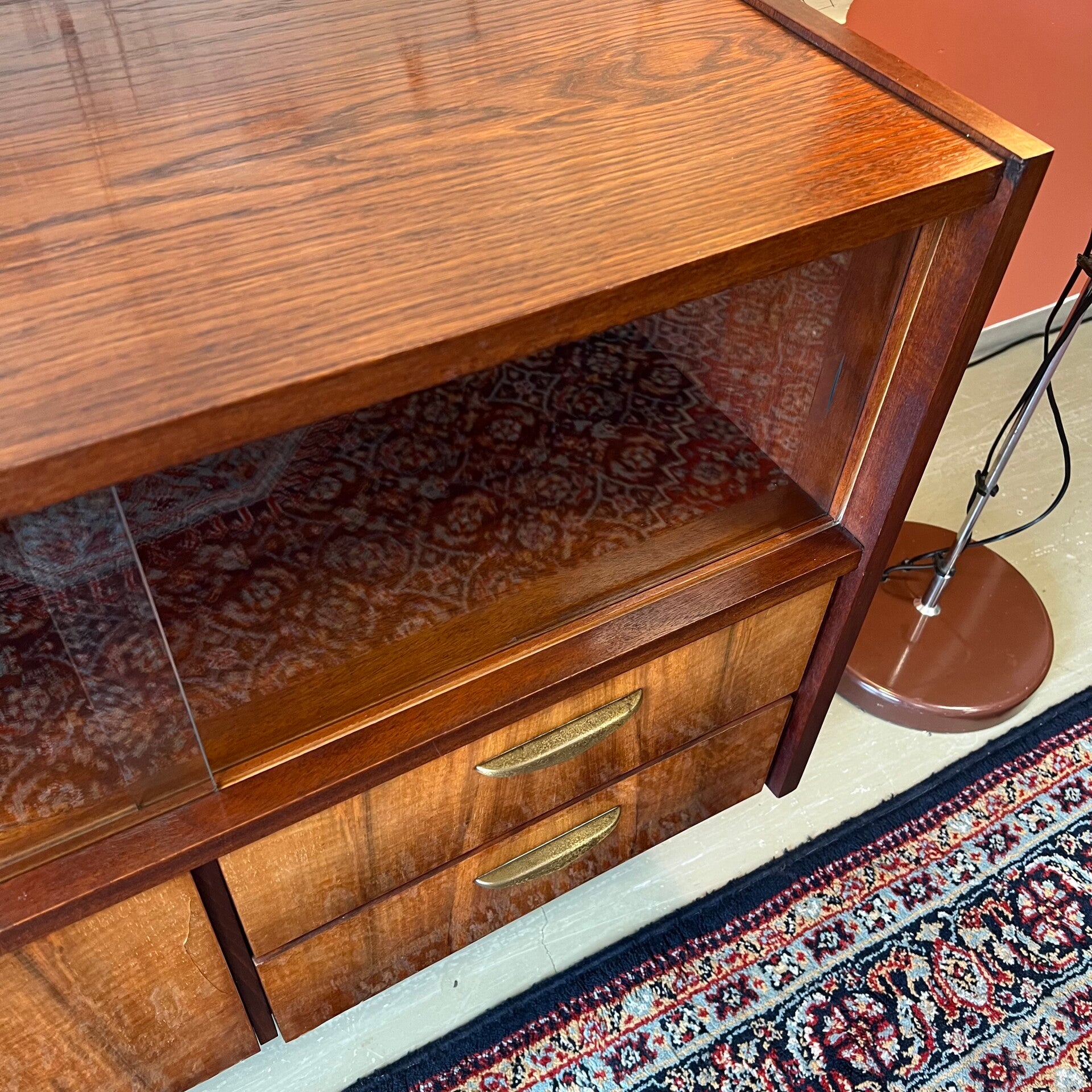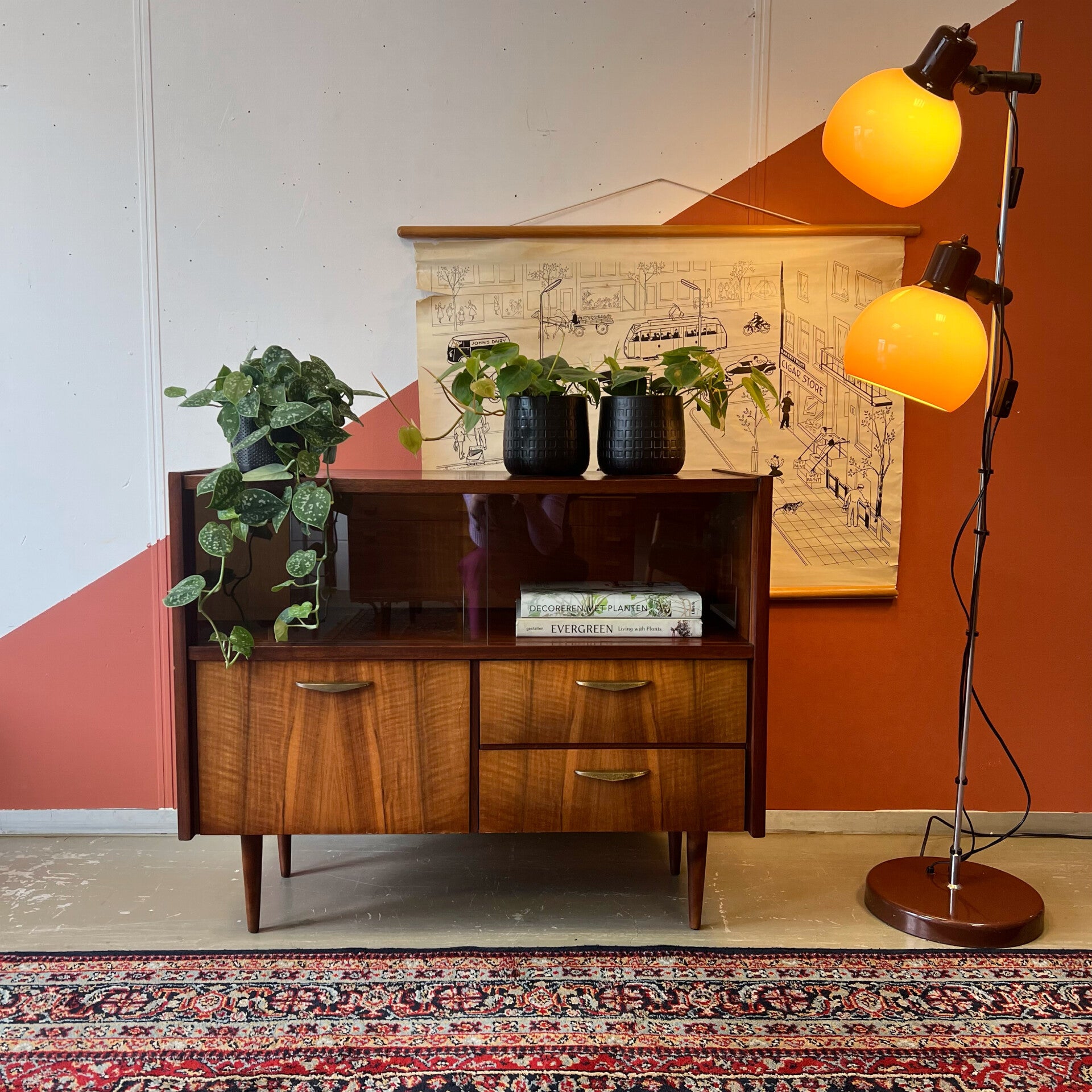 Leuk vintage TV-, audiomeubel met glazen schuifruitjes en slanke conische poten, DDR.
