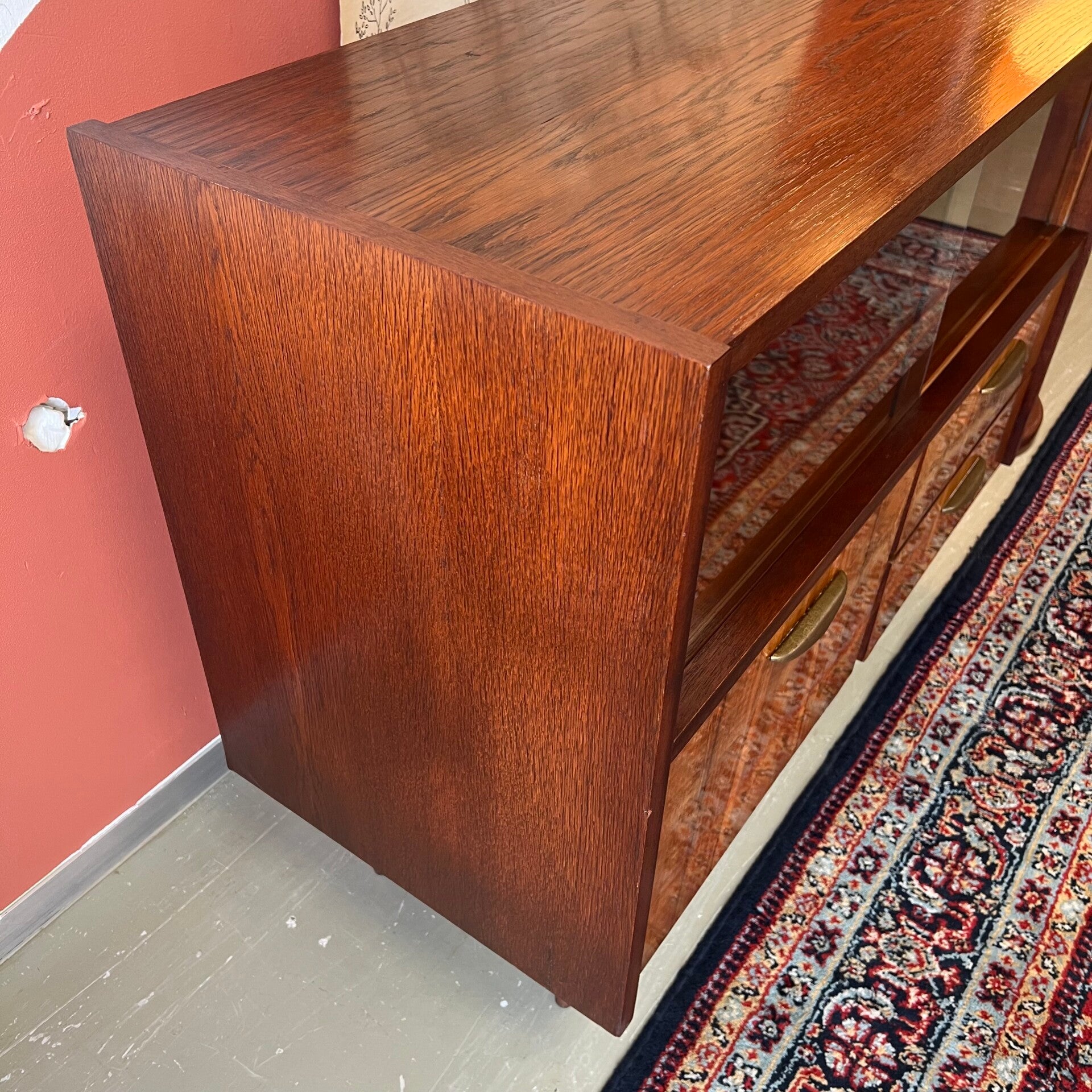 Het meubel heeft bovenin 2 glazen schuifdeurtjes met open ruimte erachter.