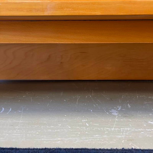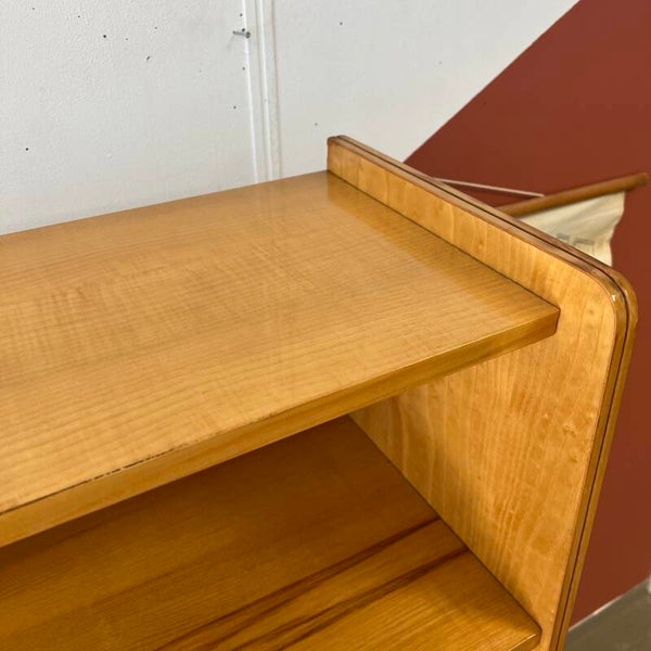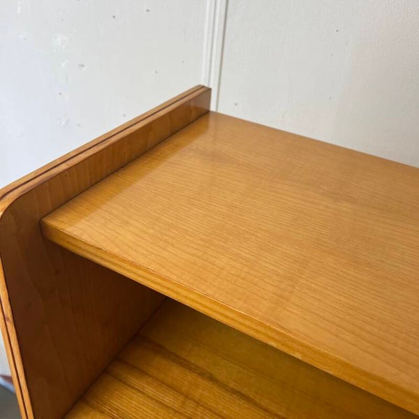 In licht gefineerd eiken/essenhout (deels hoogglans) met aan de voorzijde 2 schuine poten en achter een plank.