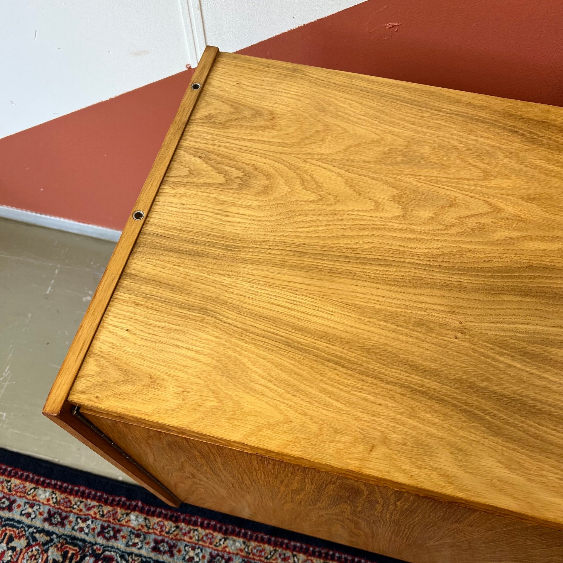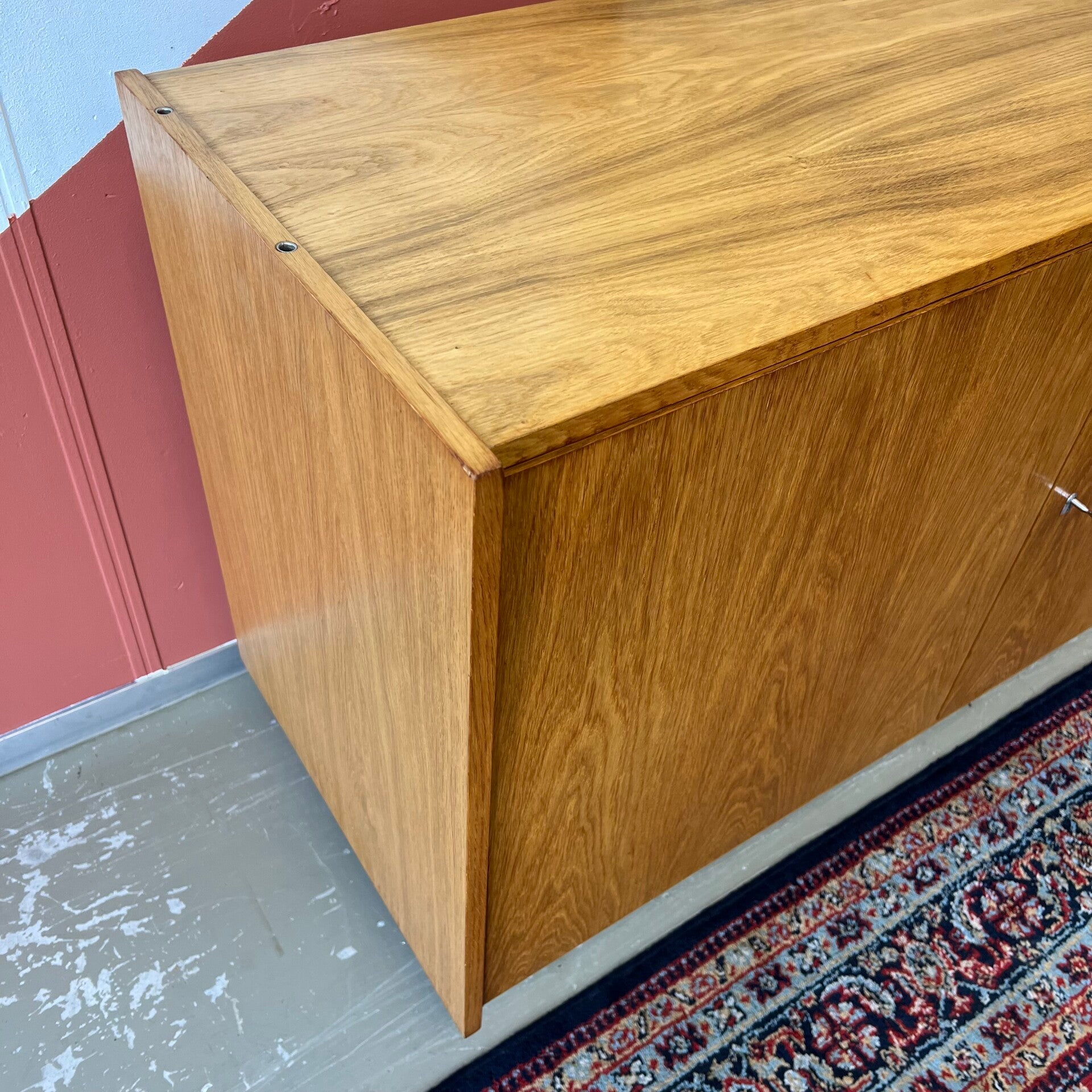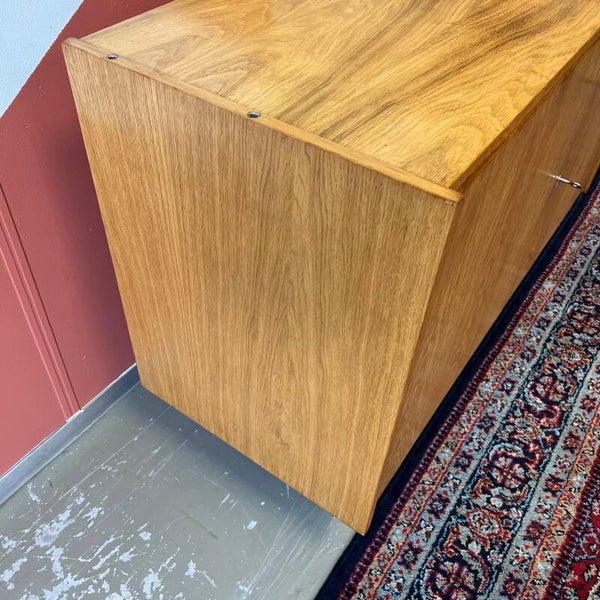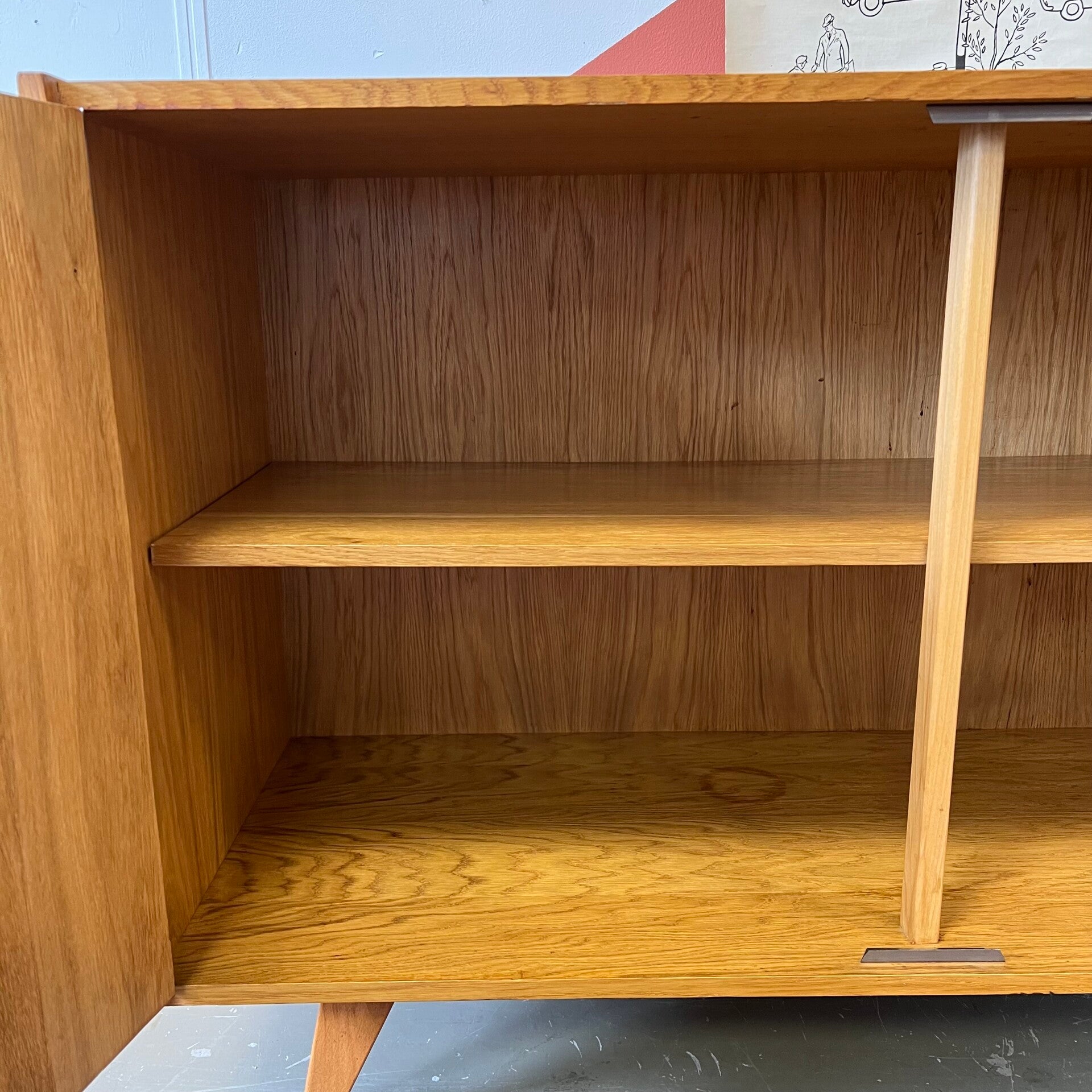 Leuk vintage design dressoir, commode of TV-, audiomeubel in eiken fineer met schuine pootjes.