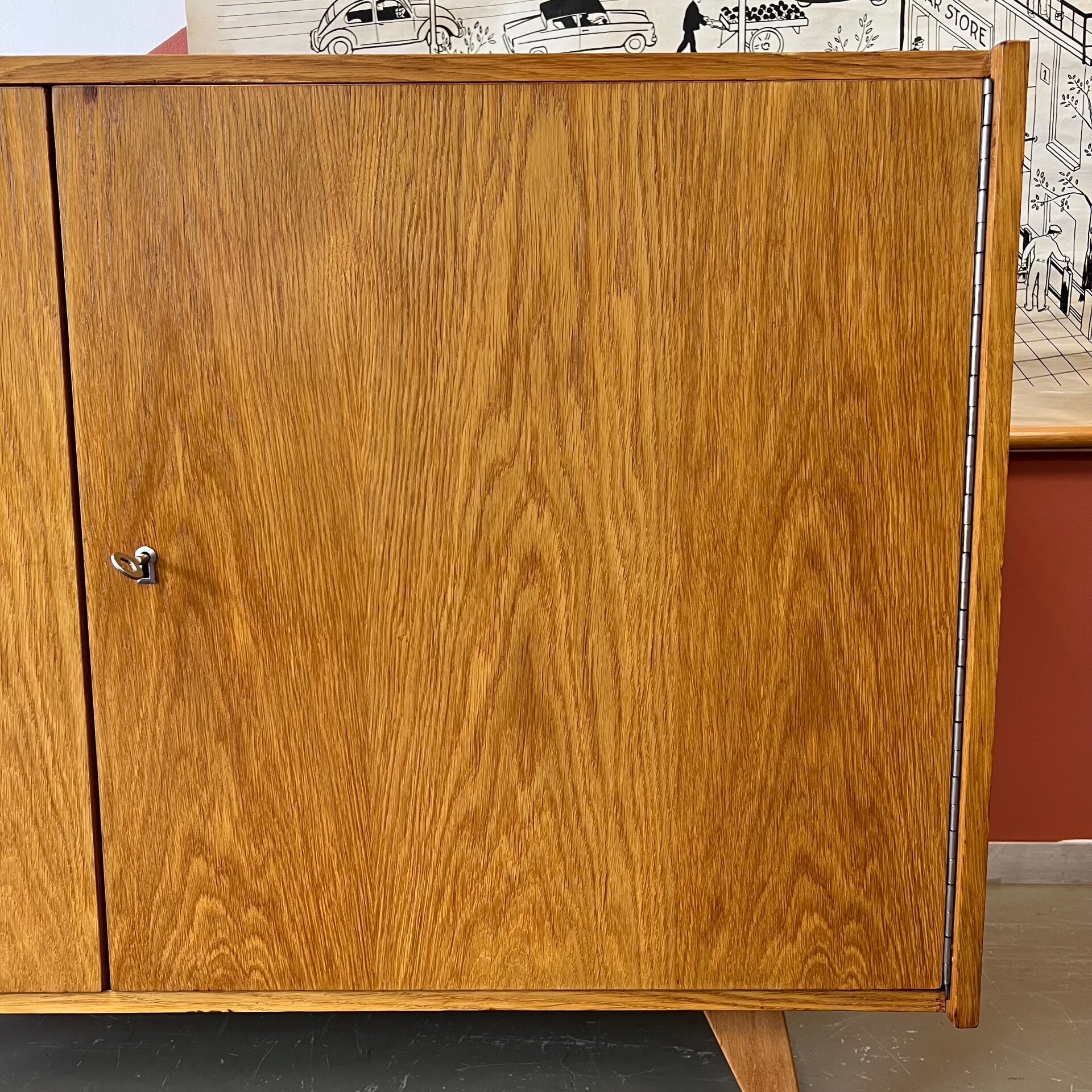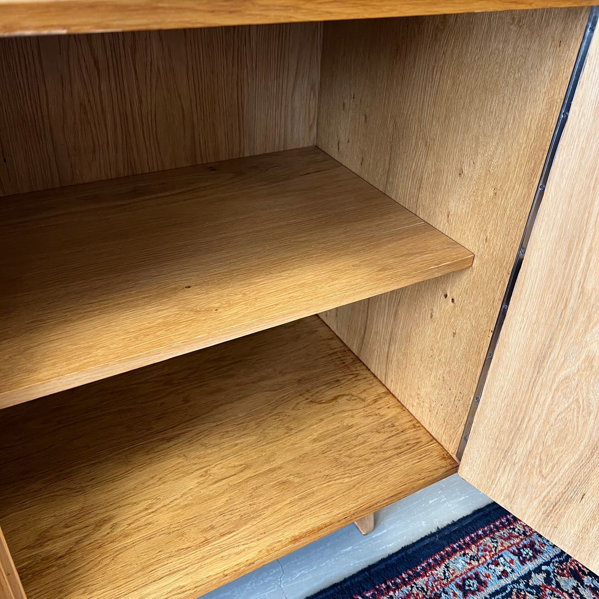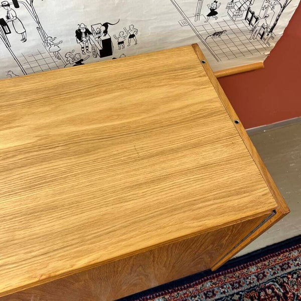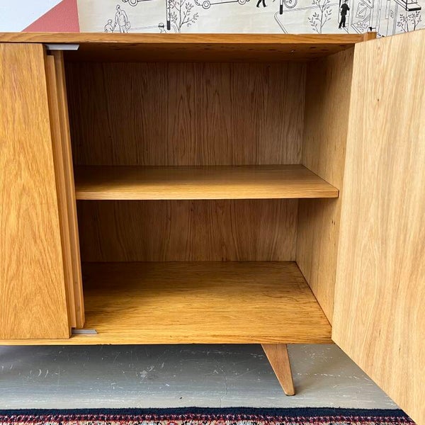 Leuk vintage design dressoir, commode of TV-, audiomeubel in eiken fineer met schuine pootjes.