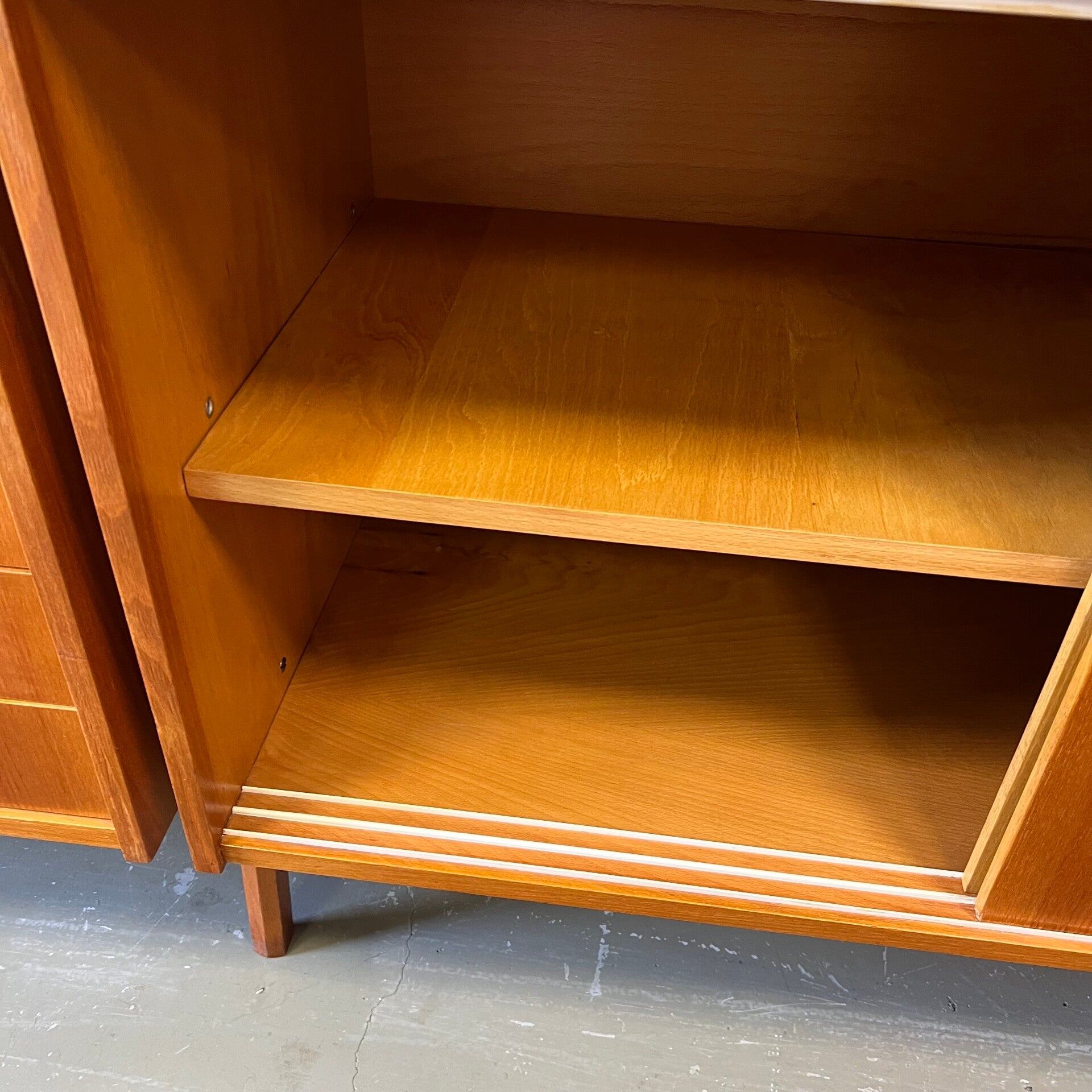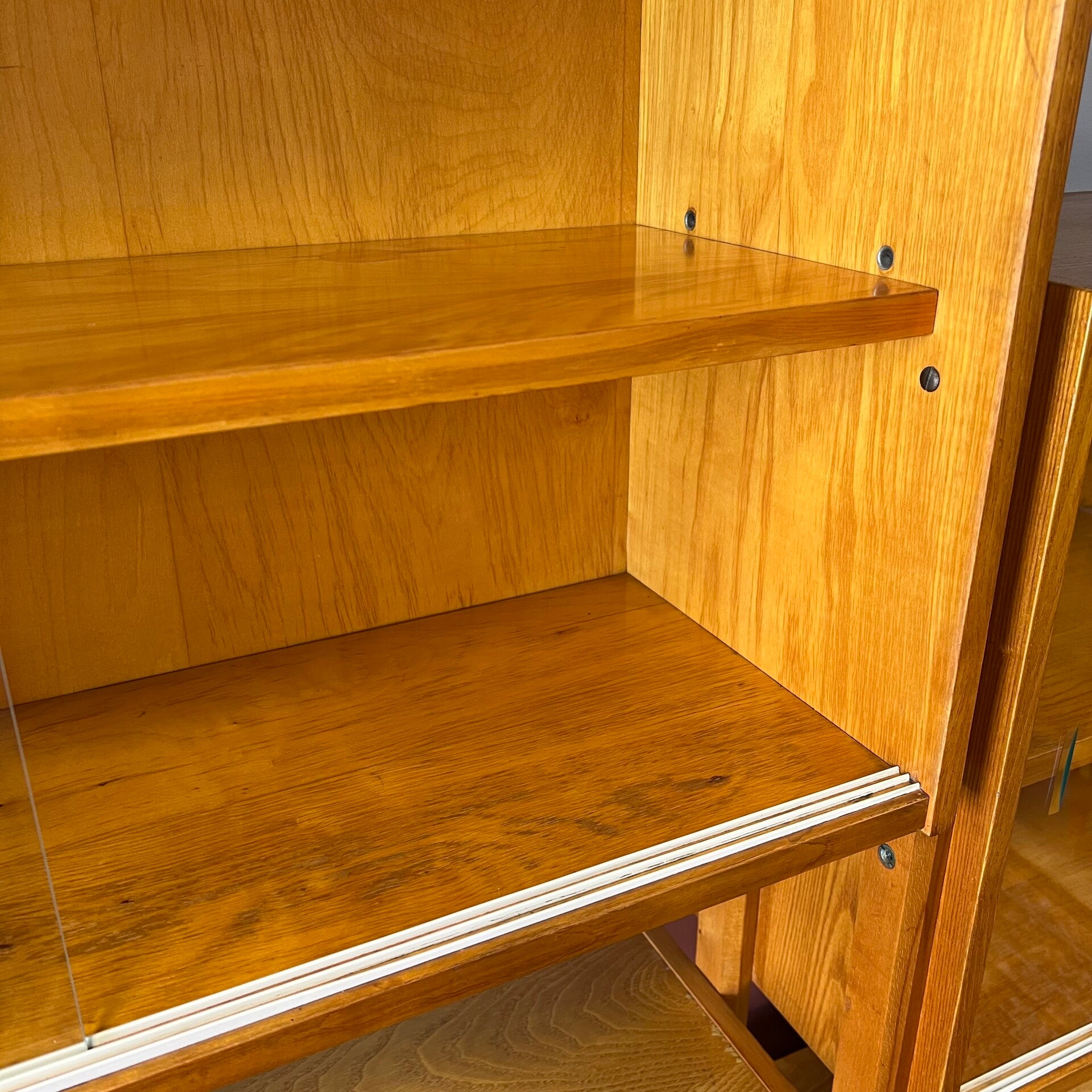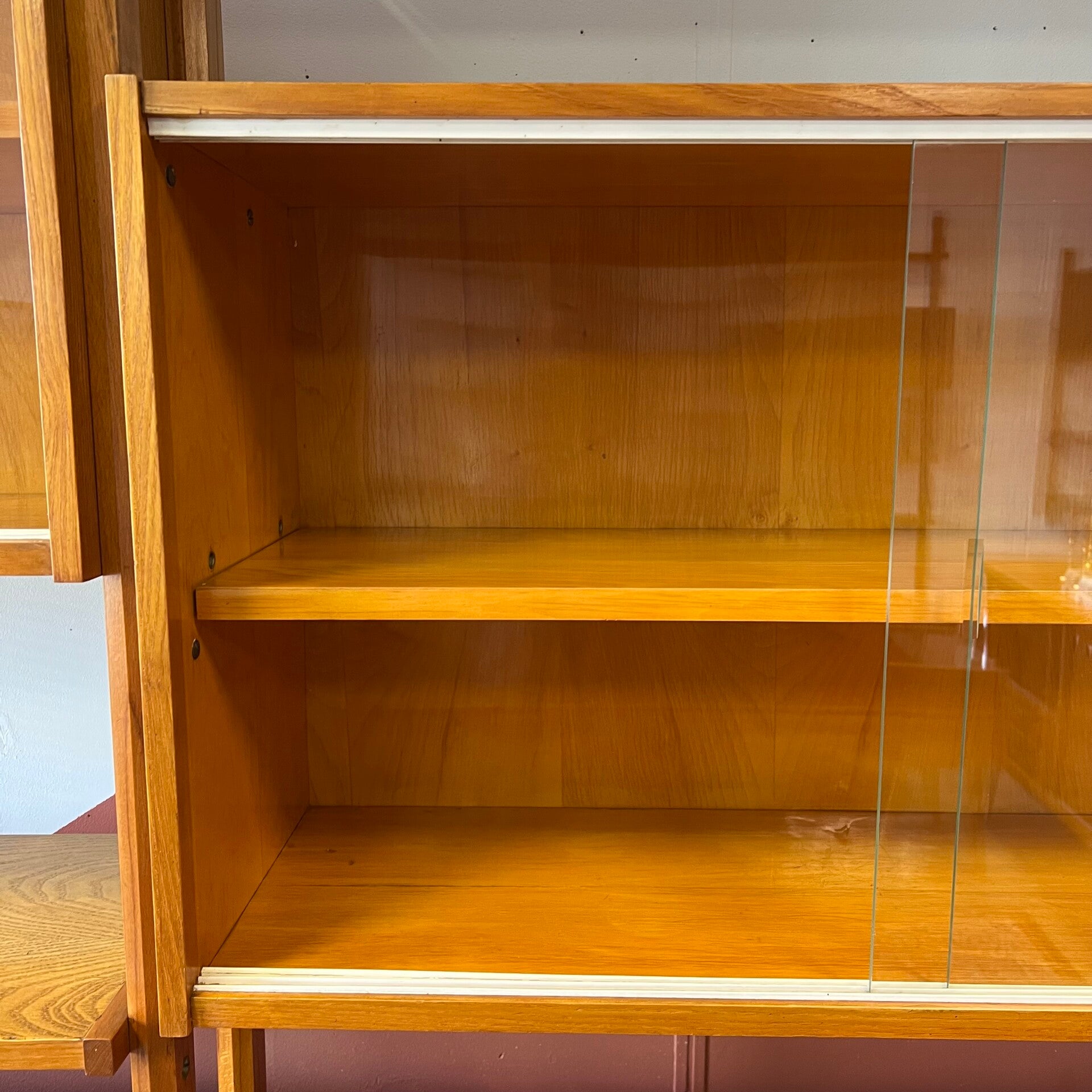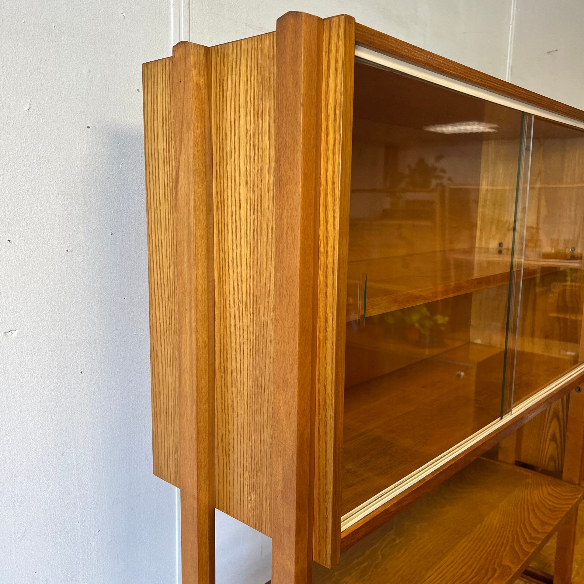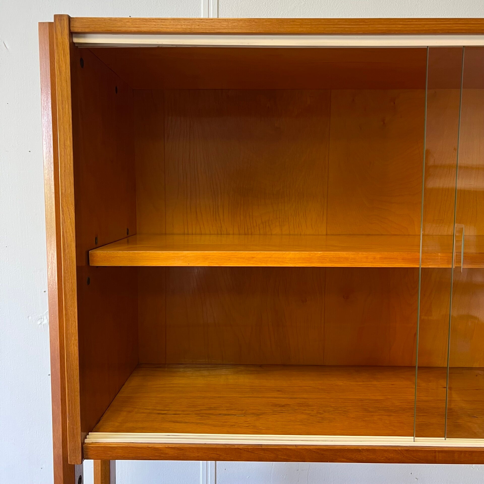Het deel rechts heeft bovenin een plank. In het midden een vitrinekast met glazen schuifruitjes en een uitneembare plank. Onderin een schuifdeurkast met de originele kunststof handgrepen (links mist een stukje) en uitneembare plank.