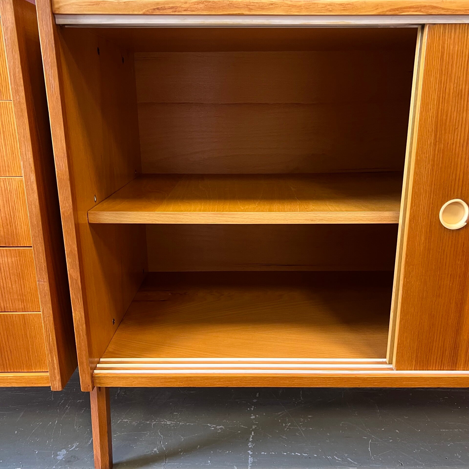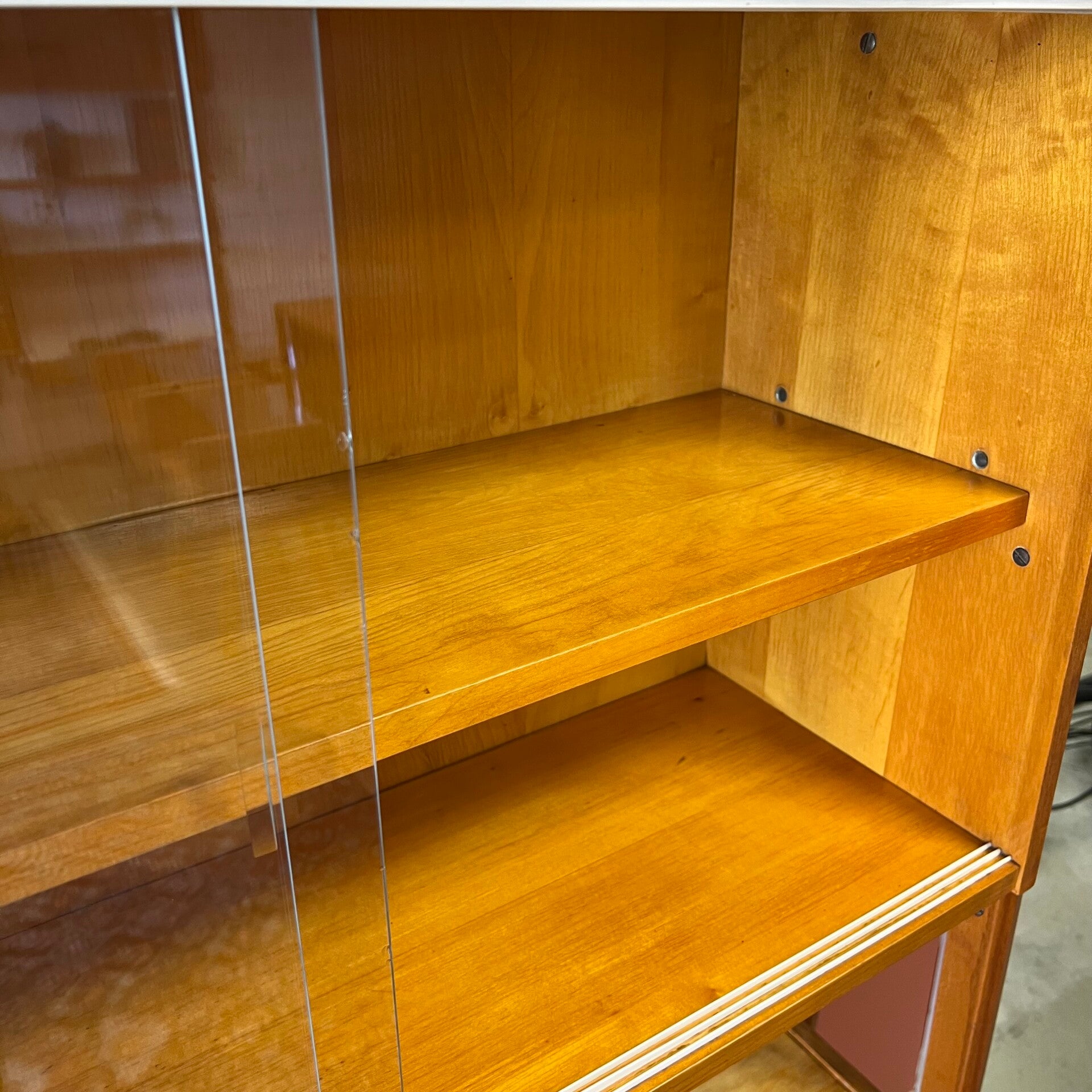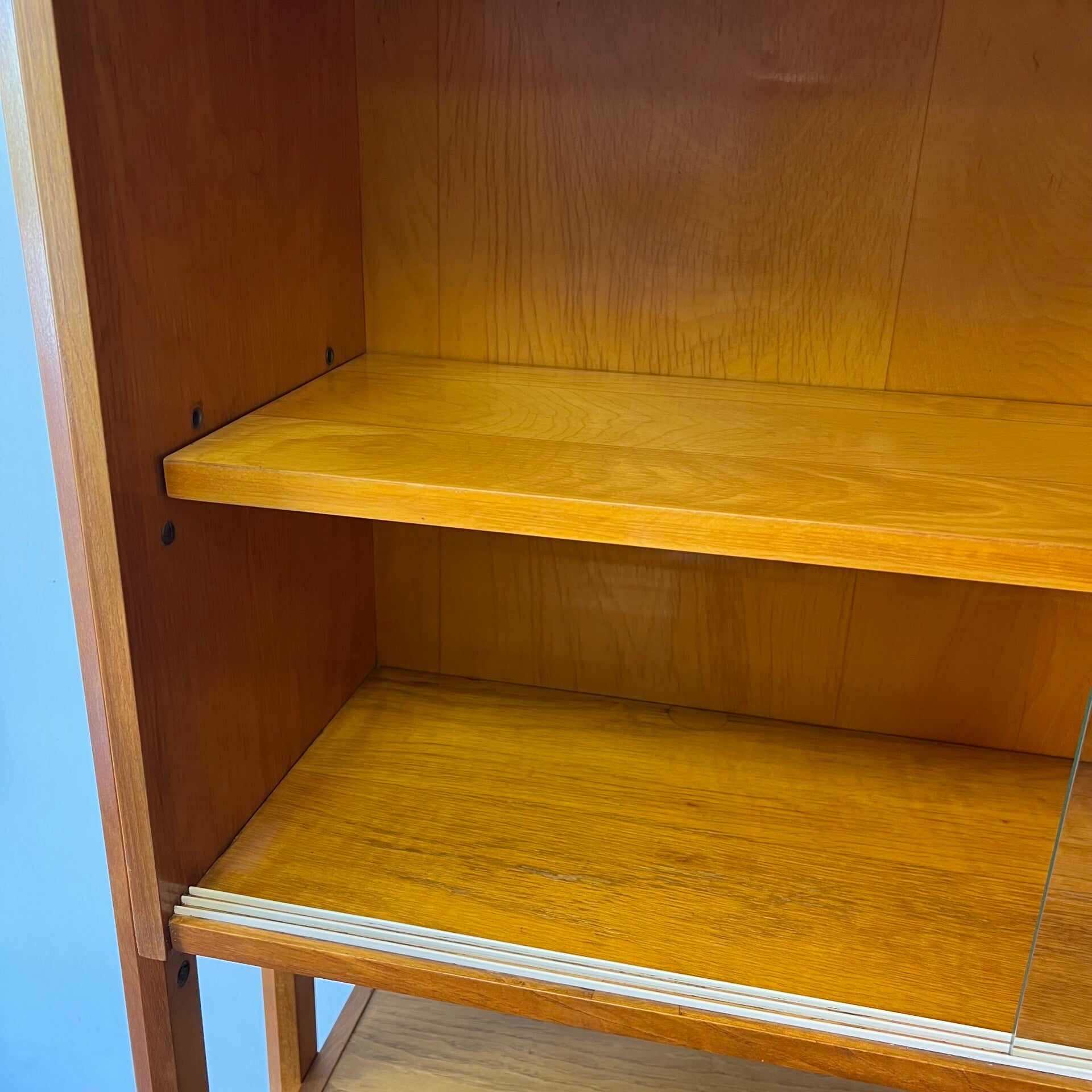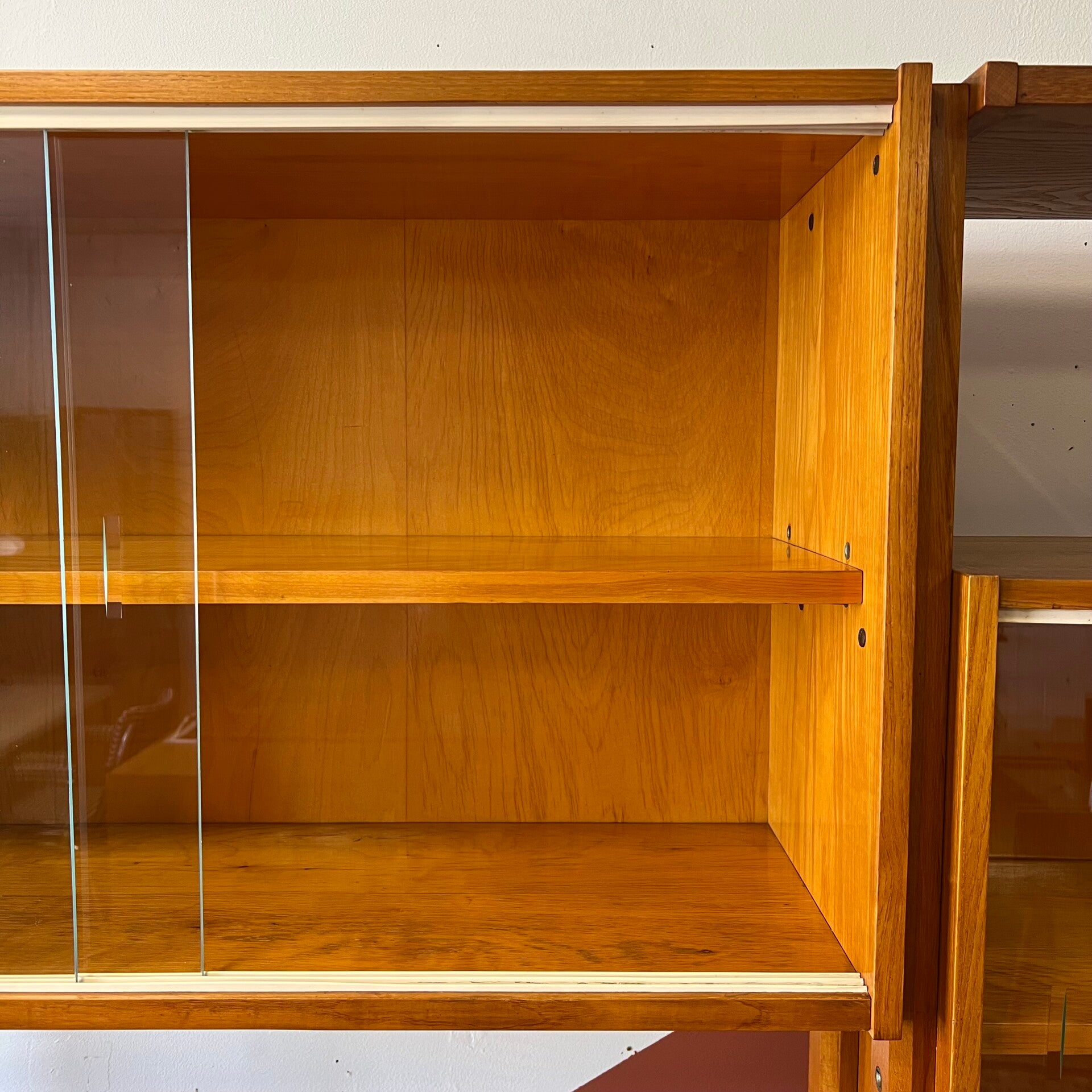 Het deel rechts heeft bovenin een plank. In het midden een vitrinekast met glazen schuifruitjes en een uitneembare plank. Onderin een schuifdeurkast met de originele kunststof handgrepen (links mist een stukje) en uitneembare plank.