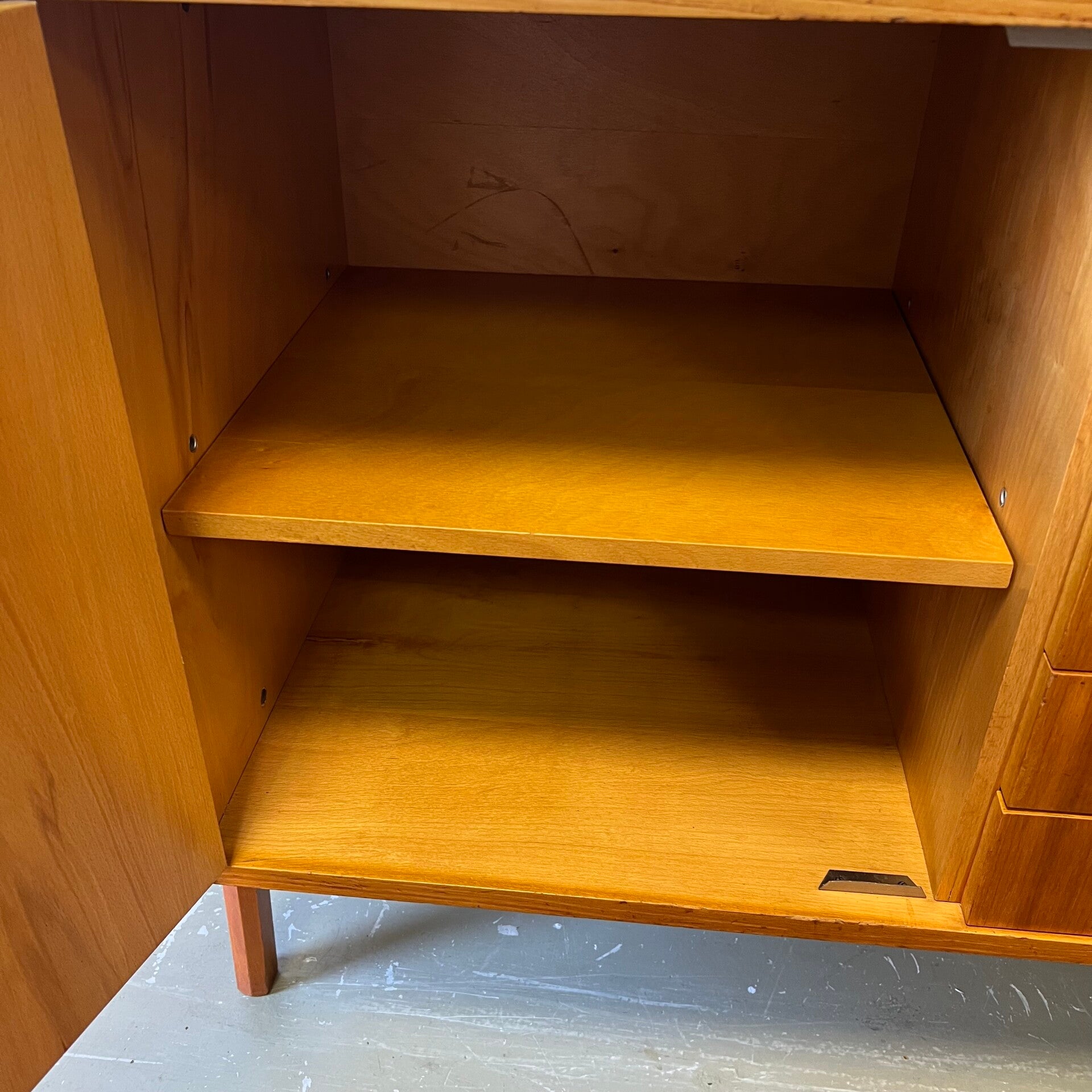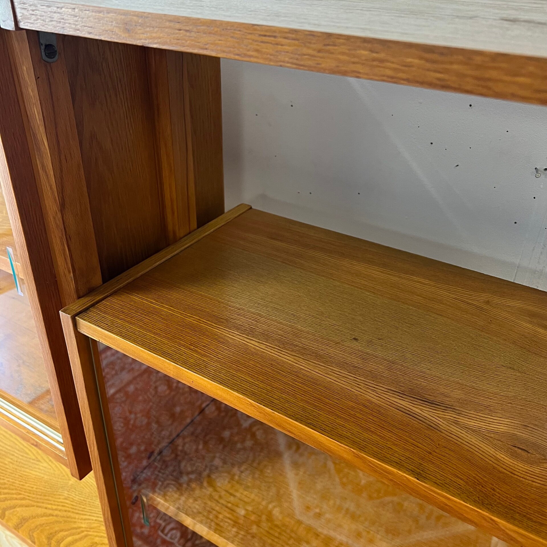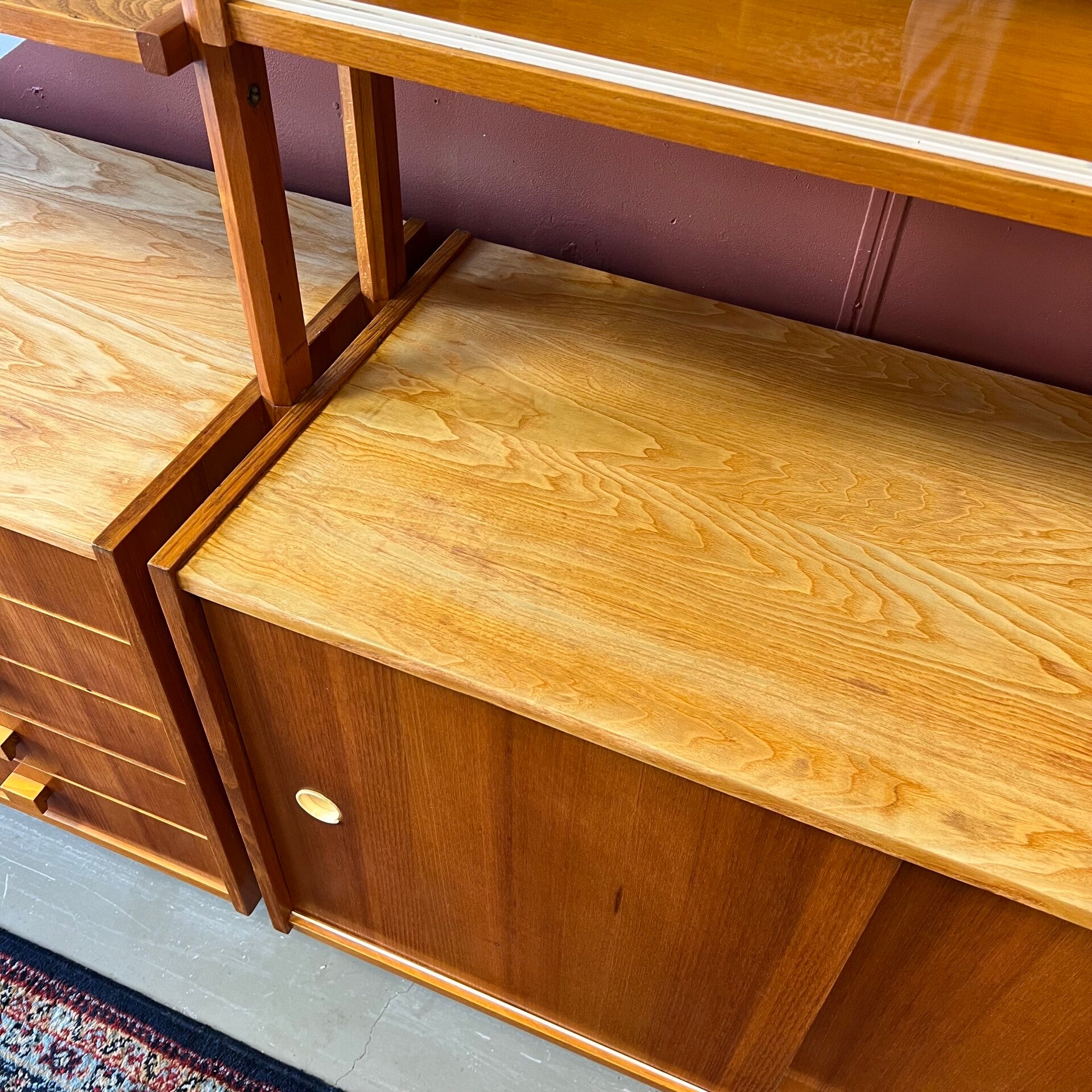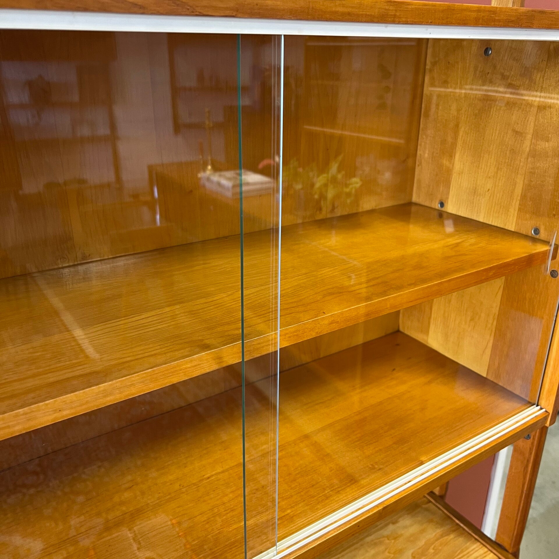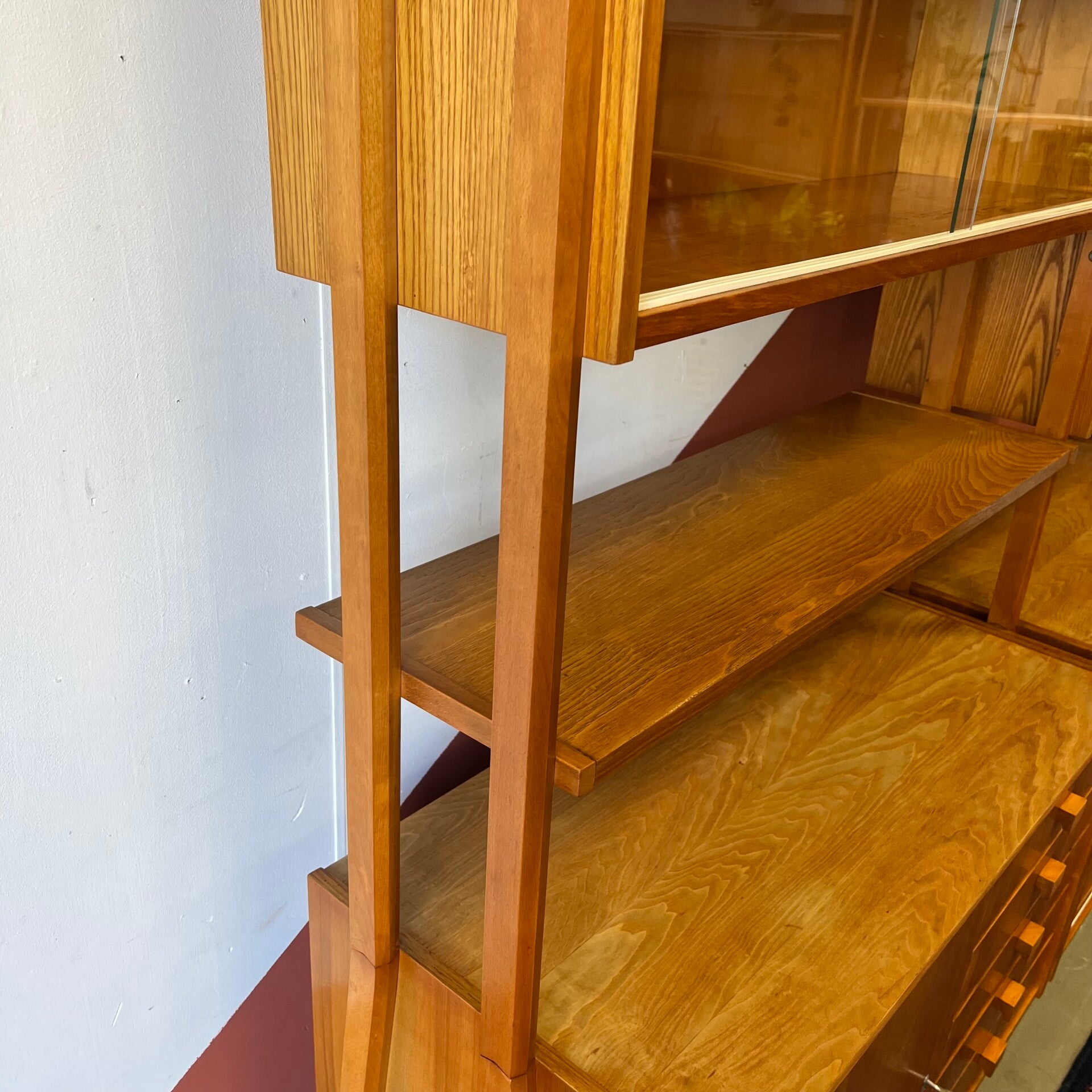 Het deel rechts heeft bovenin een plank. In het midden een vitrinekast met glazen schuifruitjes en een uitneembare plank. Onderin een schuifdeurkast met de originele kunststof handgrepen (links mist een stukje) en uitneembare plank.