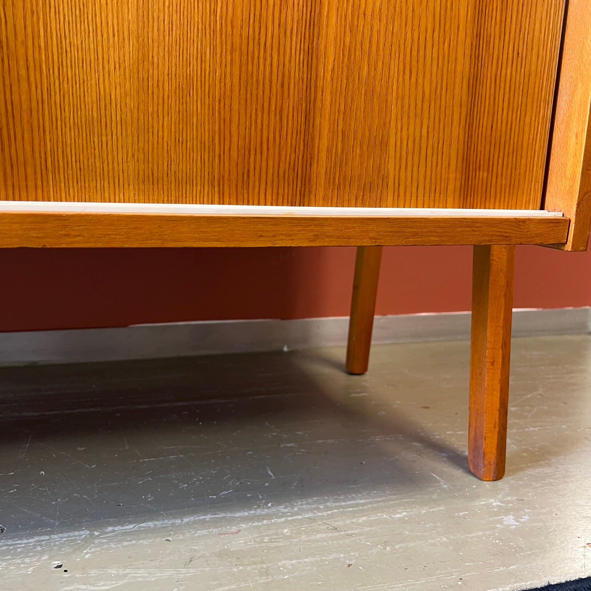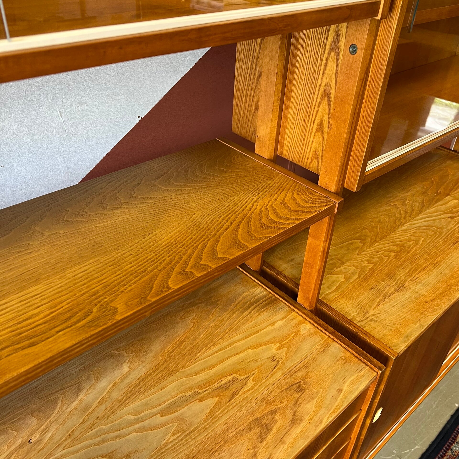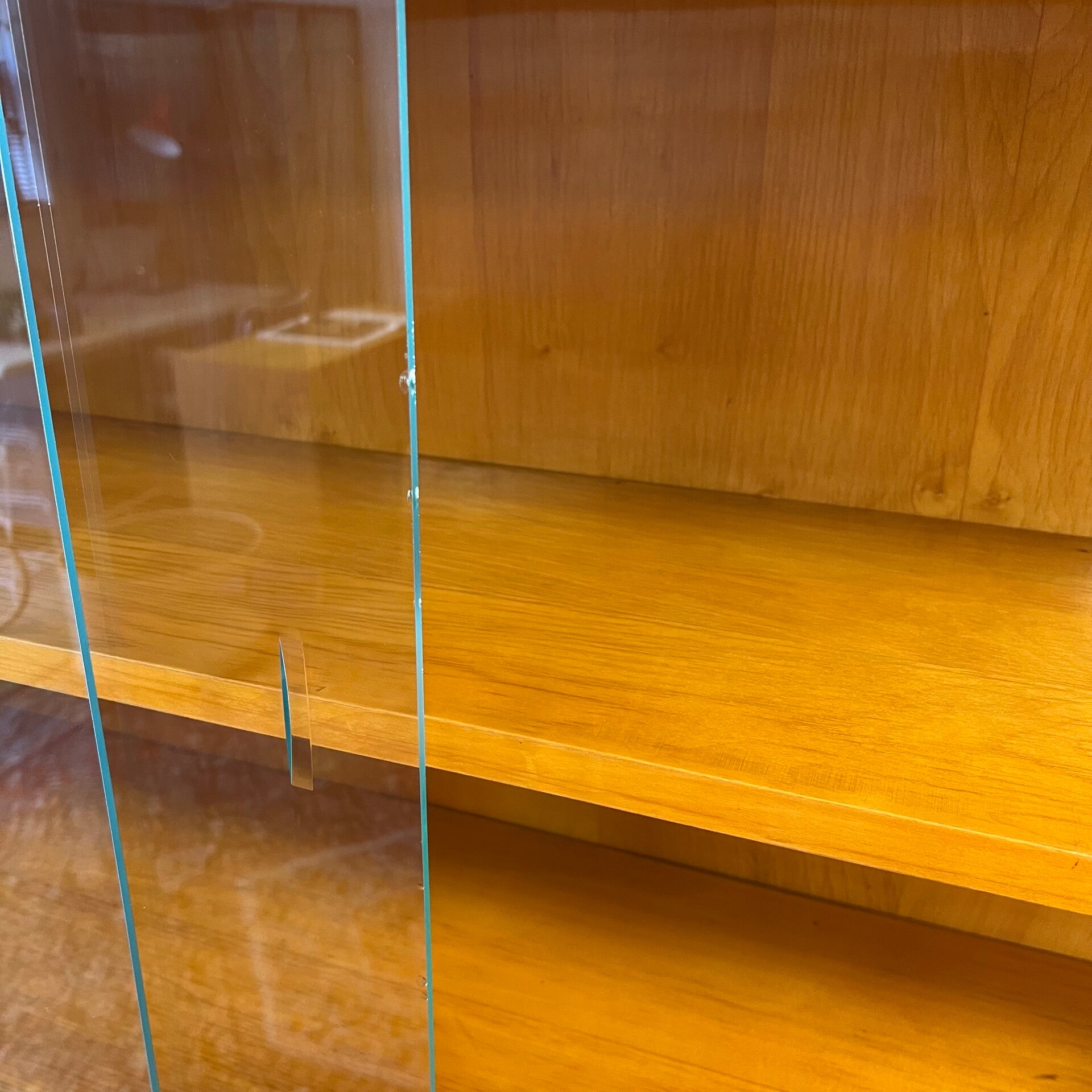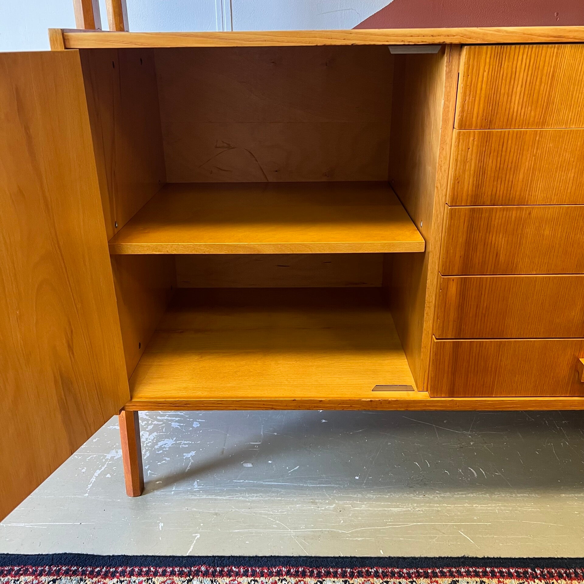 Het deel rechts heeft bovenin een plank. In het midden een vitrinekast met glazen schuifruitjes en een uitneembare plank. Onderin een schuifdeurkast met de originele kunststof handgrepen (links mist een stukje) en uitneembare plank.