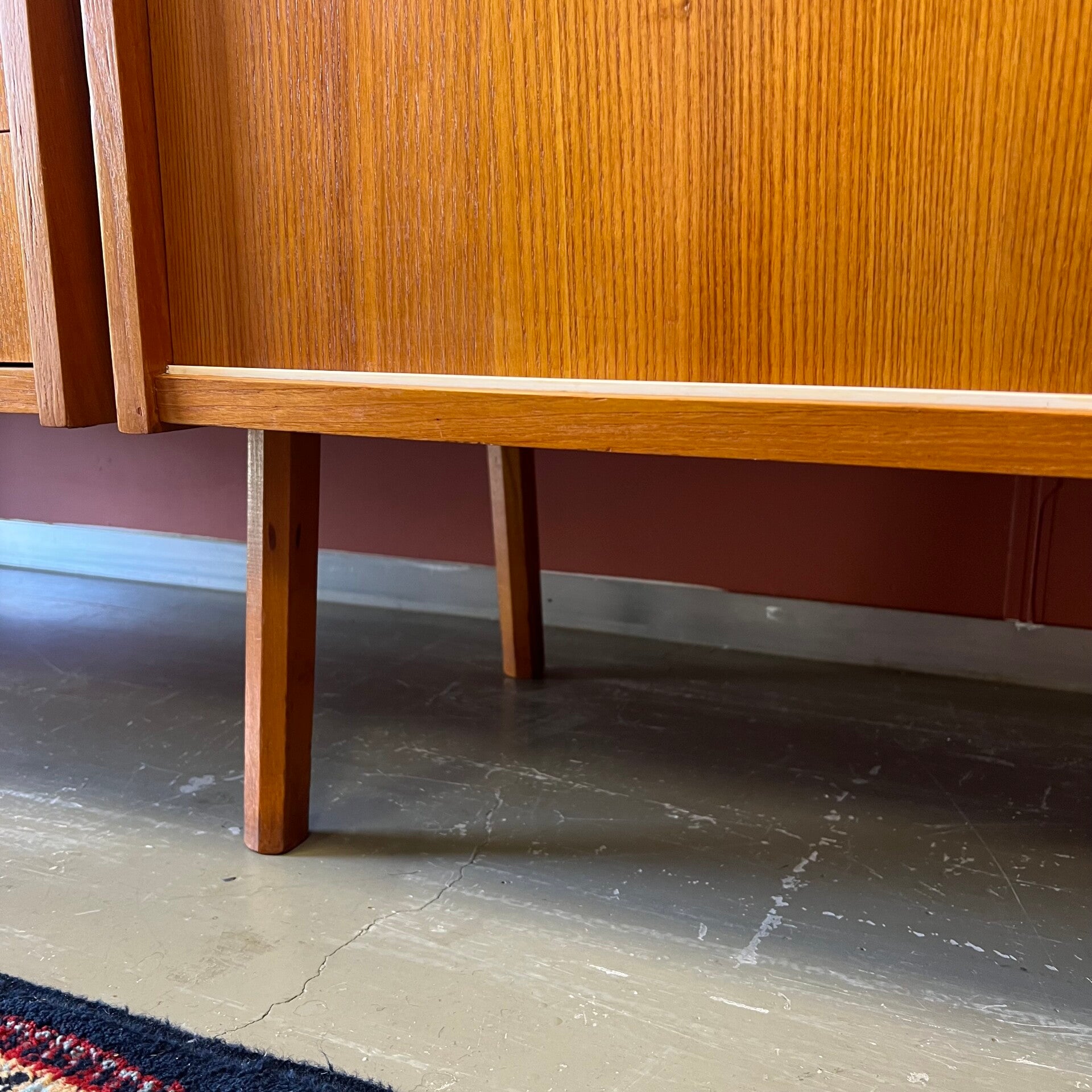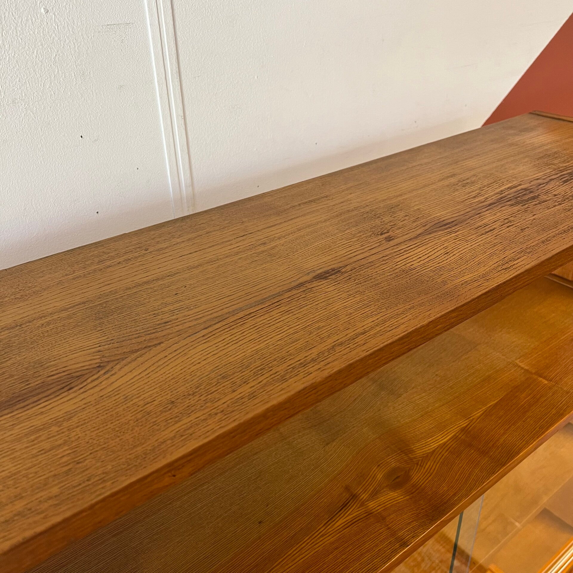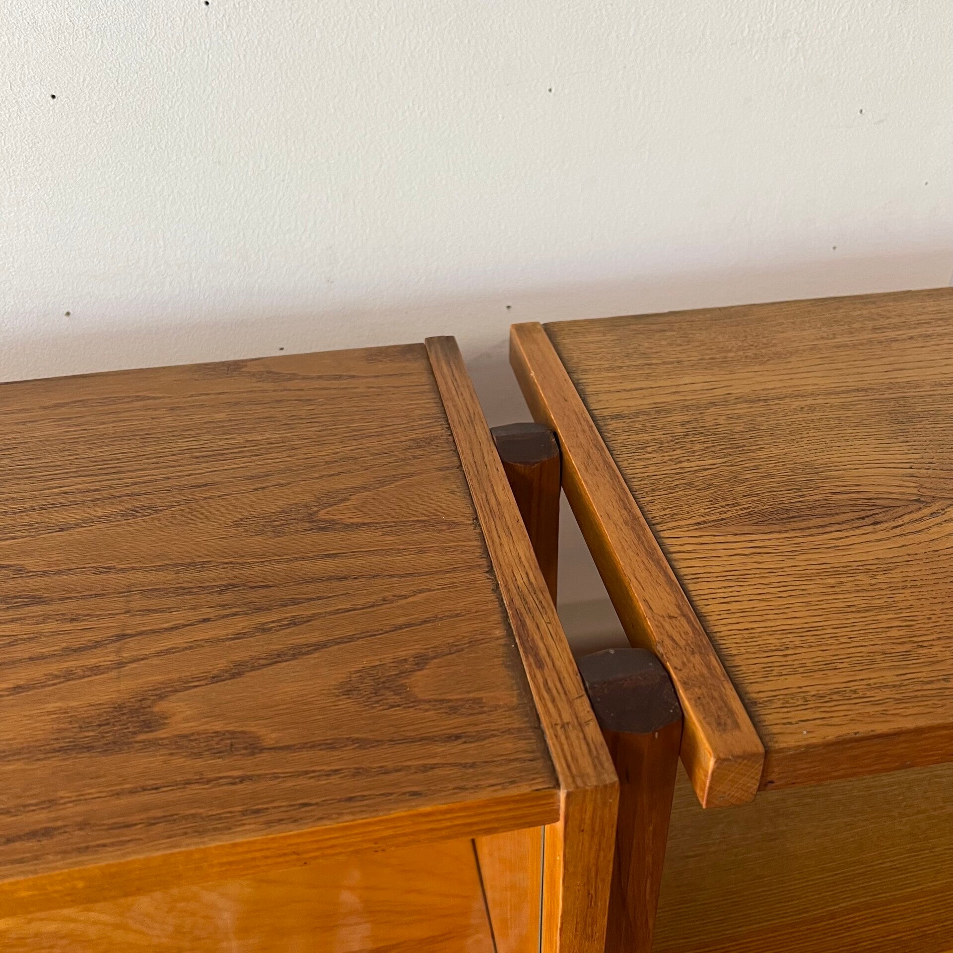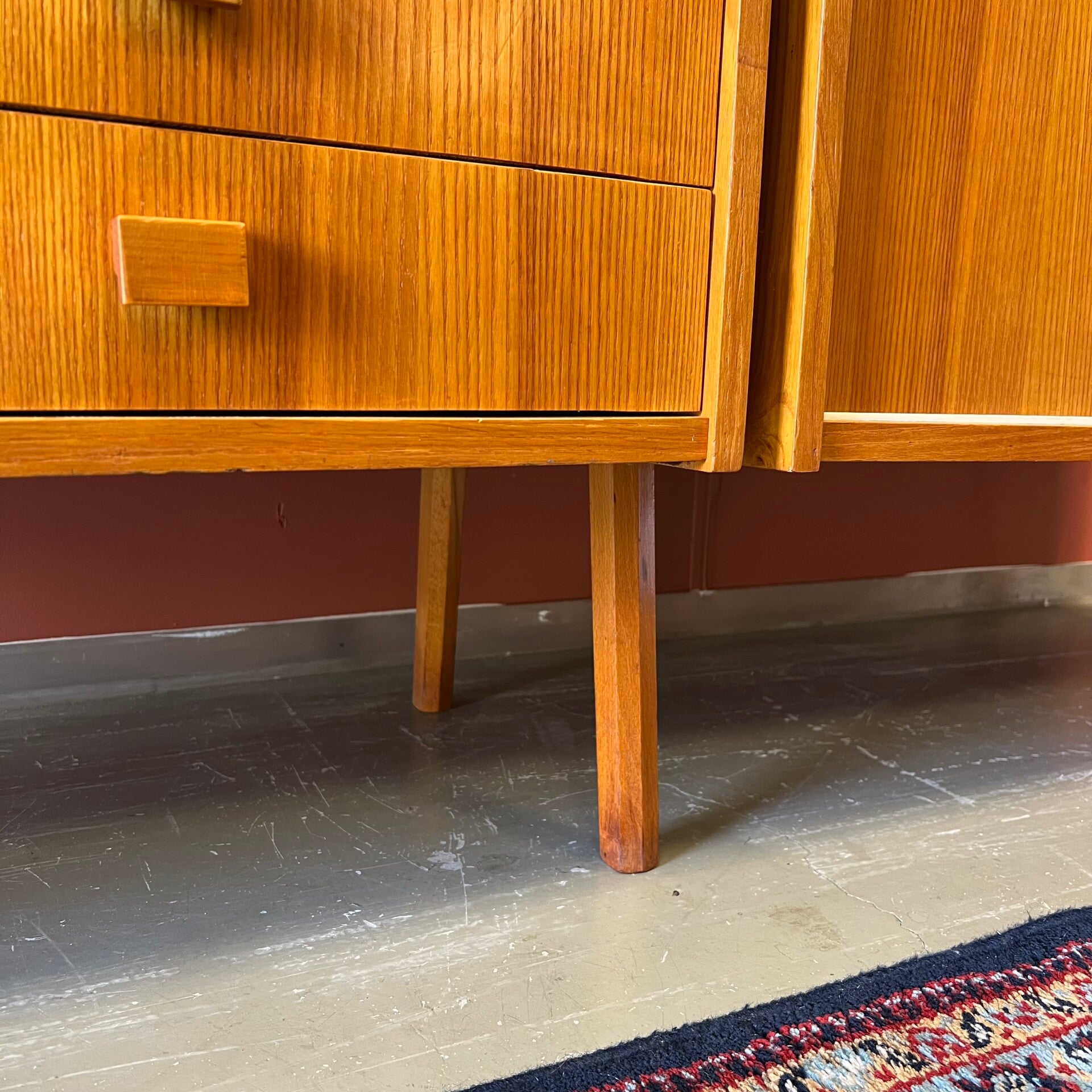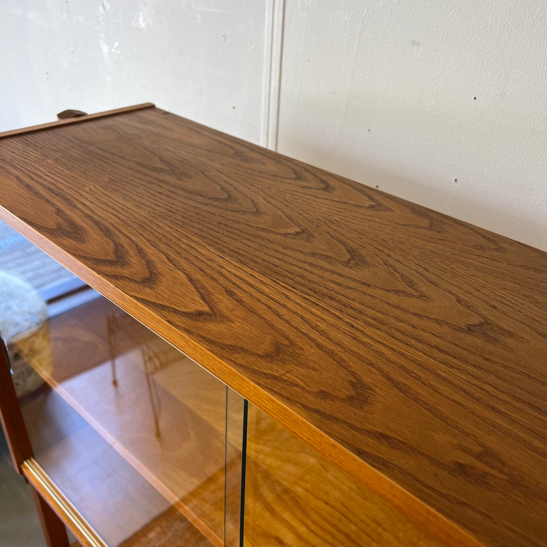 Het deel rechts heeft bovenin een plank. In het midden een vitrinekast met glazen schuifruitjes en een uitneembare plank. Onderin een schuifdeurkast met de originele kunststof handgrepen (links mist een stukje) en uitneembare plank.