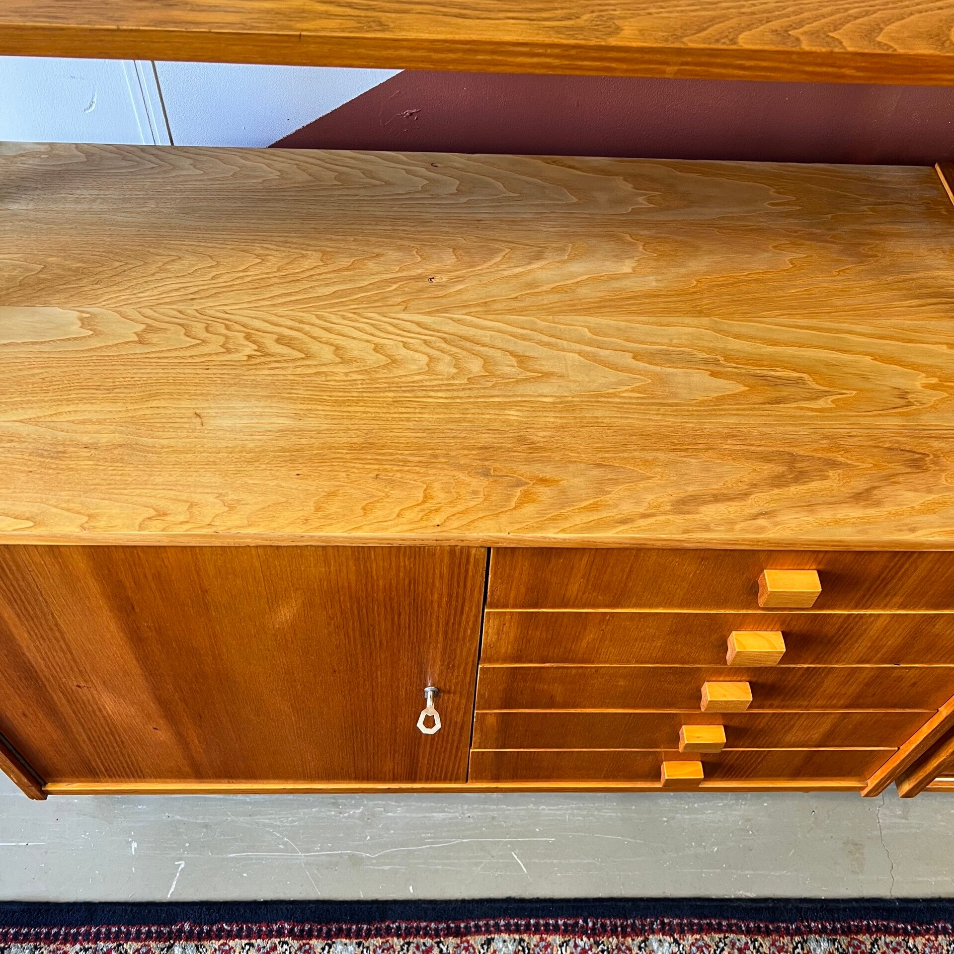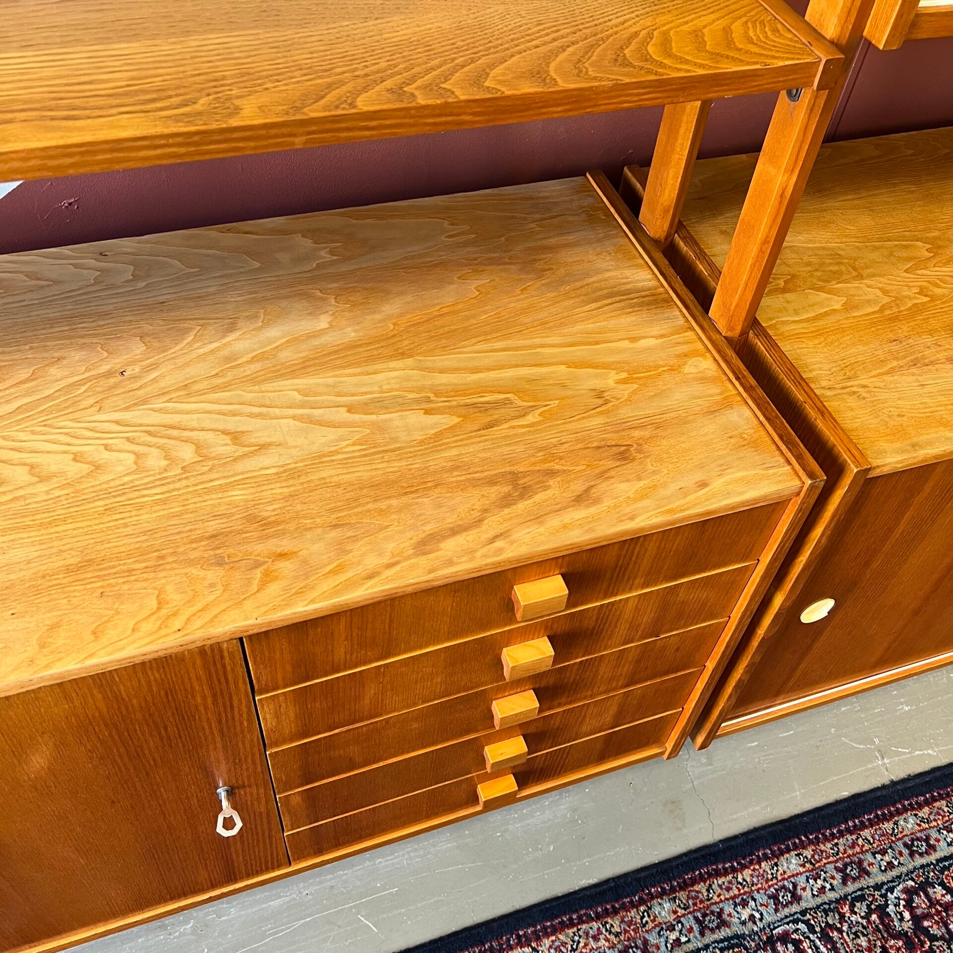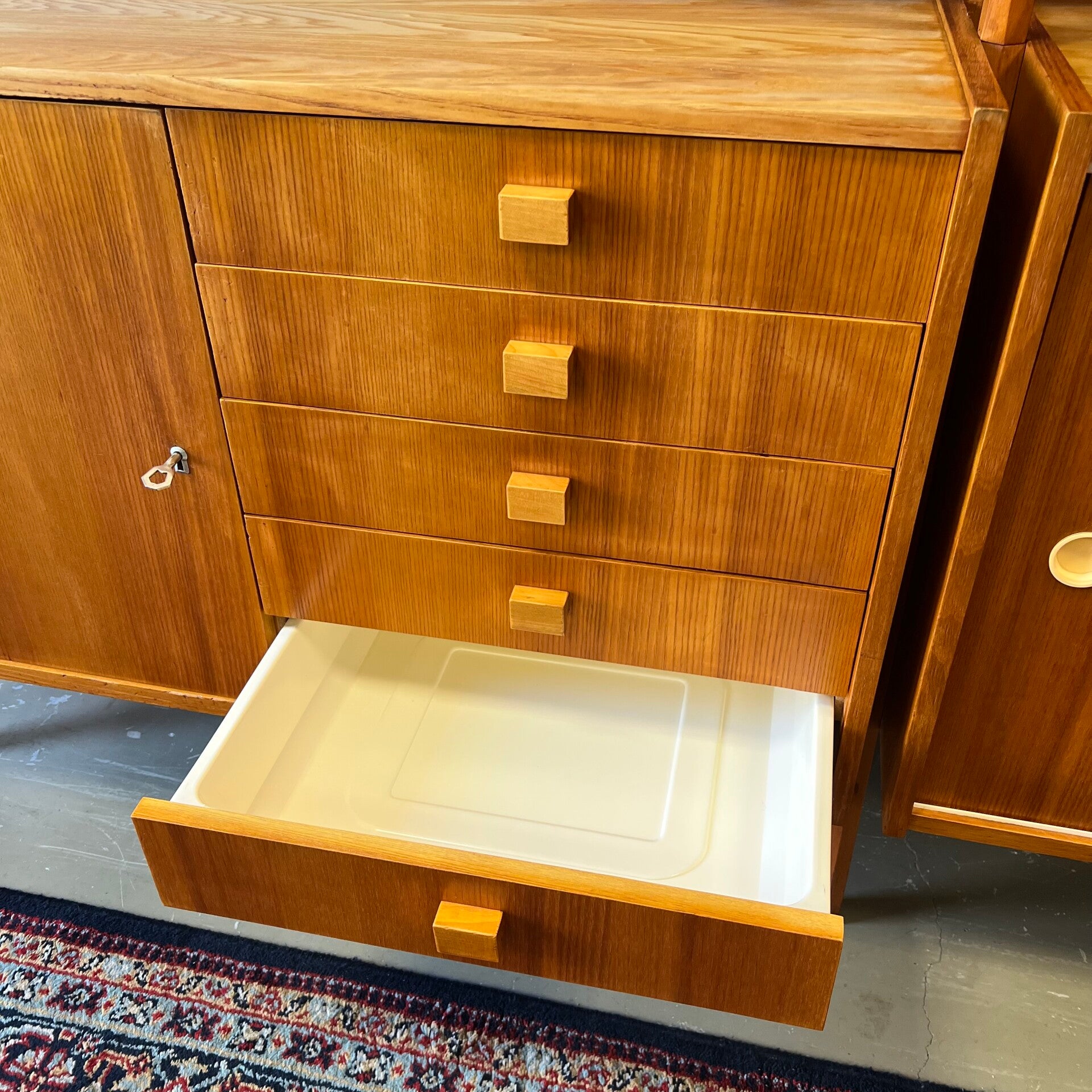 Het deel links heeft bovenin een vitrinekast met glazen schuifruitjes en een uitneembare plank. In het midden een plank. Onderin een gesloten kast met slot (sleutel aanwezig) en 5 ruime lades met originele kunststof binnenzijde.