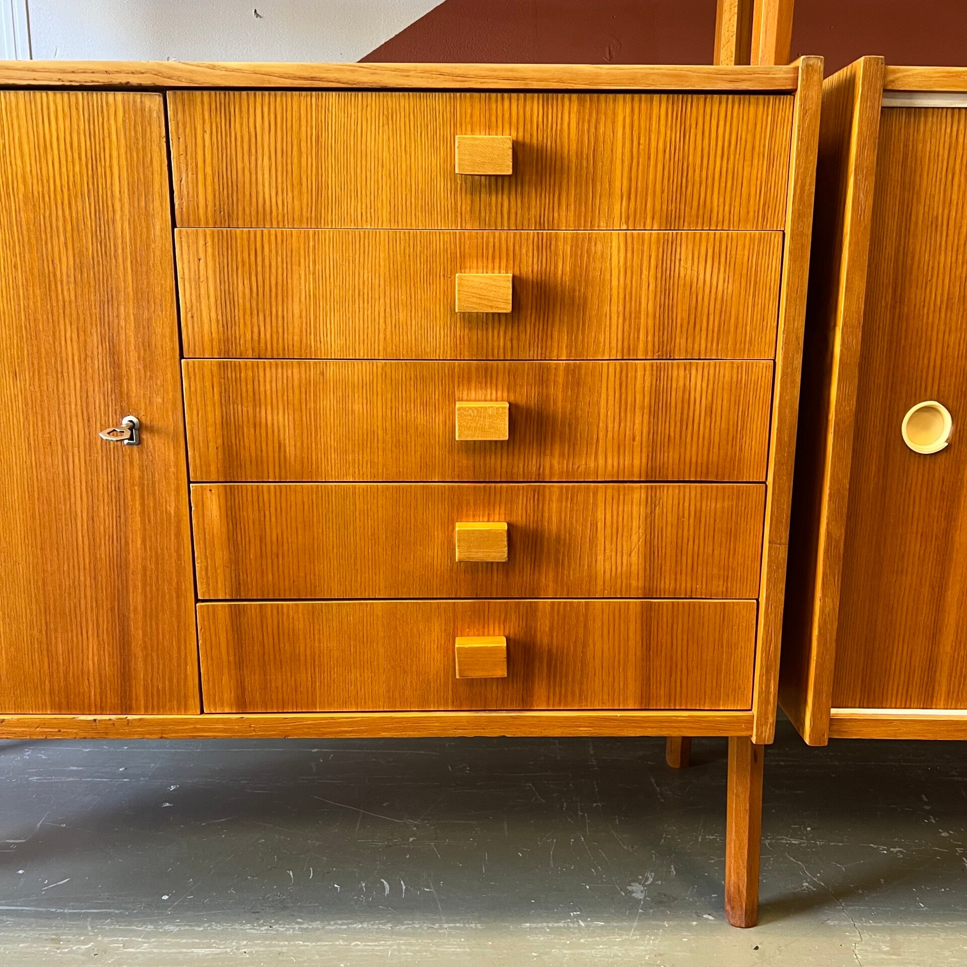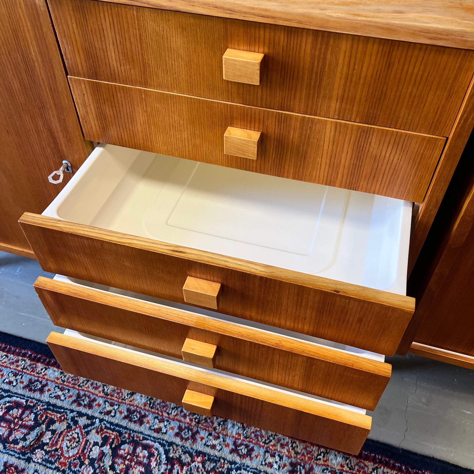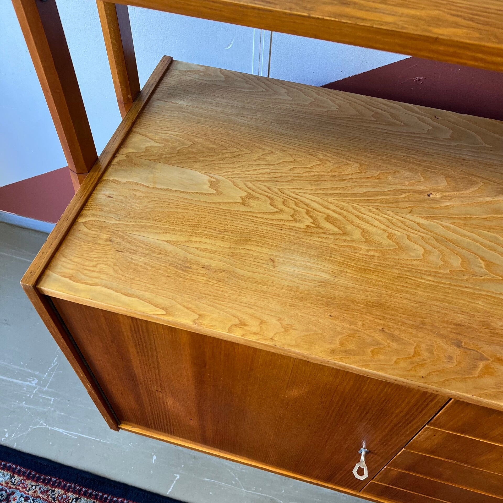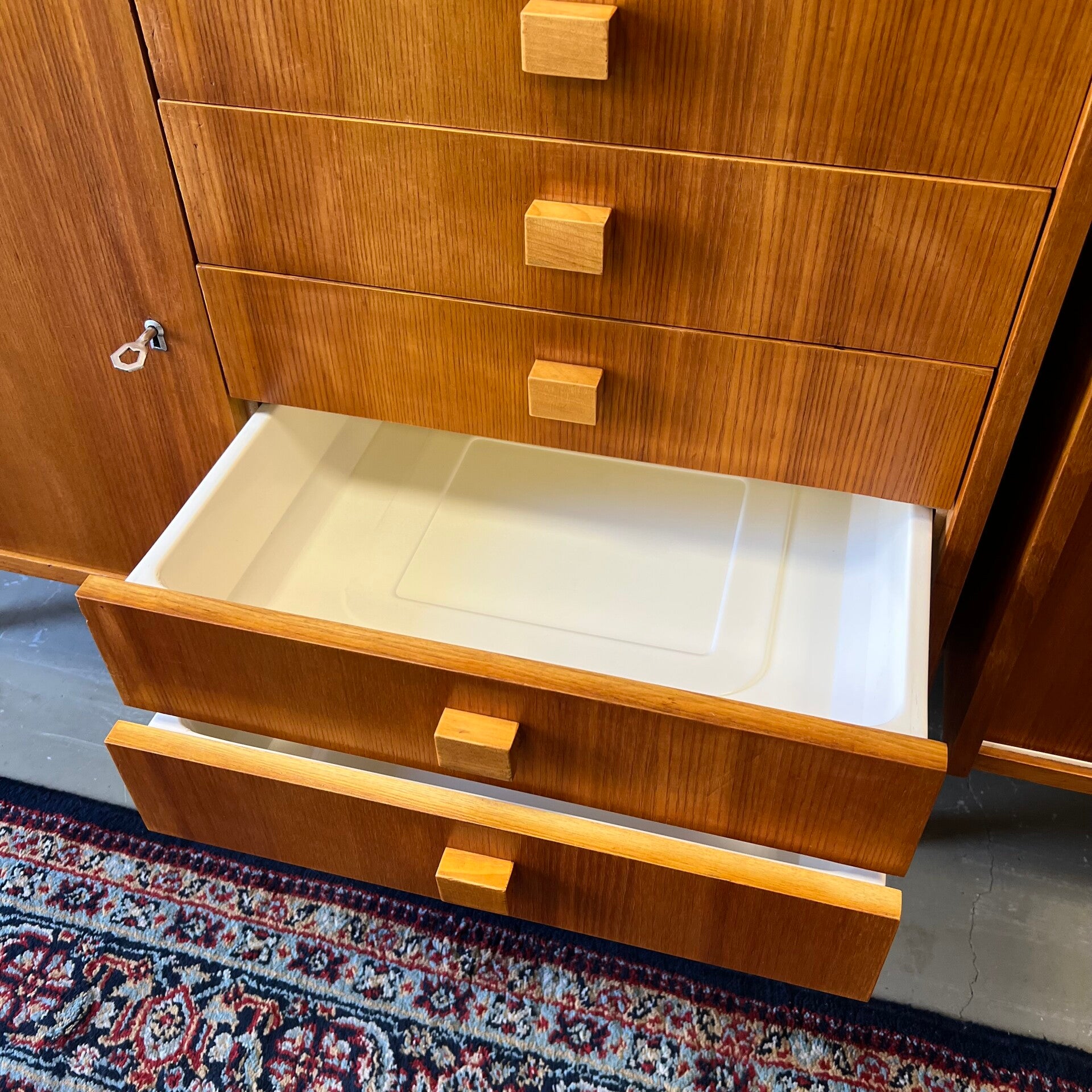 Het deel links heeft bovenin een vitrinekast met glazen schuifruitjes en een uitneembare plank. In het midden een plank. Onderin een gesloten kast met slot (sleutel aanwezig) en 5 ruime lades met originele kunststof binnenzijde.