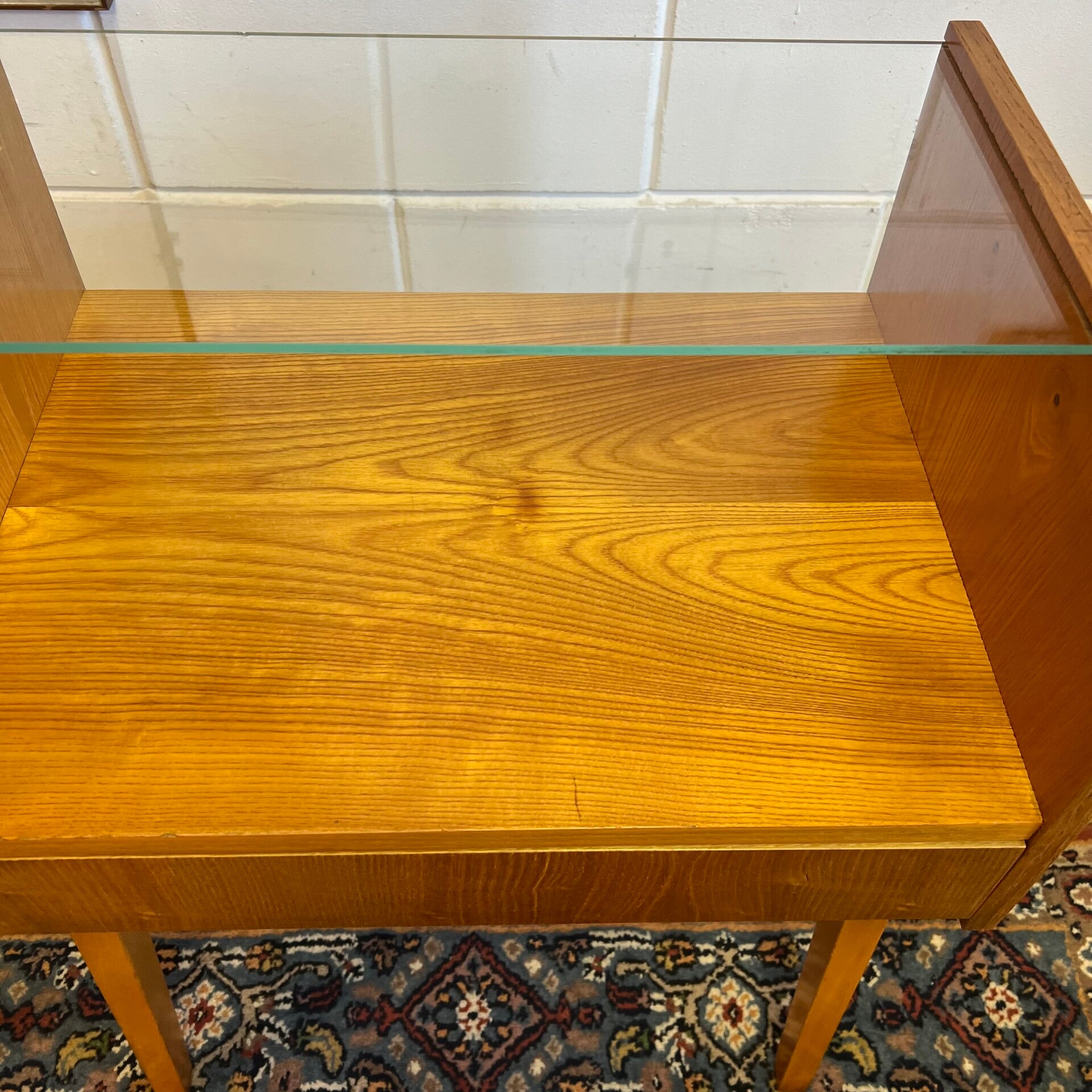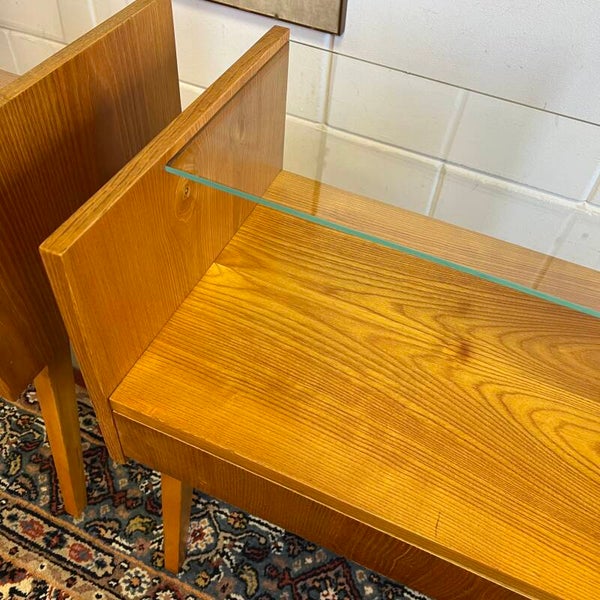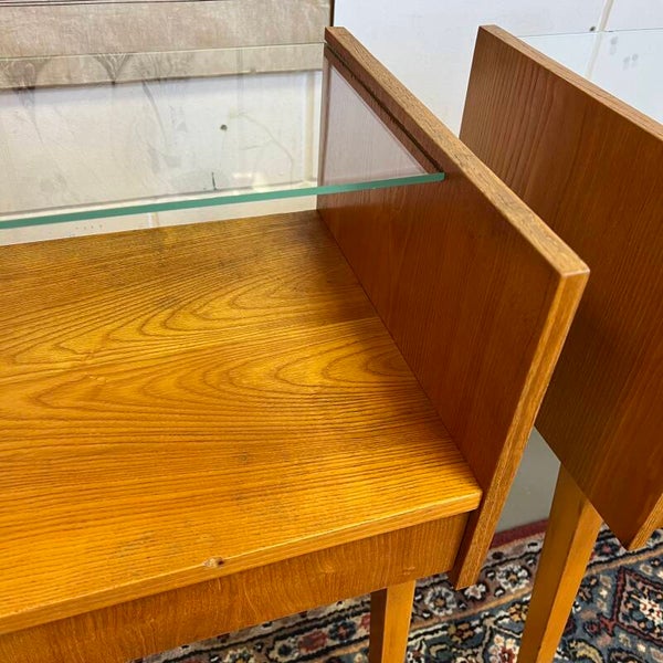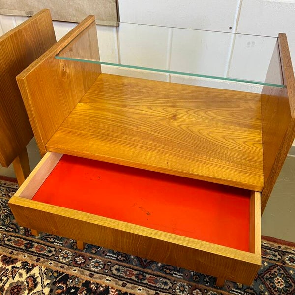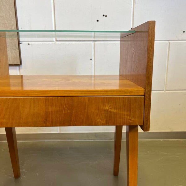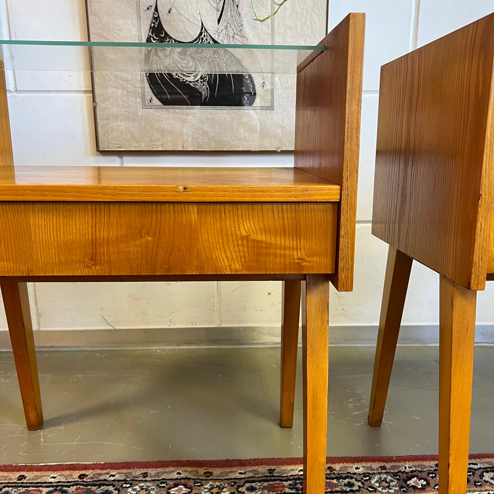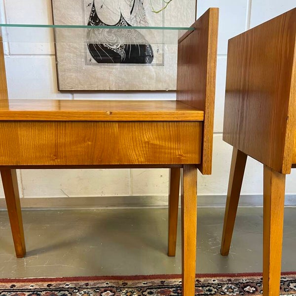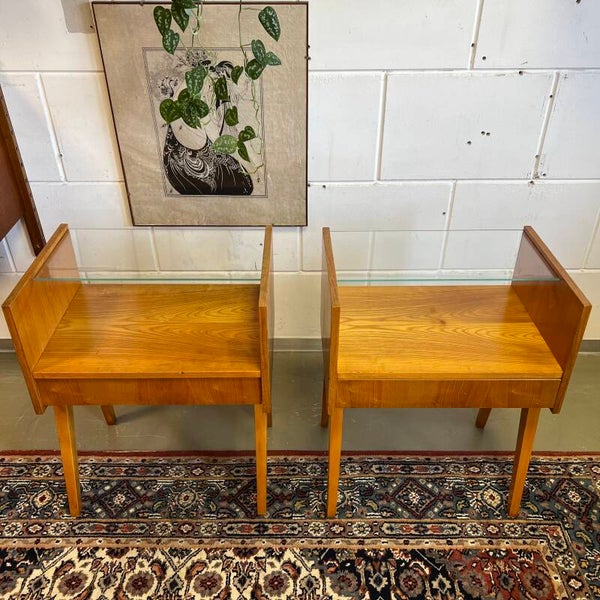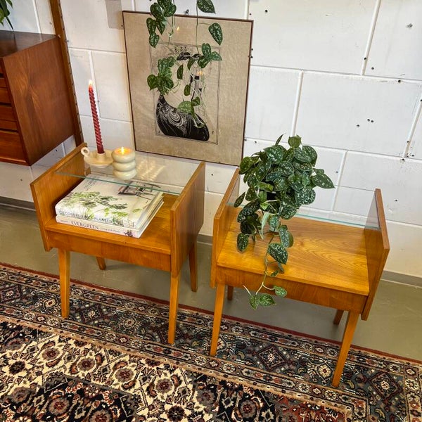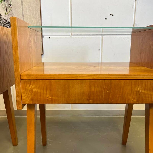 2 leuke vintage (nacht) kastjes met glazen plaat en hoge slanke poten.