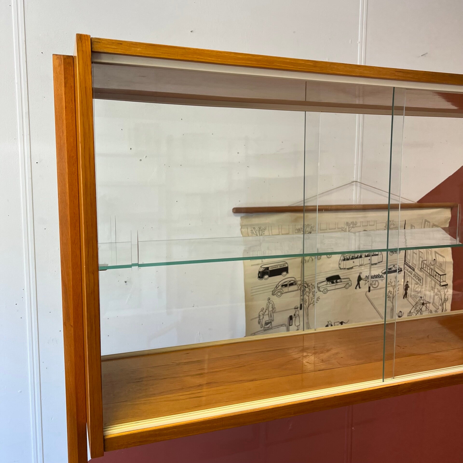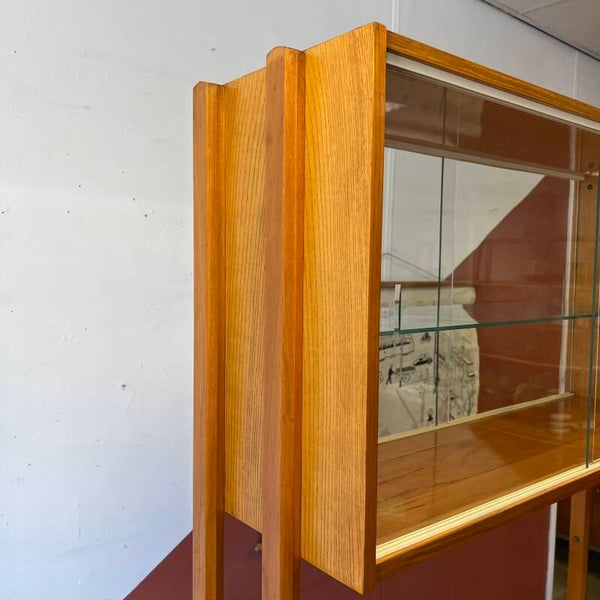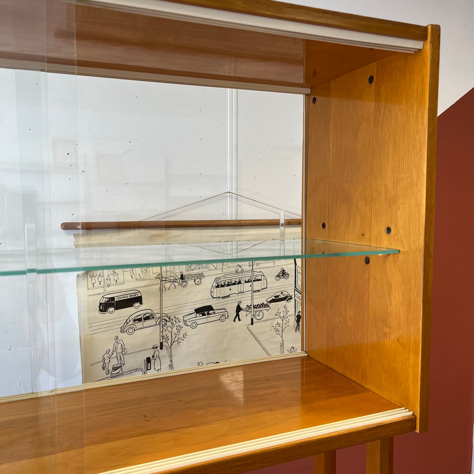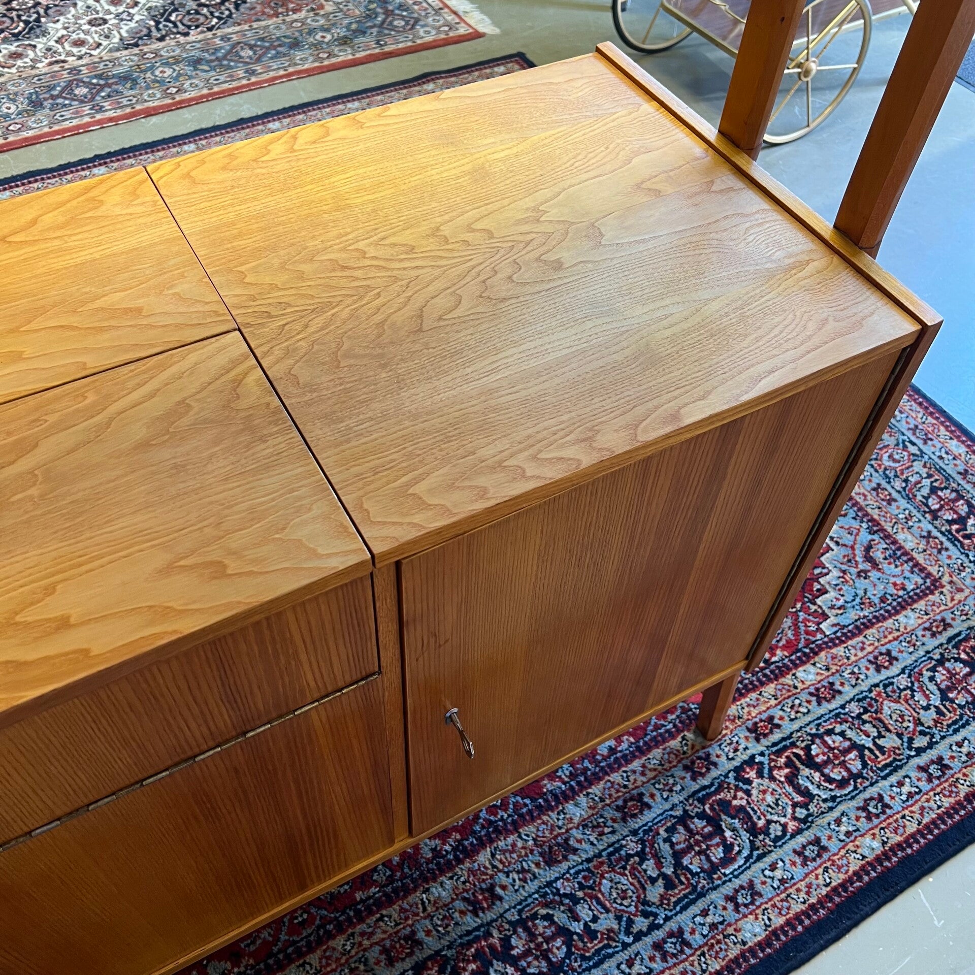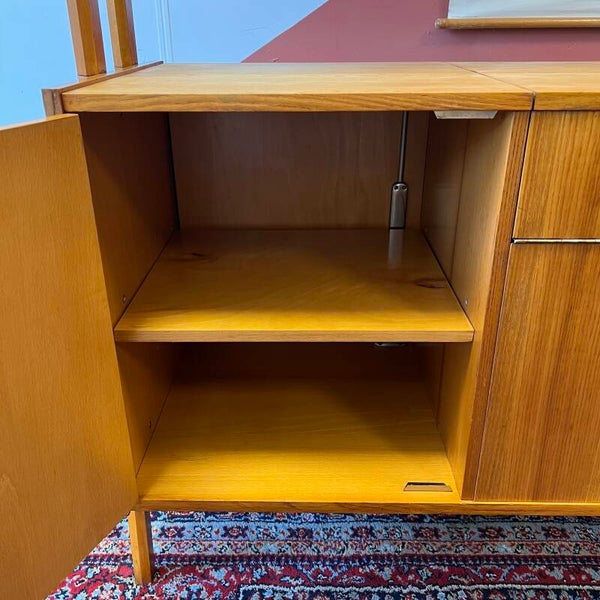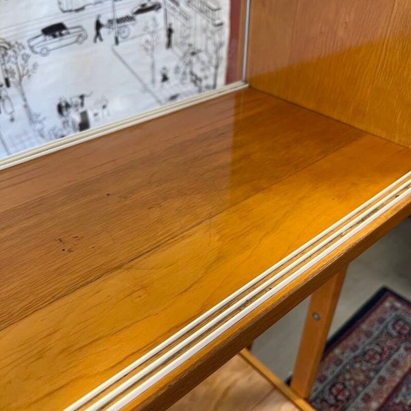 Het meubel heeft bovenin een vitrinekast met glazen schuifruitjes en een uitneembare glazen plaat.