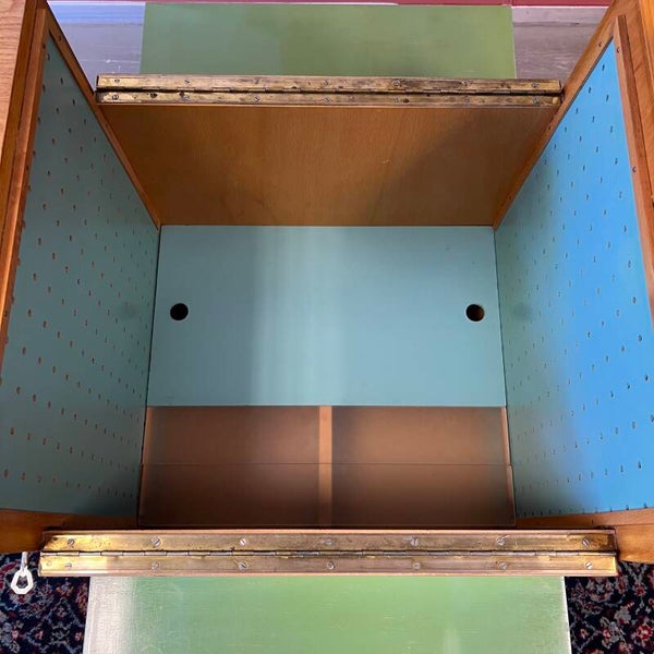 Onderin een gesloten kast met aan weerszijden een openslaande deur met slot (1 sleutel aanwezig).