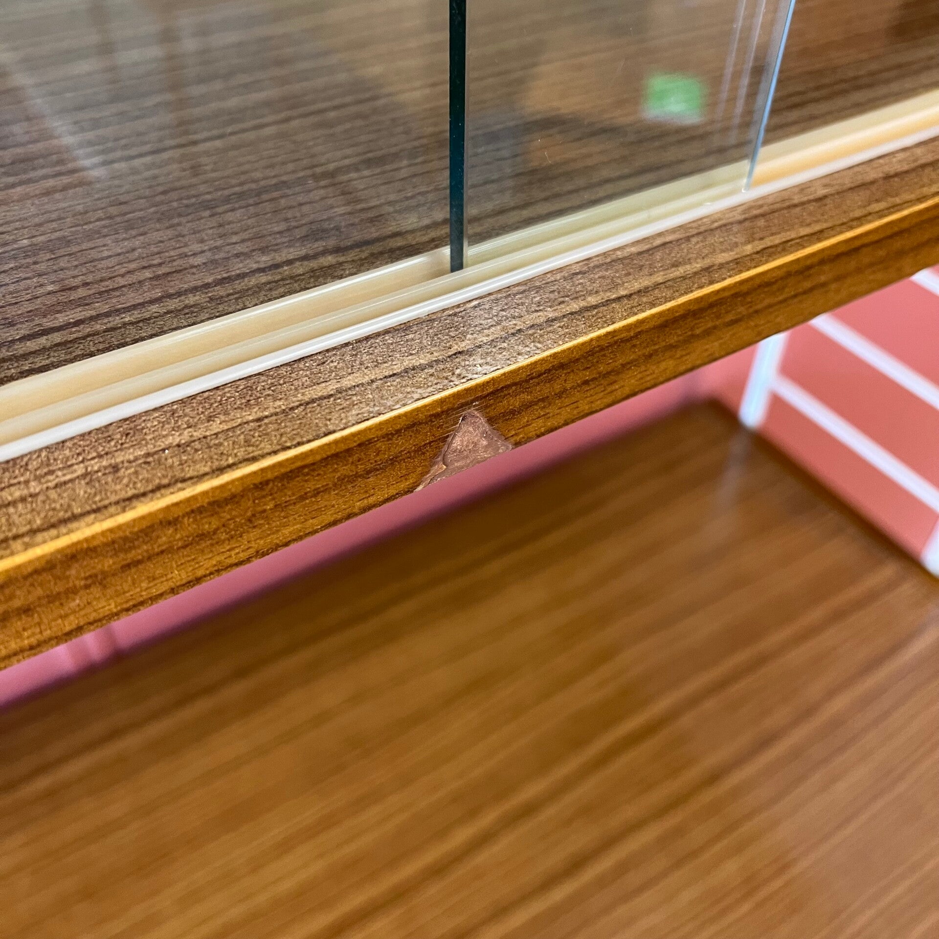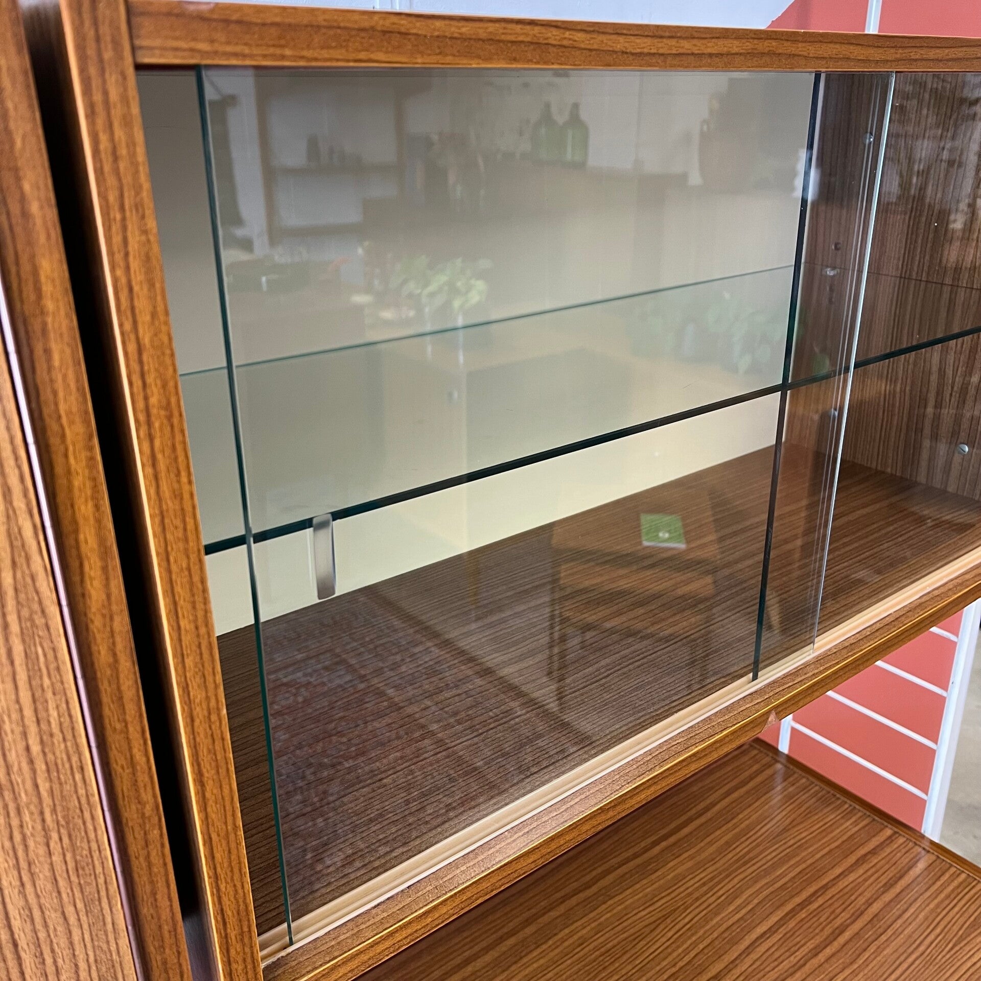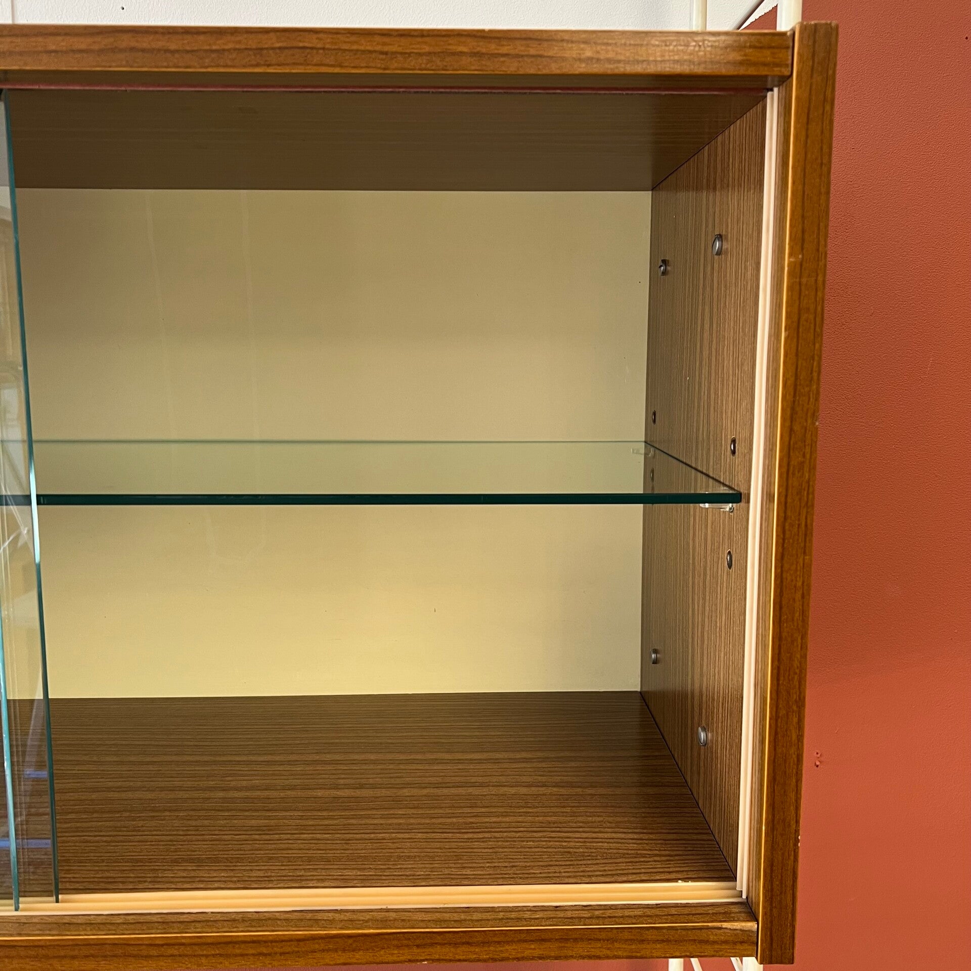 1x vitrinekast met glazen schuifdeuren en uitneembare glazen plaat
