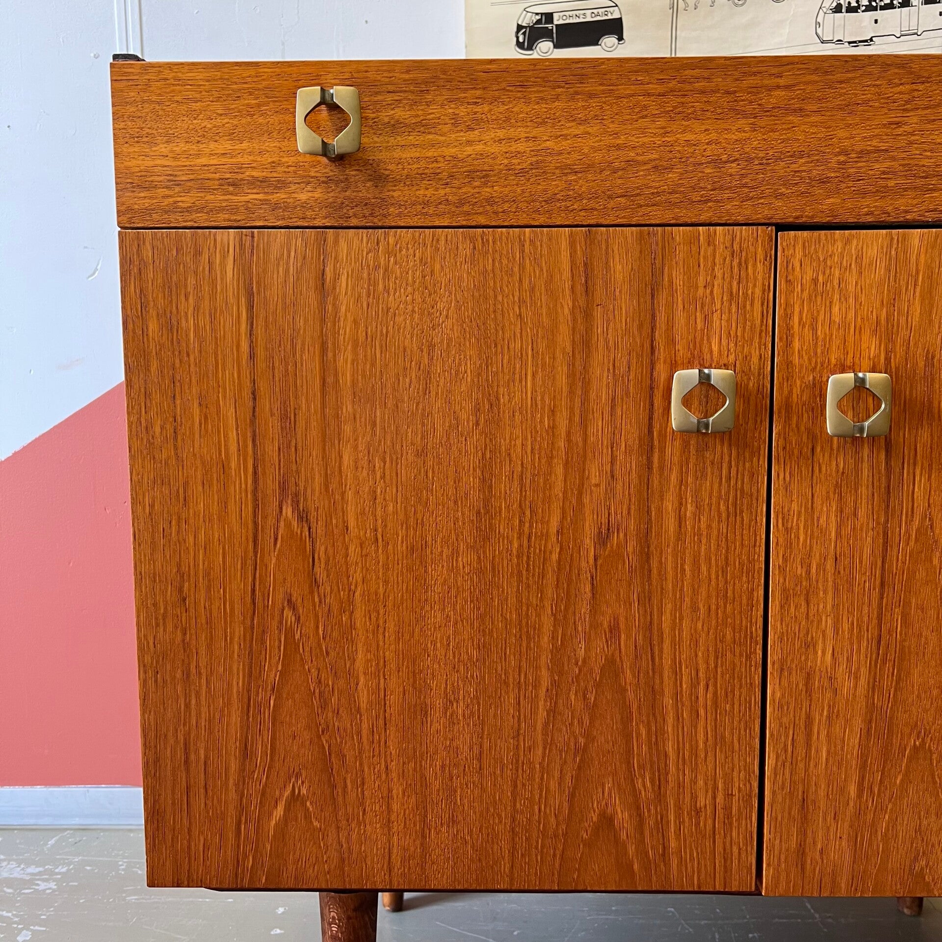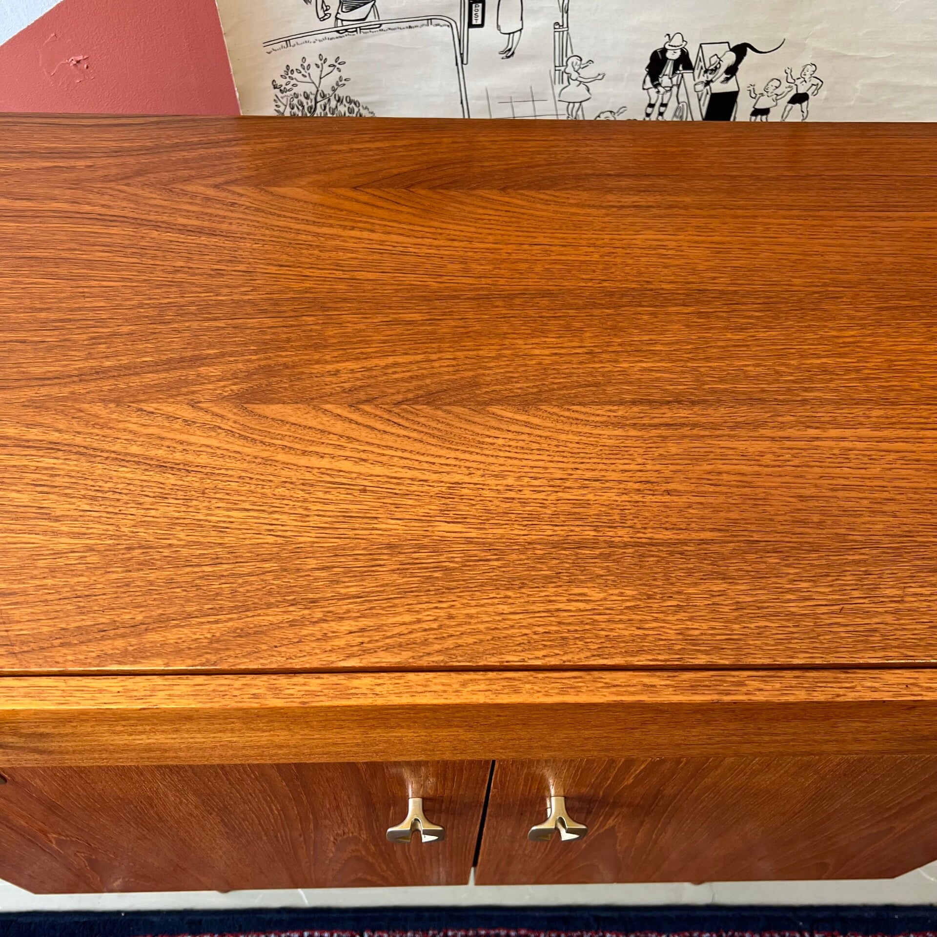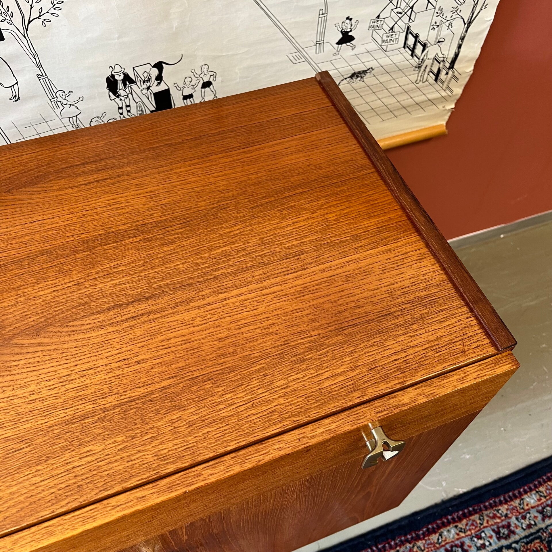 Uitgevoerd in teak (fineer) met mooi vormgegeven knoppen.