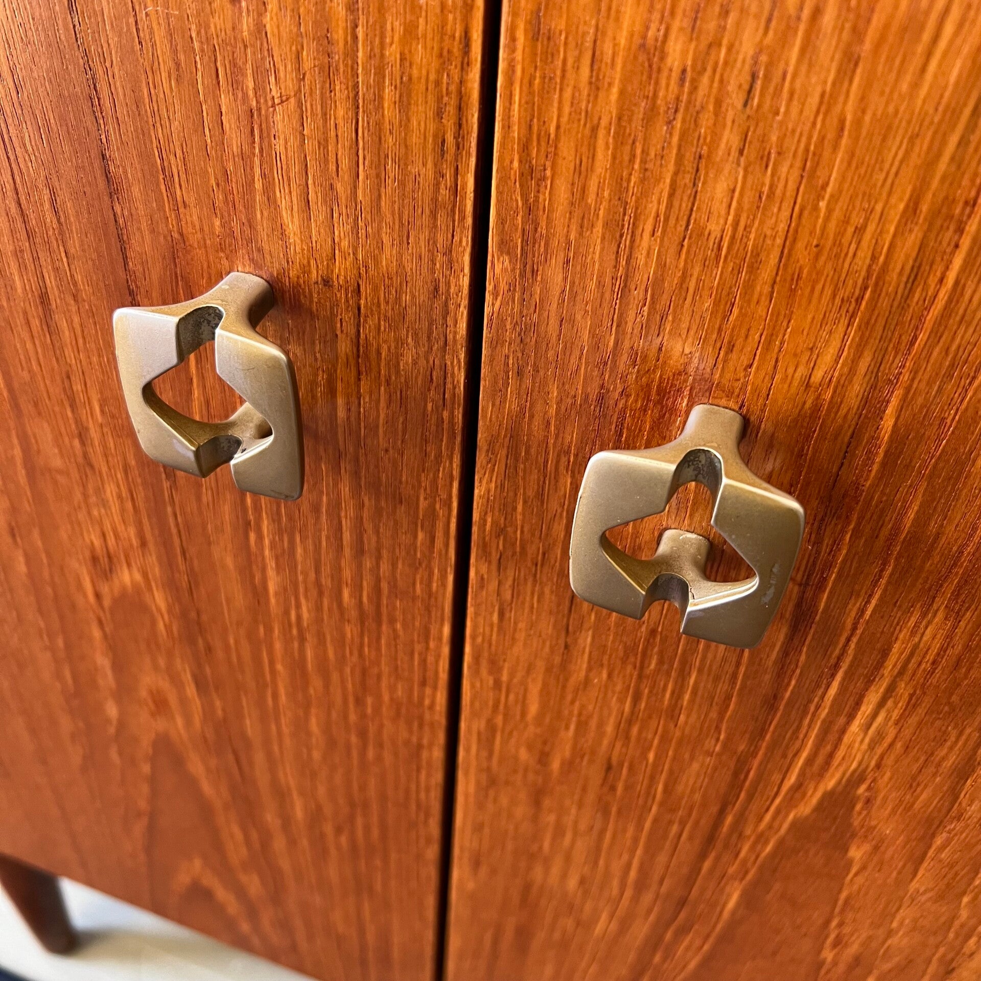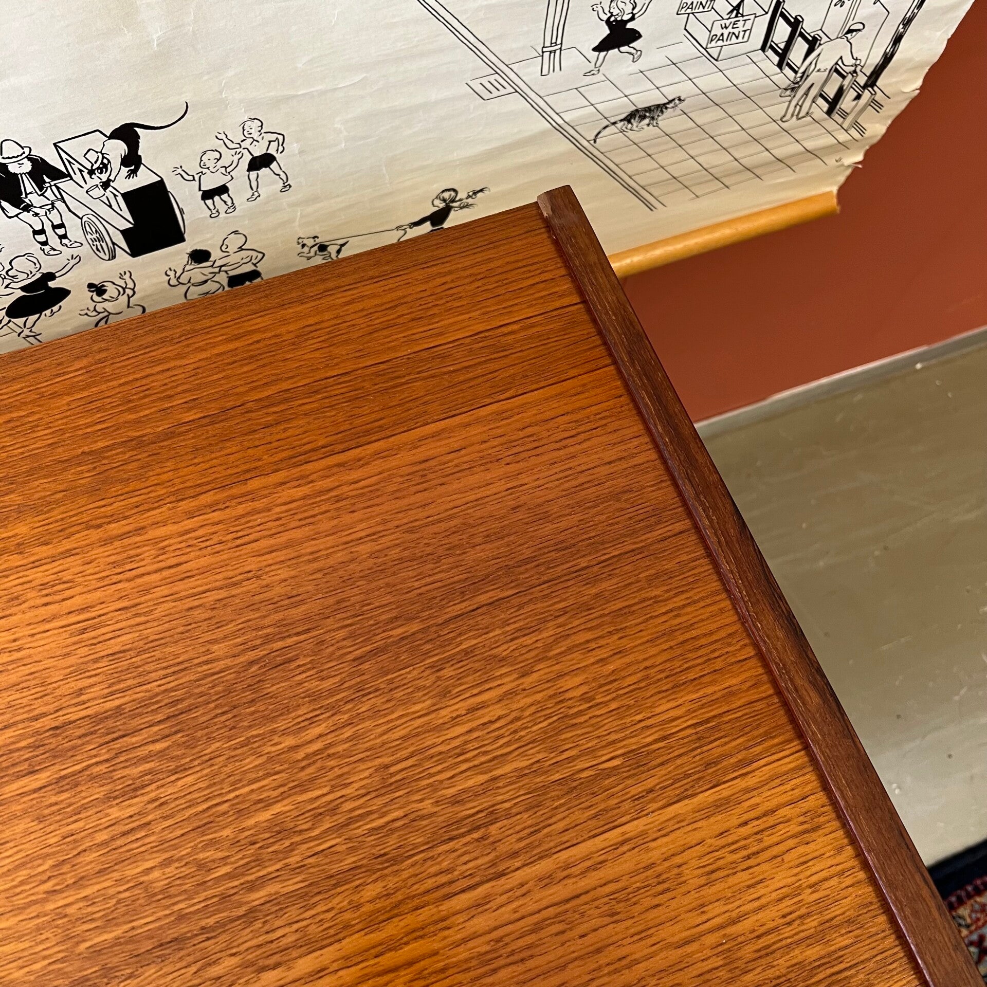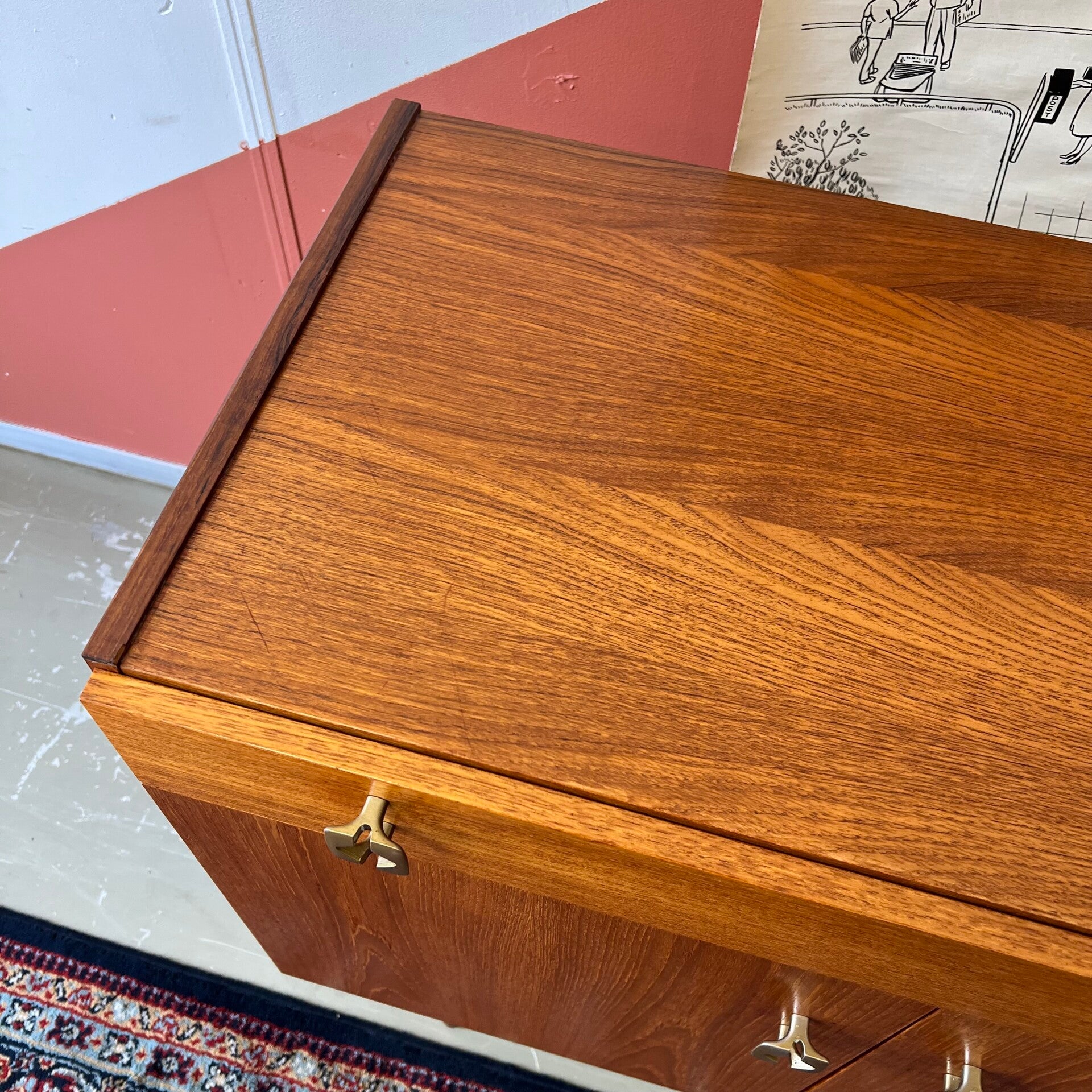 Uitgevoerd in teak (fineer) met mooi vormgegeven knoppen.