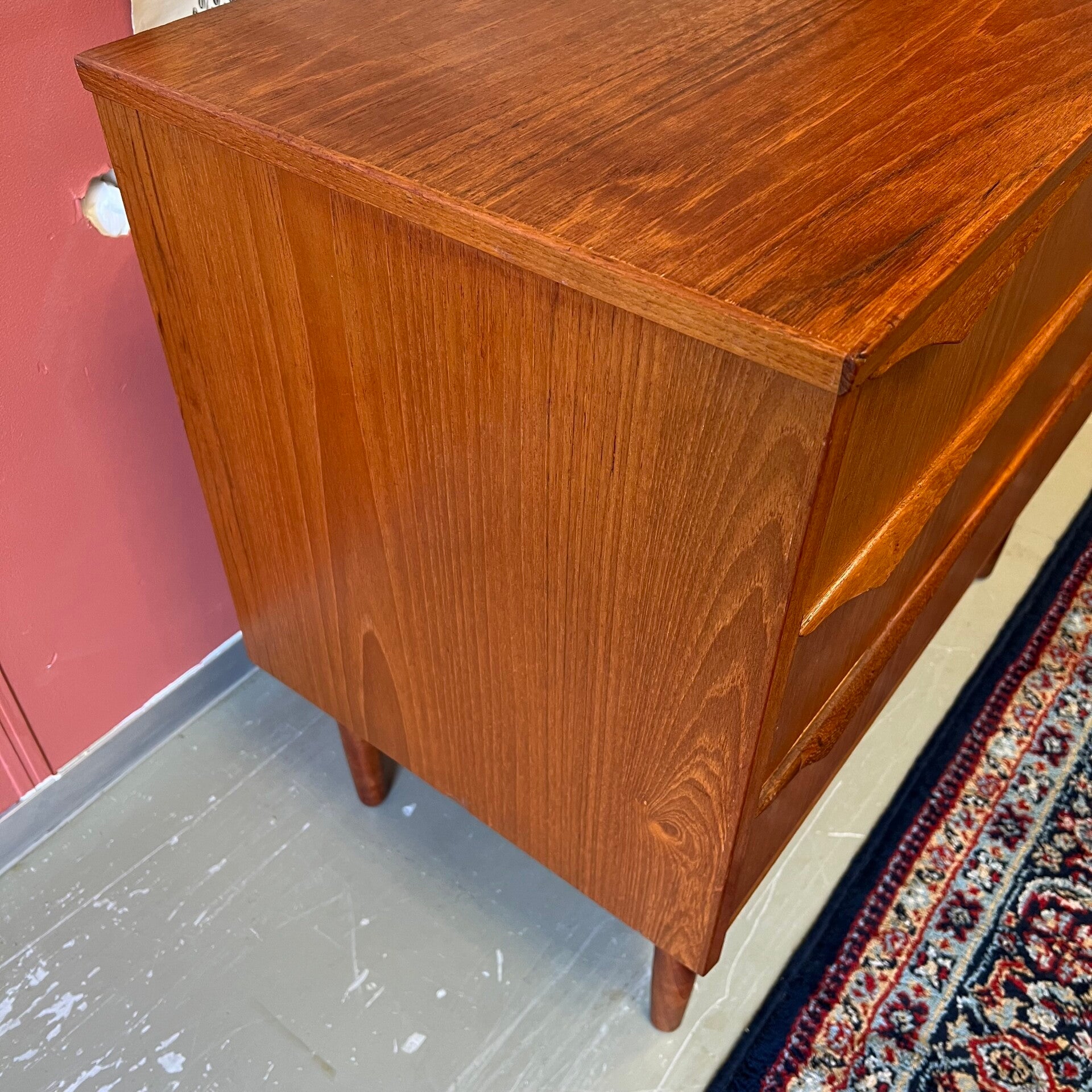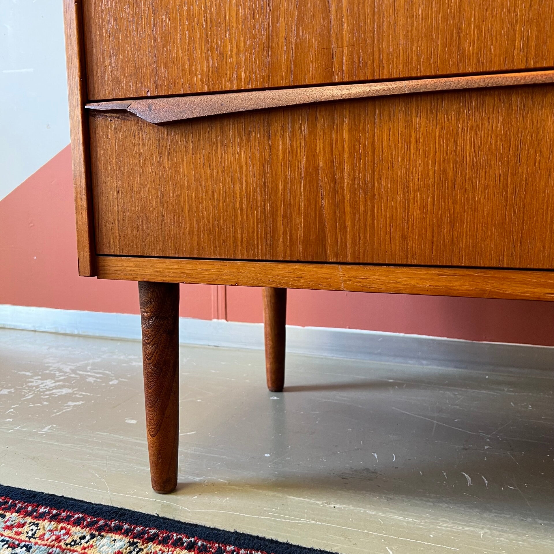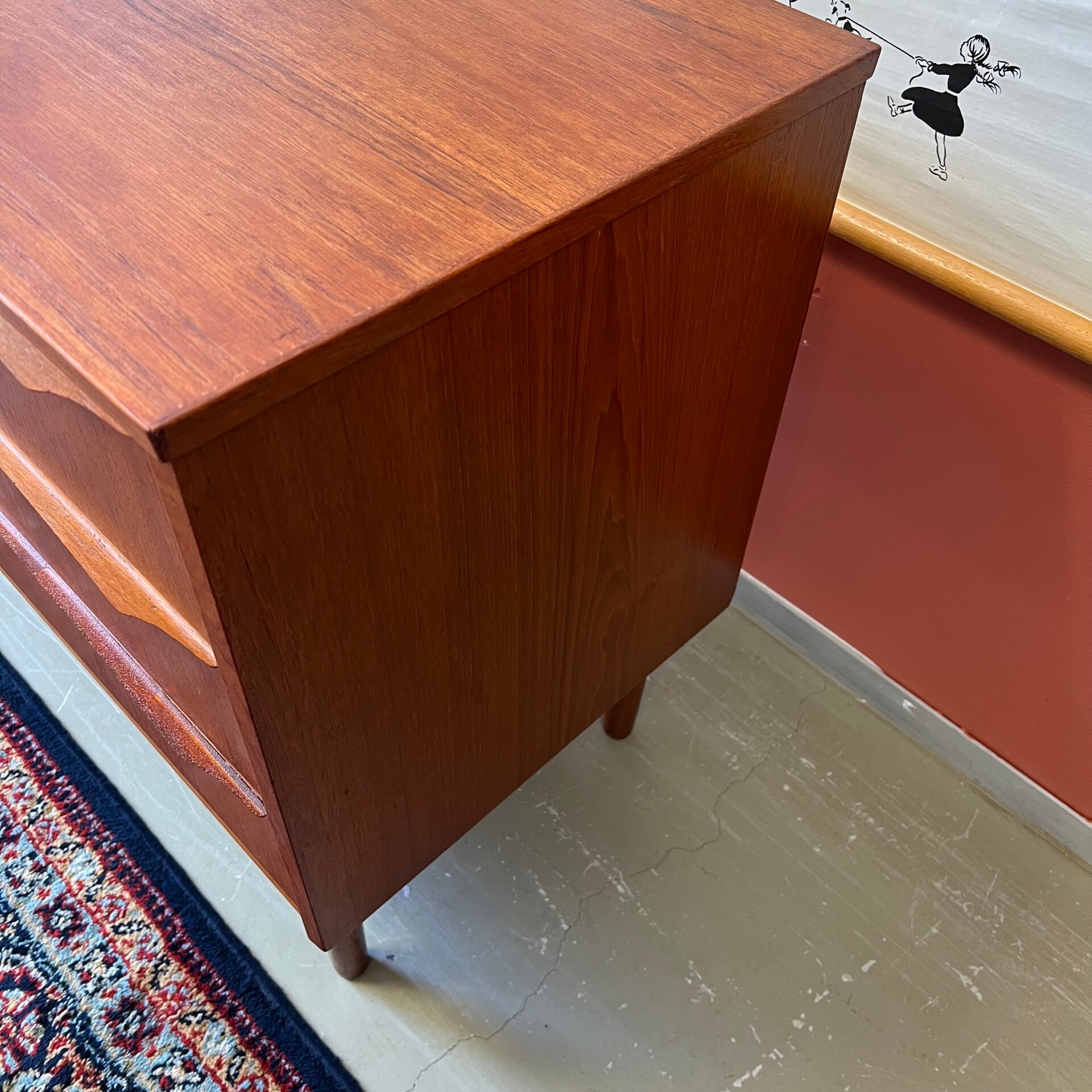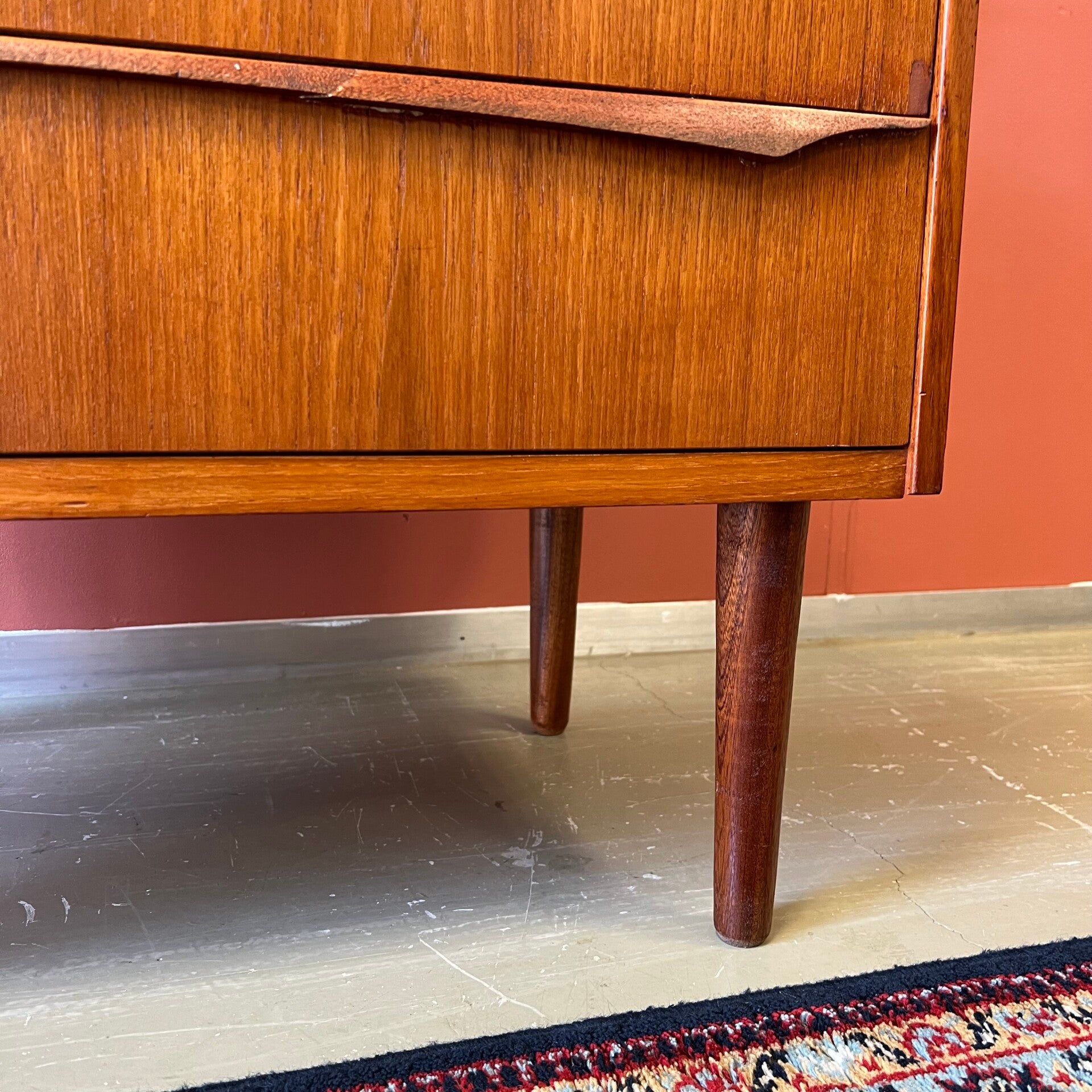 Mooie vintage Scandinavische ladekast, op slanke conische pootjes.