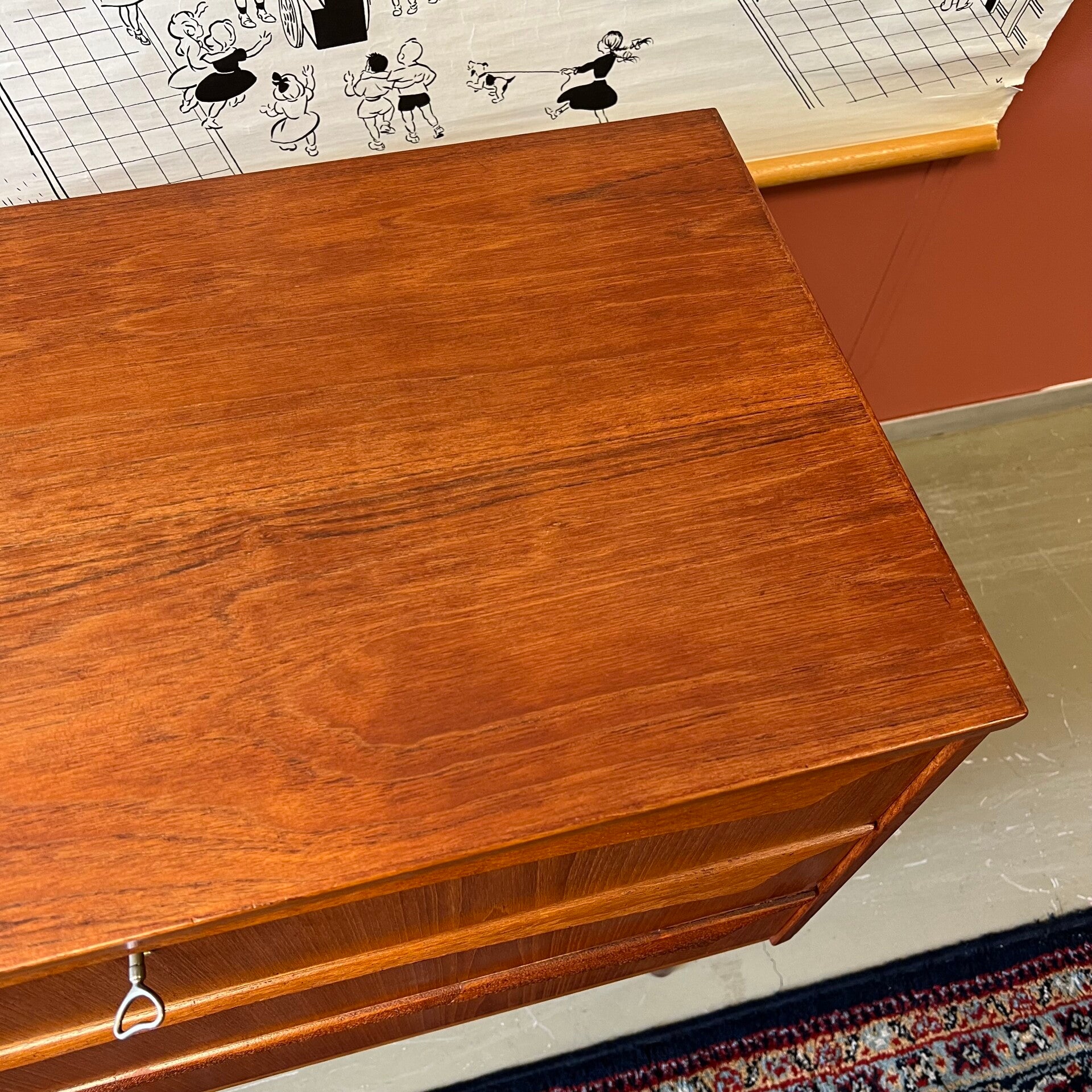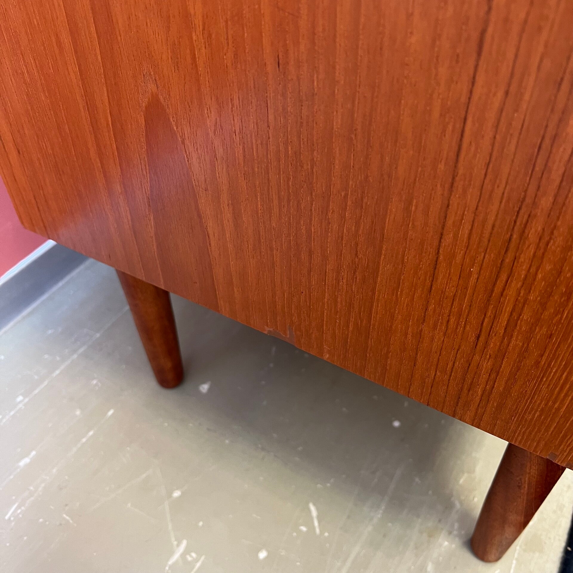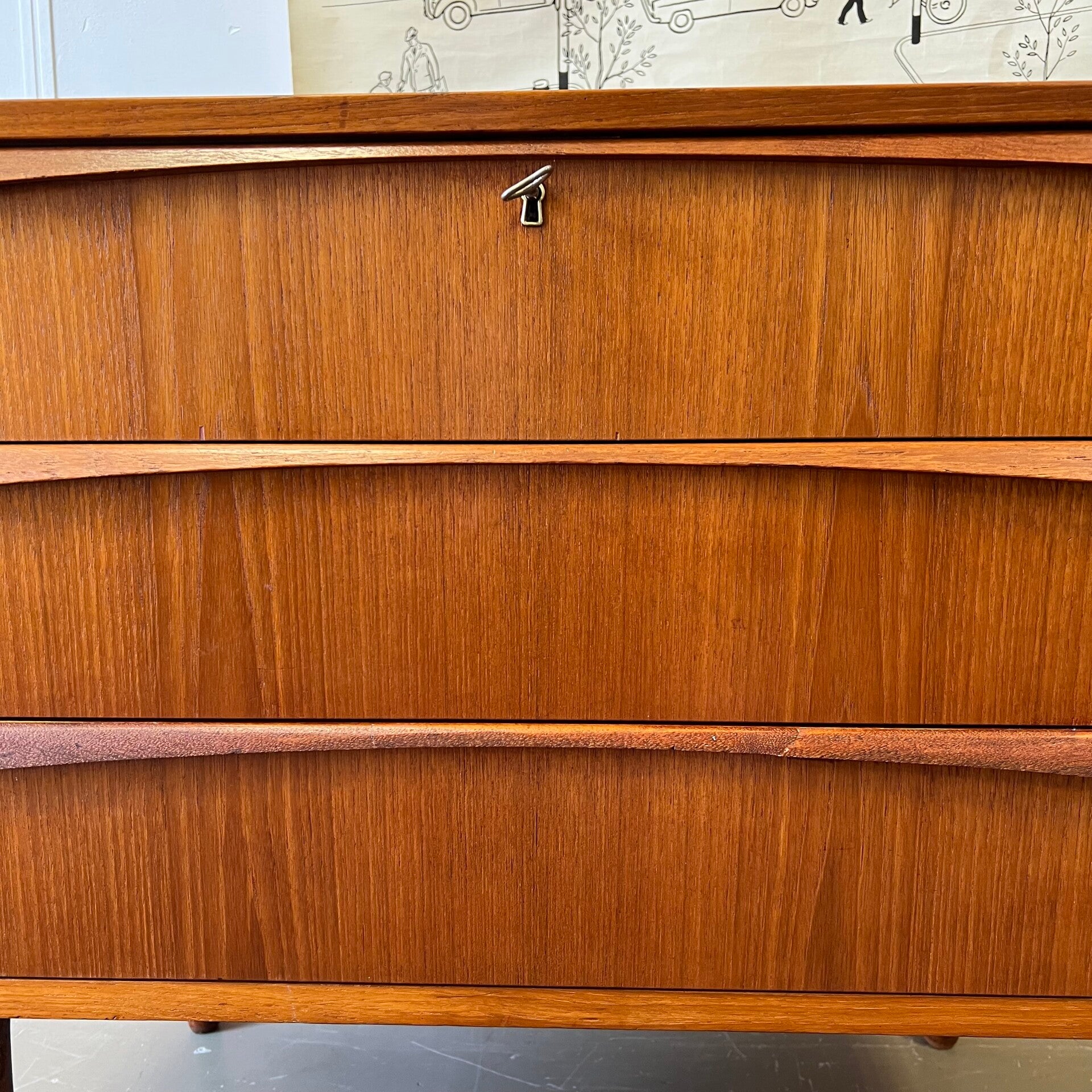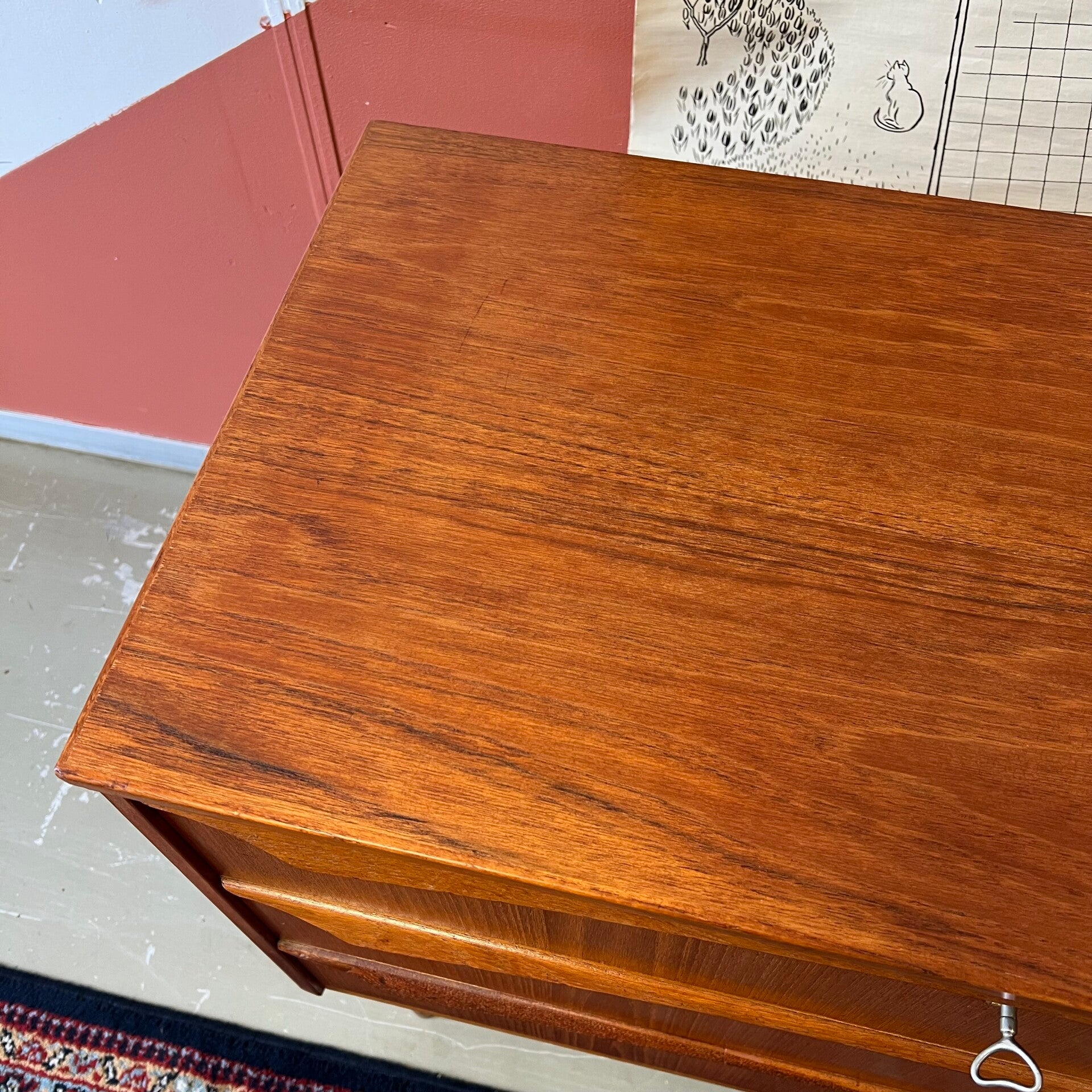 Mooie vintage Scandinavische ladekast, op slanke conische pootjes.