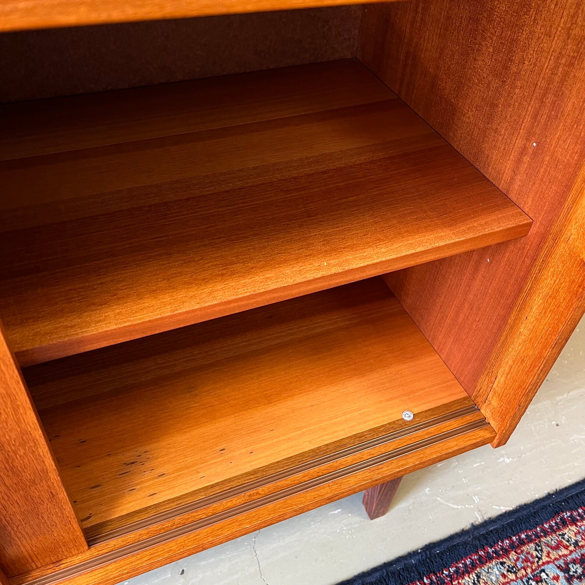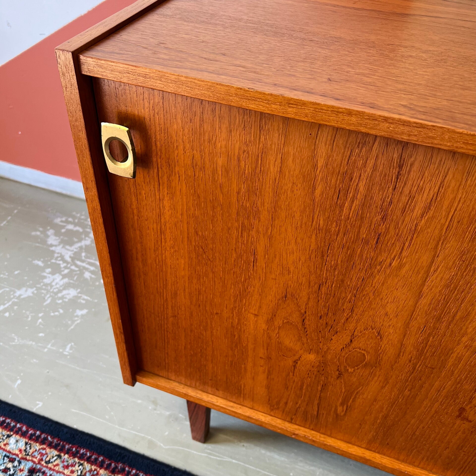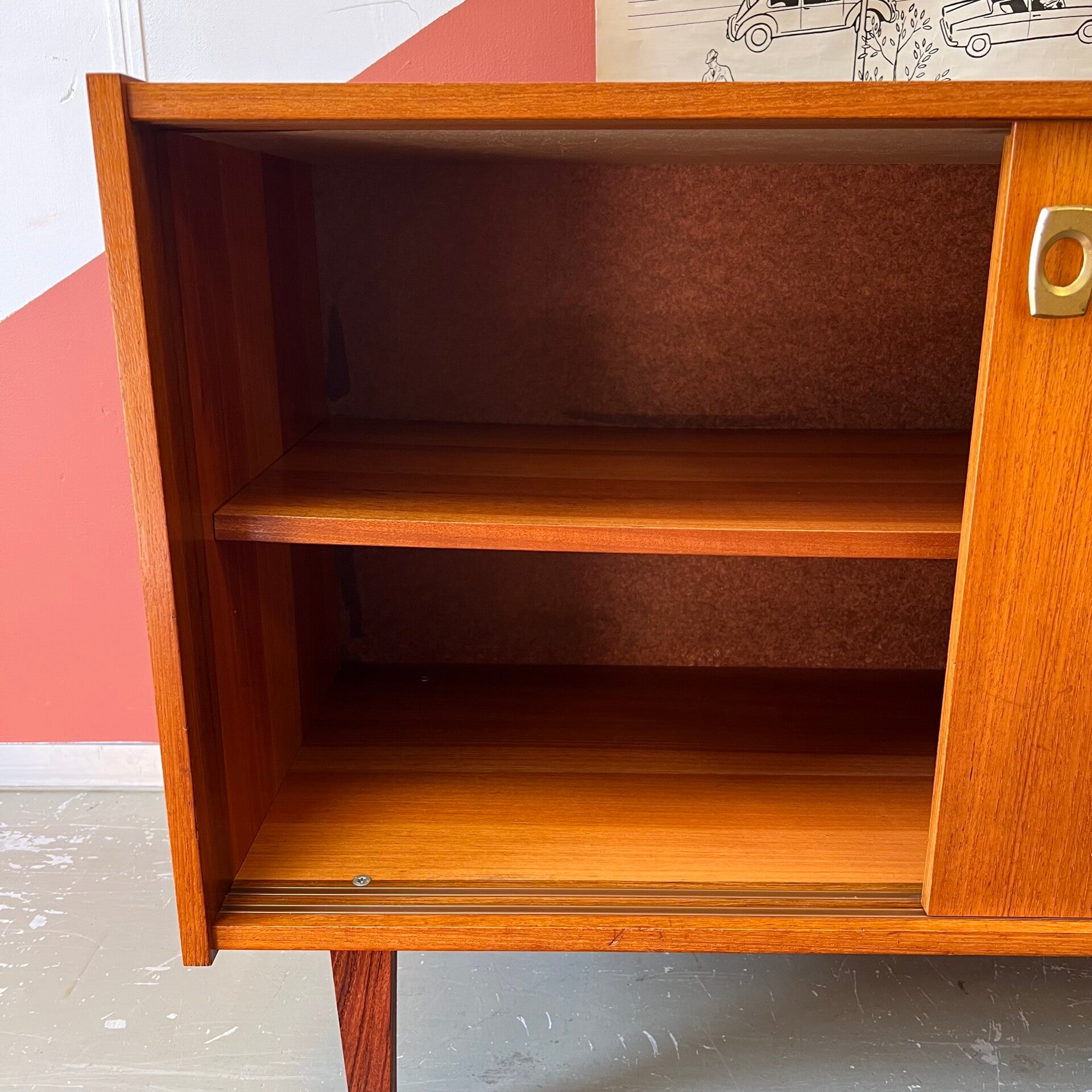 Leuk vintage schuifdeurkastje, uitgevoerd in teak (fineer) met mooi gevormde knoppen en slanke pootjes.