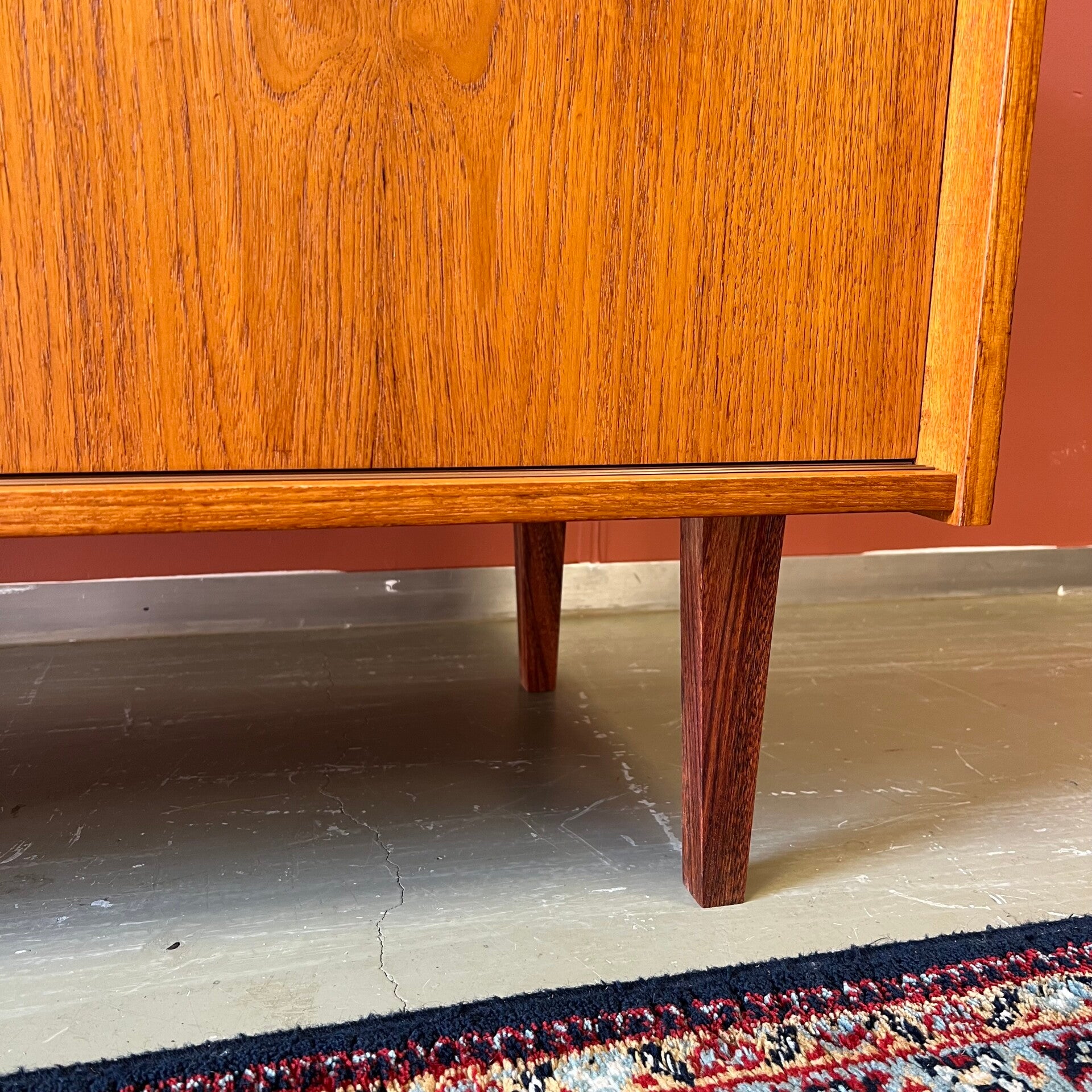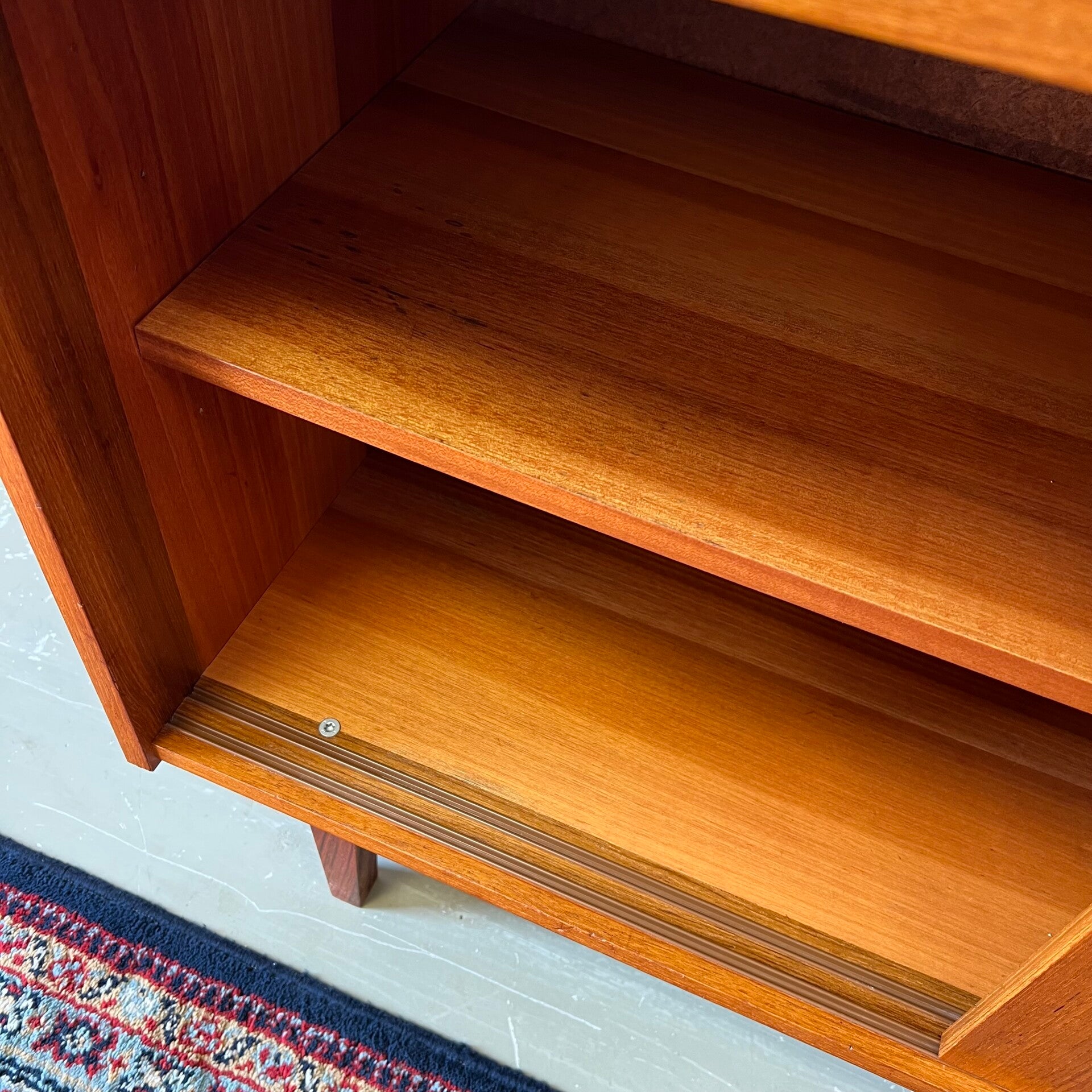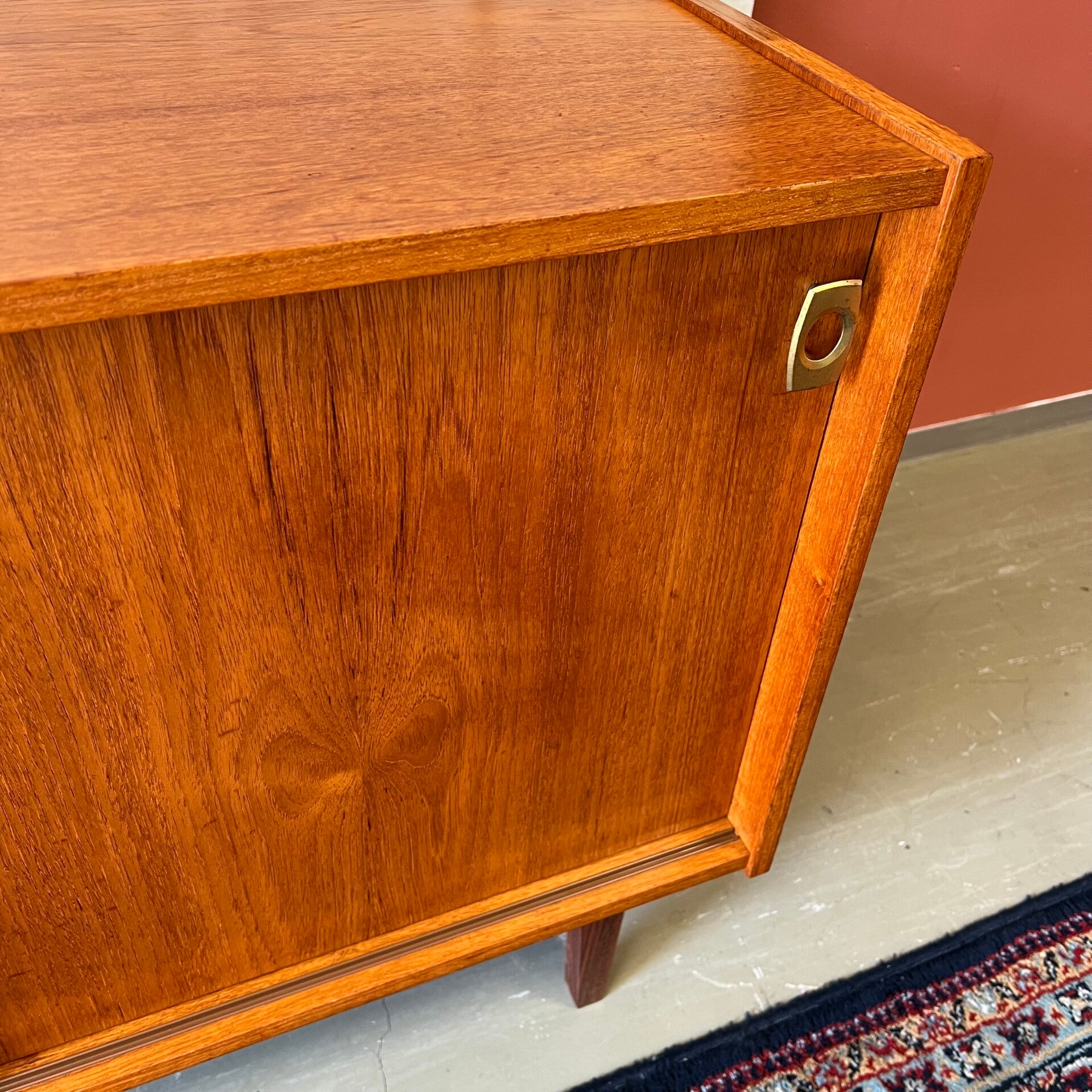 Leuk vintage schuifdeurkastje, uitgevoerd in teak (fineer) met mooi gevormde knoppen en slanke pootjes.
