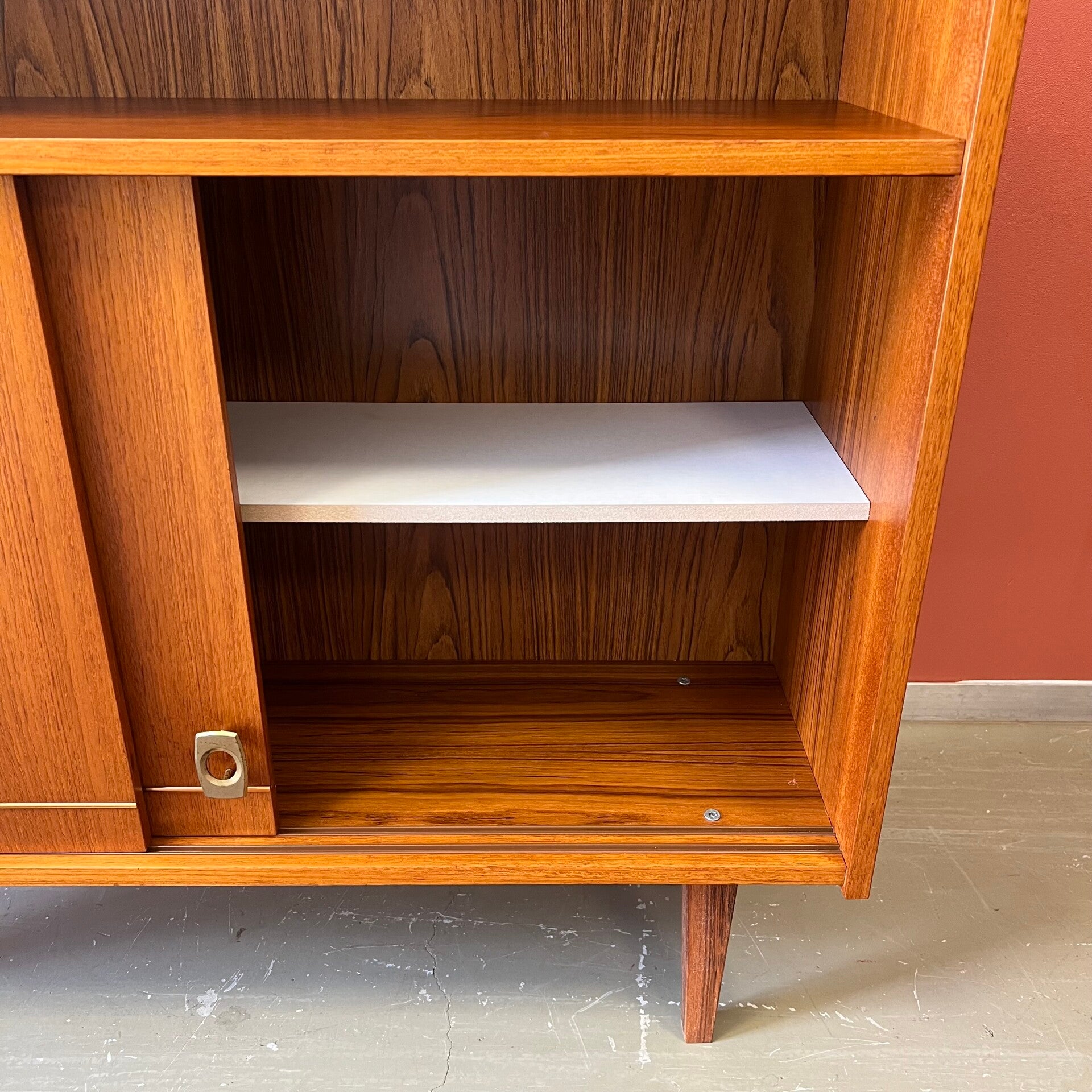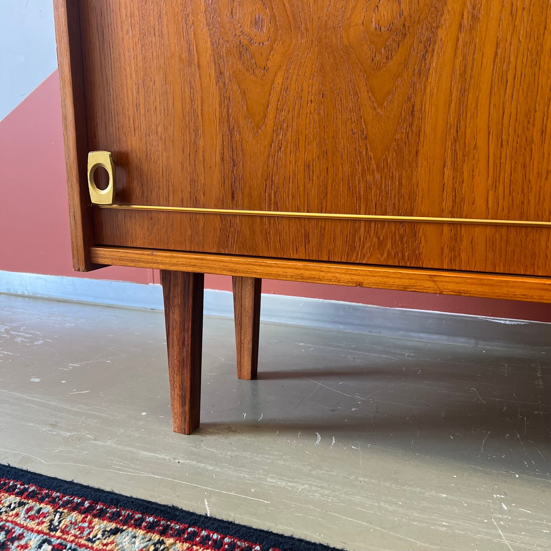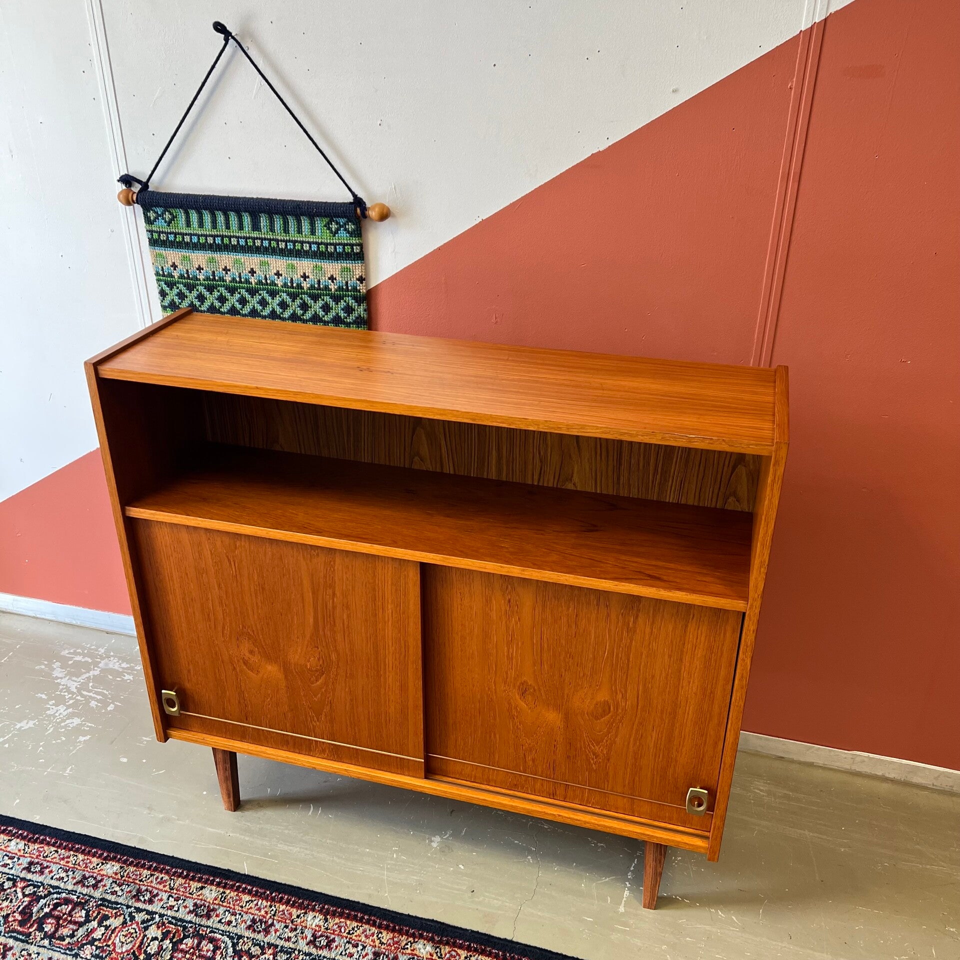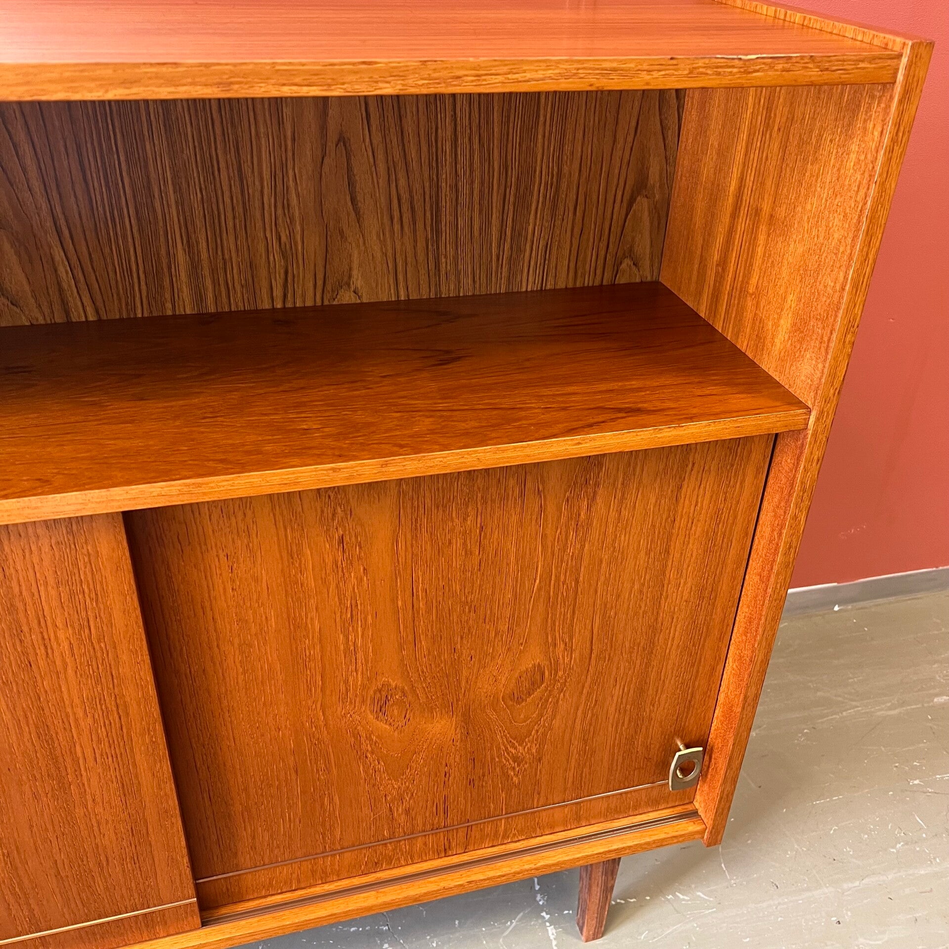 Leuk vintage schuifdeurkastje, uitgevoerd in teak (fineer) met mooi gevormde knoppen en slanke pootjes.
