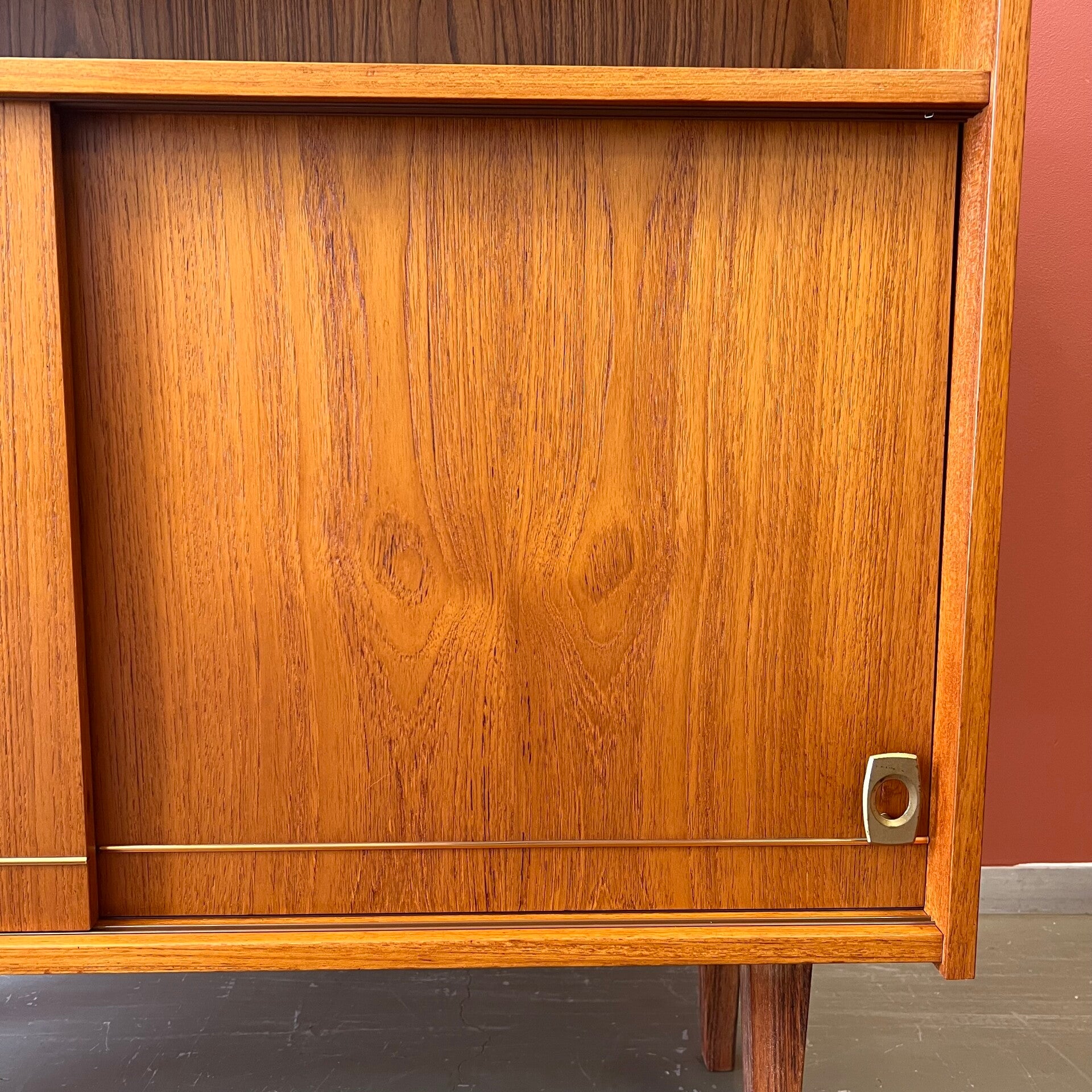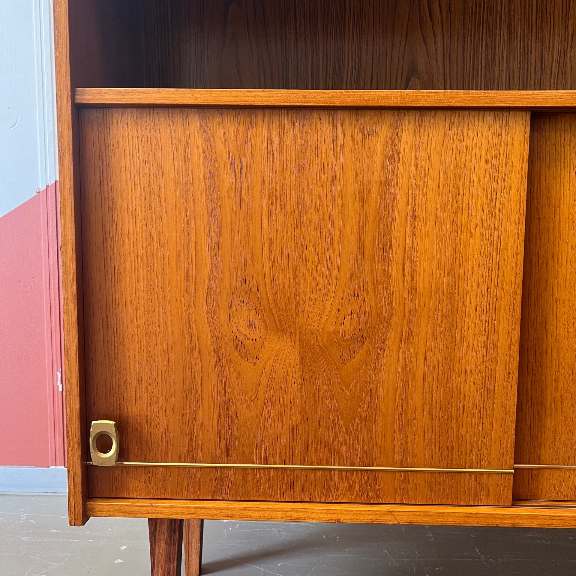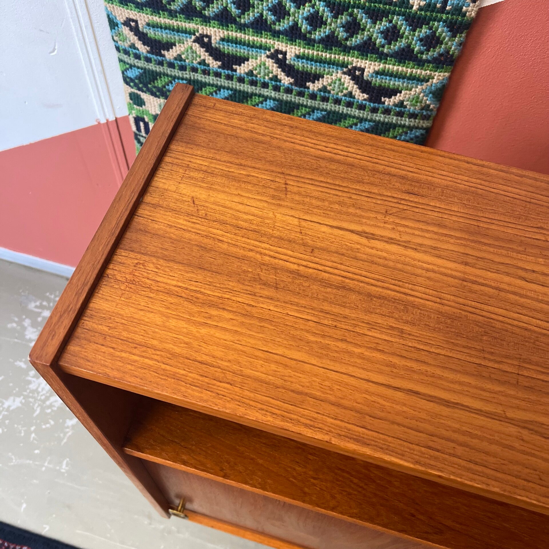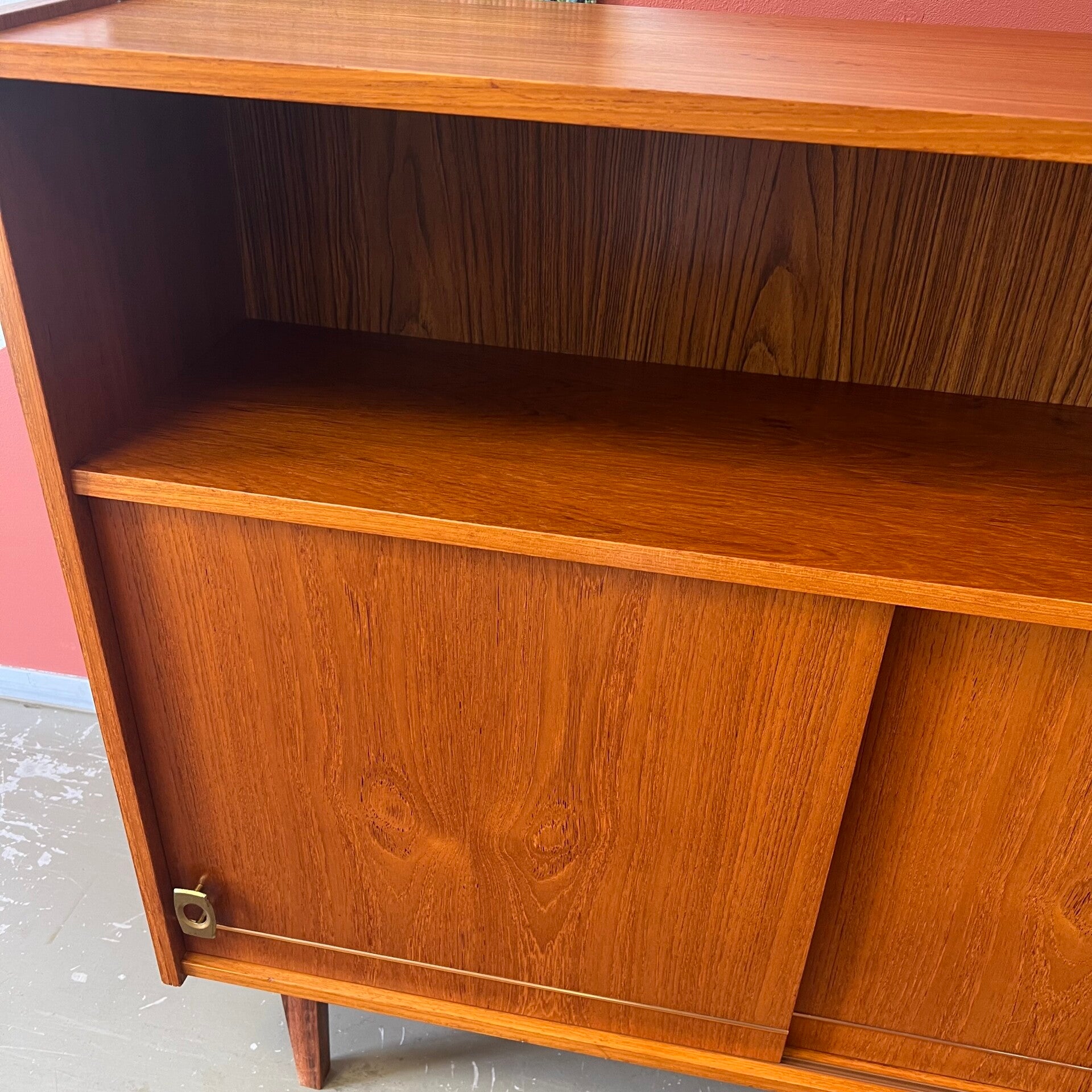Leuk vintage schuifdeurkastje, uitgevoerd in teak (fineer) met mooi gevormde knoppen en slanke pootjes.