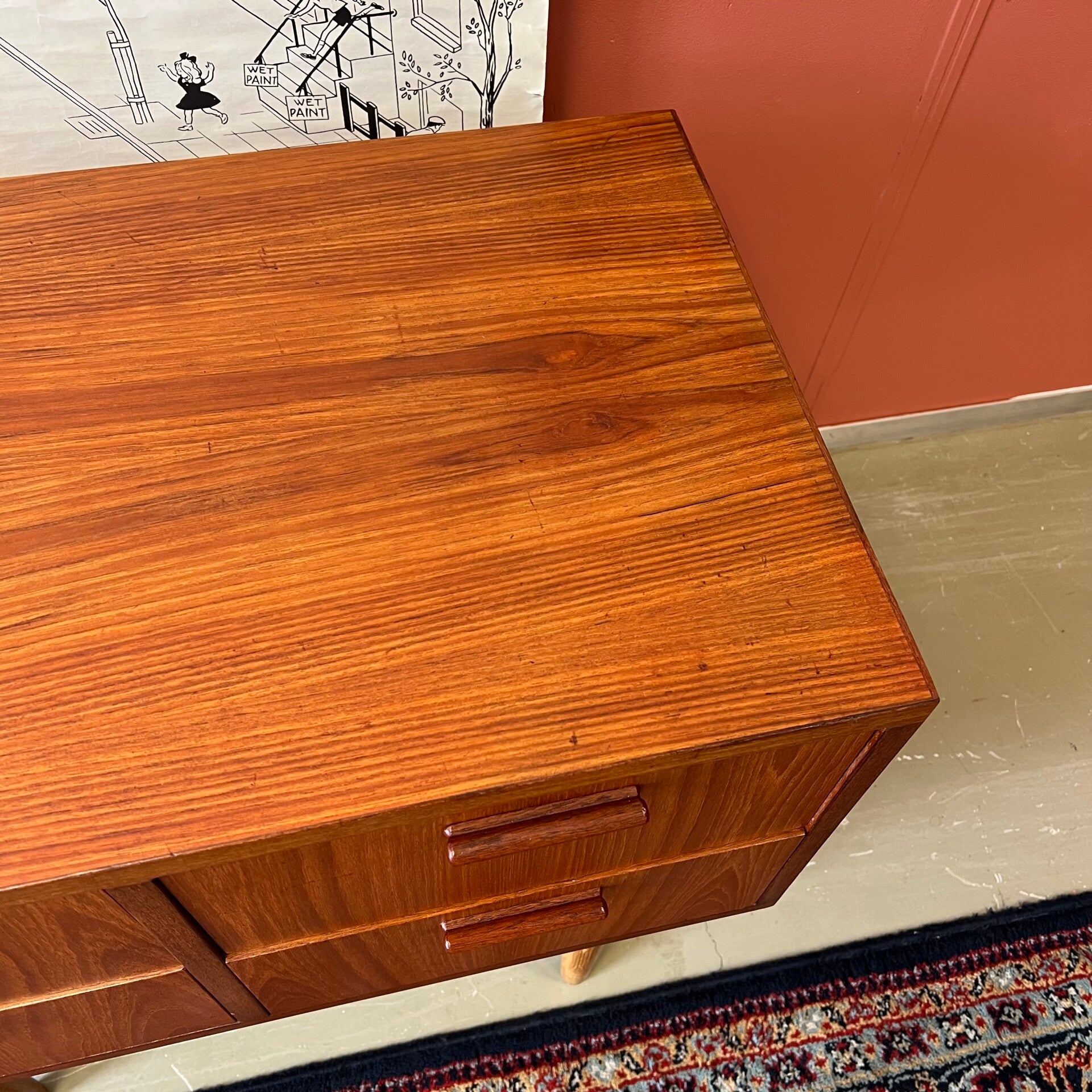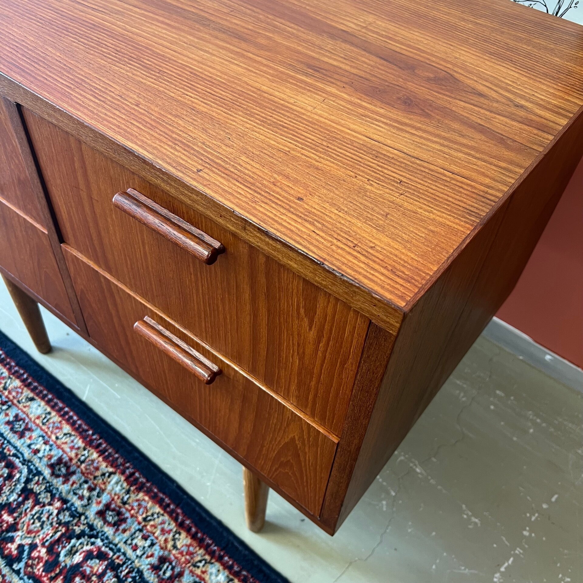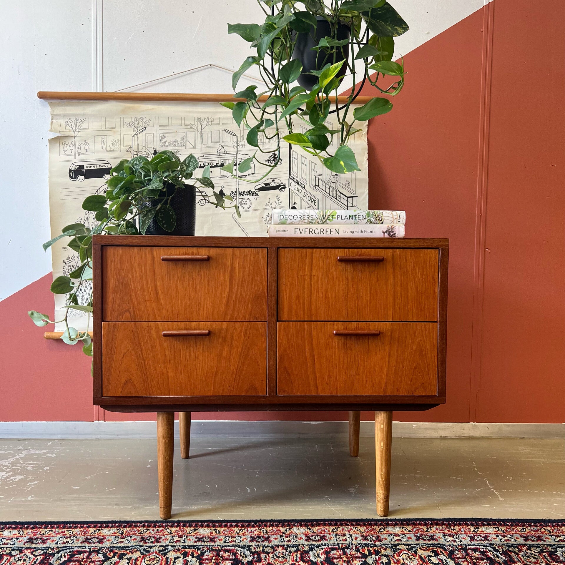 Leuk vintage ladekastje, uitgevoerd in teak (fineer) met slanke conische poten.