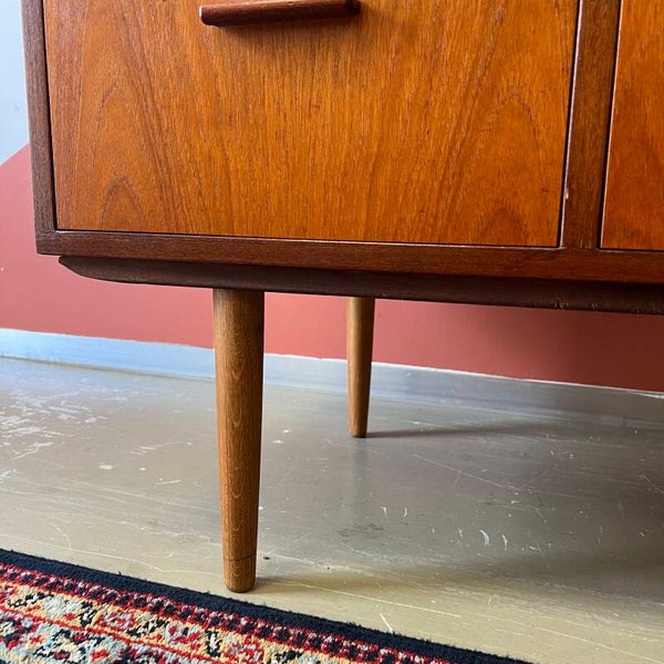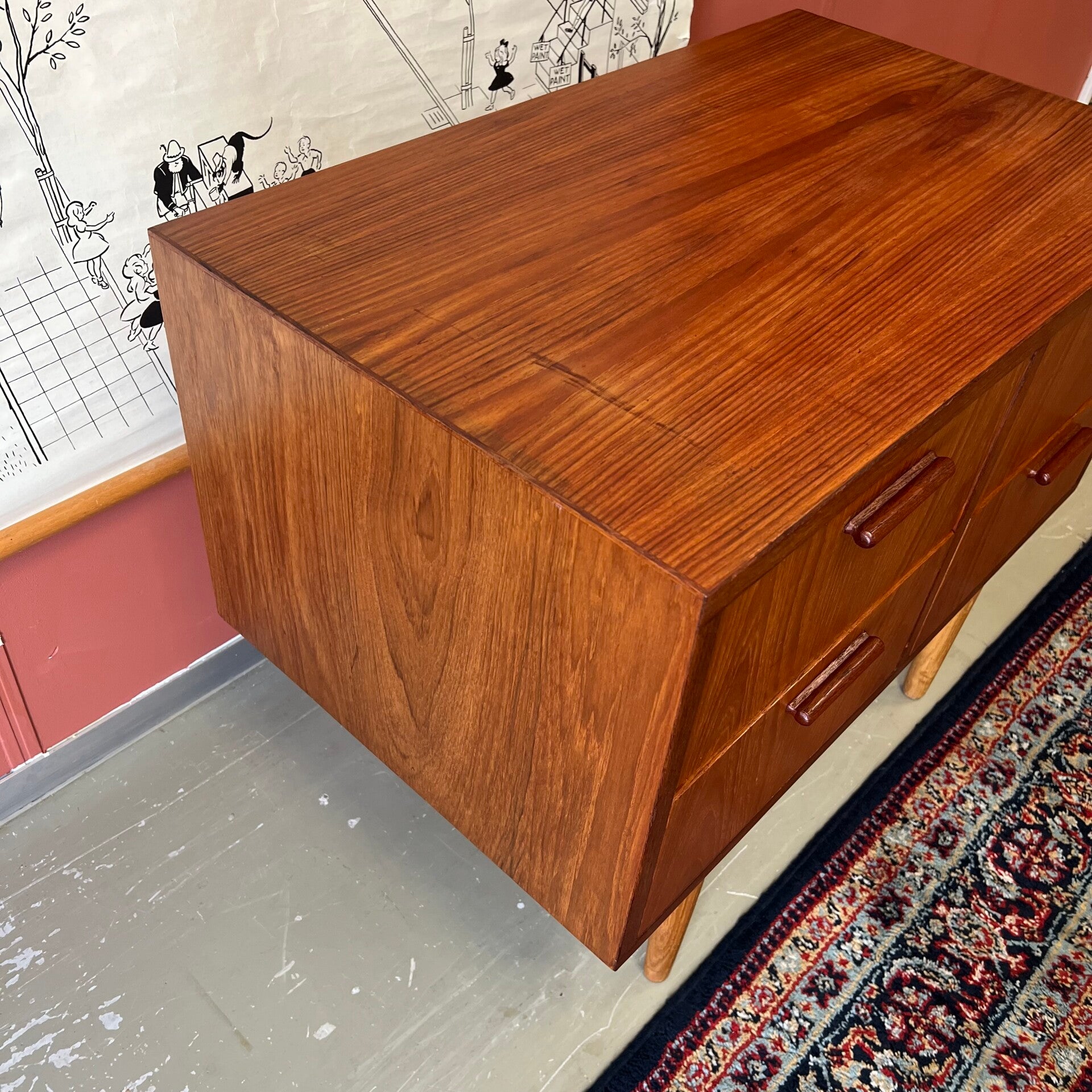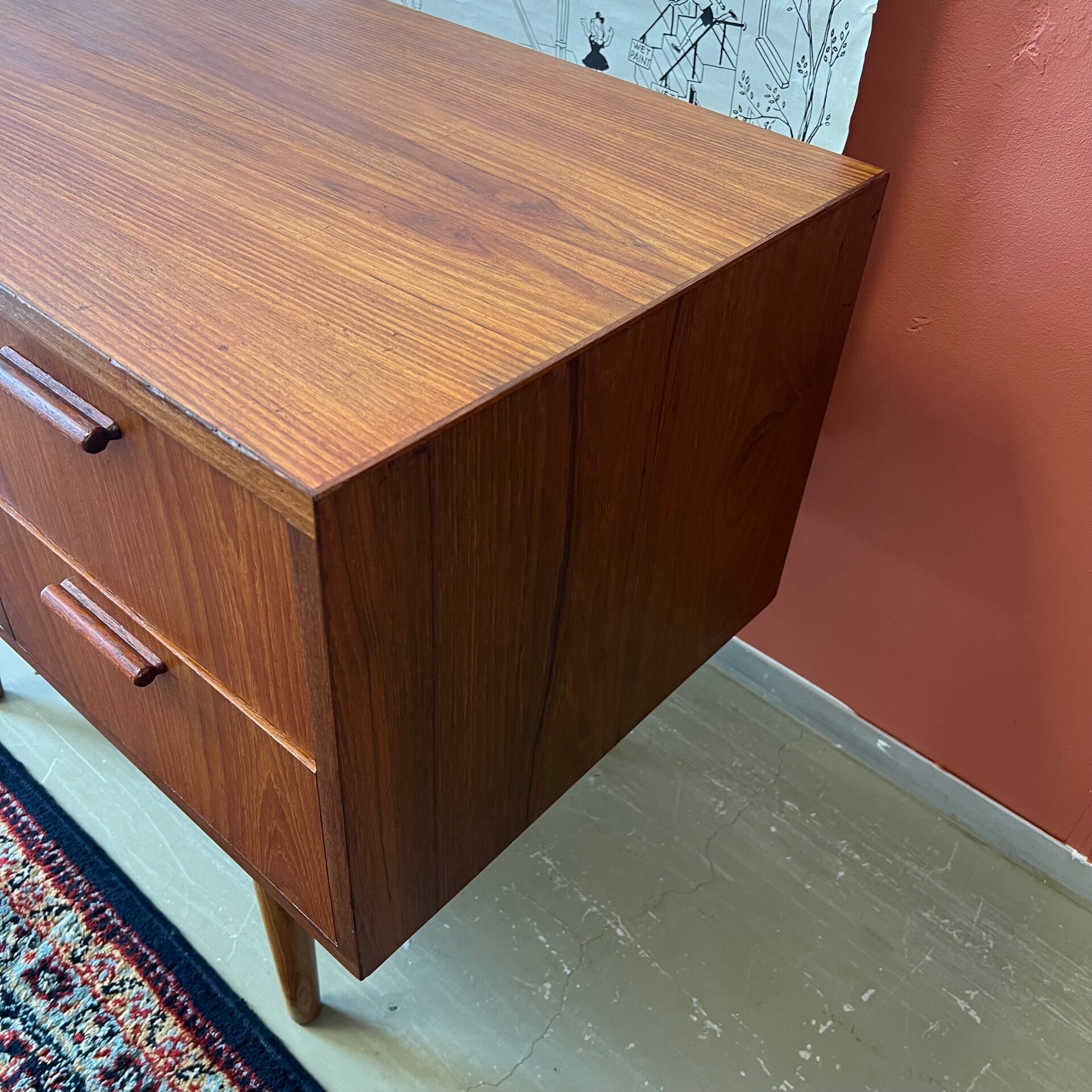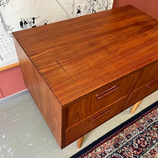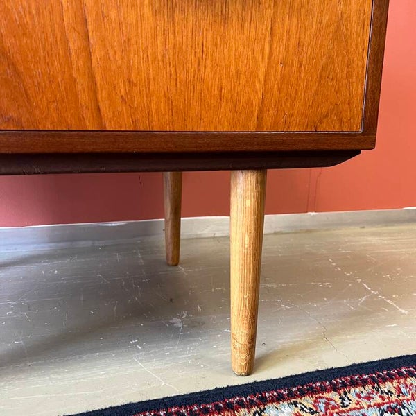 Leuk vintage ladekastje, uitgevoerd in teak (fineer) met slanke conische poten.