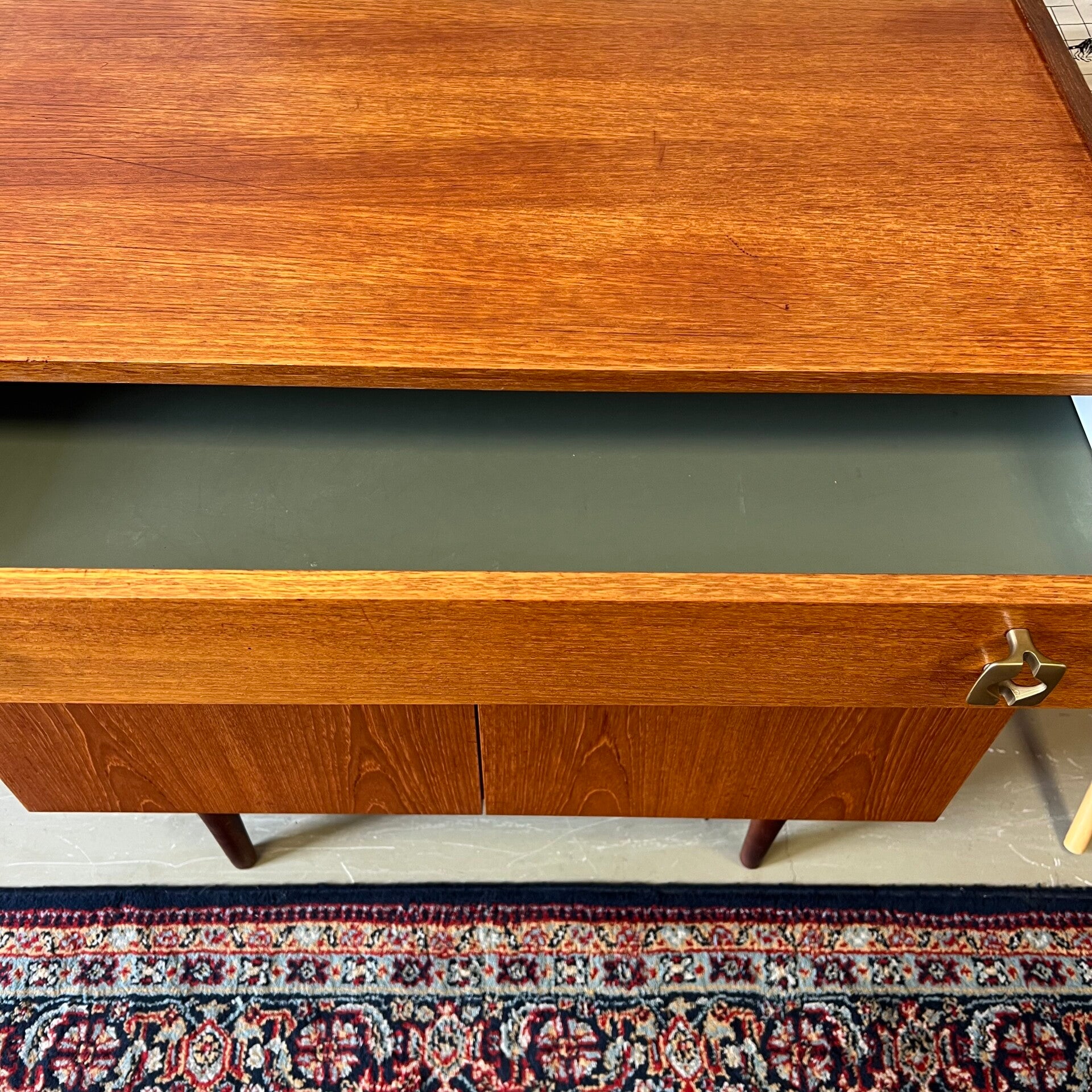 Uitgevoerd in teak (fineer) met mooi vormgegeven knoppen.