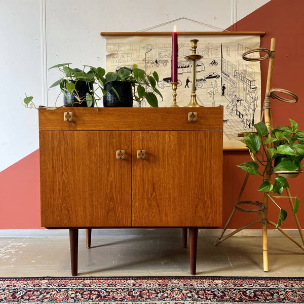Leuk vintage Scandinavisch kastje of DIY badkamermeubel op conische poten.