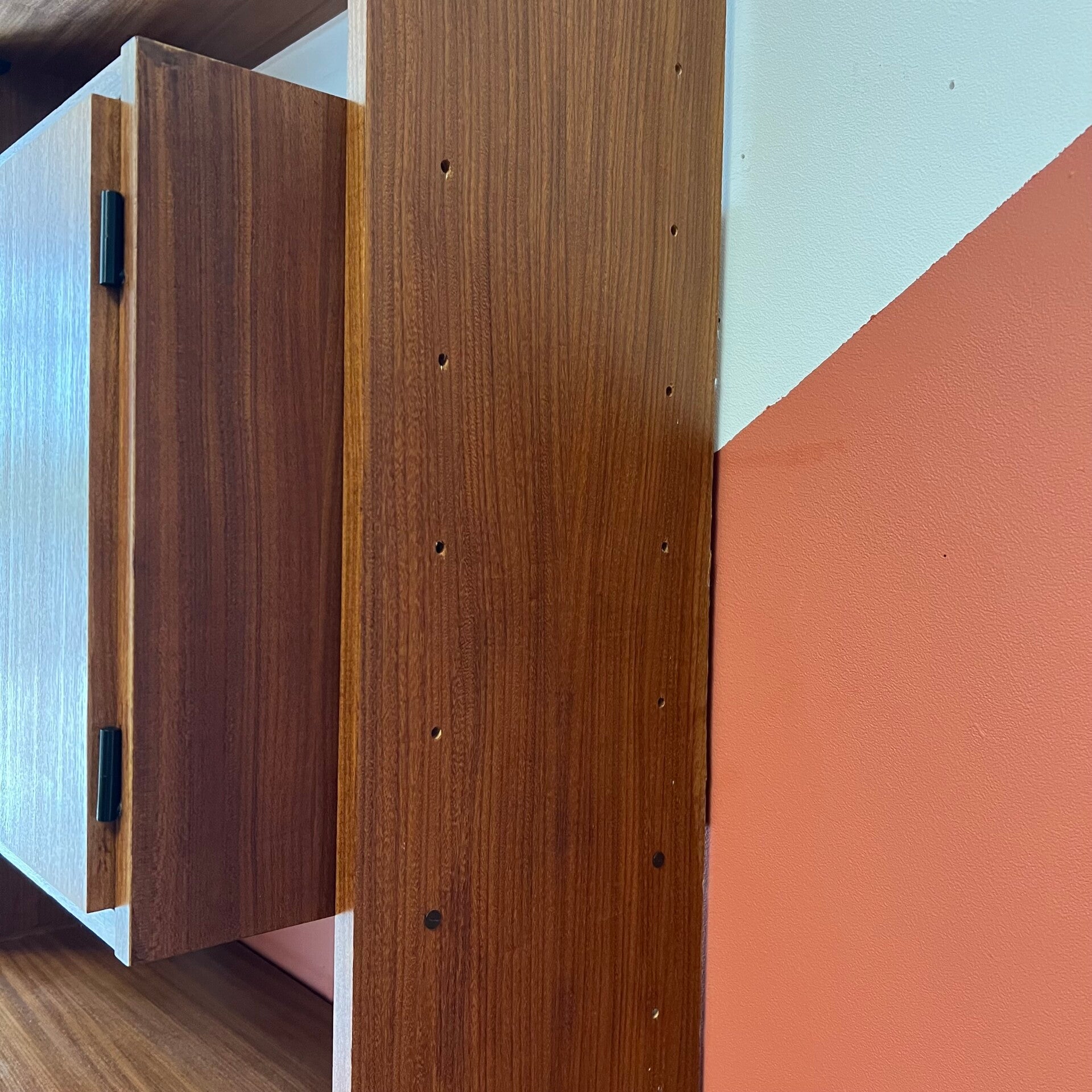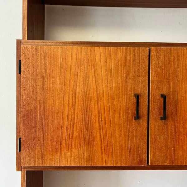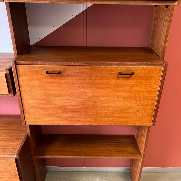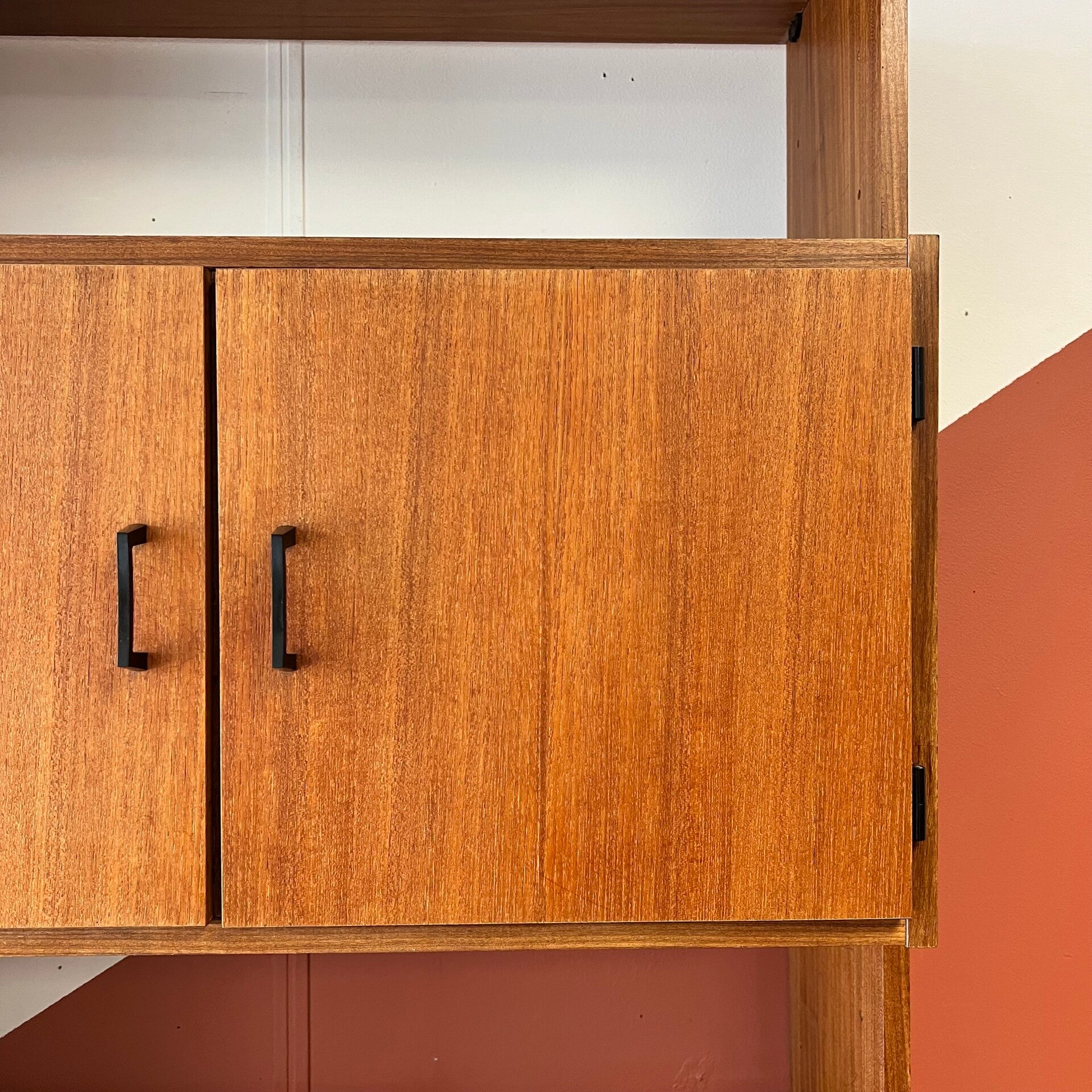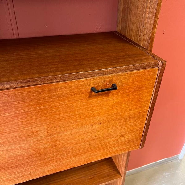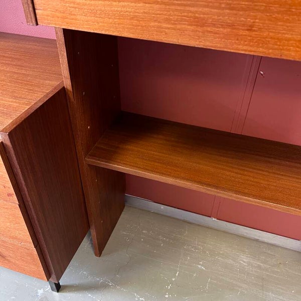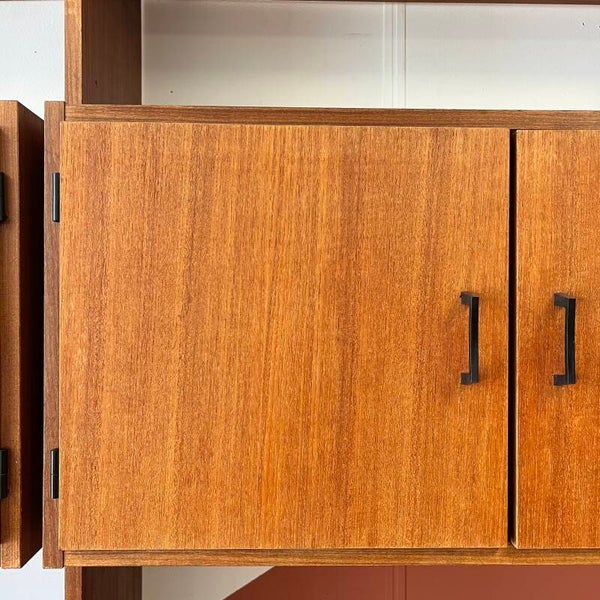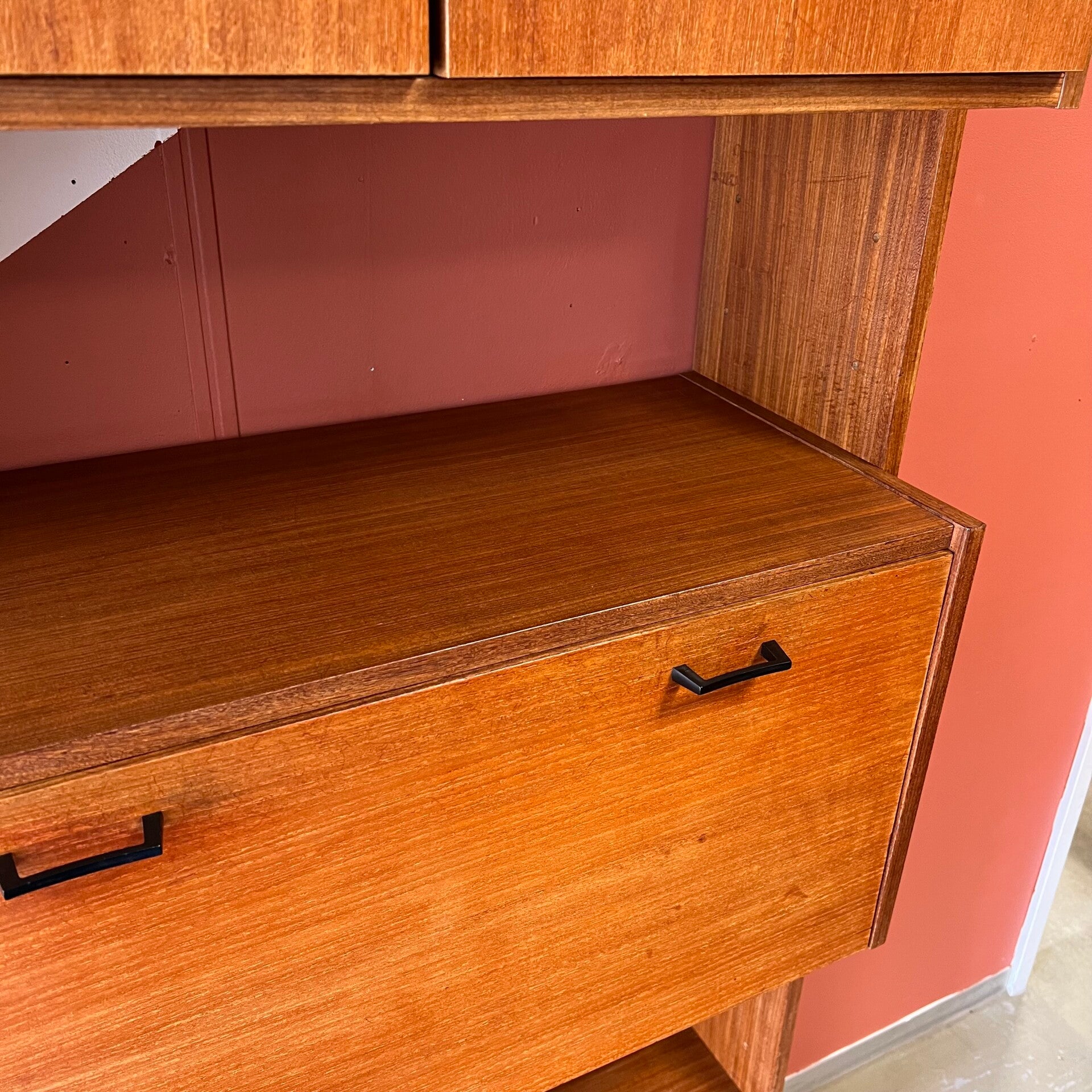 Mooi karakteristiek vintage wandmeubel in teak (fineer) met zwart beslag.