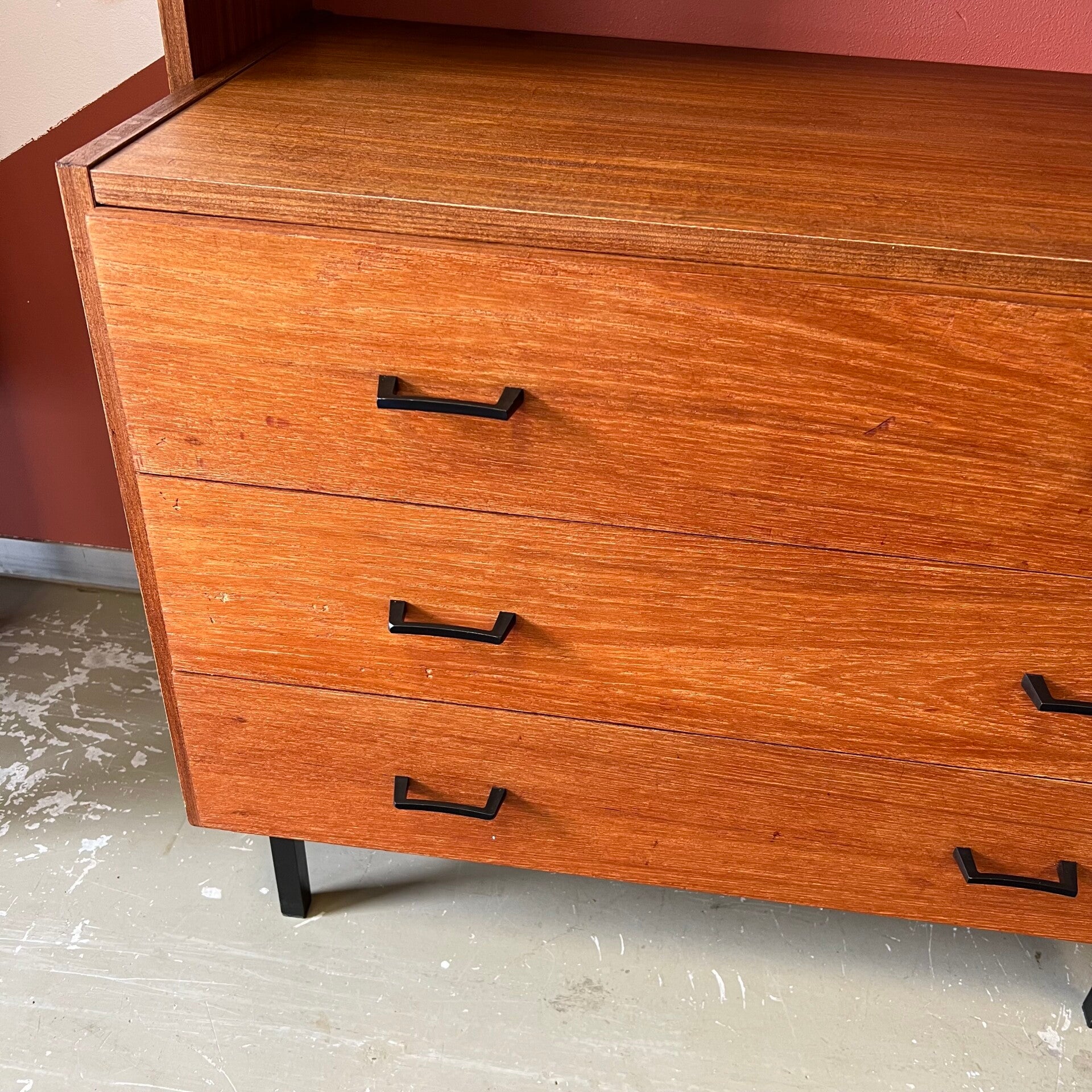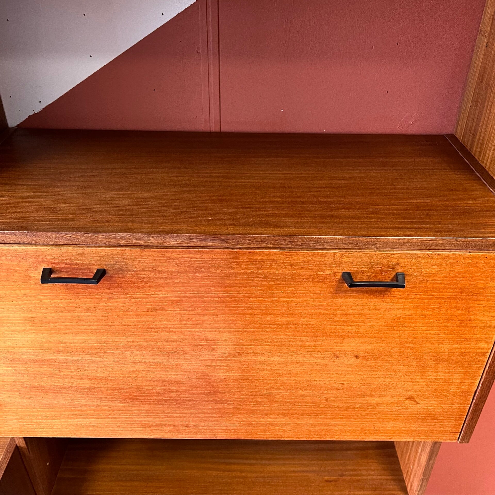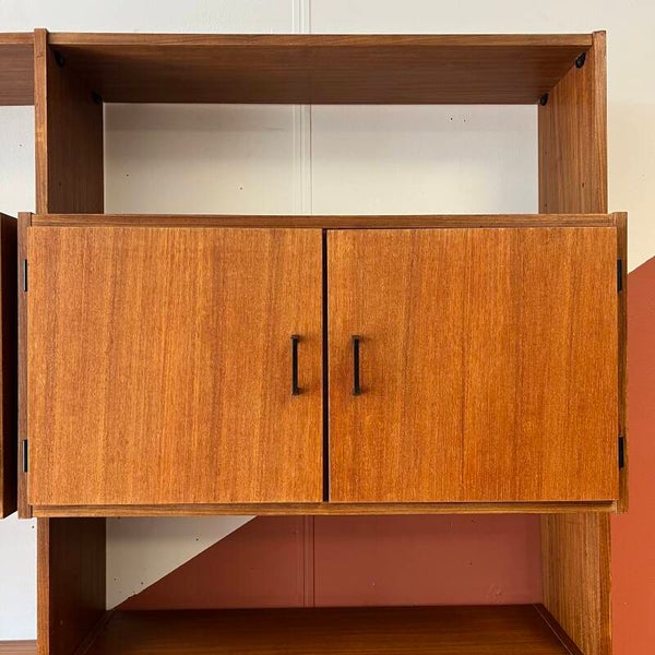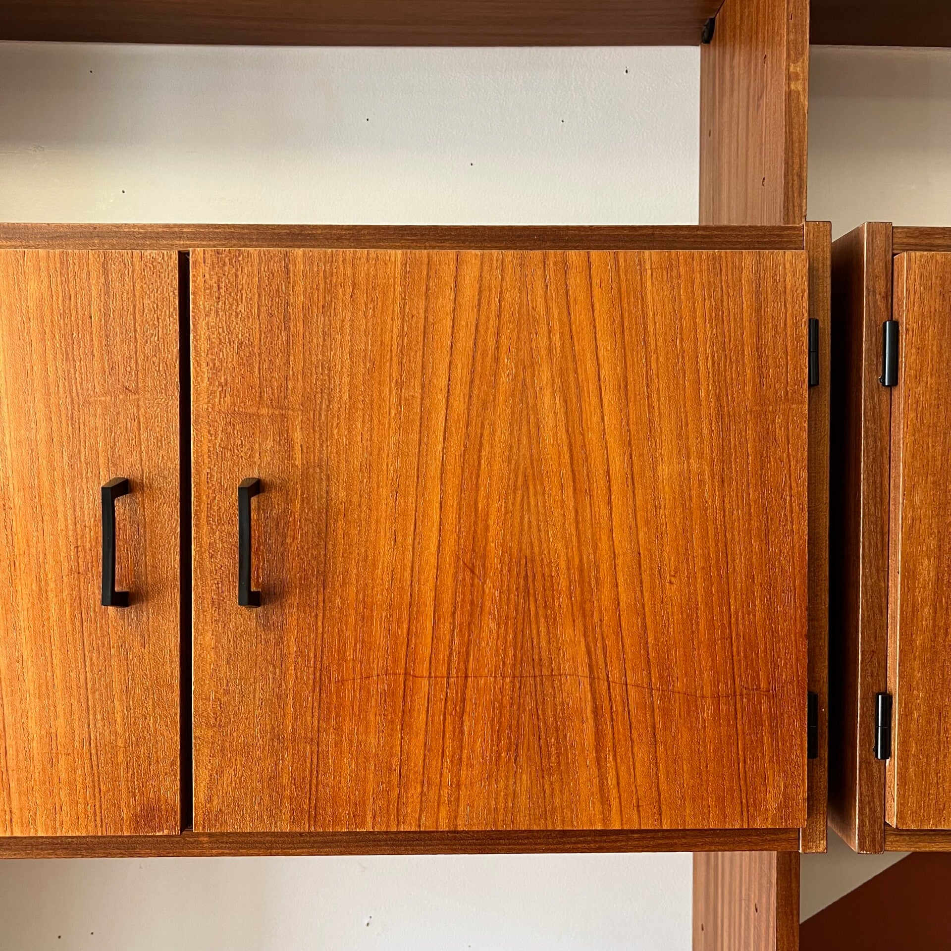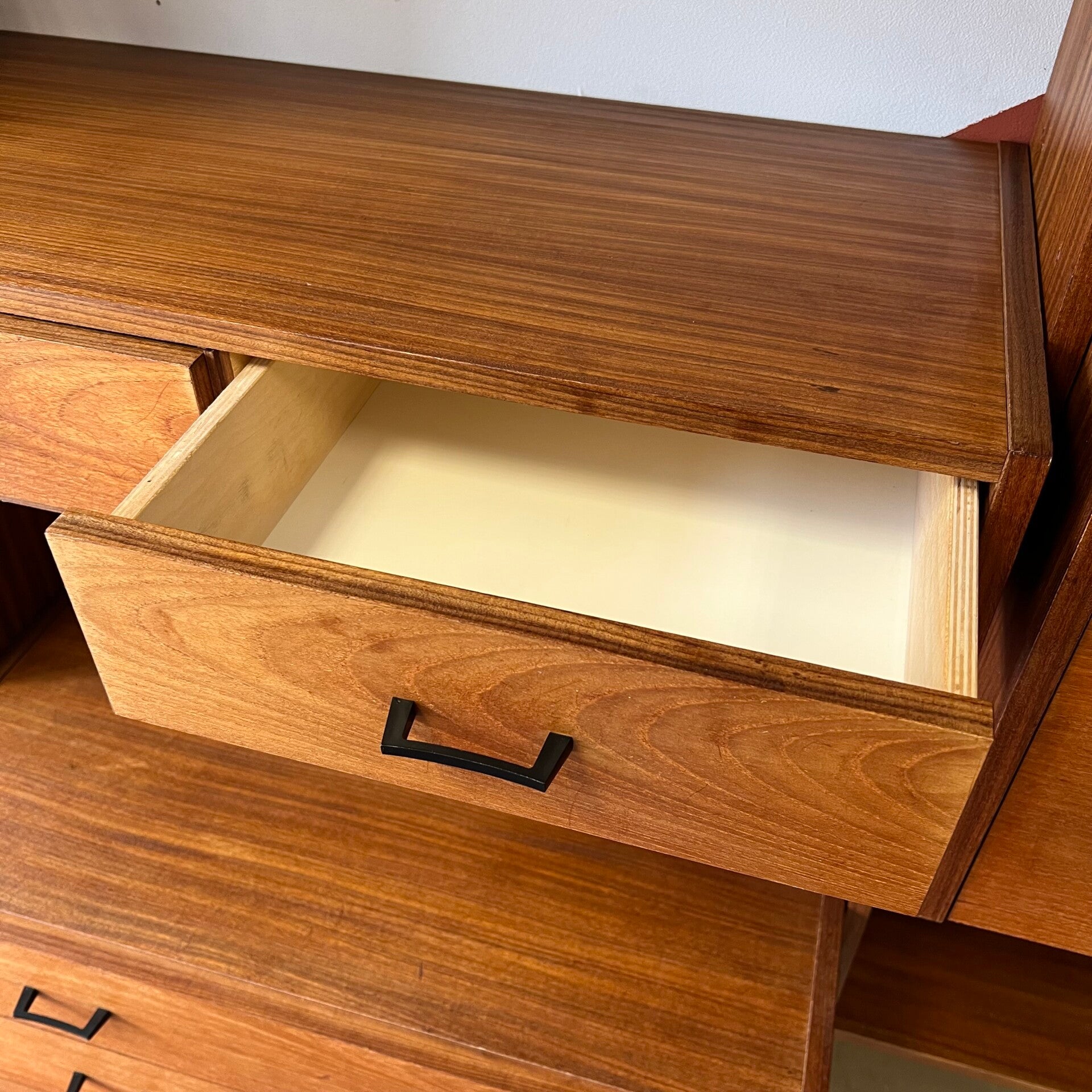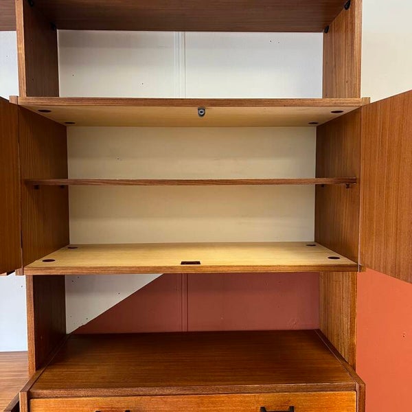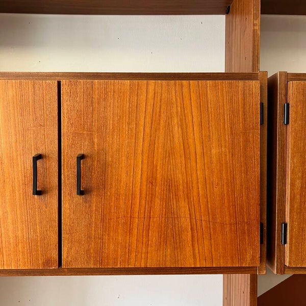 Mooi karakteristiek vintage wandmeubel in teak (fineer) met zwart beslag.