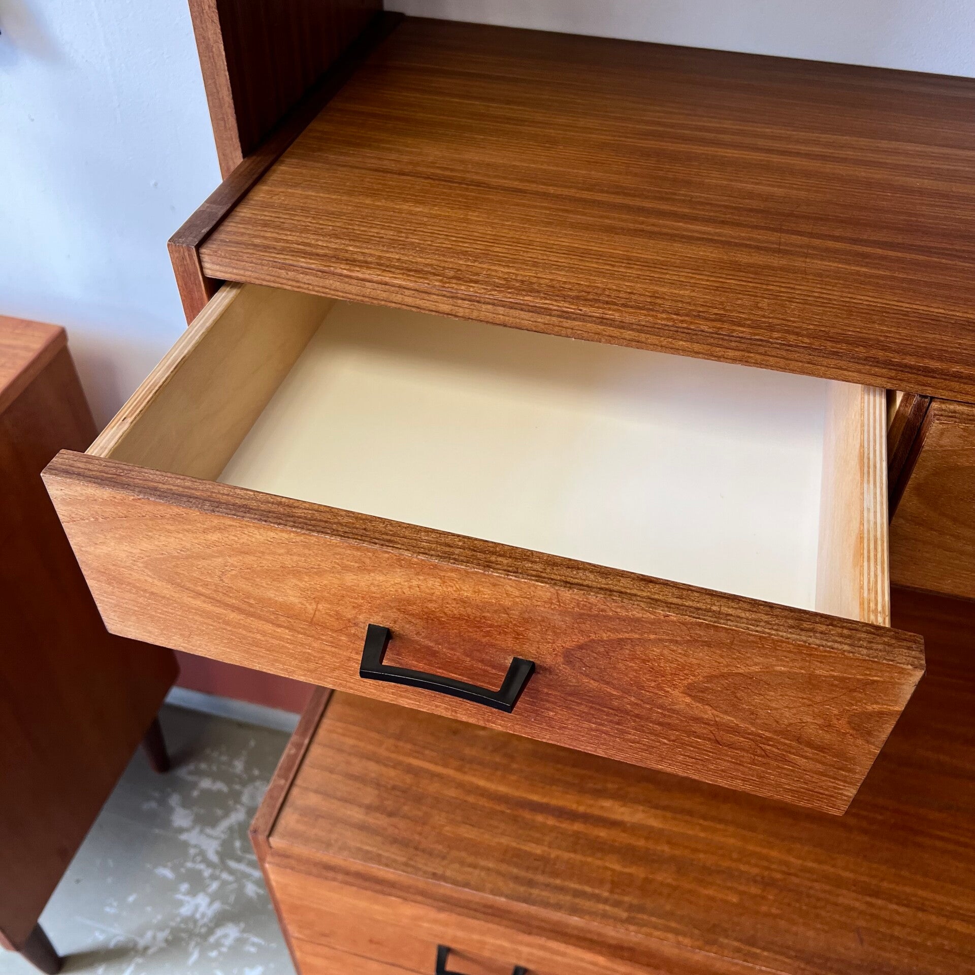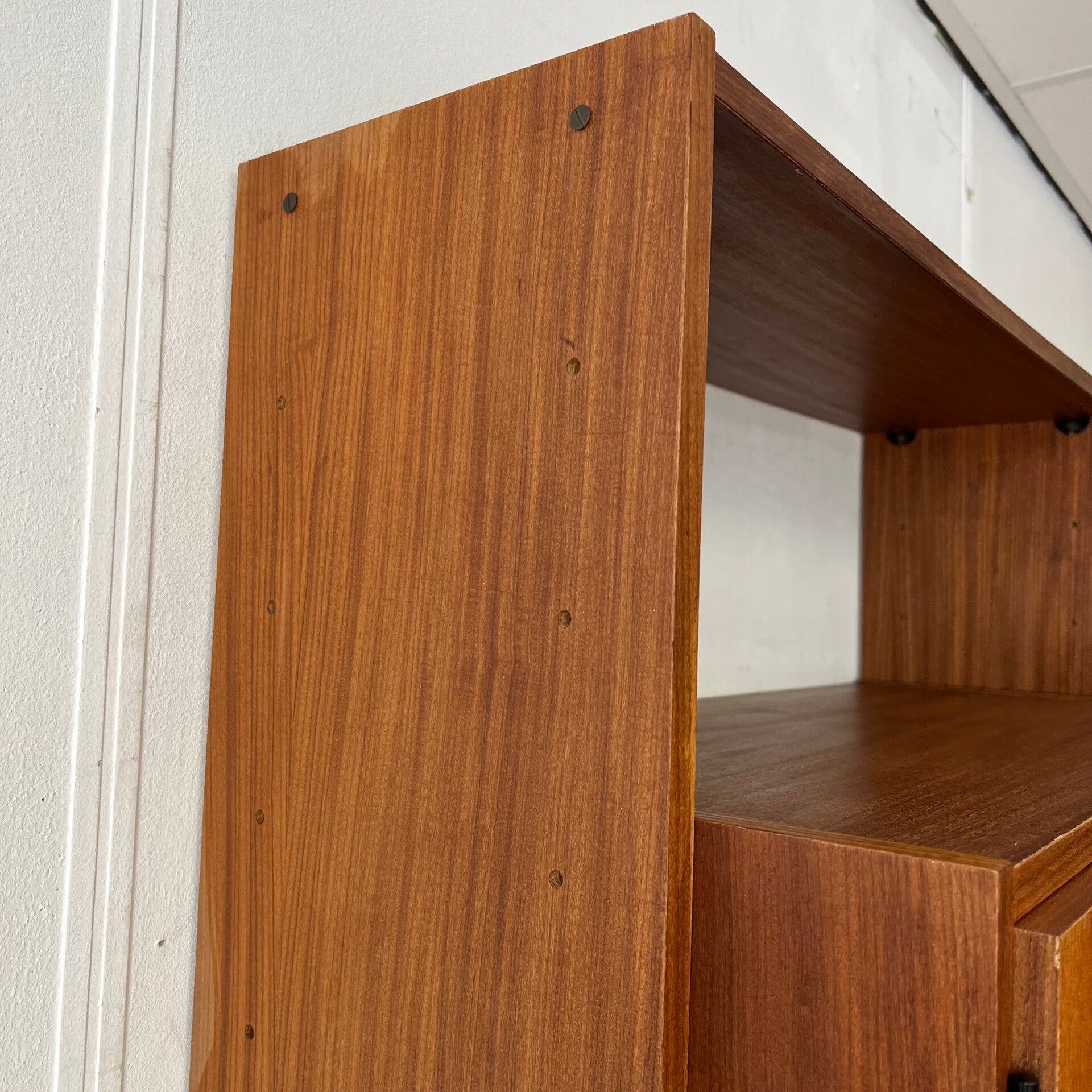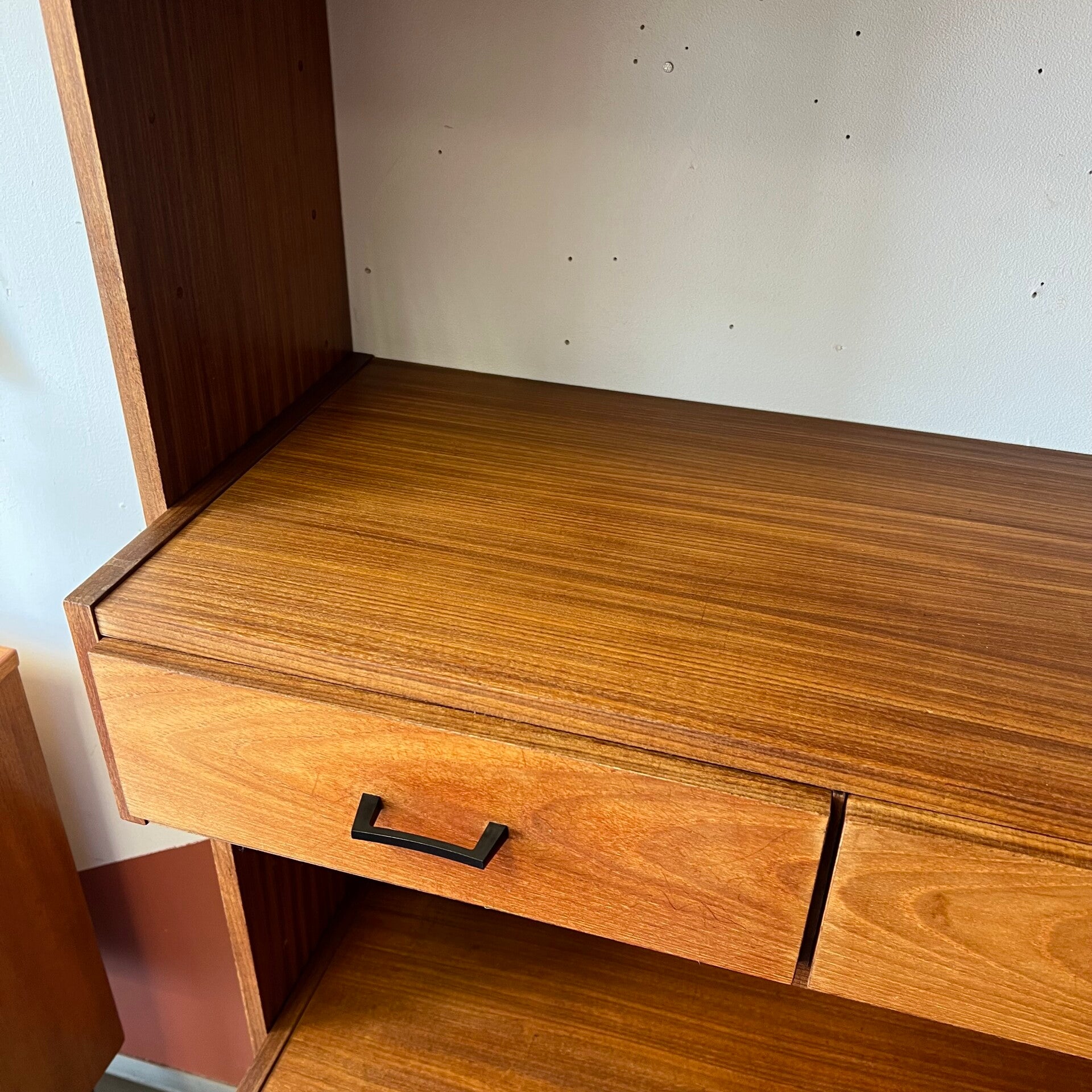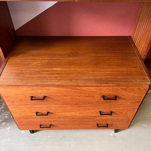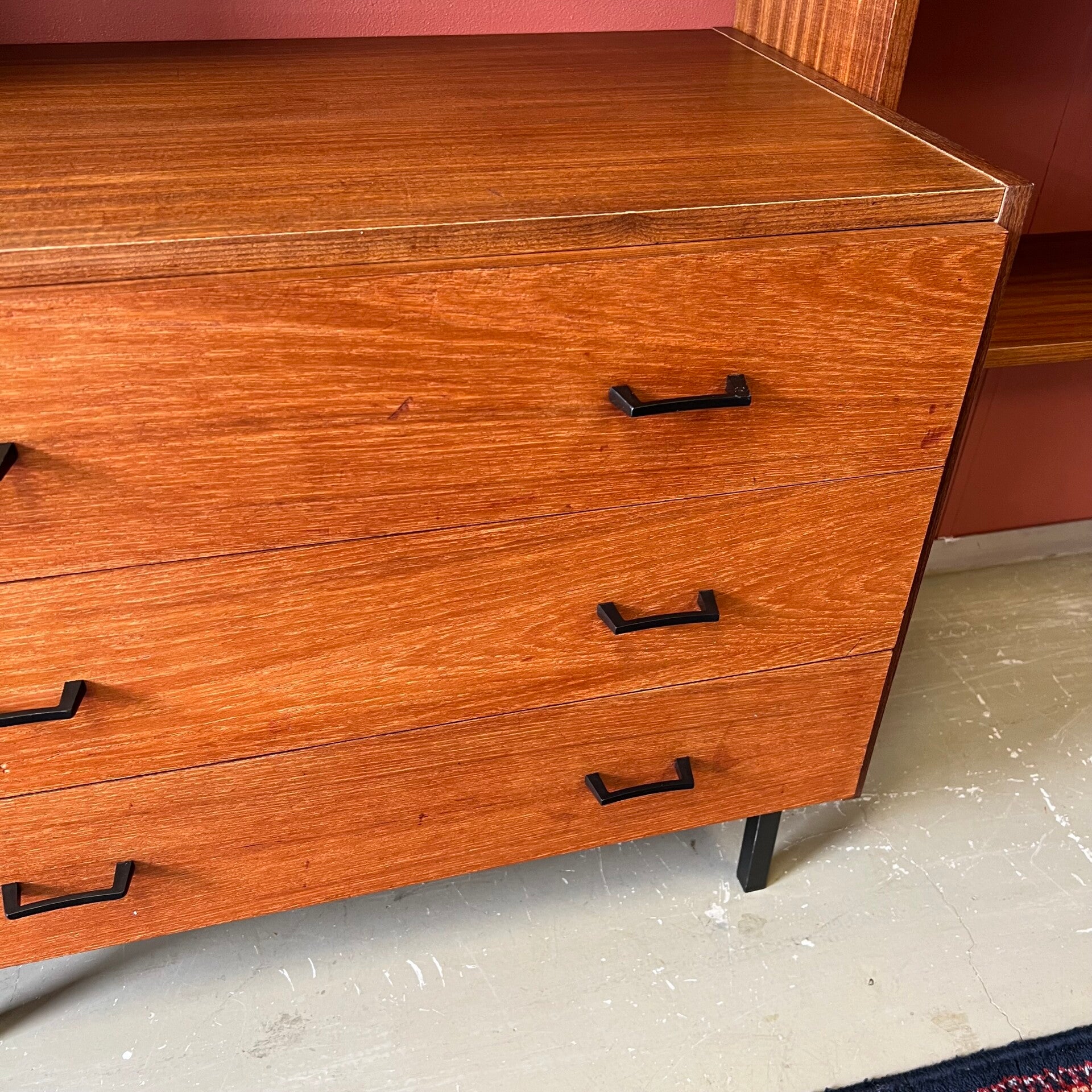 Mooi karakteristiek vintage wandmeubel in teak (fineer) met zwart beslag.