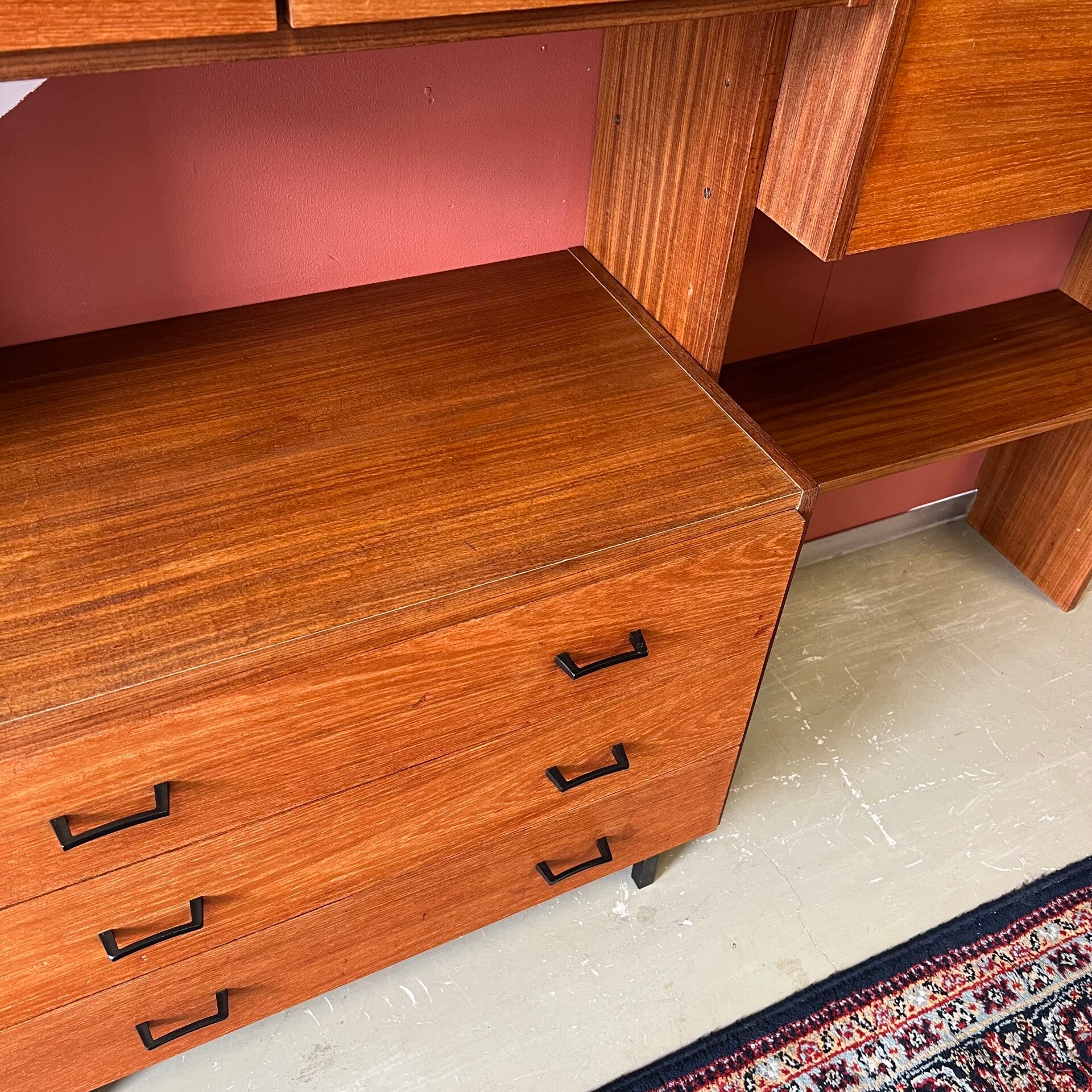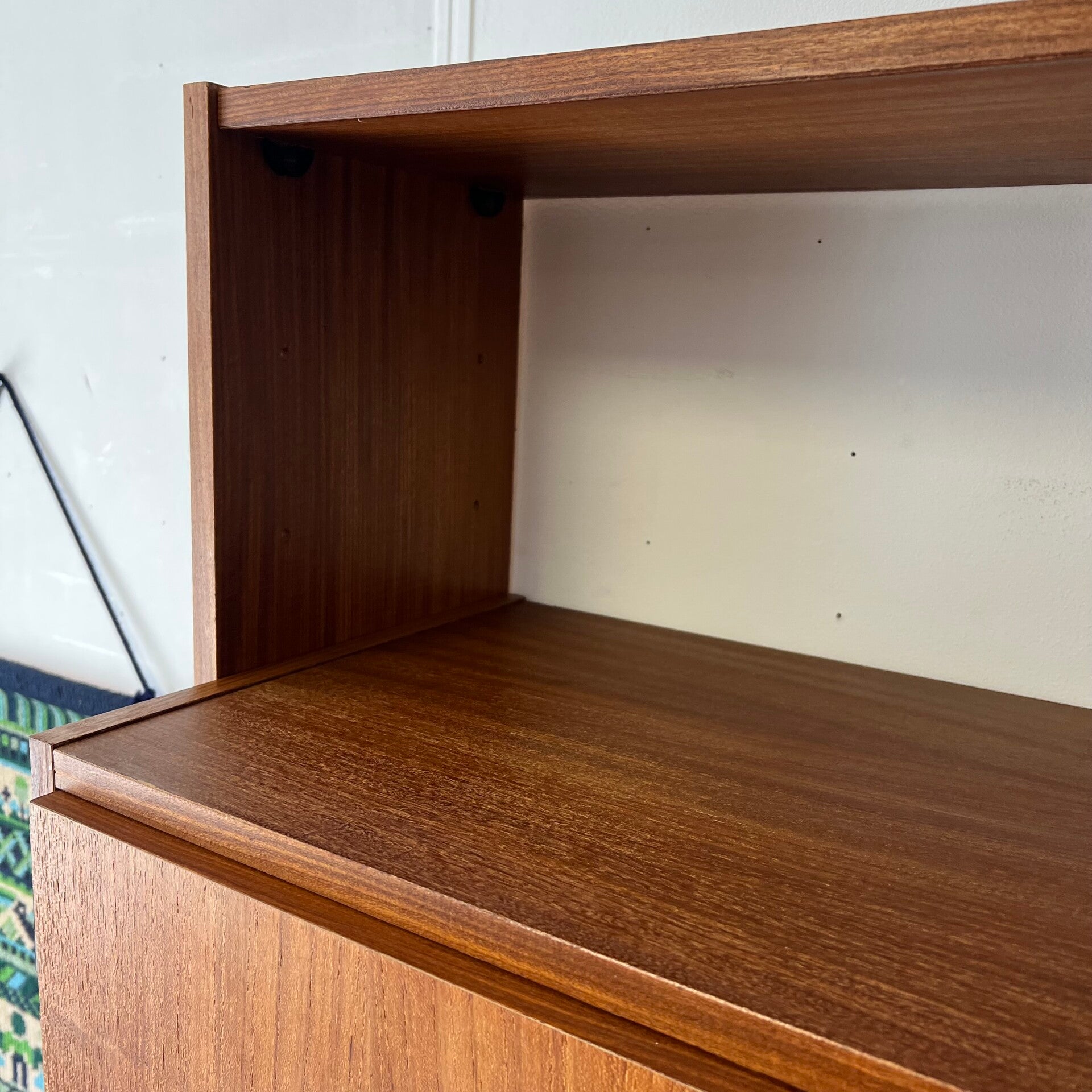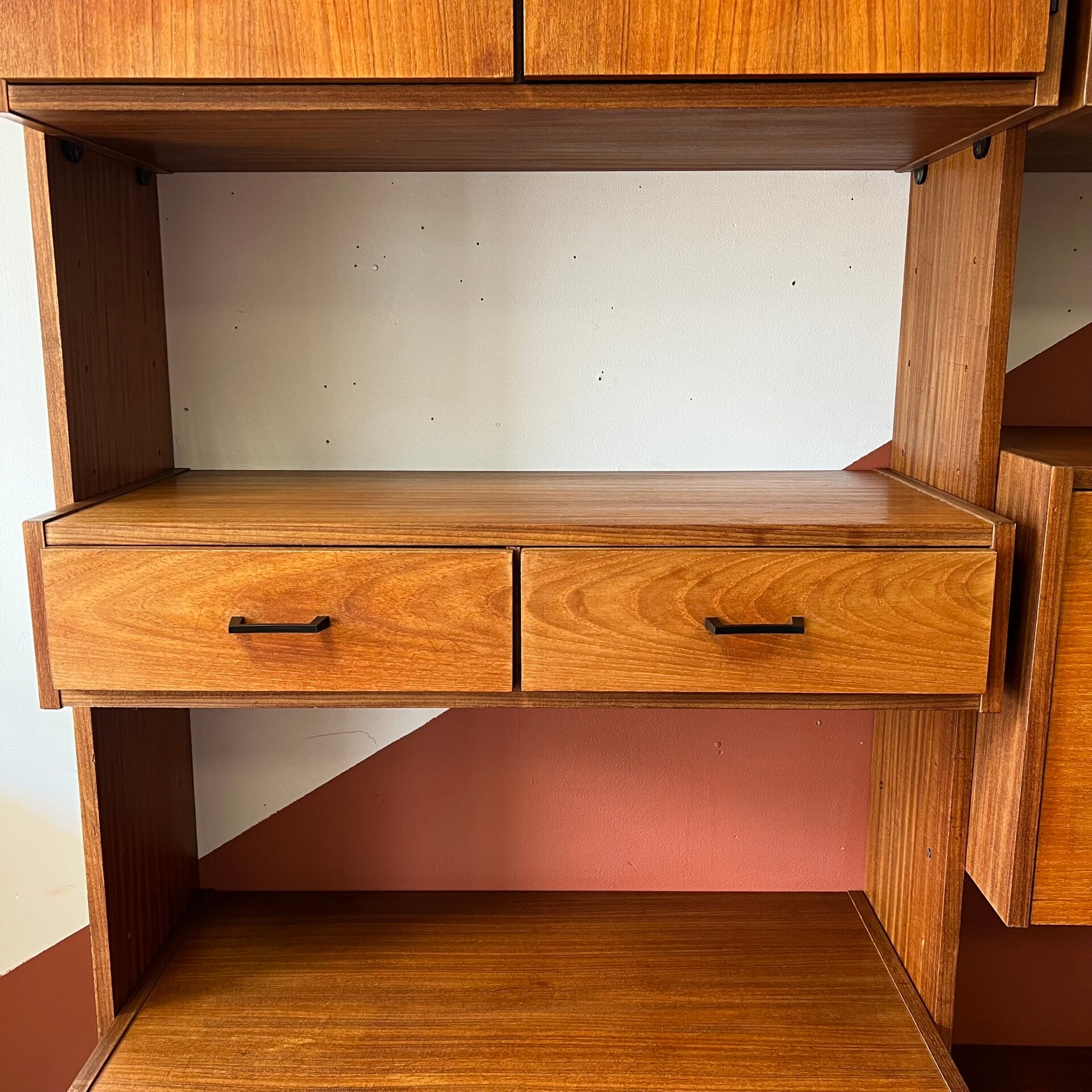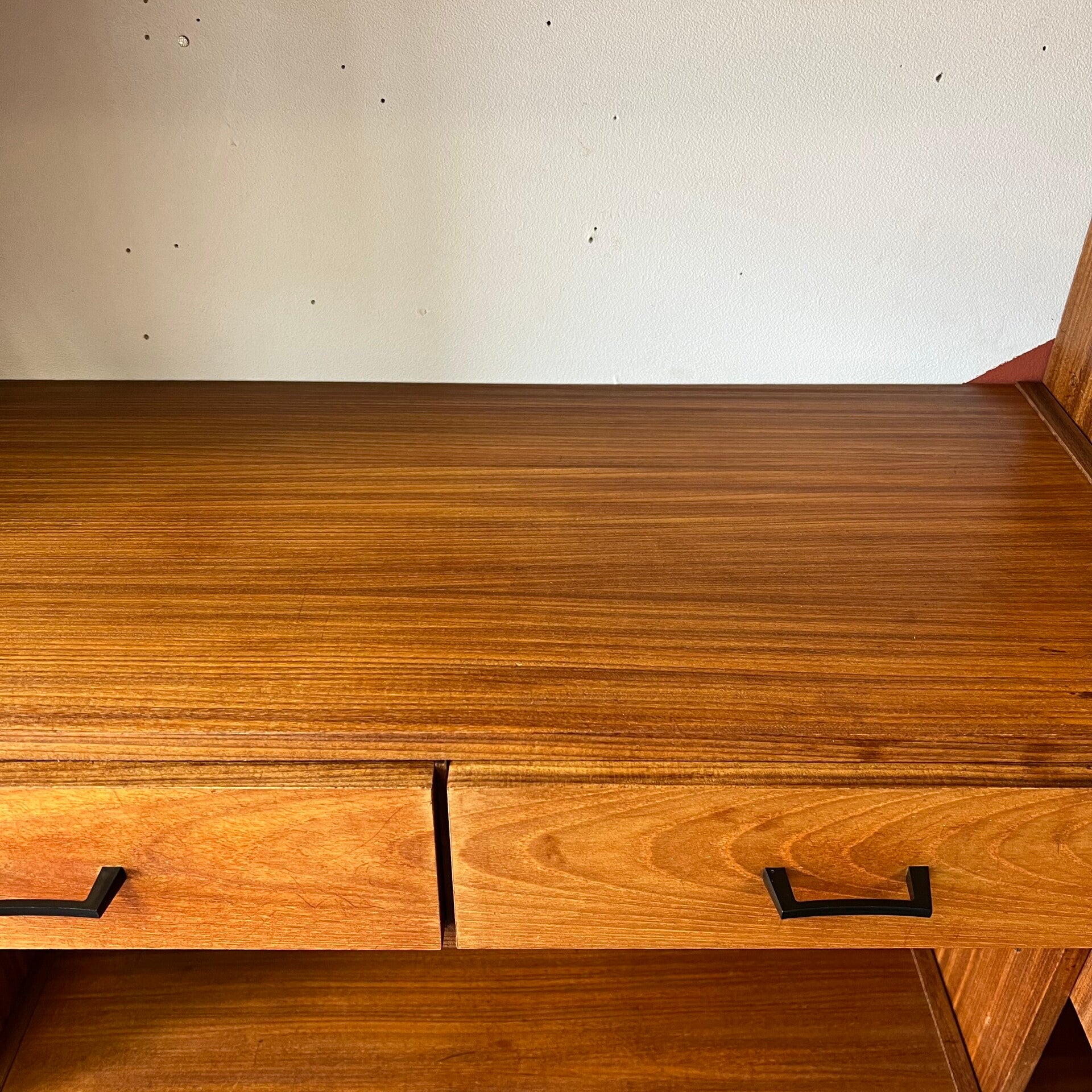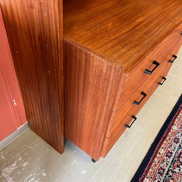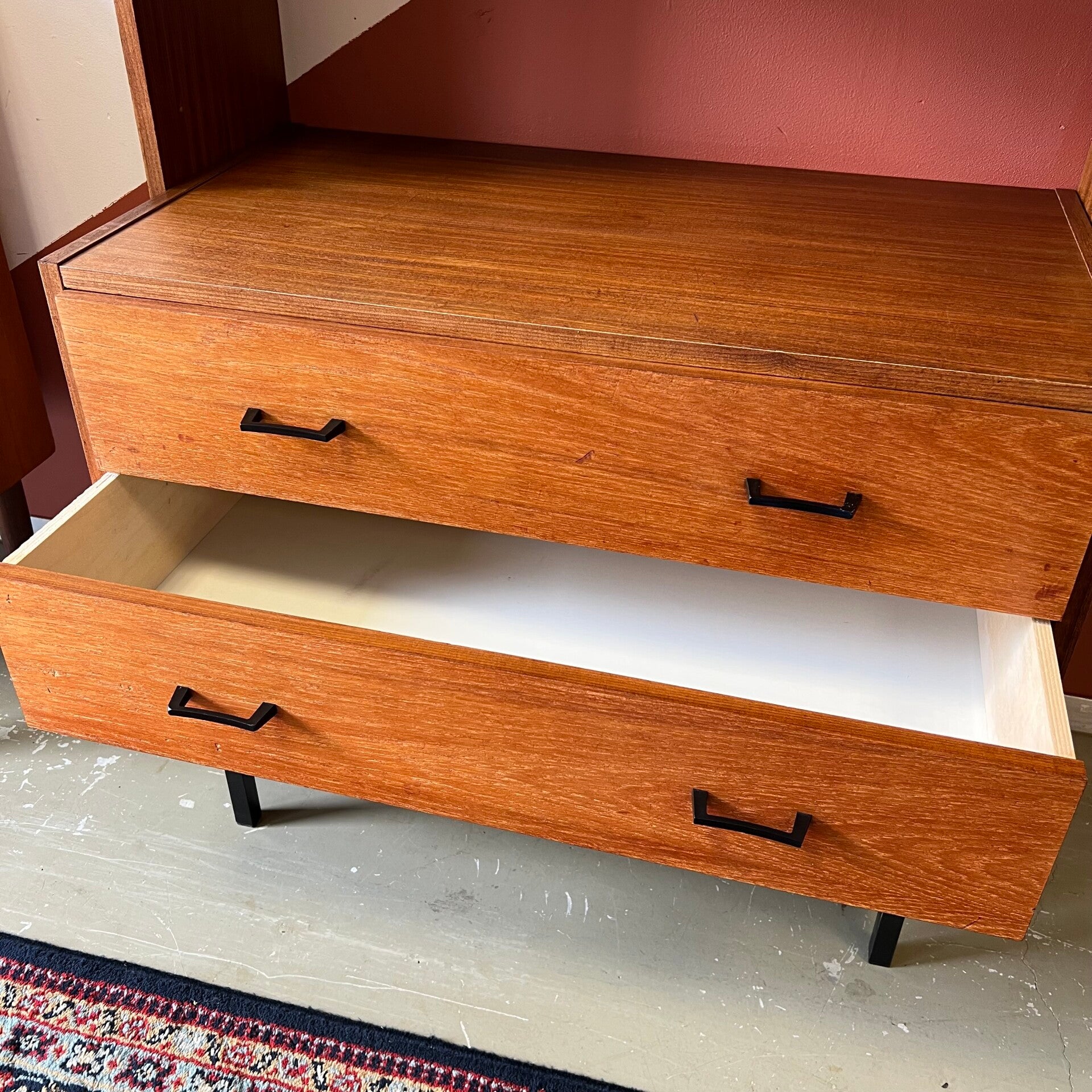 Mooi karakteristiek vintage wandmeubel in teak (fineer) met zwart beslag.