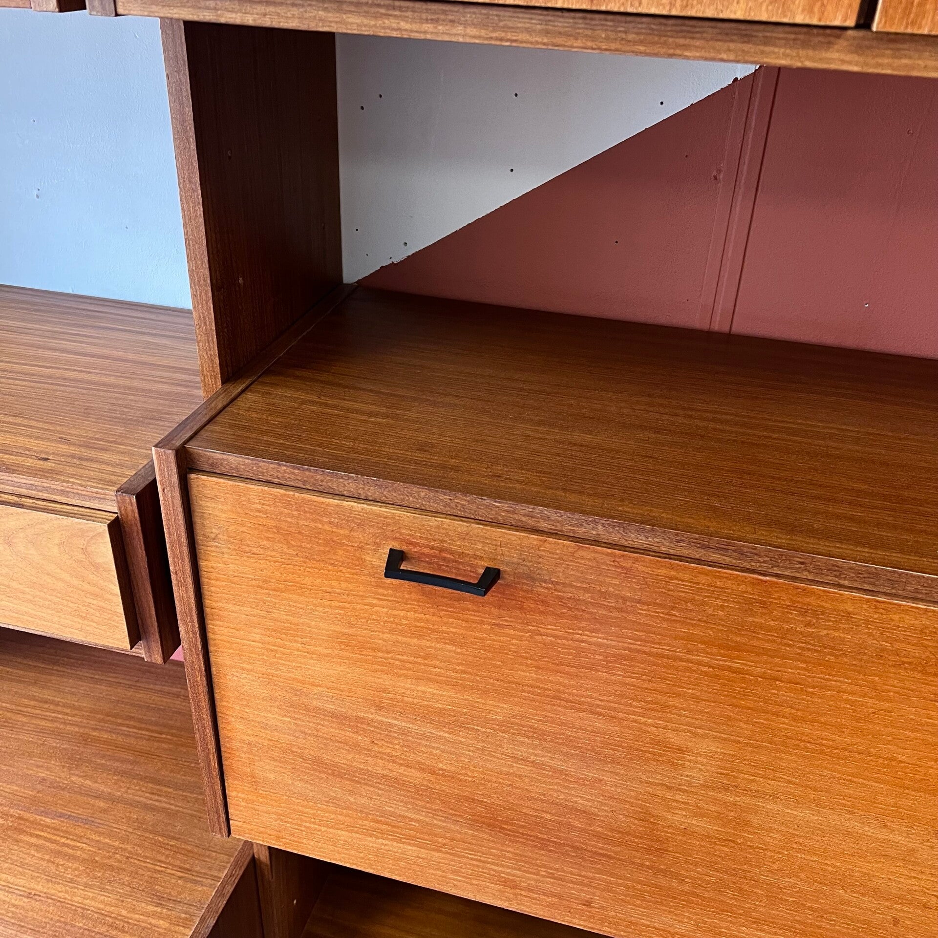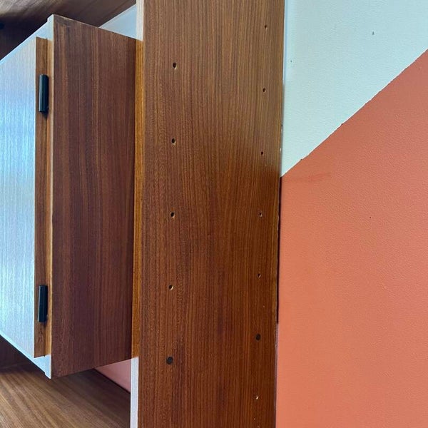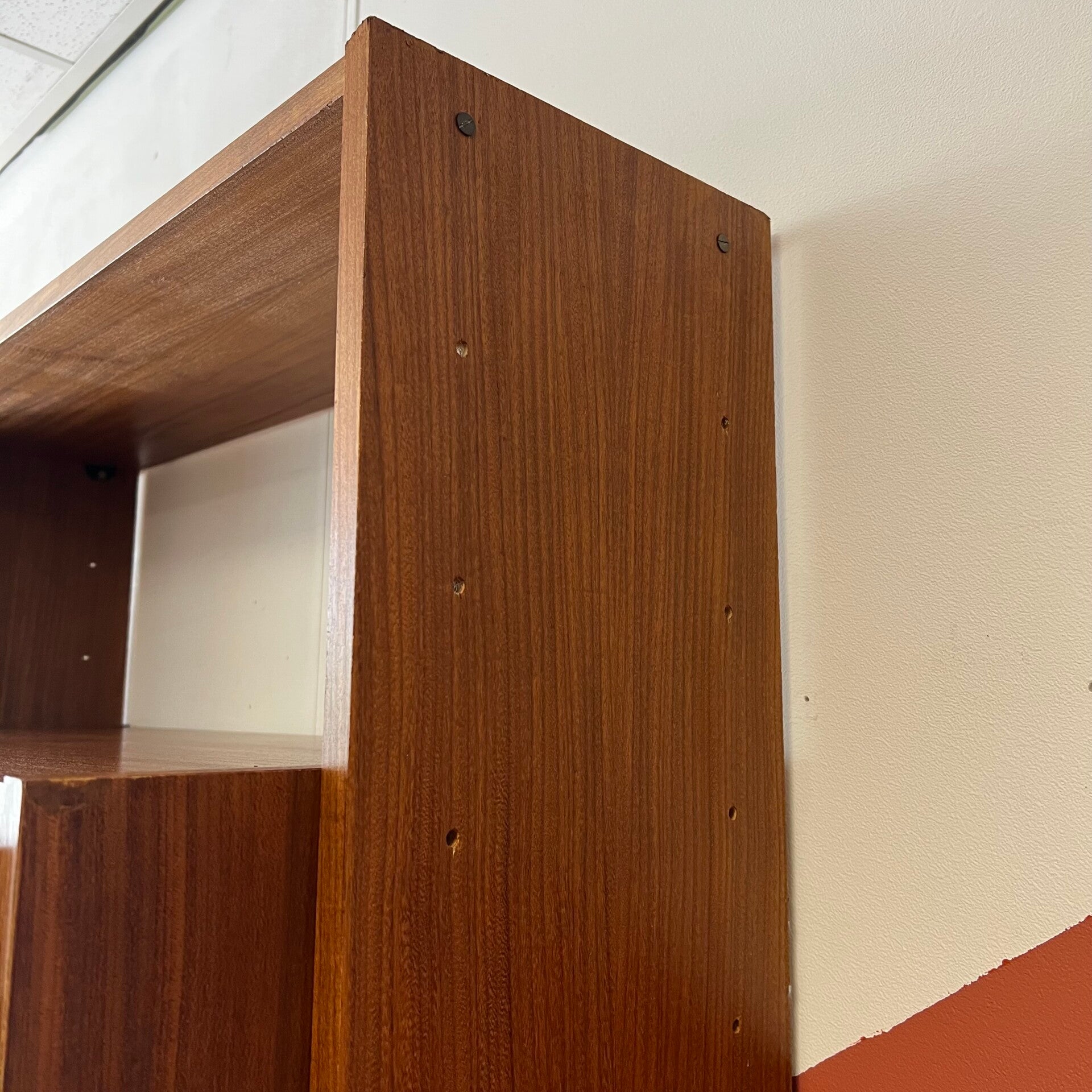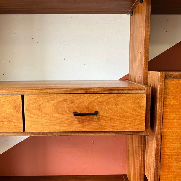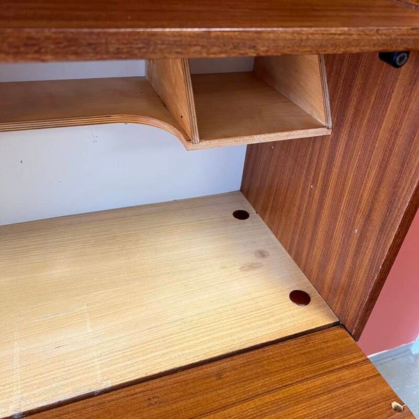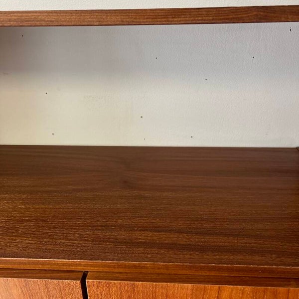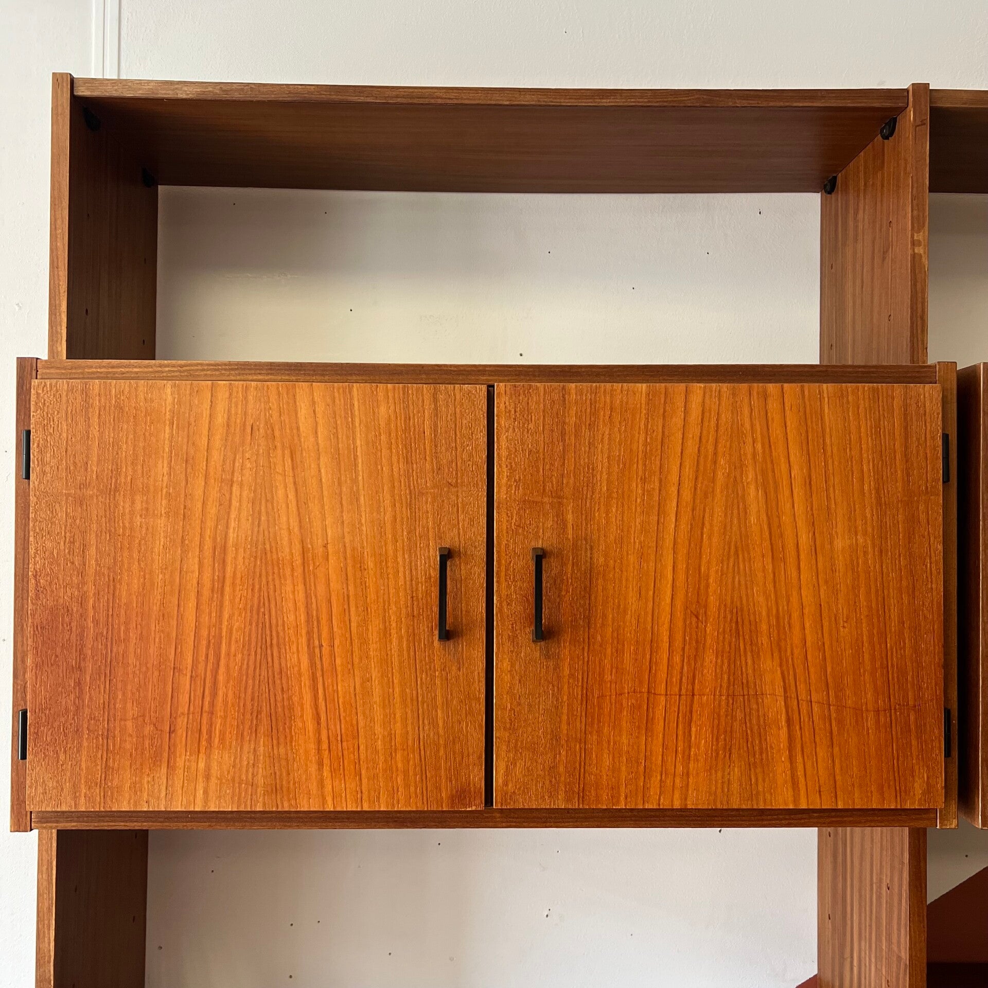 Mooi karakteristiek vintage wandmeubel in teak (fineer) met zwart beslag.