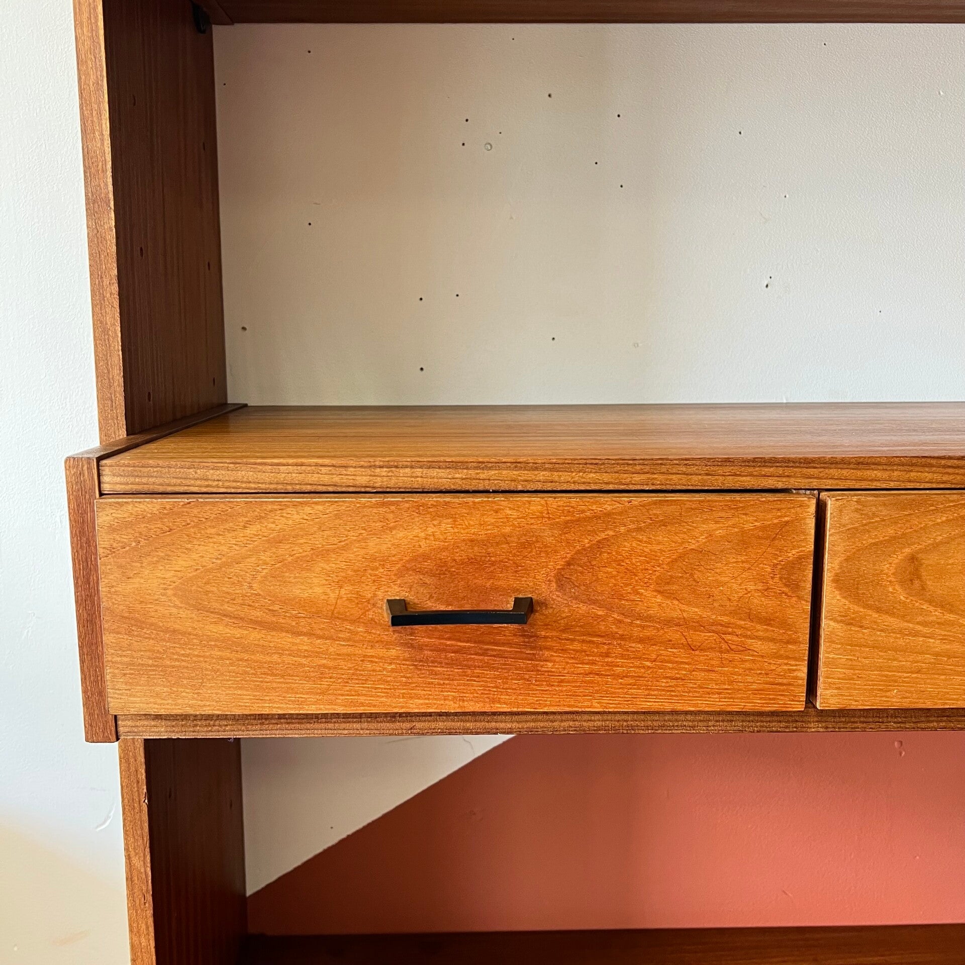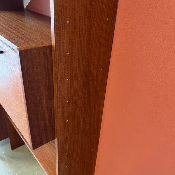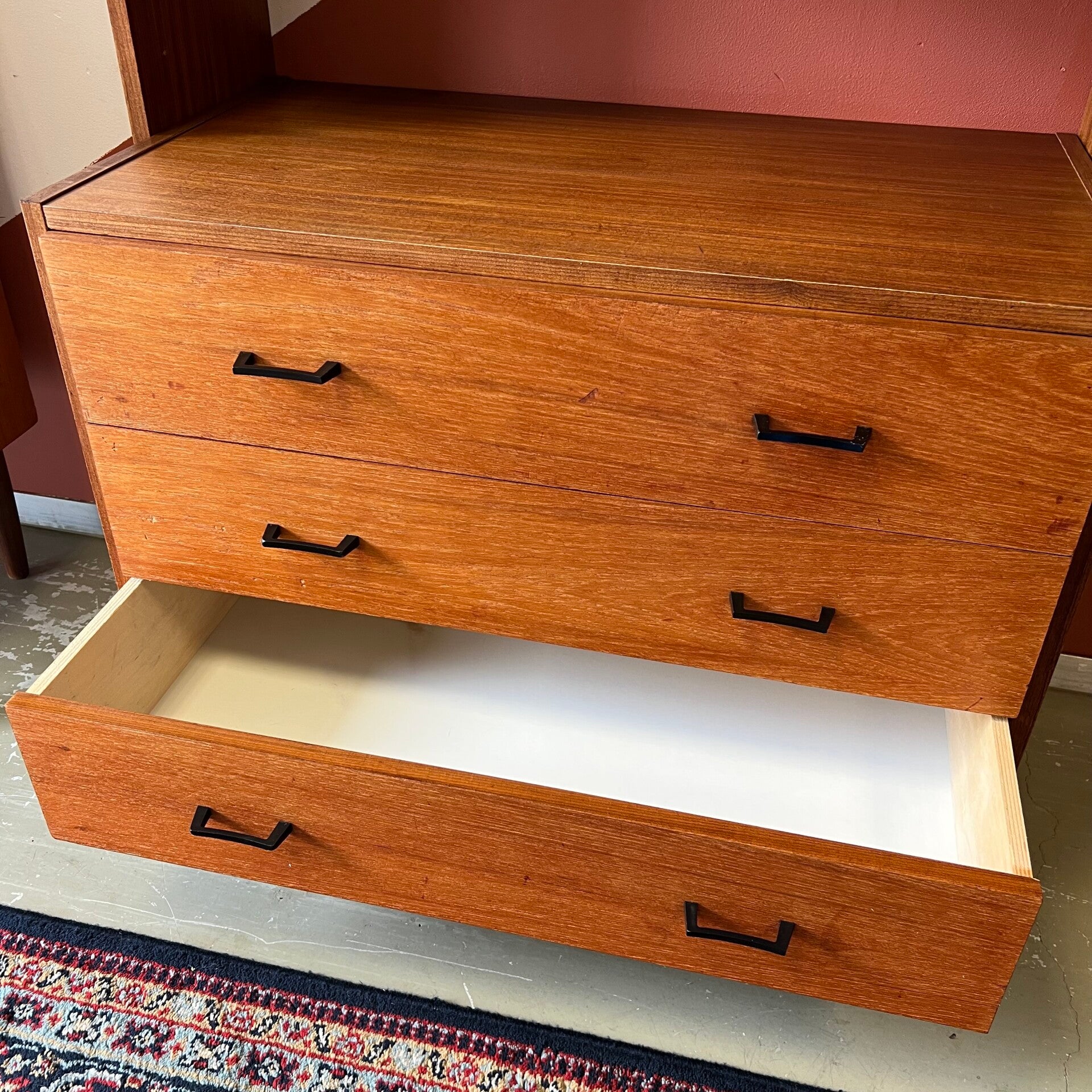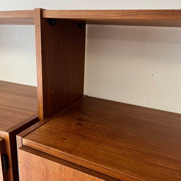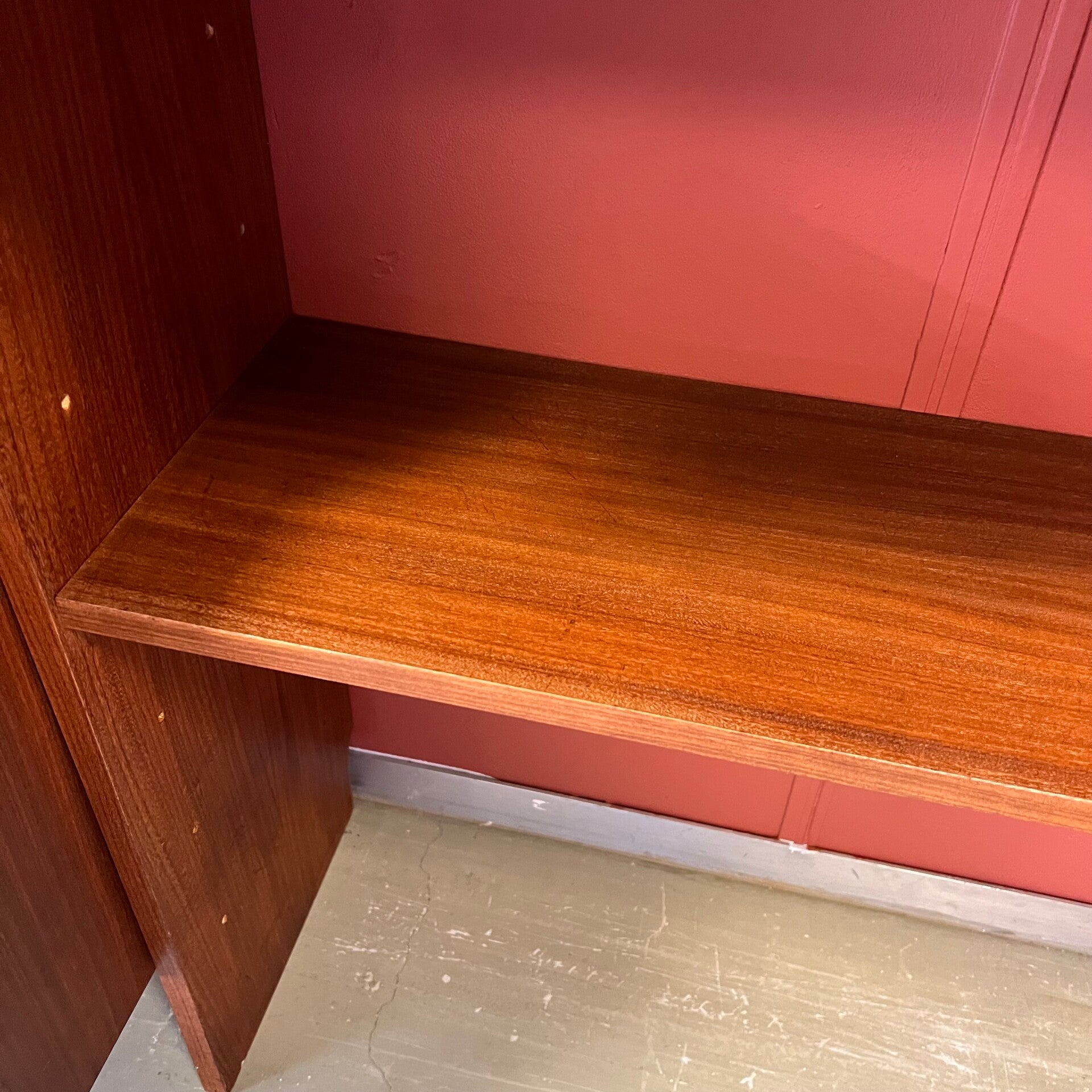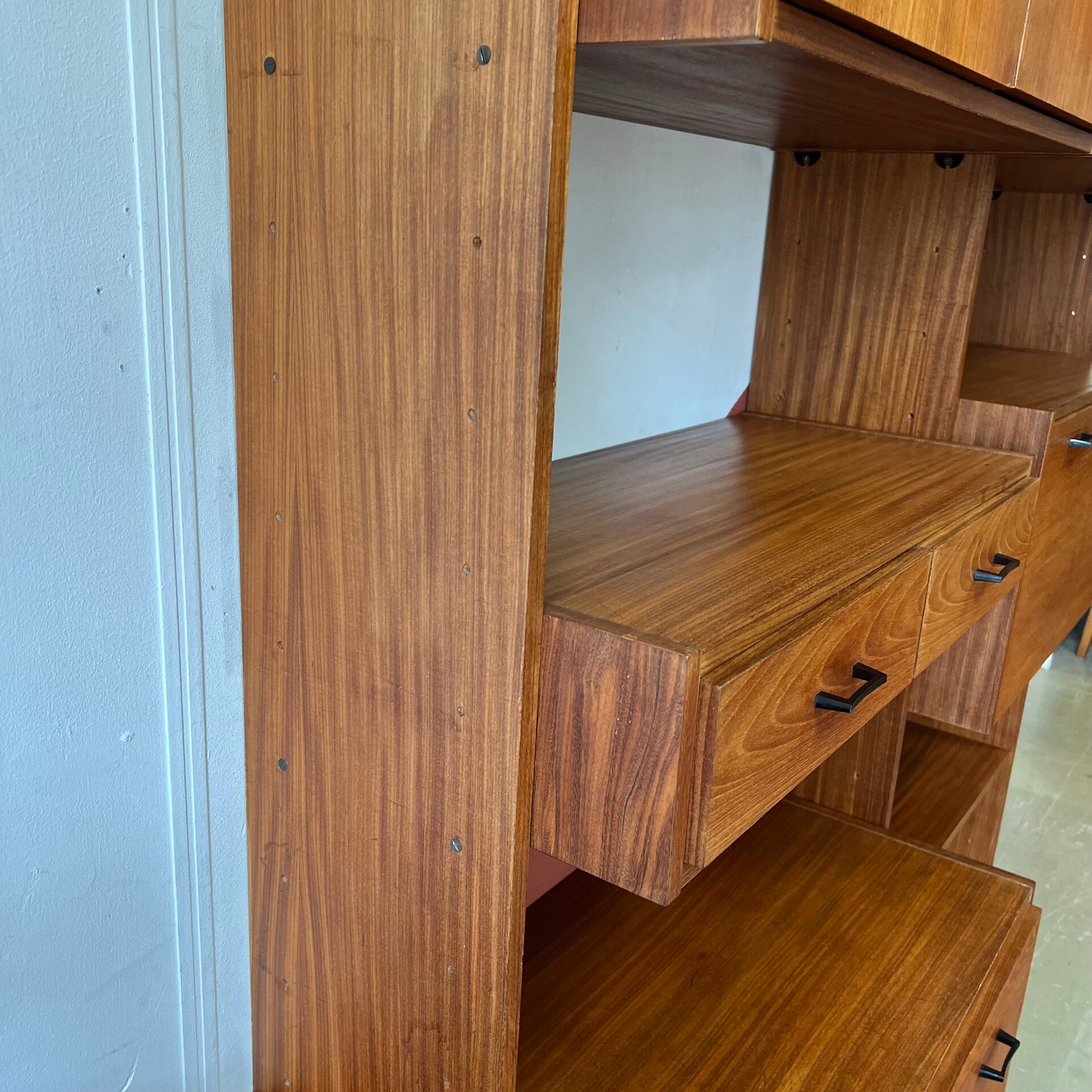 Mooi karakteristiek vintage wandmeubel in teak (fineer) met zwart beslag.