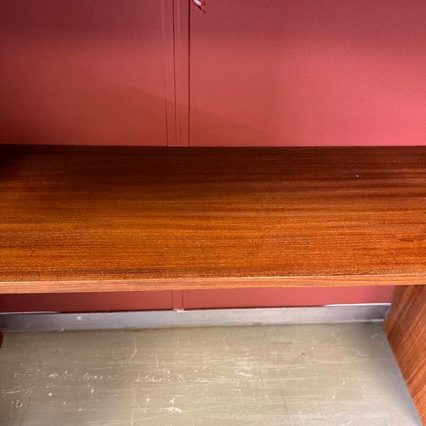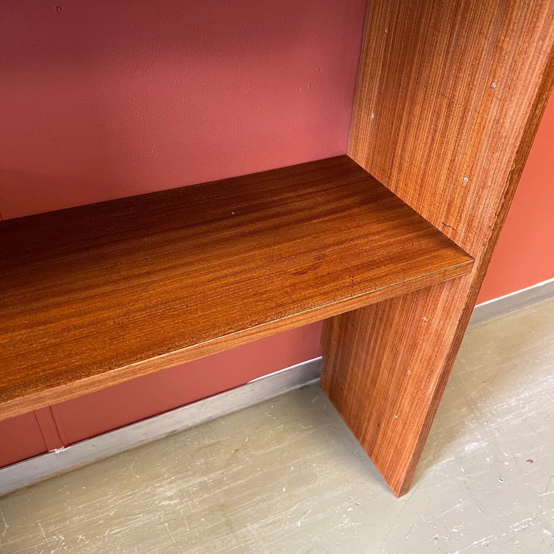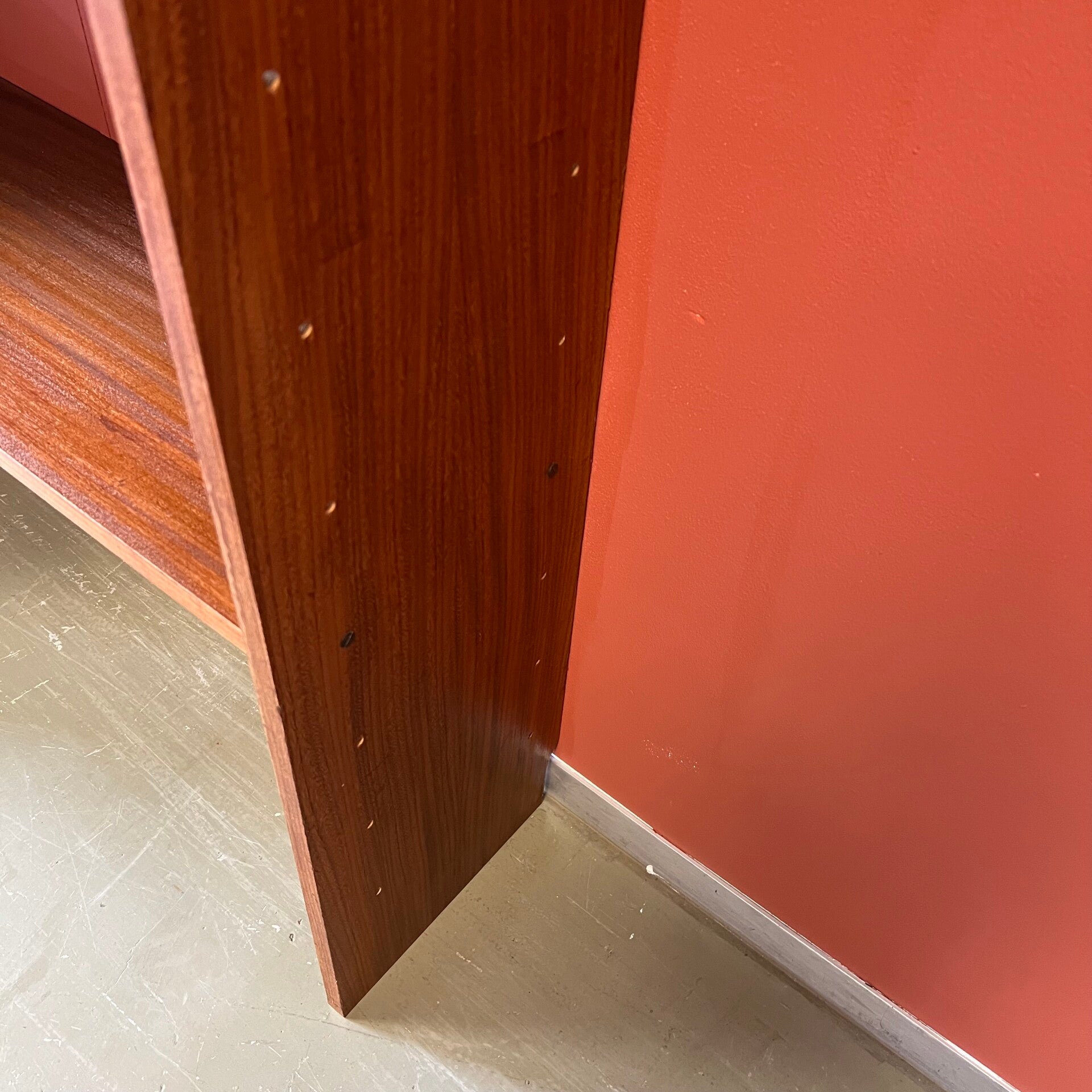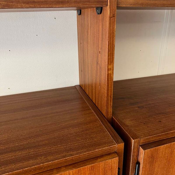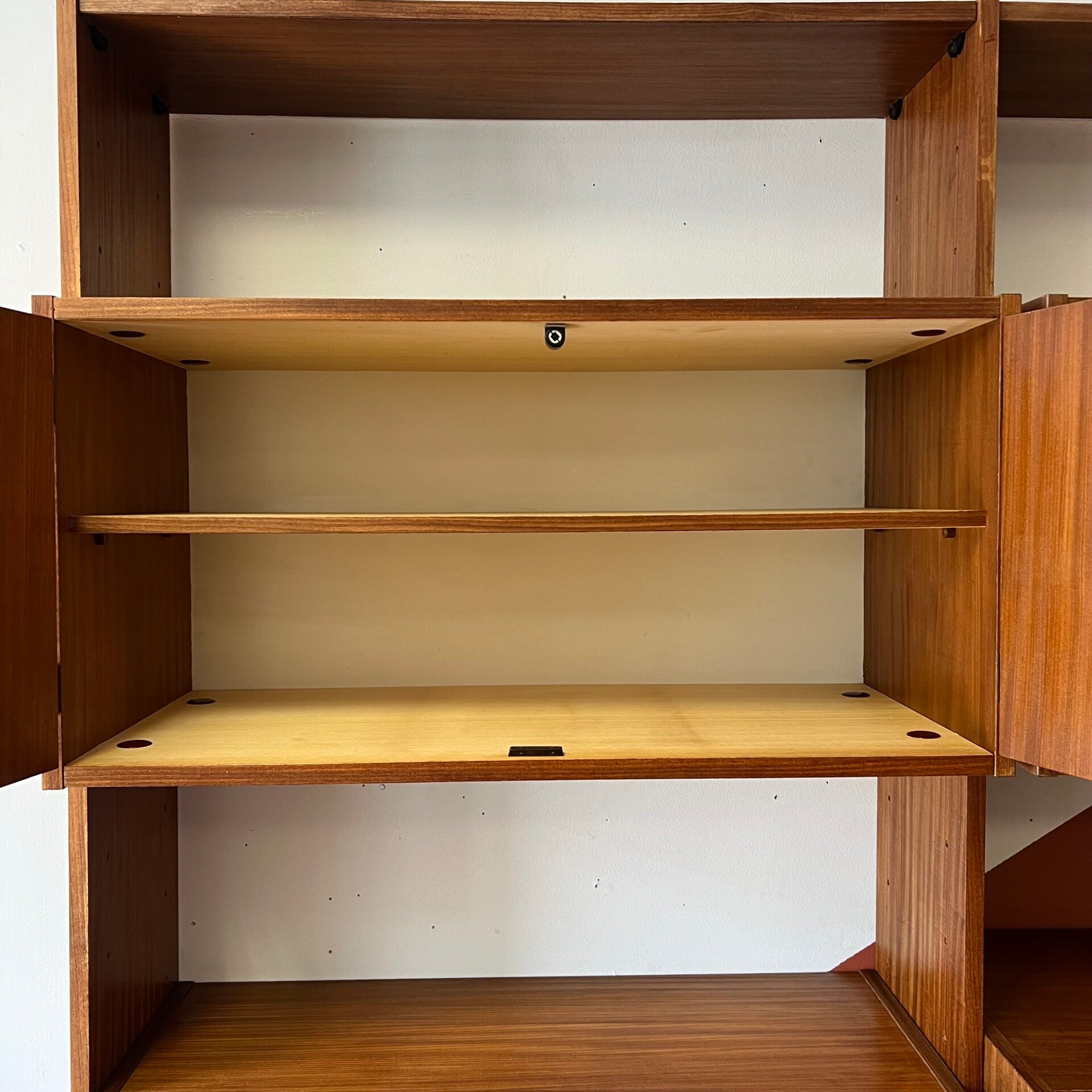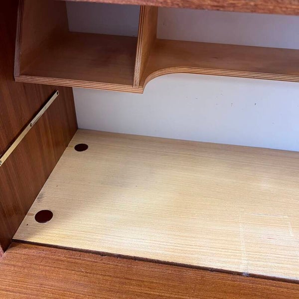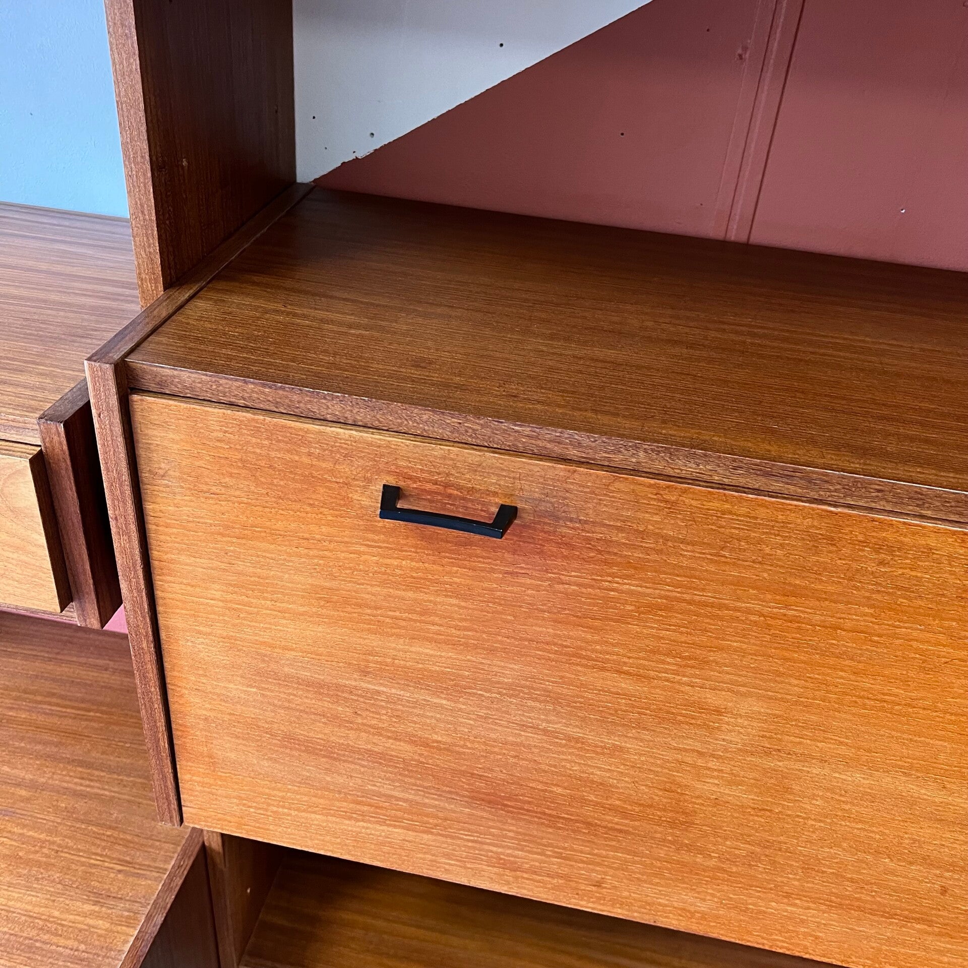 Mooi karakteristiek vintage wandmeubel in teak (fineer) met zwart beslag.