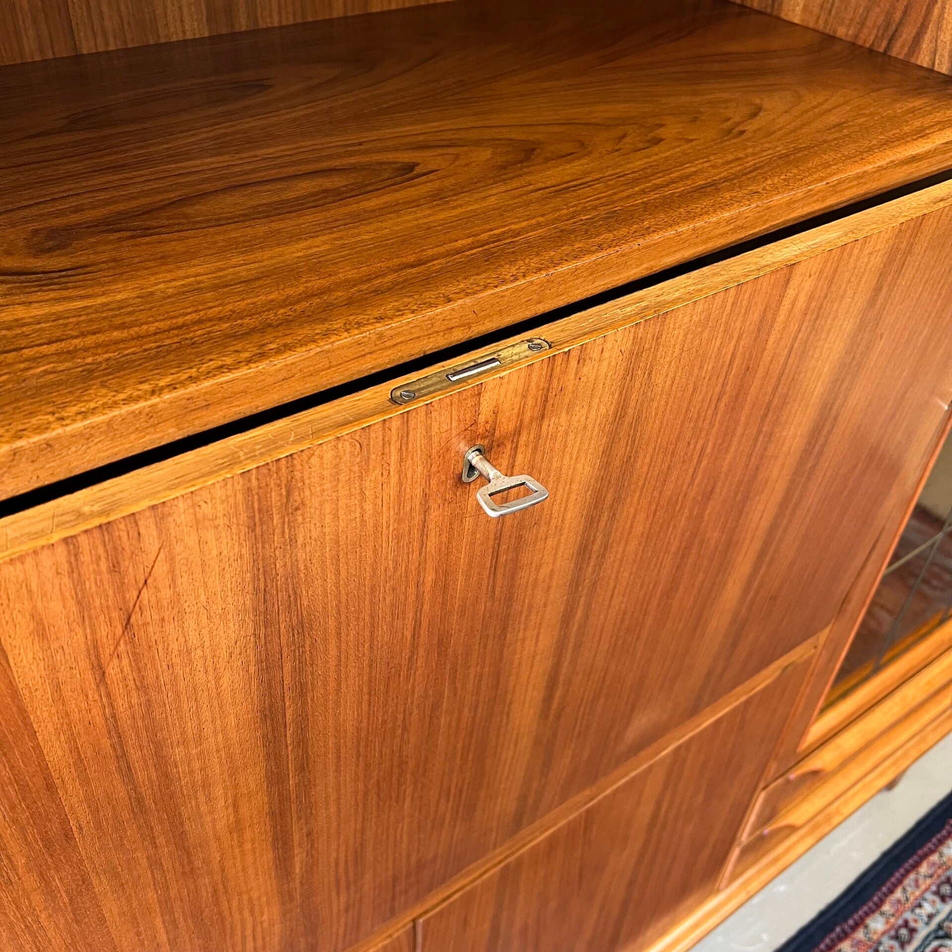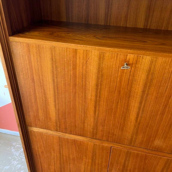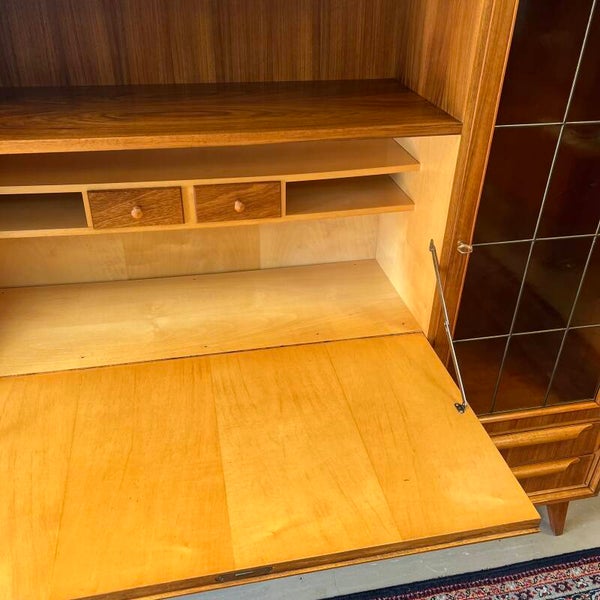 Het meubel heeft linksboven een open ruimte met eronder een klepkast / secretaire met slot (sleutel aanwezig) en vakkenplank met lades.
