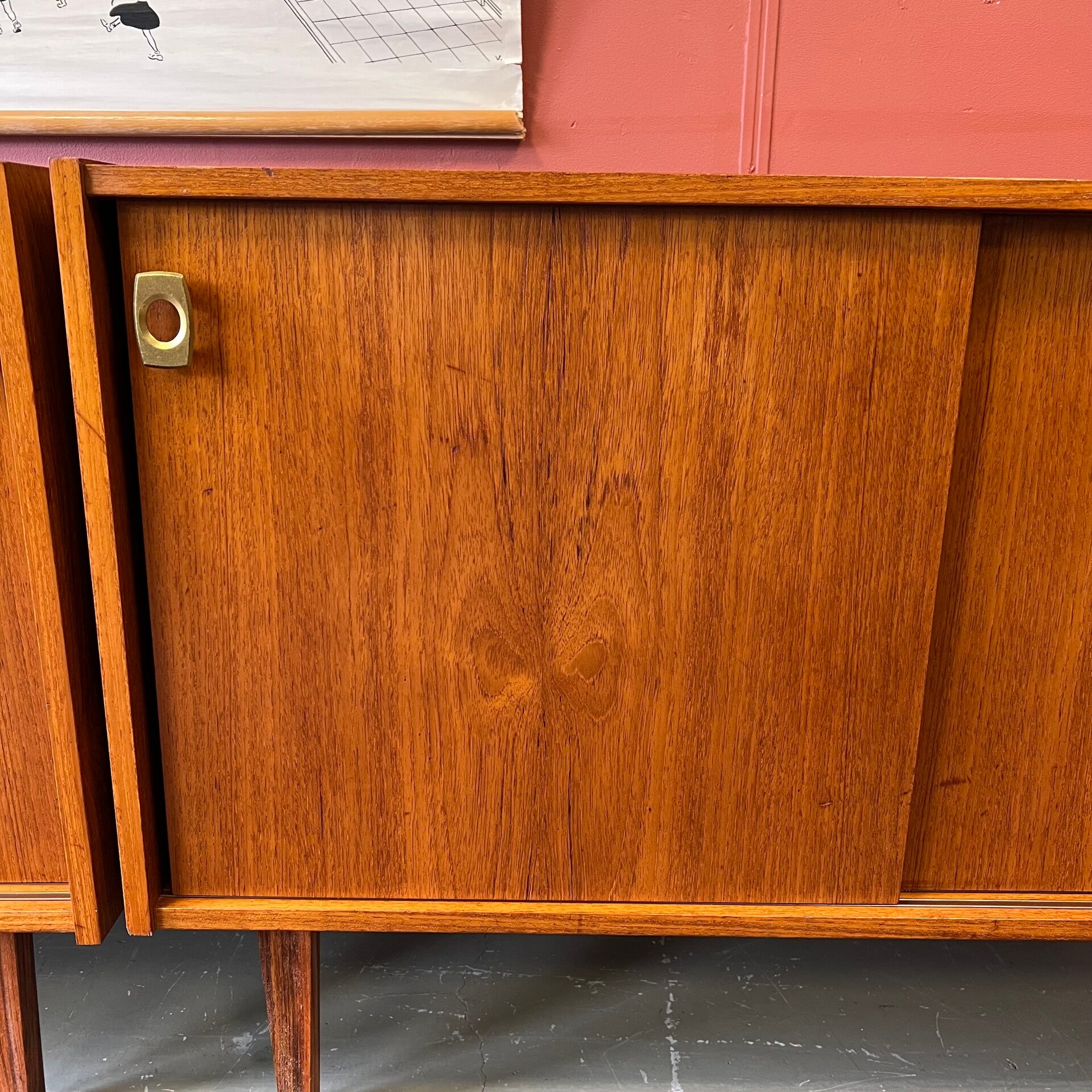 Leuke set van 2 vintage schuifdeurkastjes, uitgevoerd in teak (fineer) met mooi gevormde knoppen en slanke pootjes.
