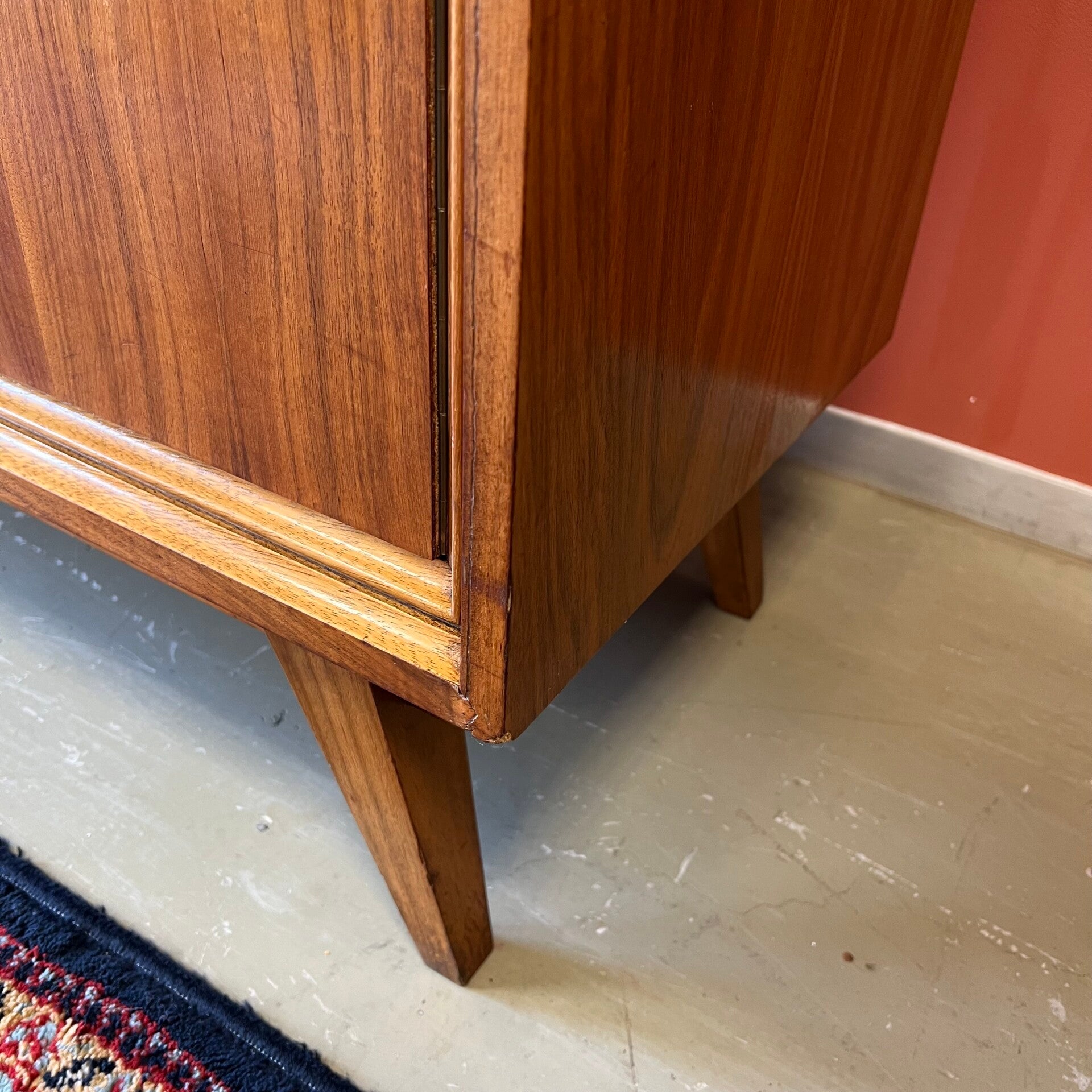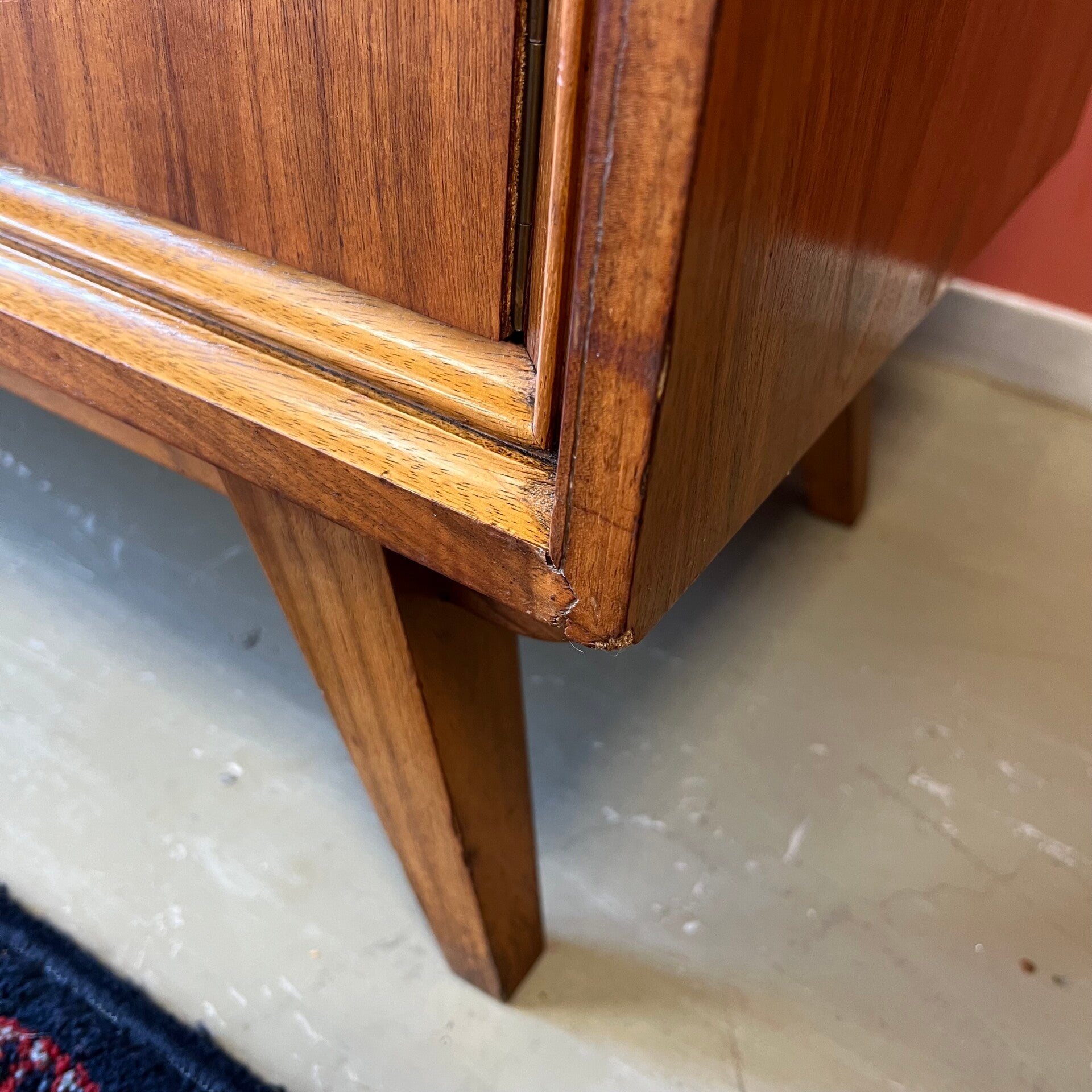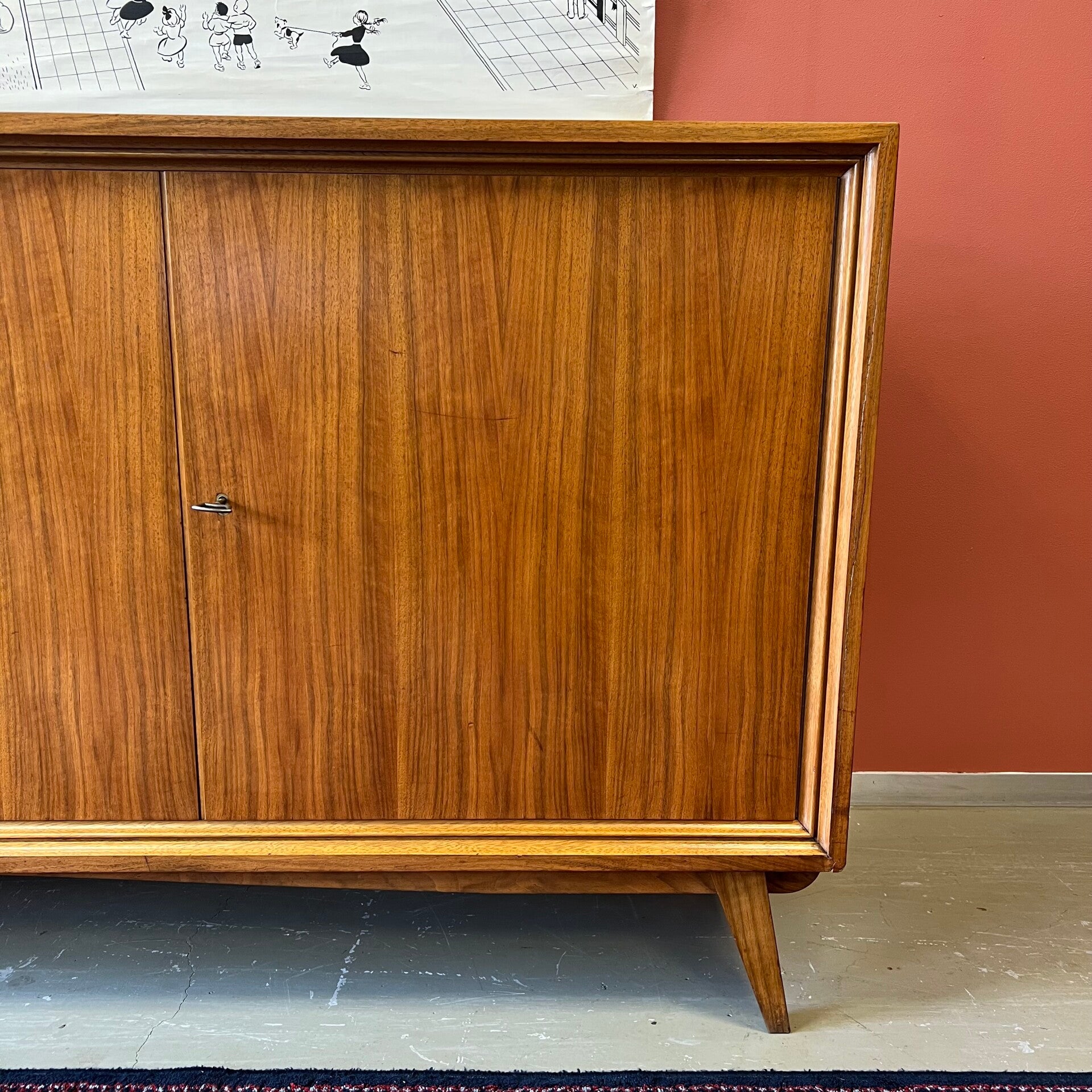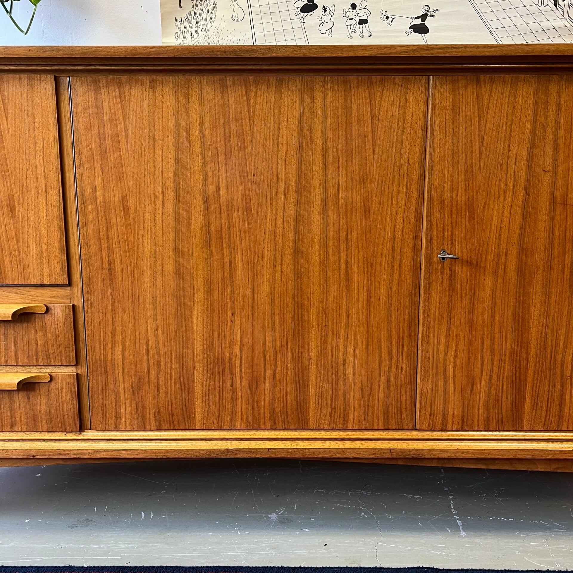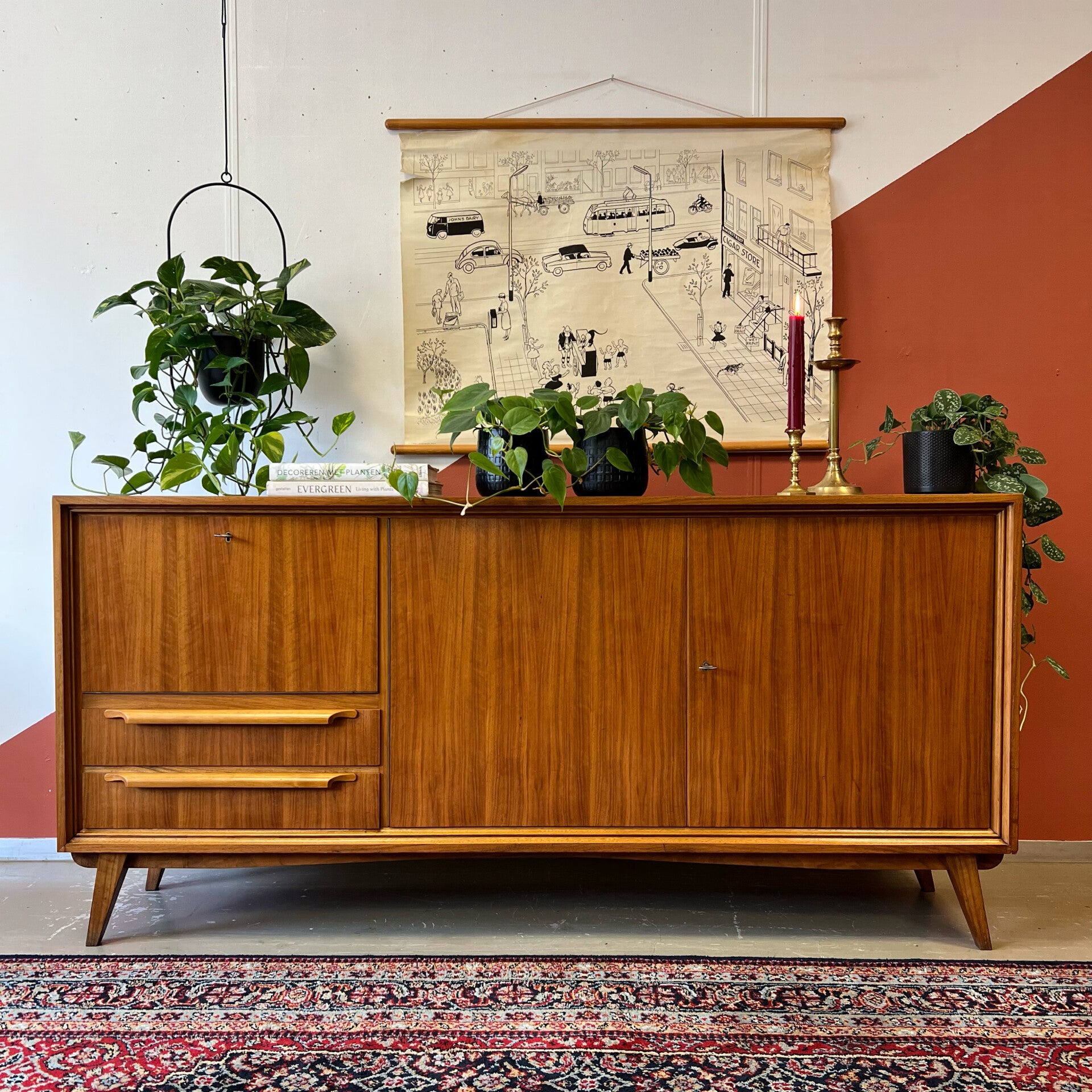Mooi vintage dressoir op schuine pootjes, uitgevoerd in notenhout (fineer).