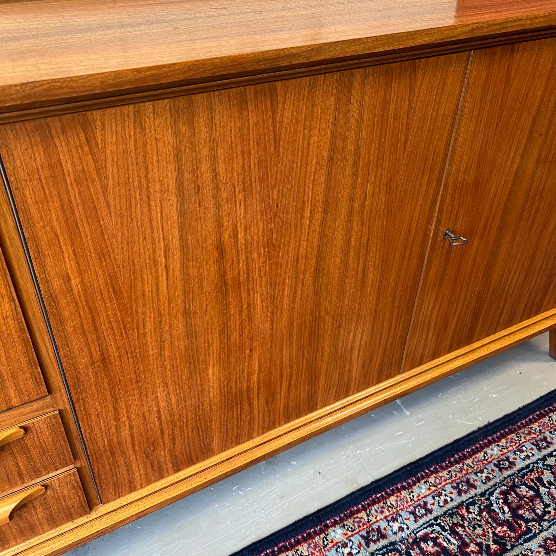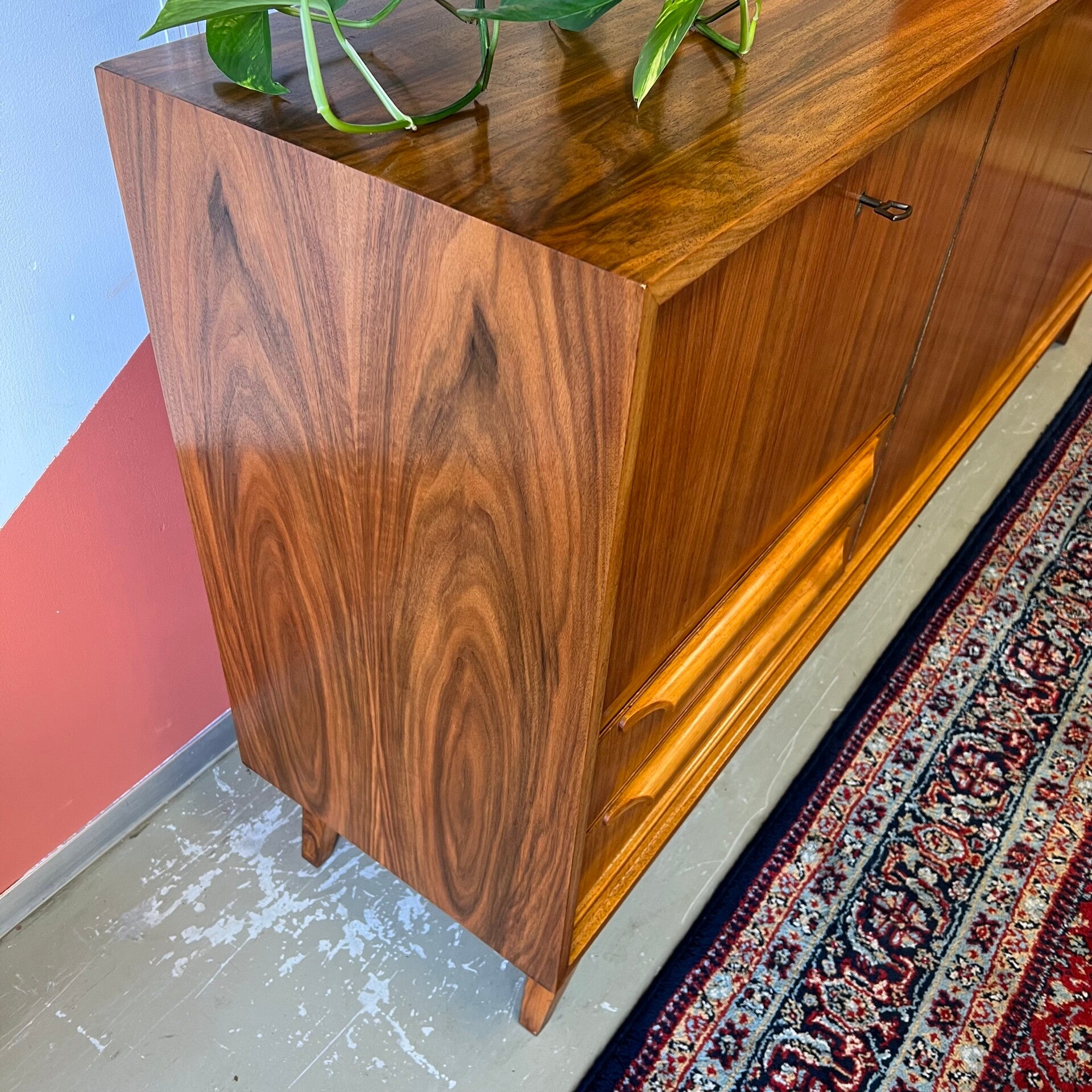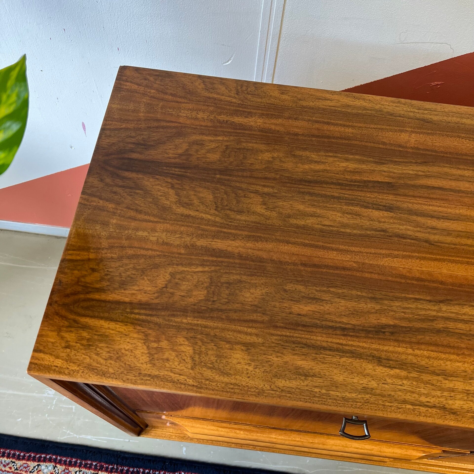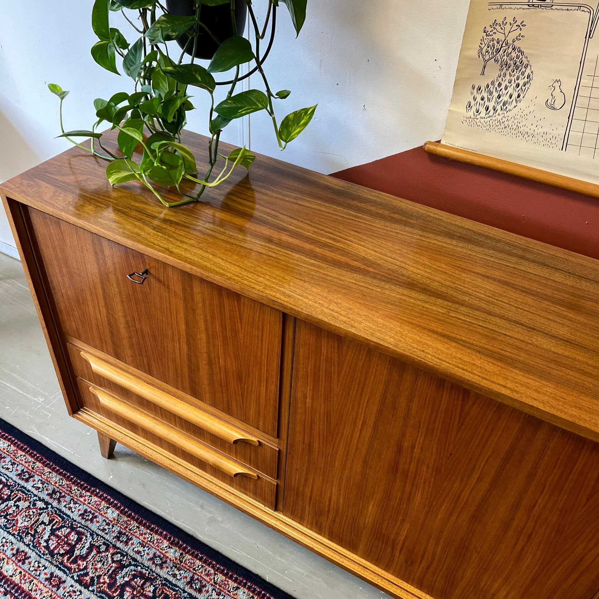 Mooi vintage dressoir op schuine pootjes, uitgevoerd in notenhout (fineer).