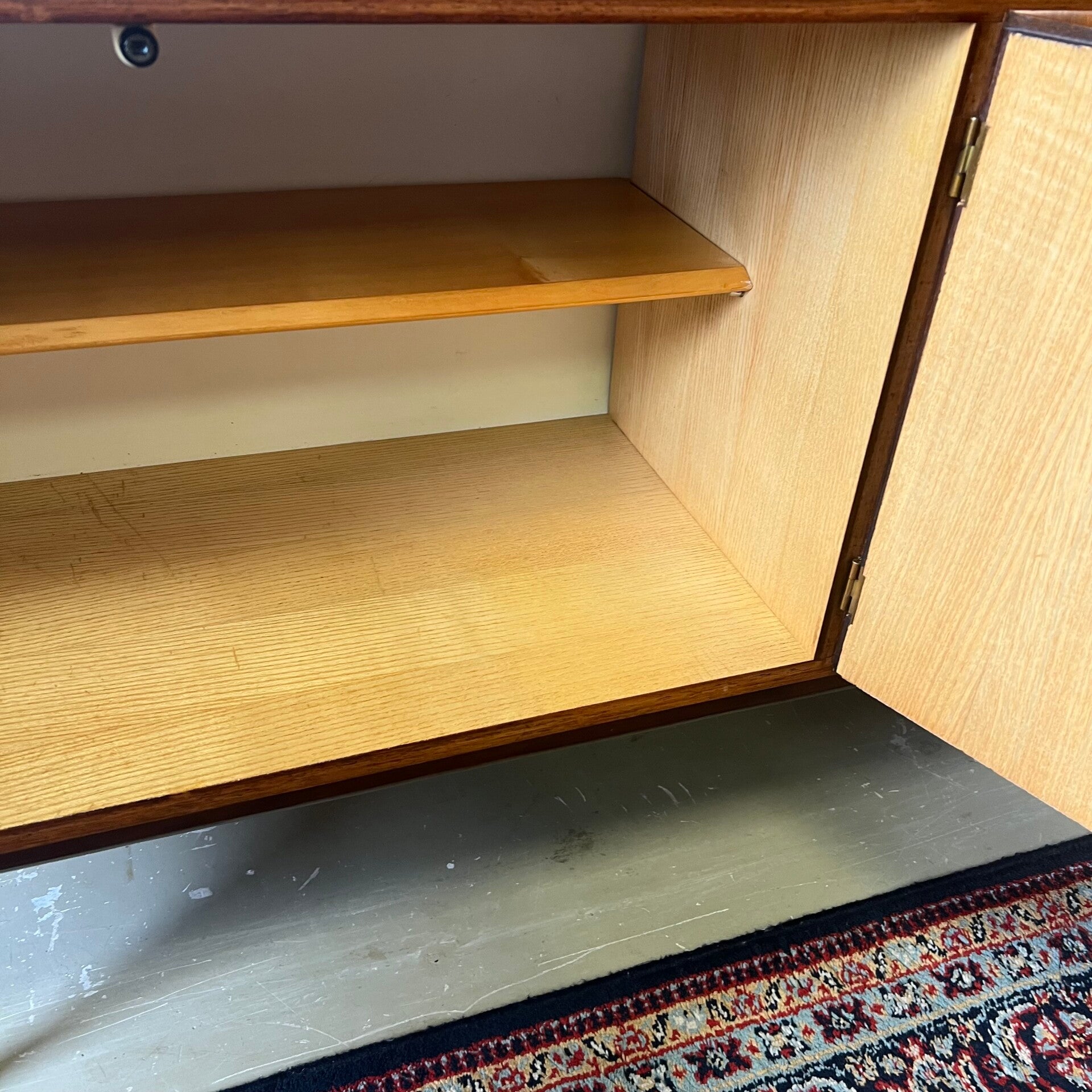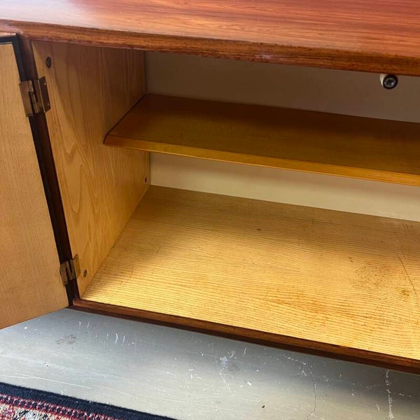 Het meubel heeft links en midden 2 openslaande deuren (magneetsluiting) met uitneembare plank (niet origineel) en messing scharnieren.