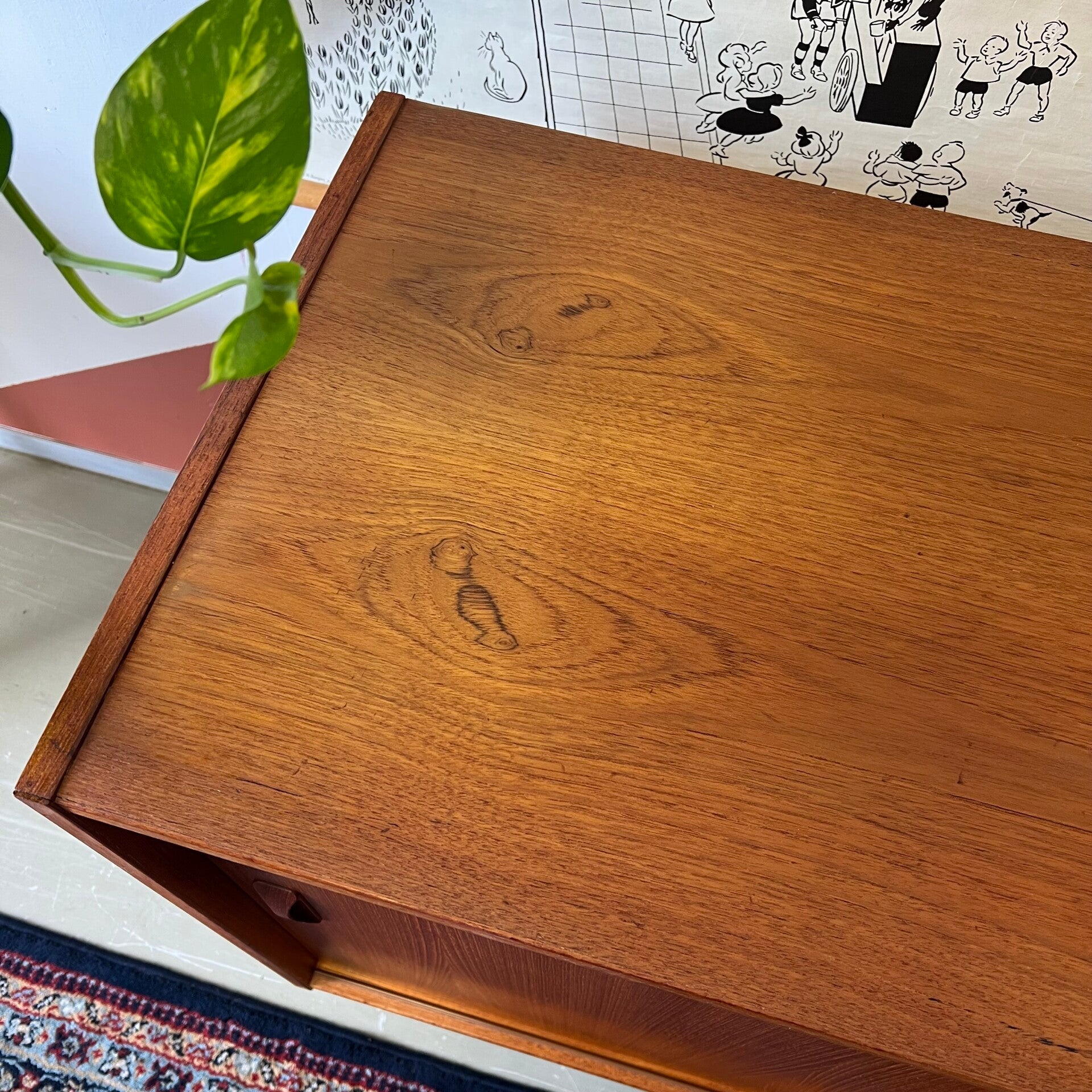 Uitgevoerd in teak (fineer) met organisch gevormde handgrepen en slanke pootjes (later toegevoegd).
