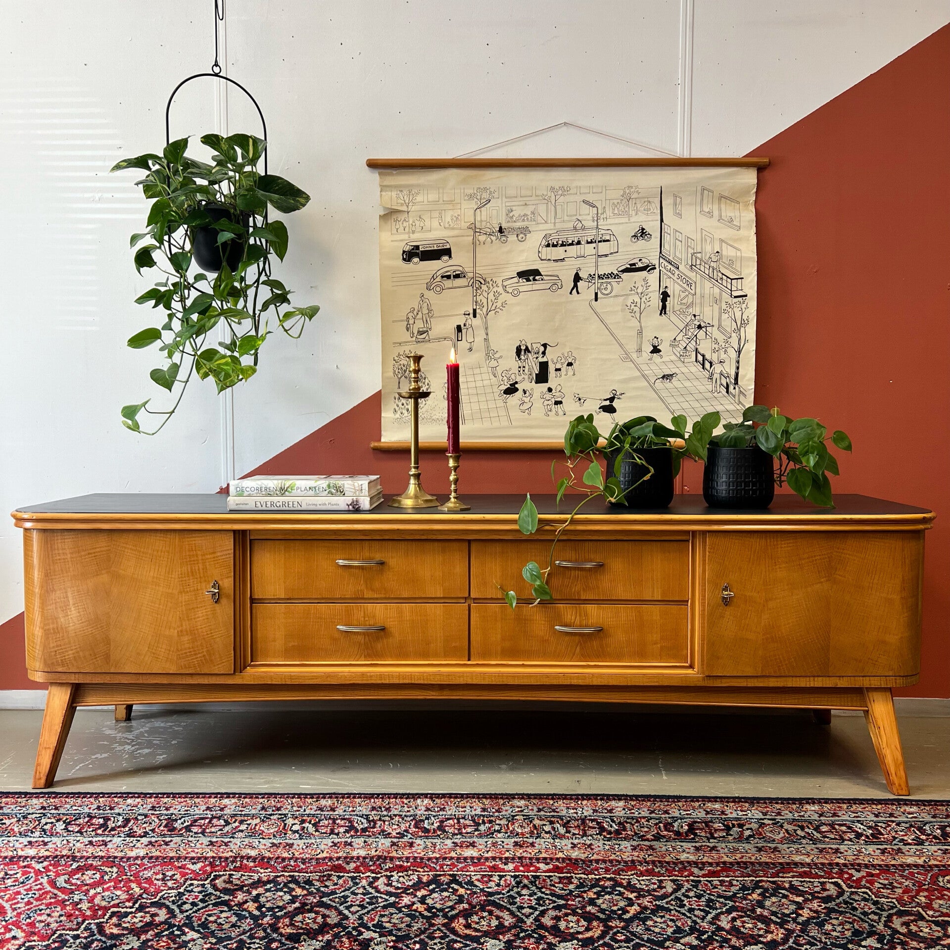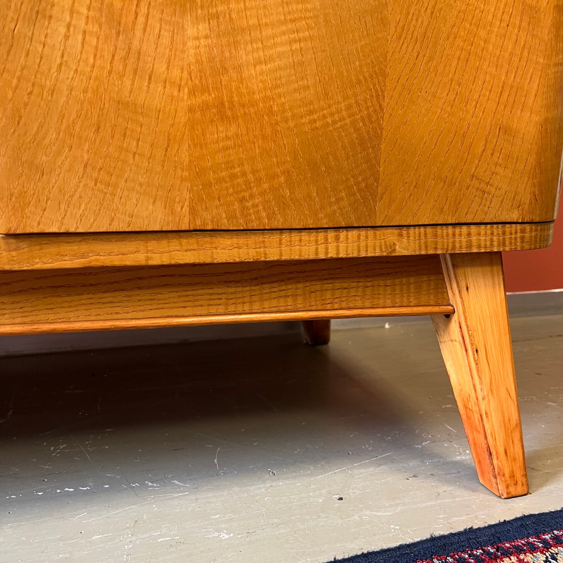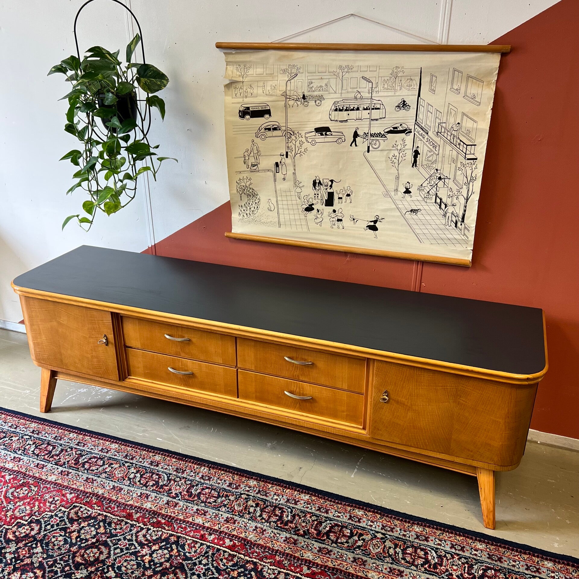 Prachtig en uniek vintage dressoir, lowboard of sideboard op schuine poten.