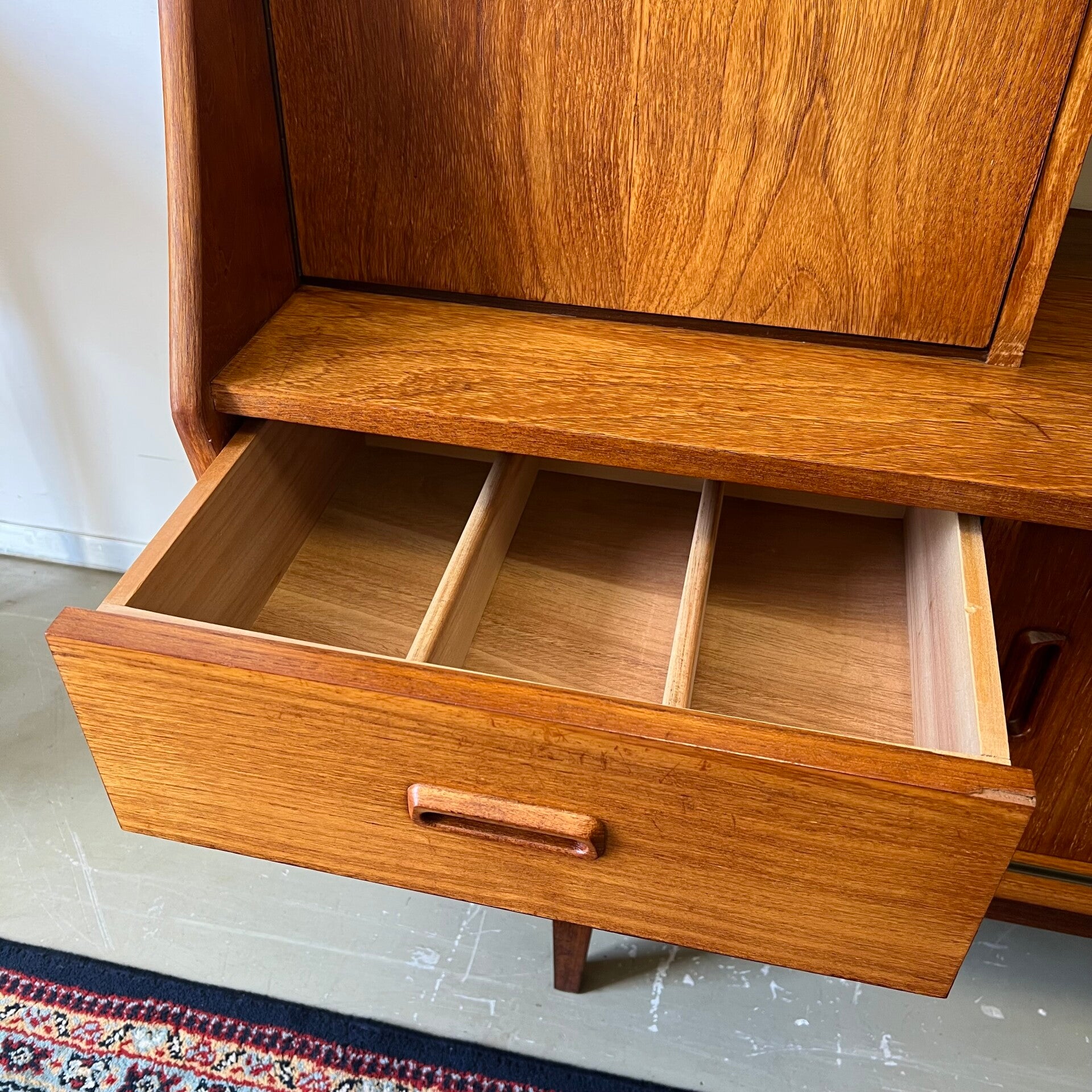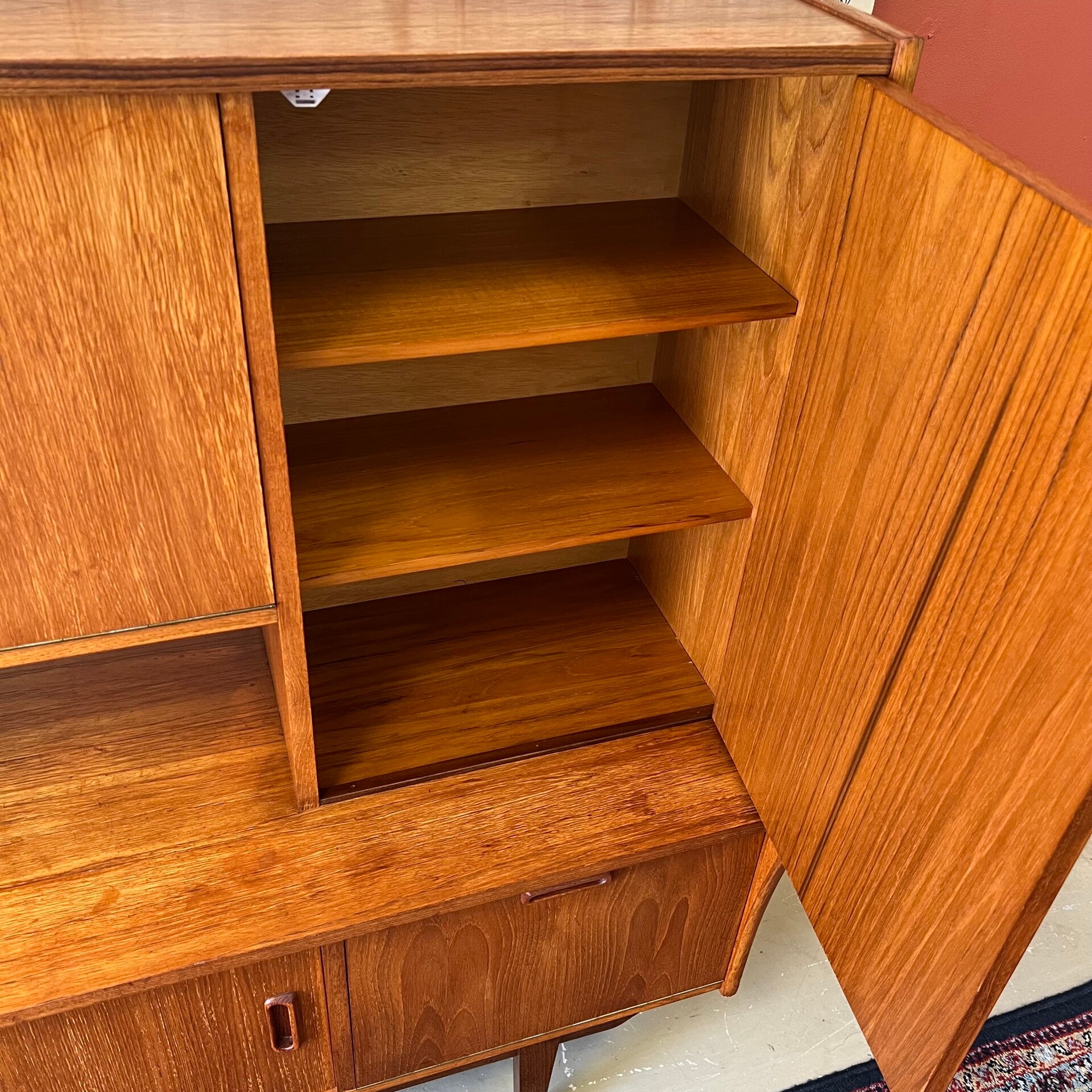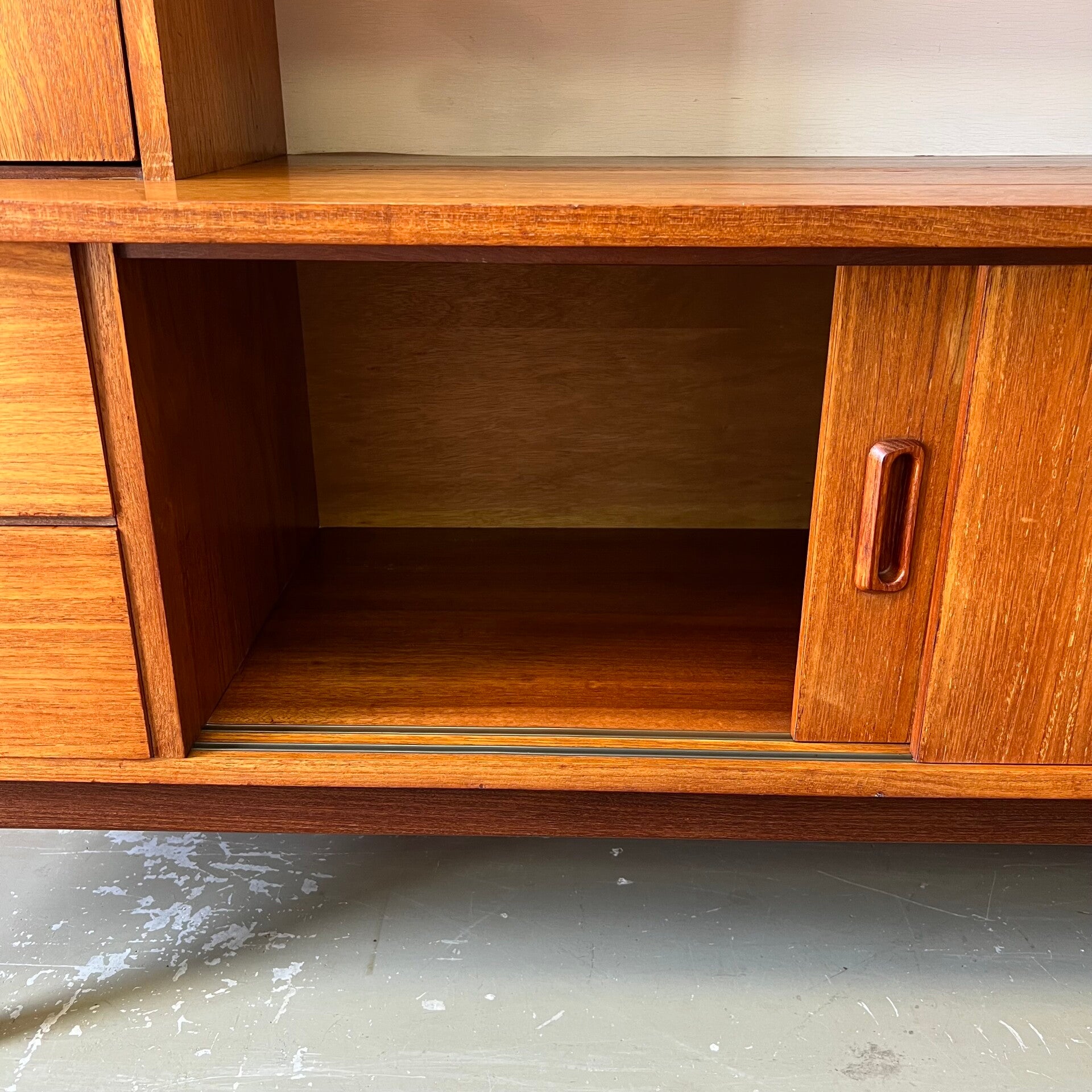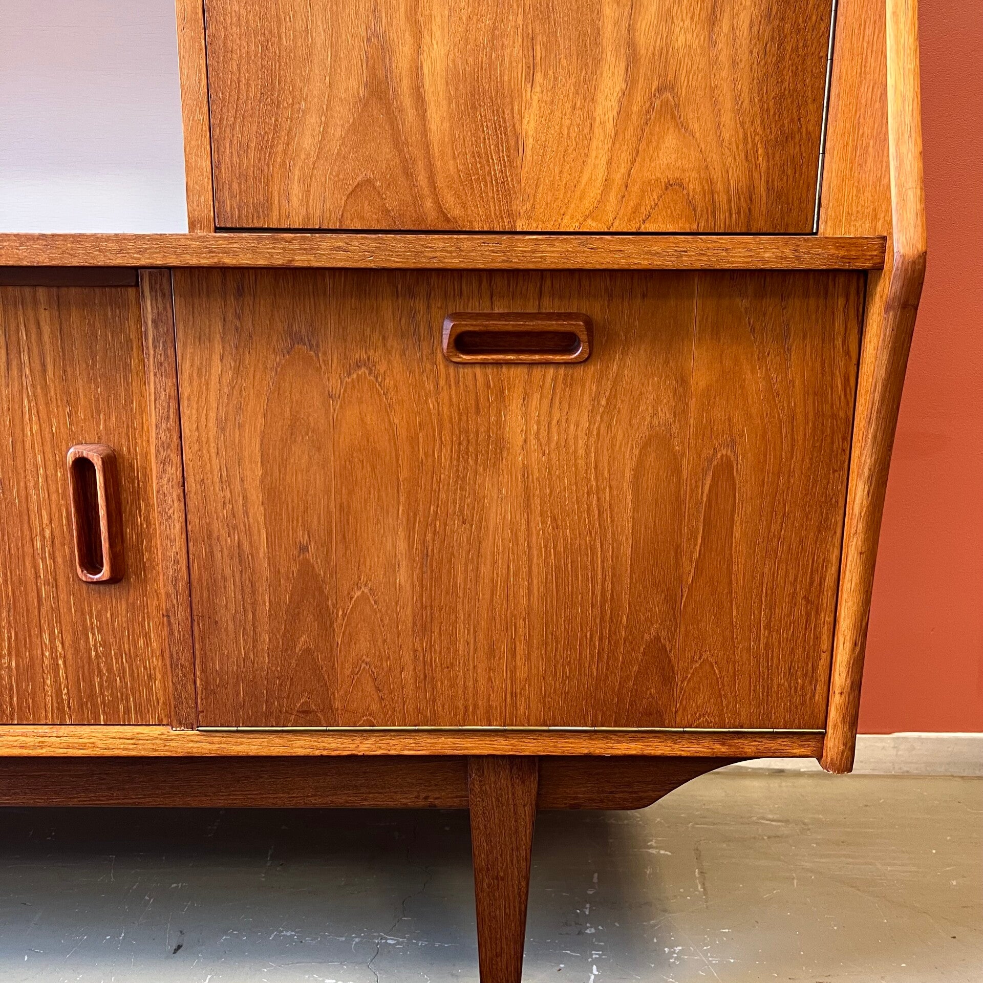 Mooie vintage buffetkast of highboard, uitgevoerd in teak (fineer).