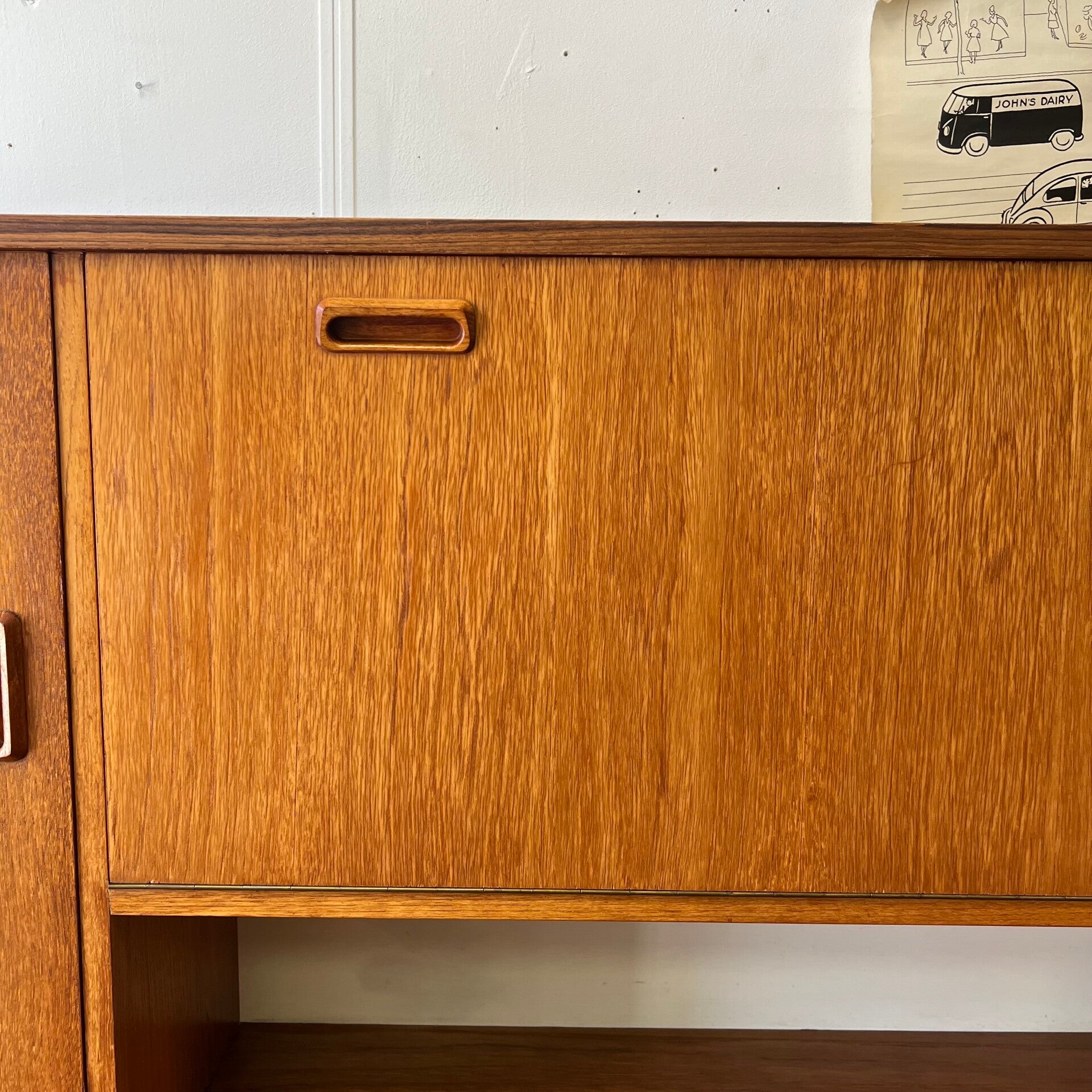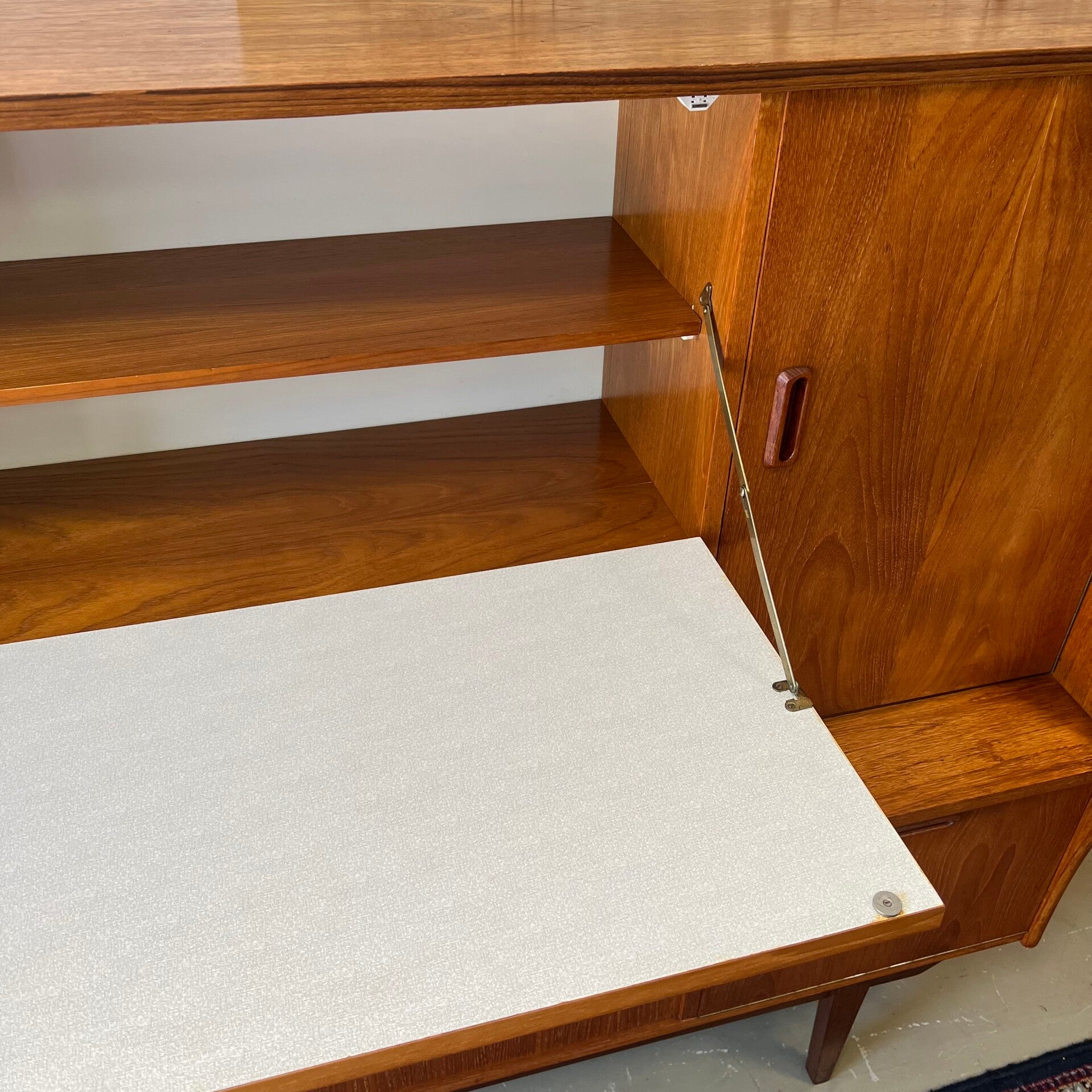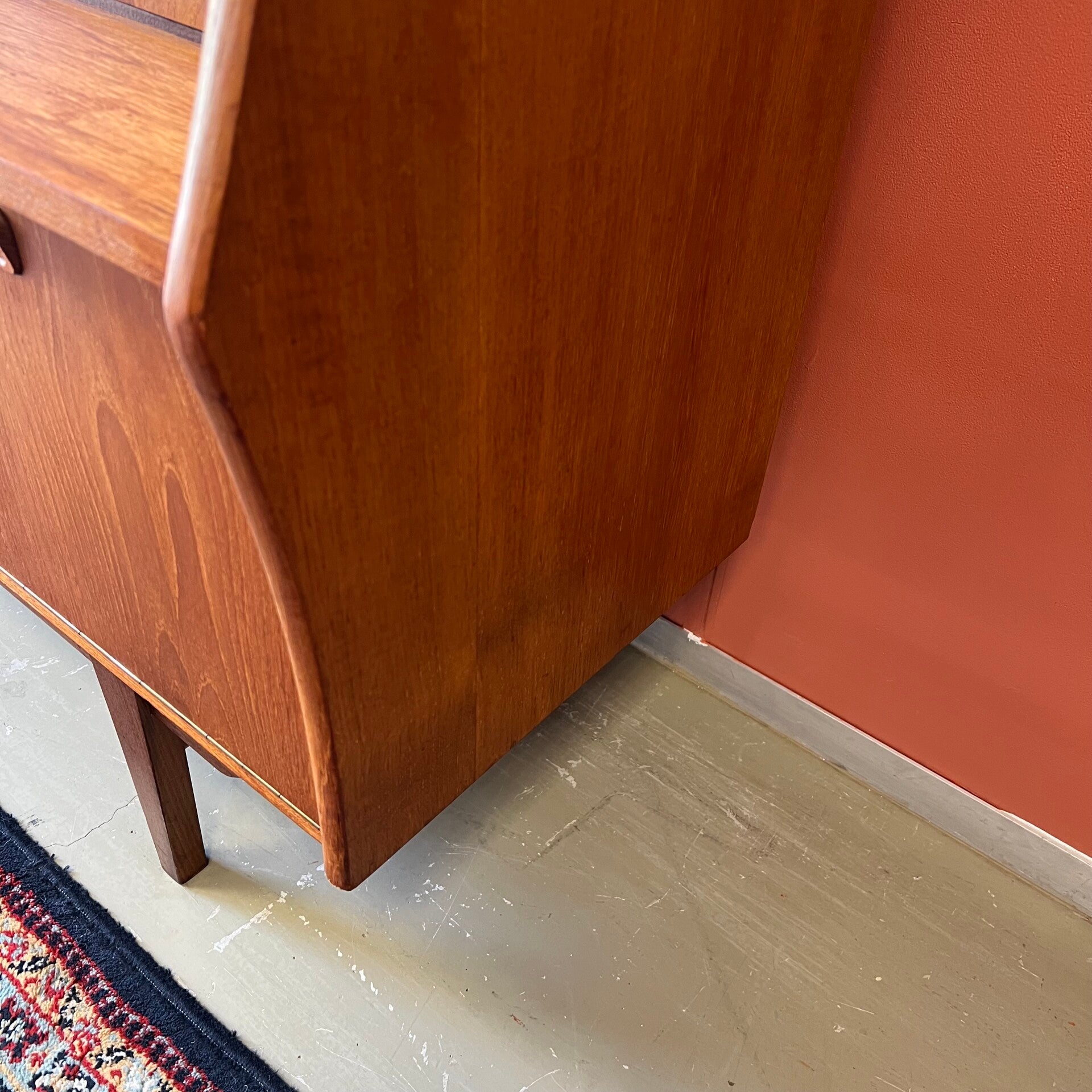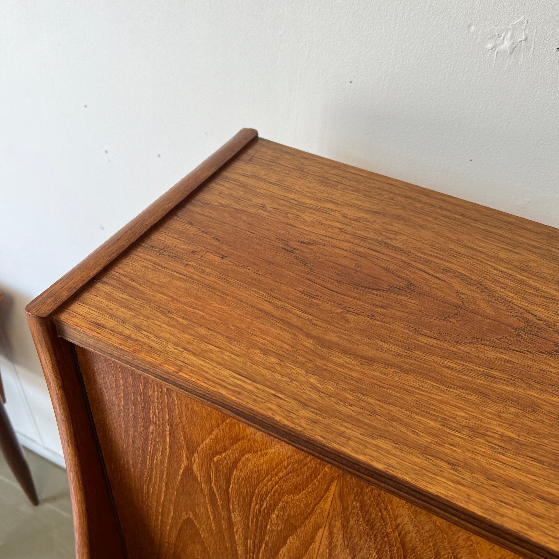 Mooie vintage buffetkast of highboard, uitgevoerd in teak (fineer).