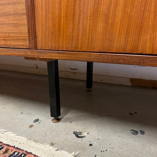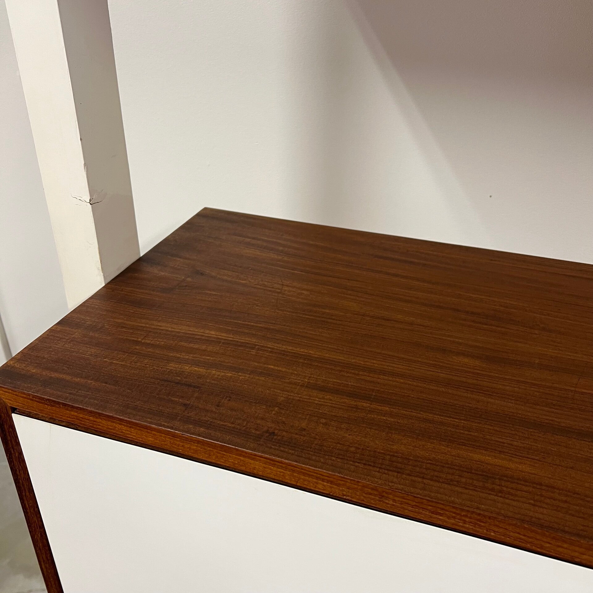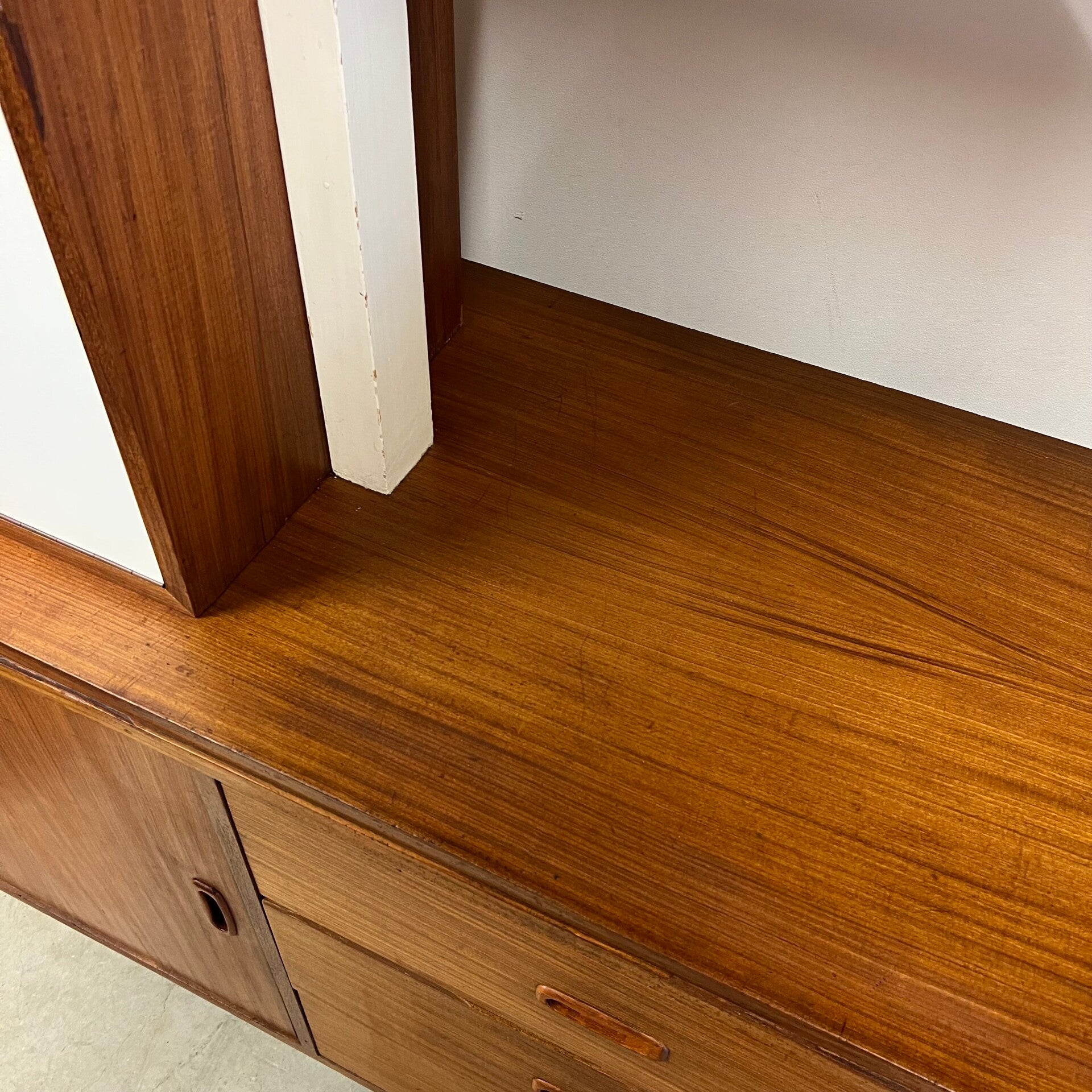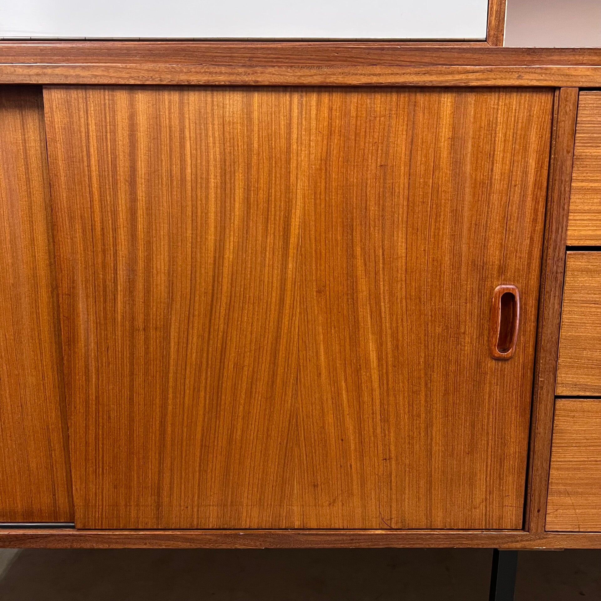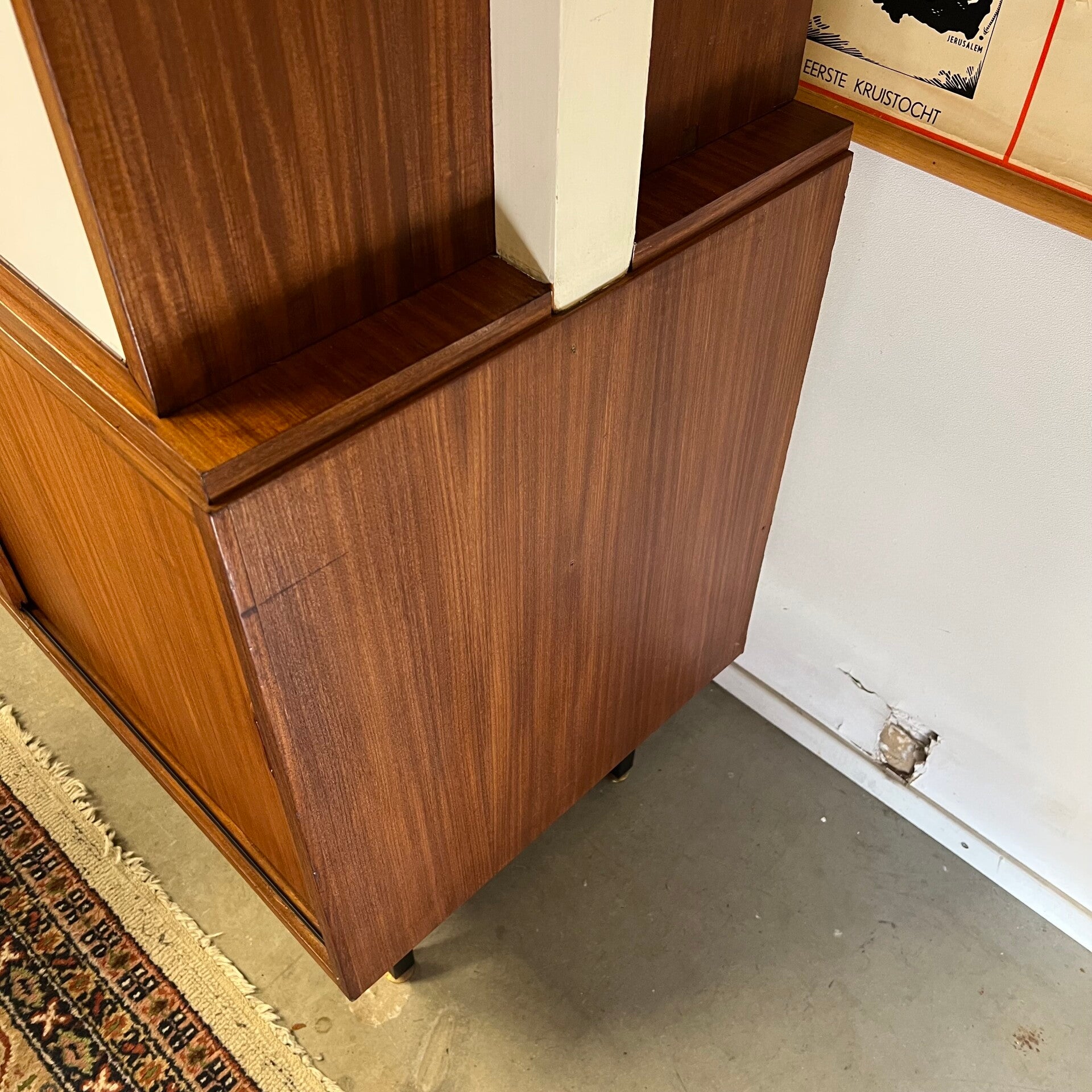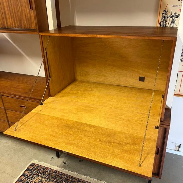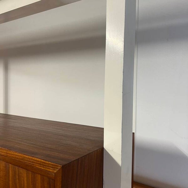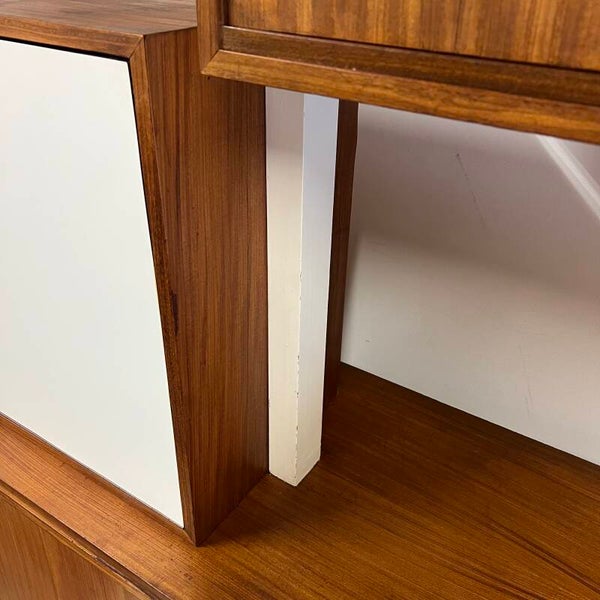 Geweldig imposant XL wandmeubel, uitgevoerd in teak fineer met zwart metalen pootjes, stelvoetjes en wit gelakte staanders.