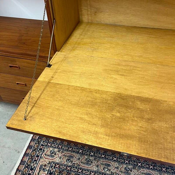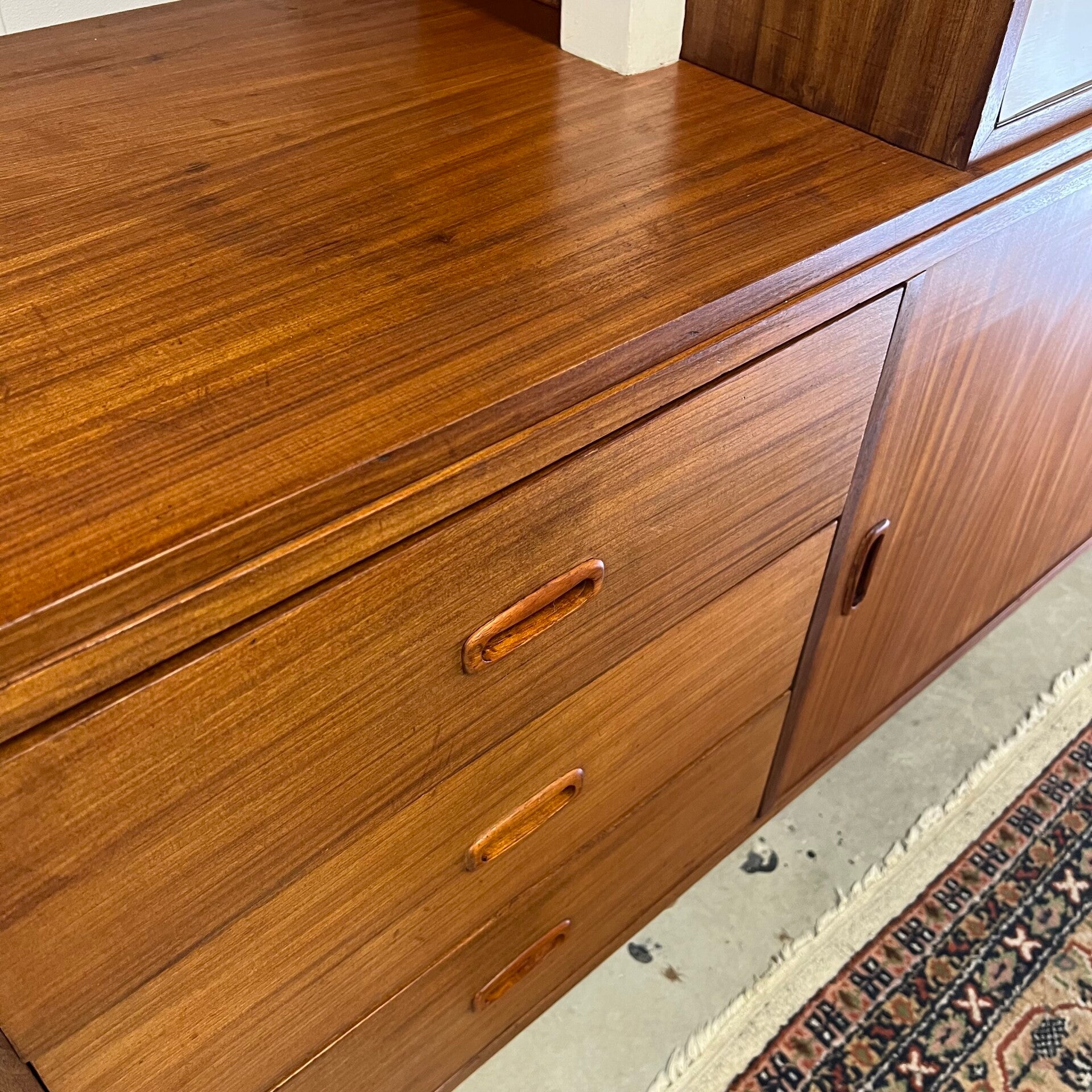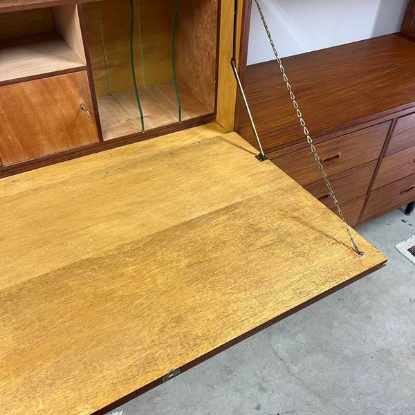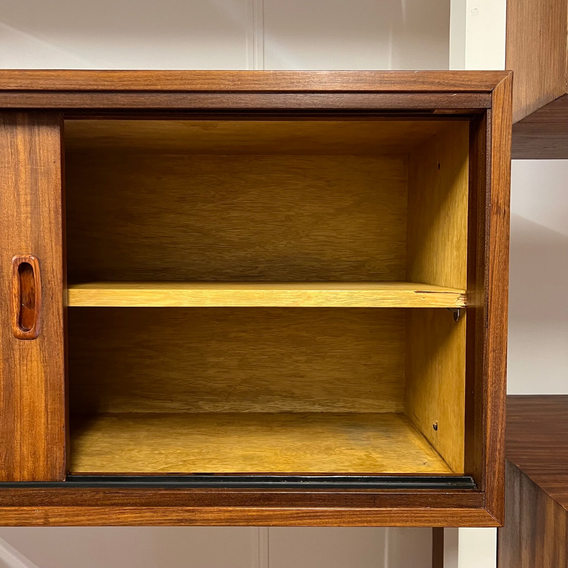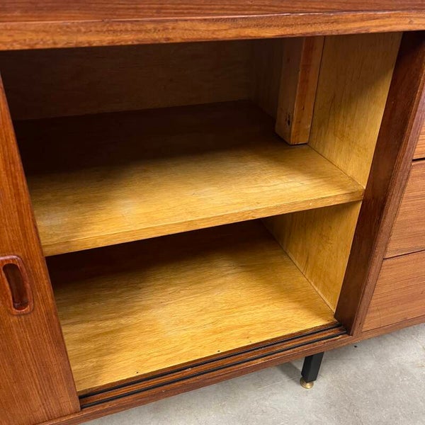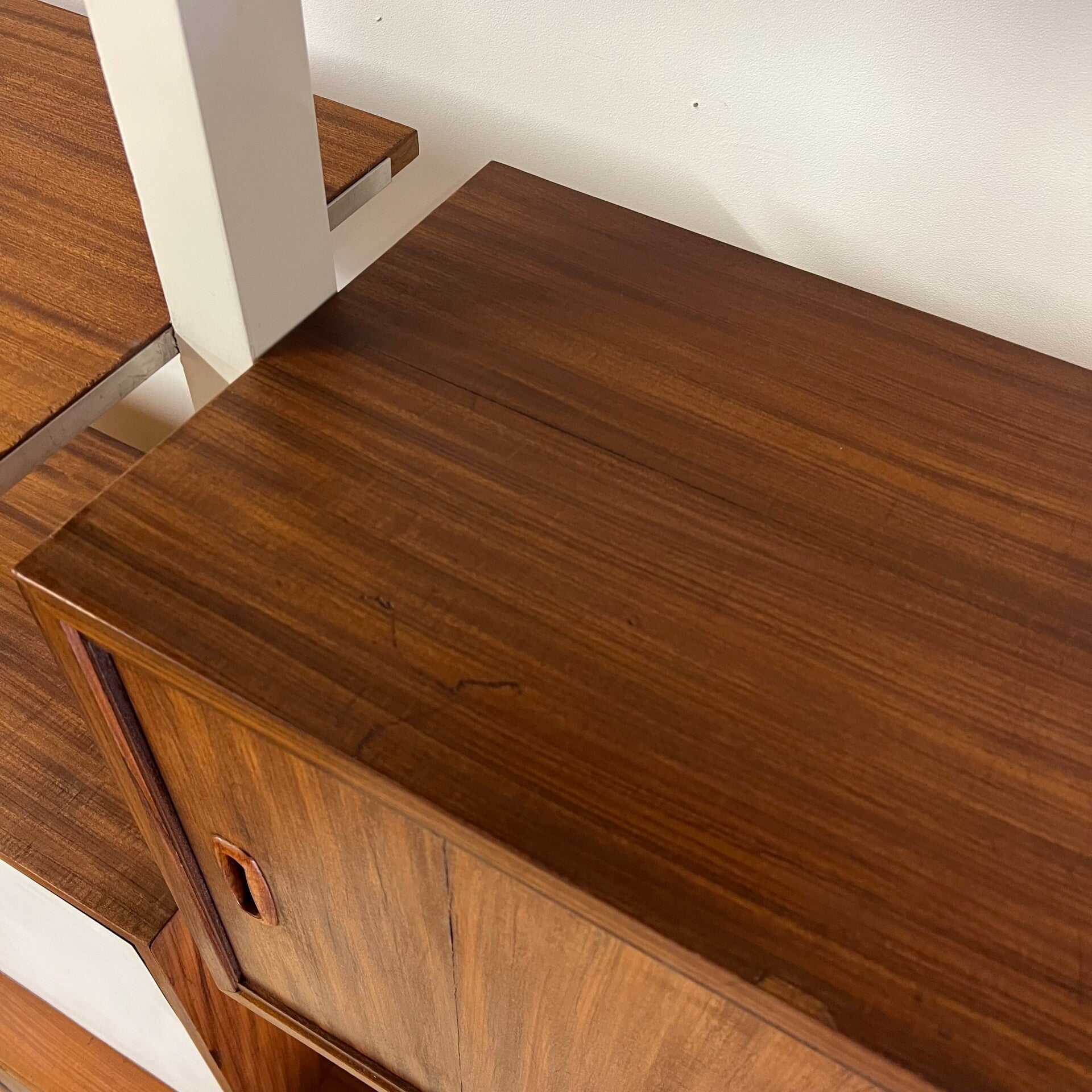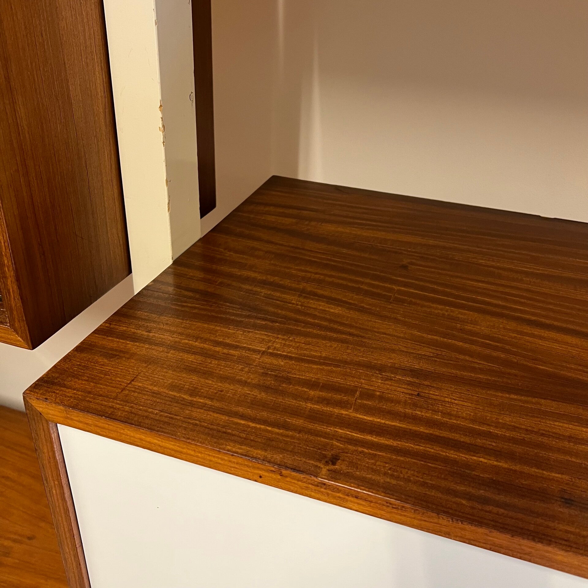 Geweldig imposant XL wandmeubel, uitgevoerd in teak fineer met zwart metalen pootjes, stelvoetjes en wit gelakte staanders.