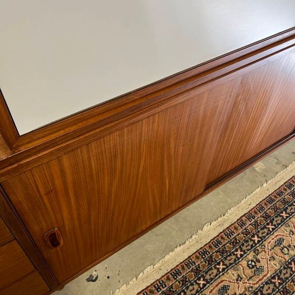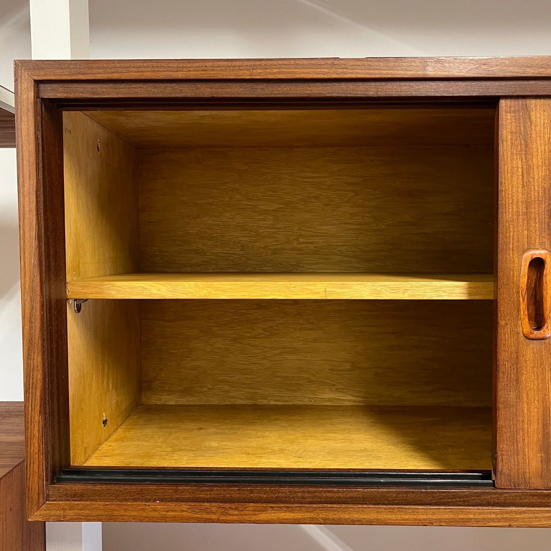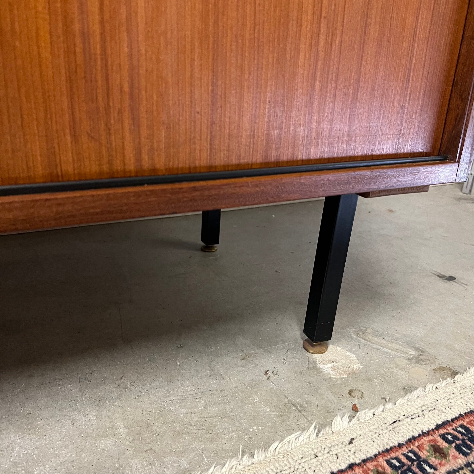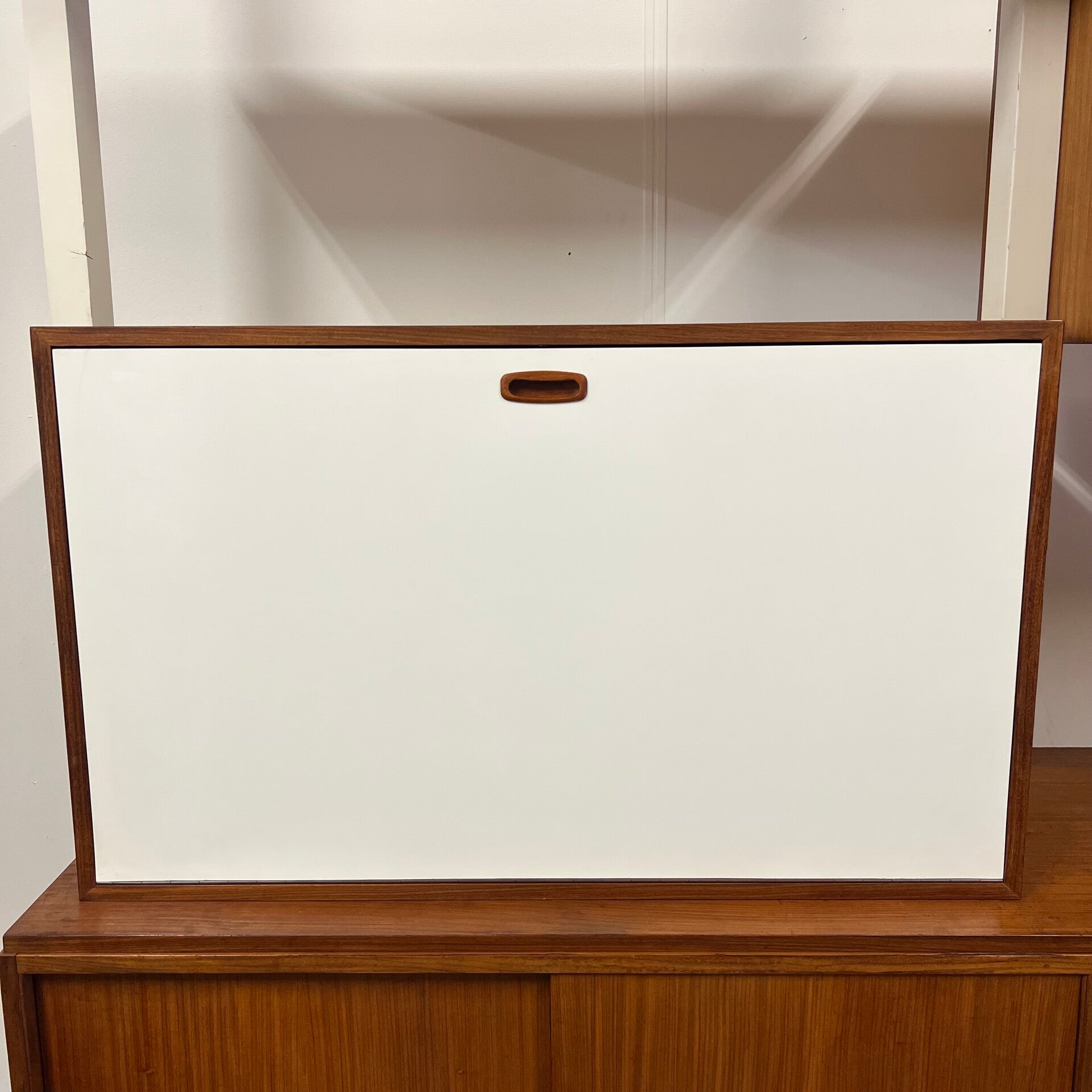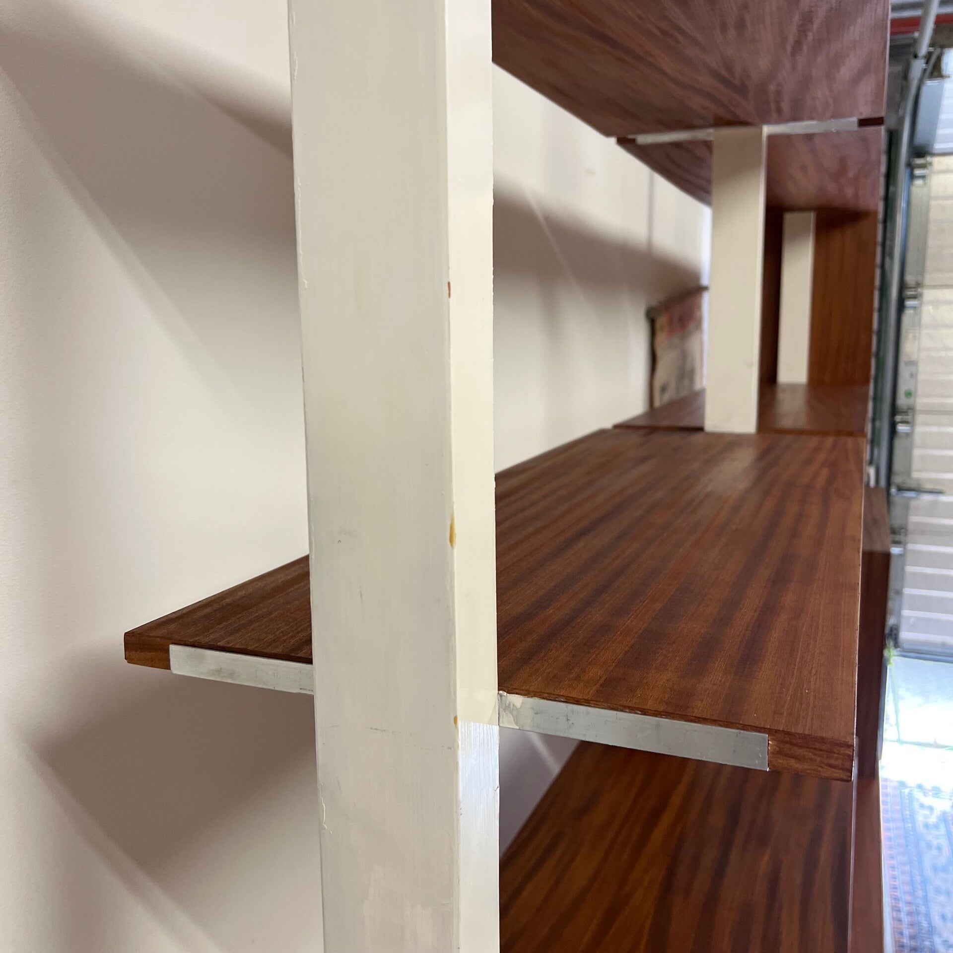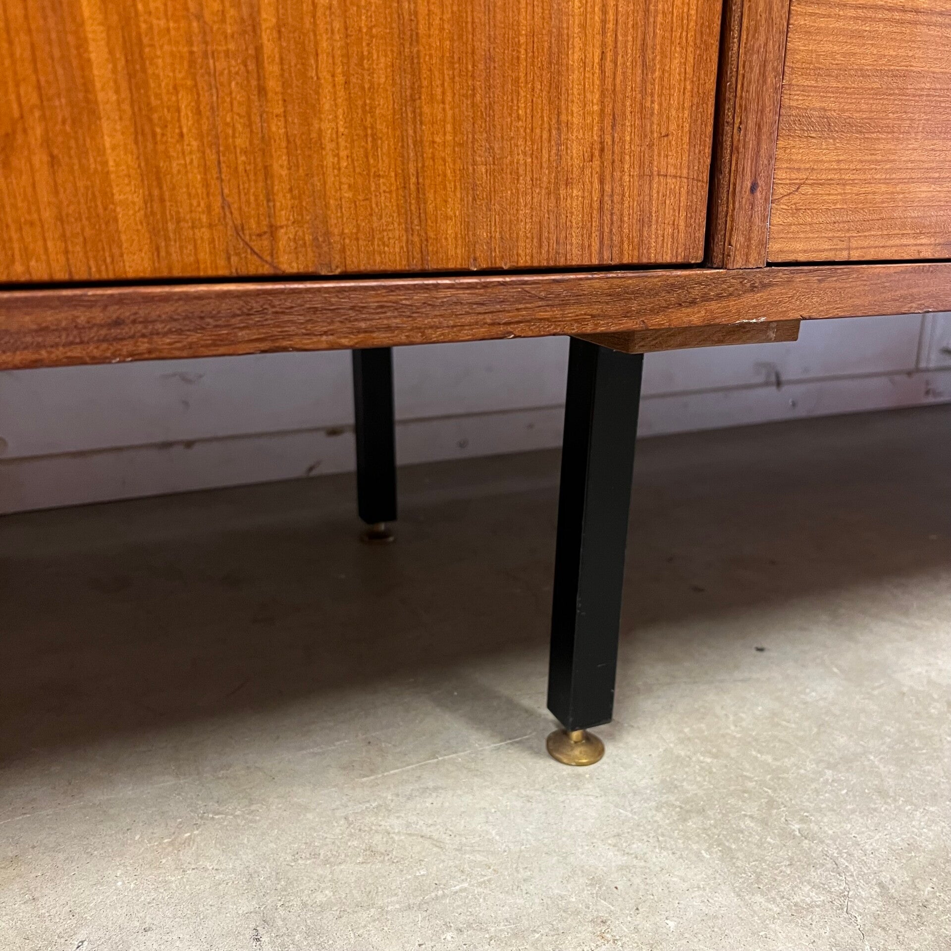 Geweldig imposant XL wandmeubel, uitgevoerd in teak fineer met zwart metalen pootjes, stelvoetjes en wit gelakte staanders.